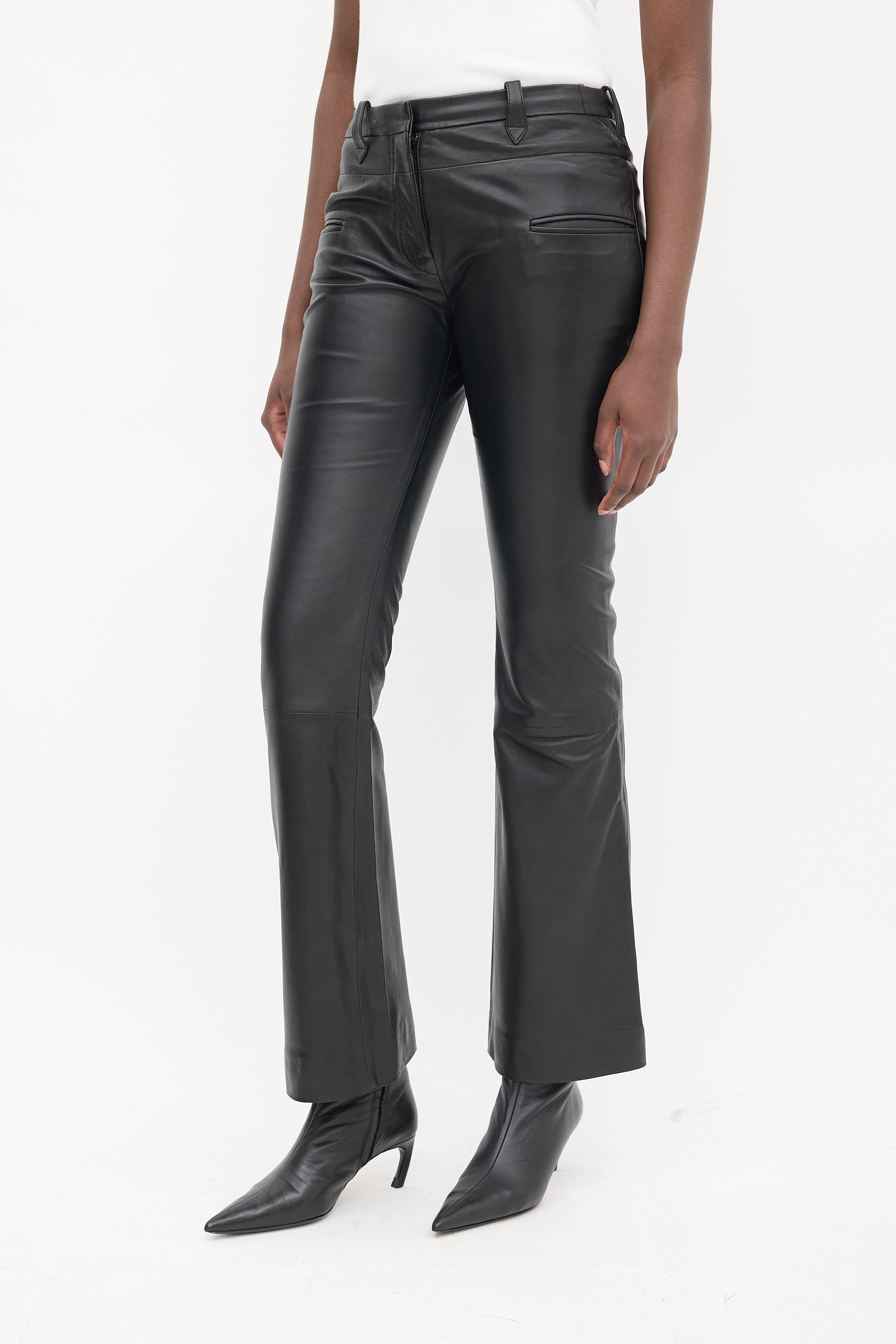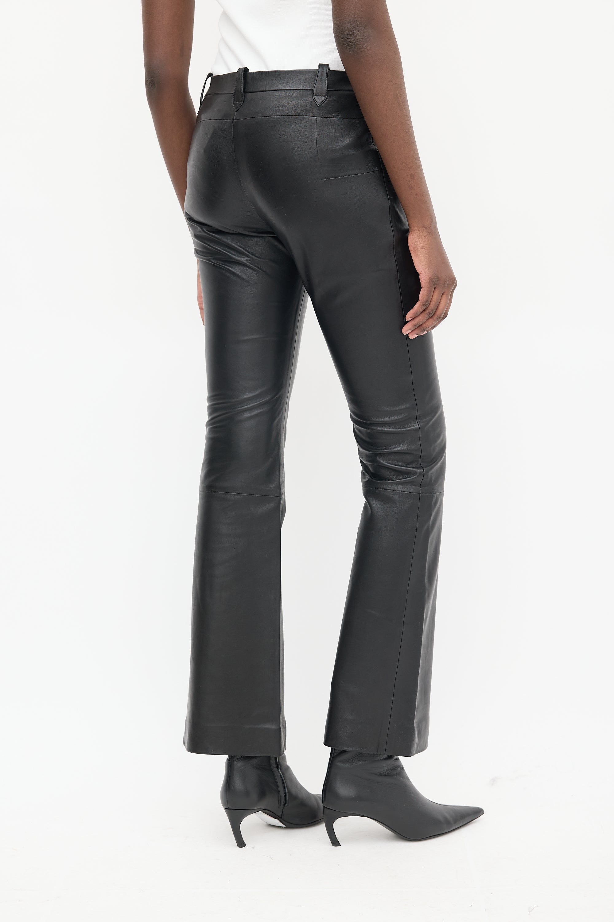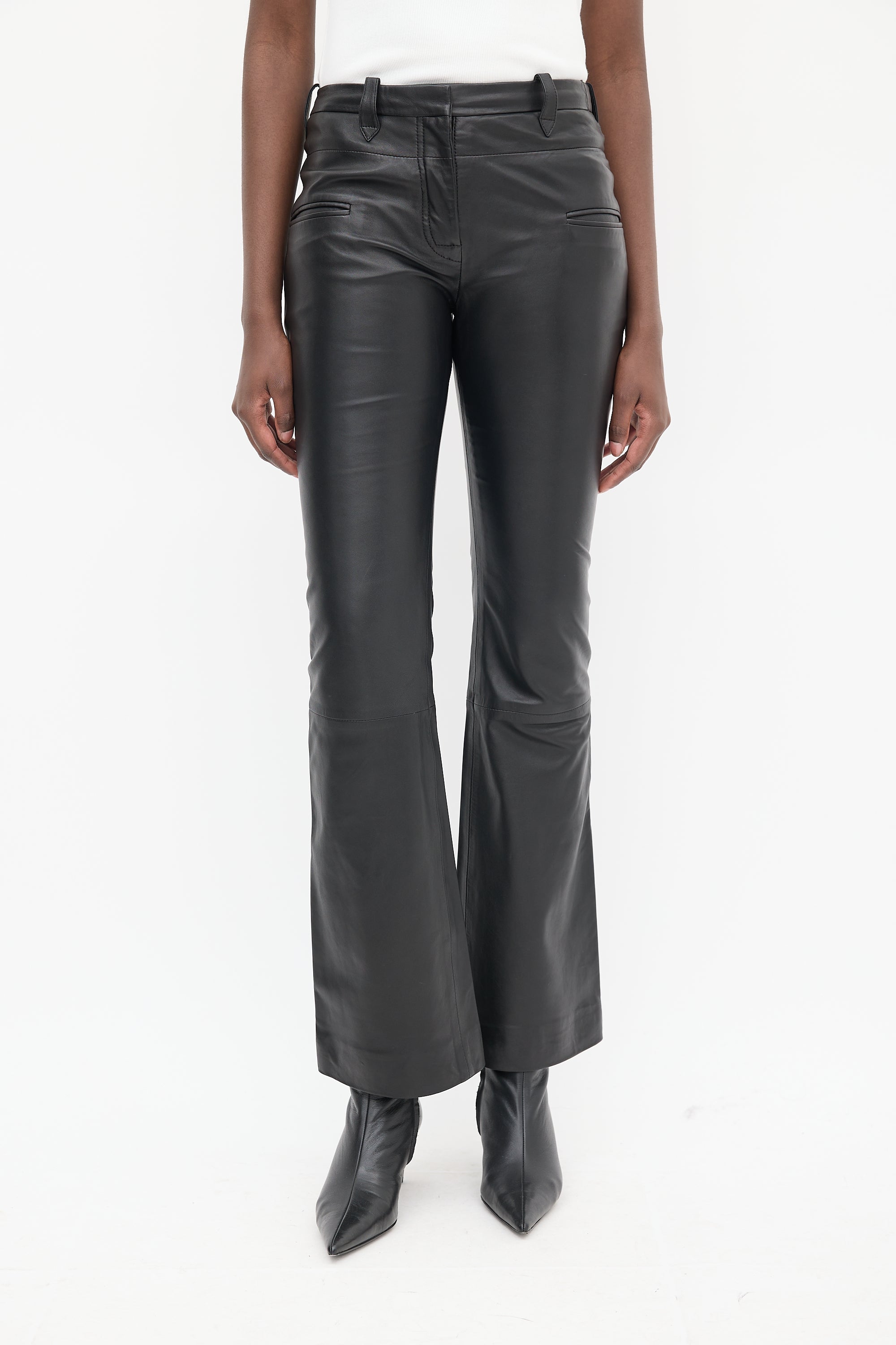 Pre-owned Altuzarra black leather trousers featuring two welt pockets at hip, darted back, flared leg, and zip fly with hook and eye closure. Lined.