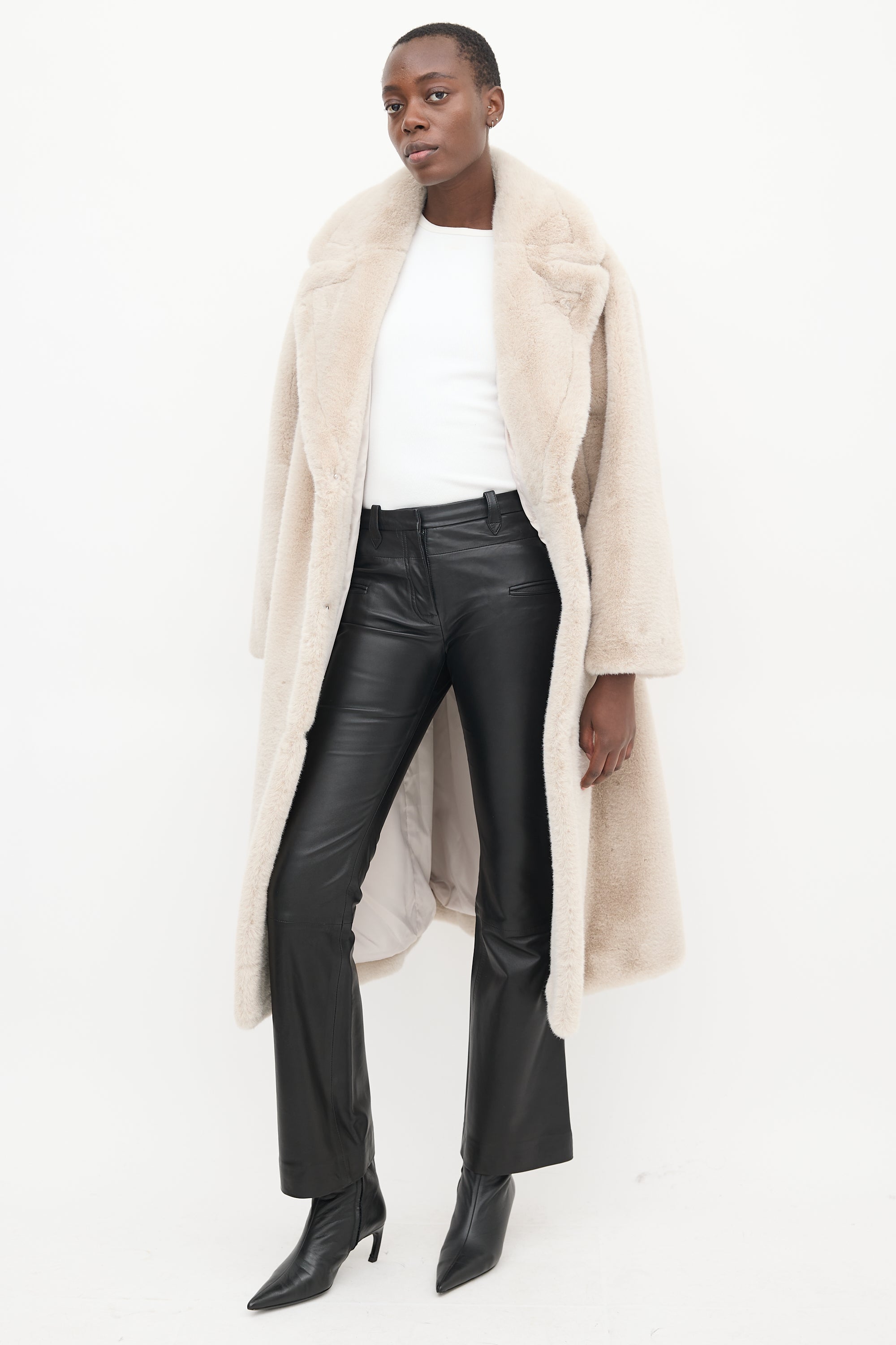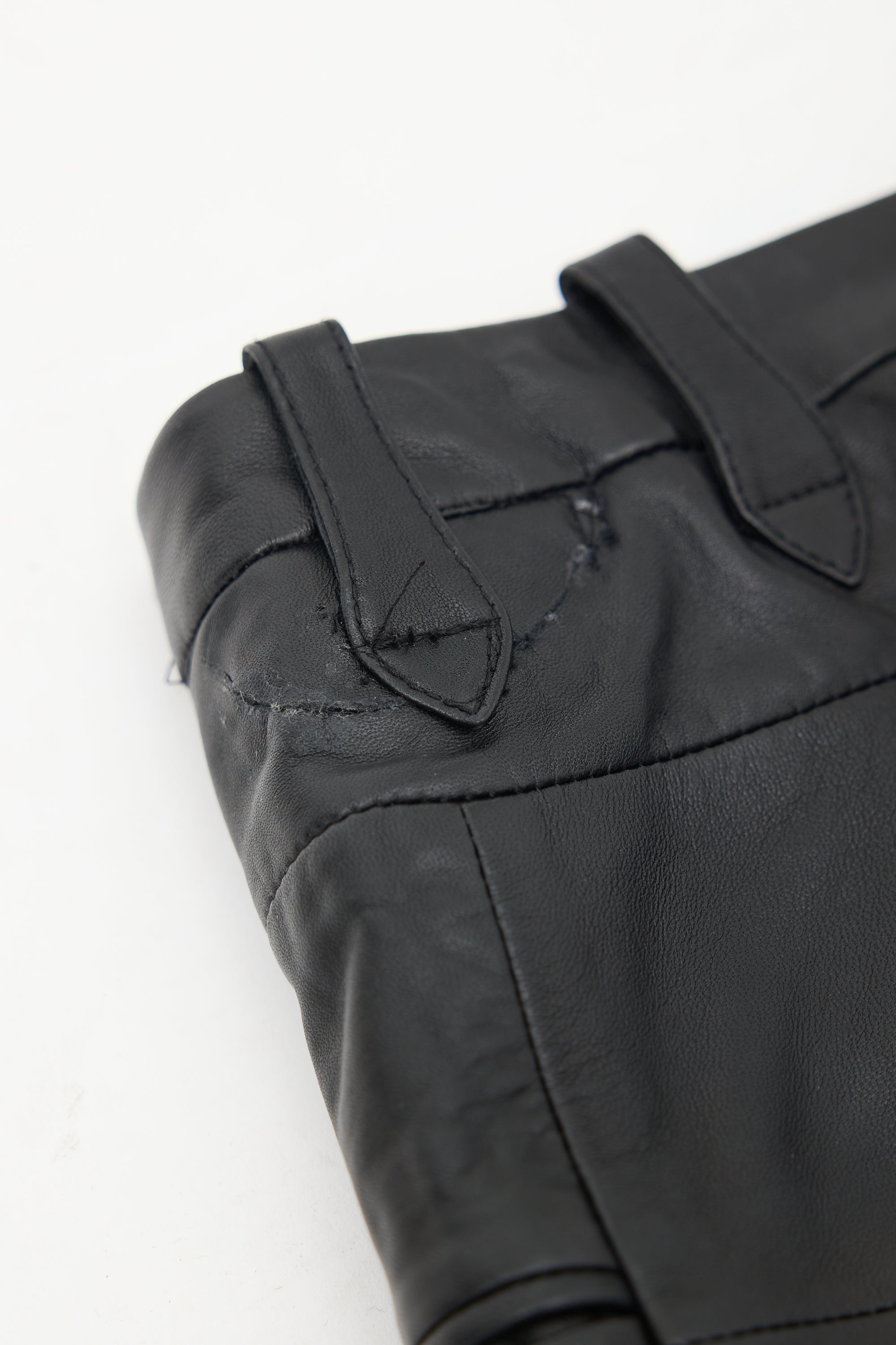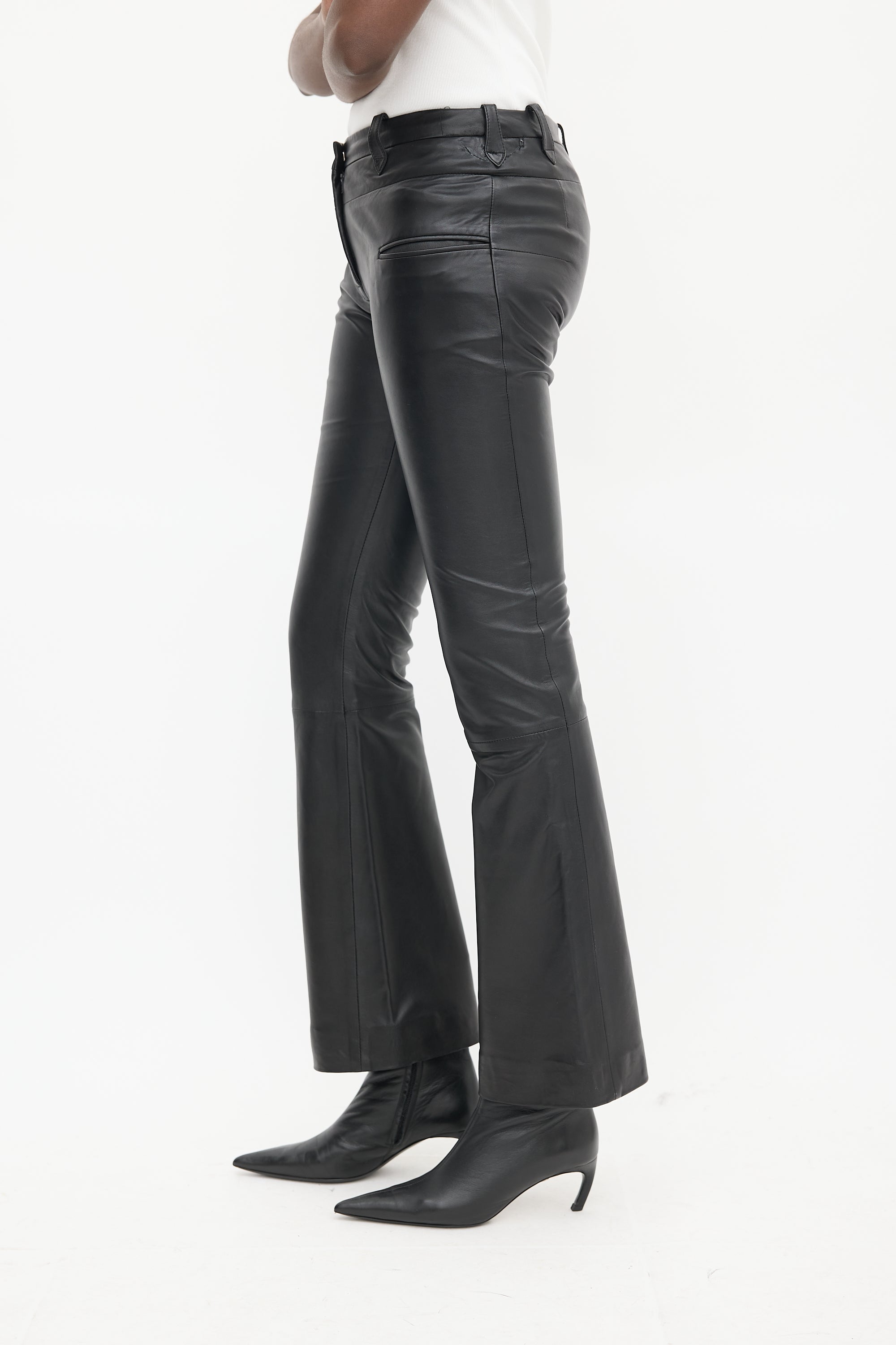 Pre-owned Altuzarra black leather trousers featuring two welt pockets at hip, darted back, flared leg, and zip fly with hook and eye closure. Lined.