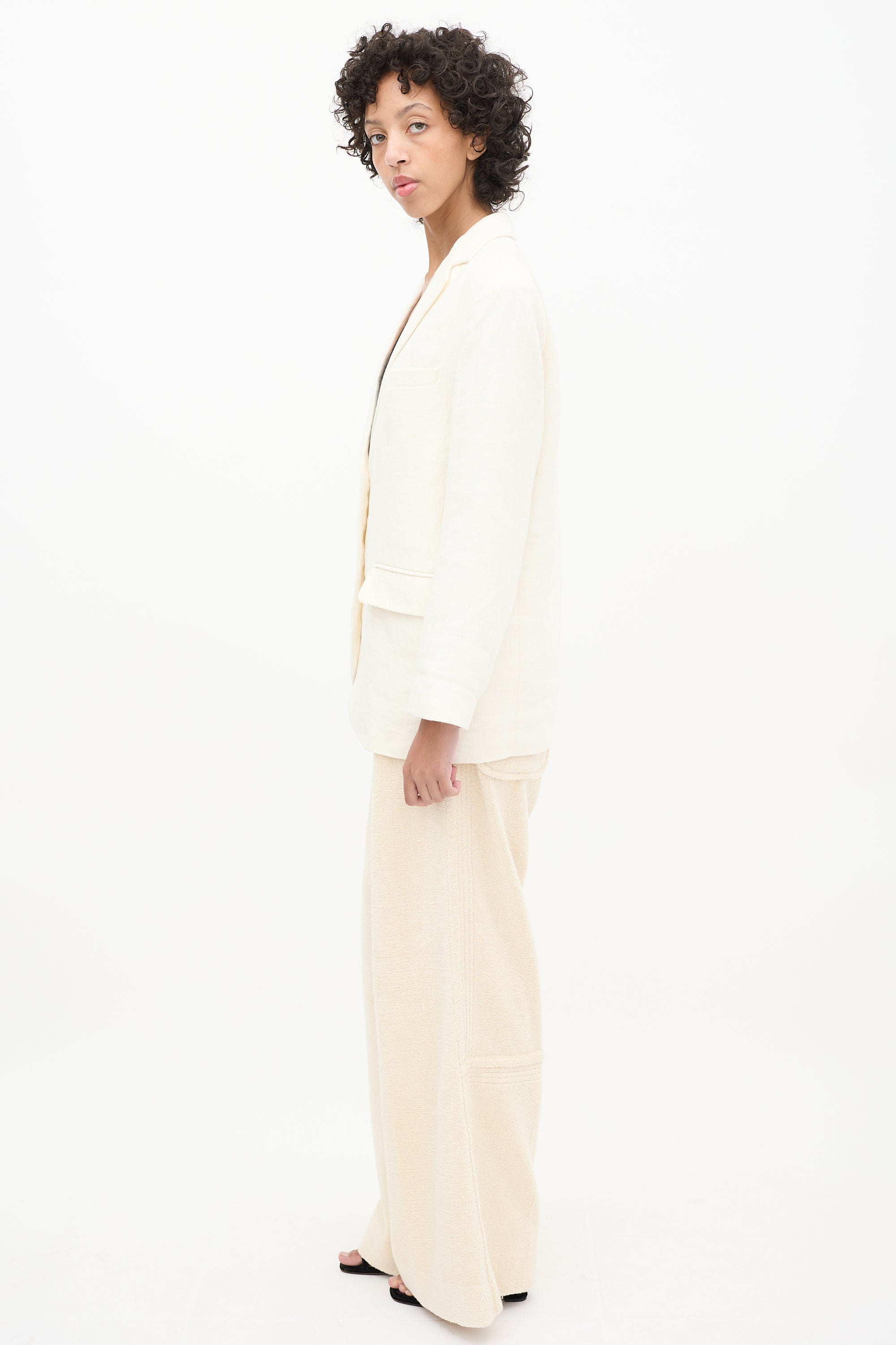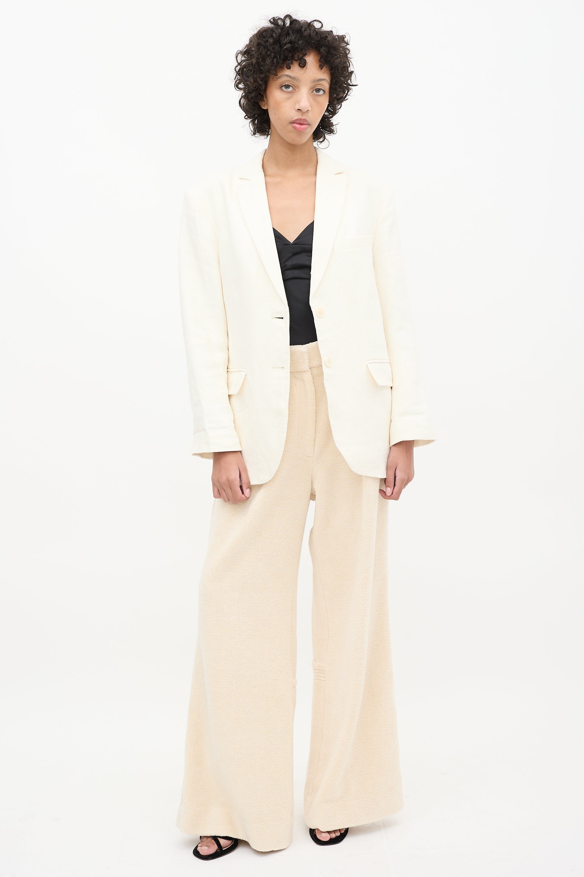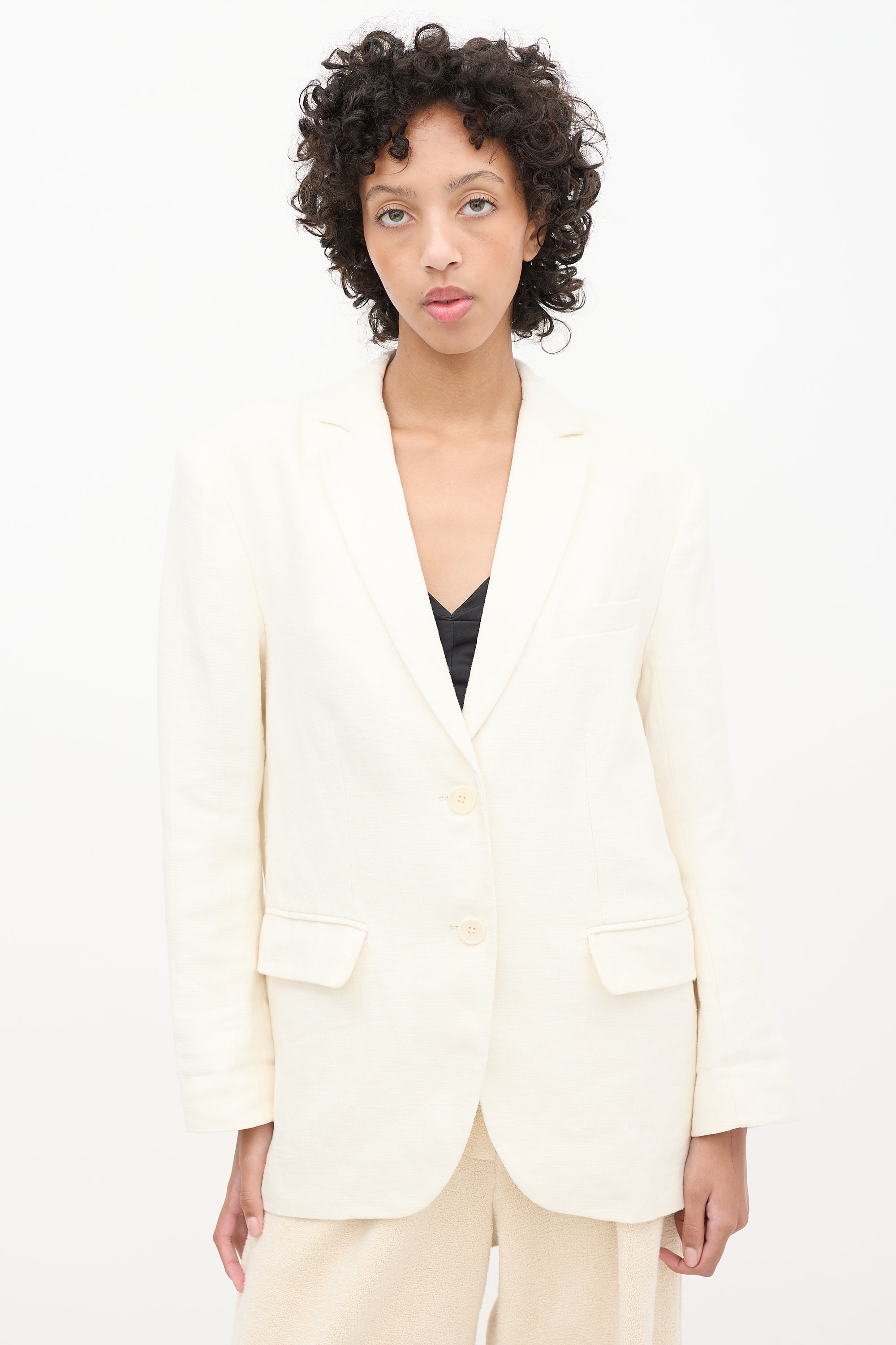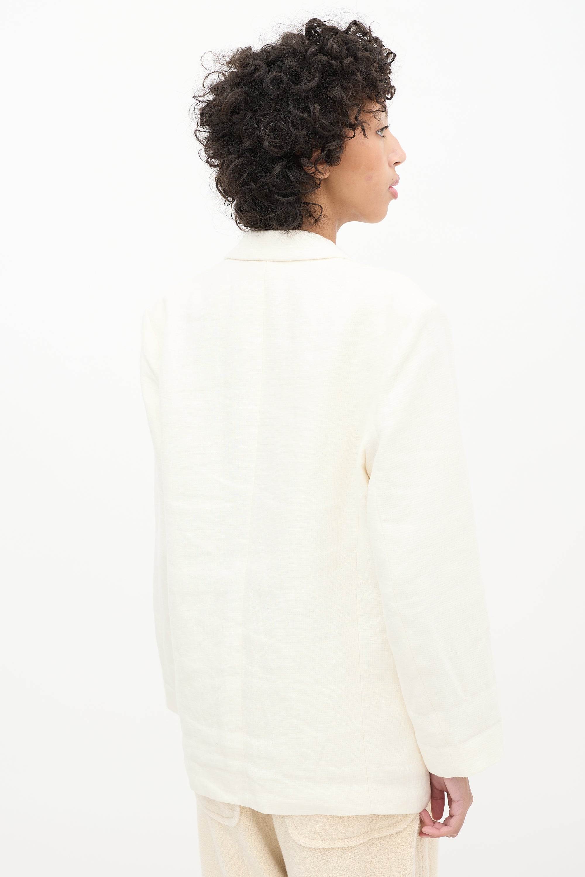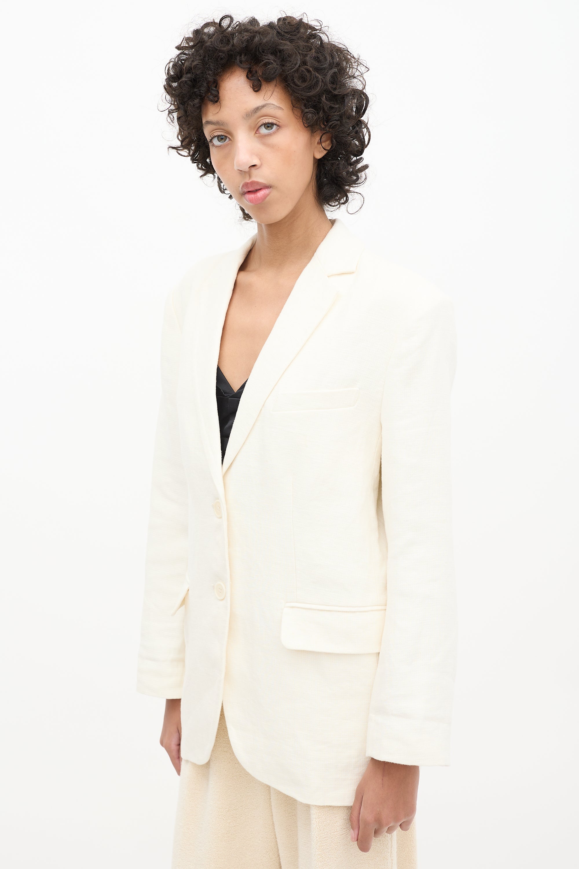 Pre-owned Anine Bing cream linen Quinn Oversized blazer featuring peak lapel, welt pocket at left chest, two flap pockets at hips, three interior welt pockets, and button up front. Lined.