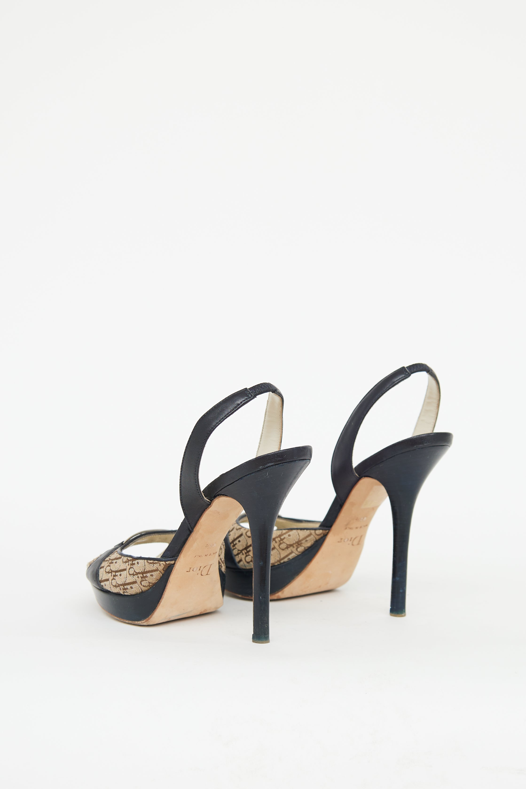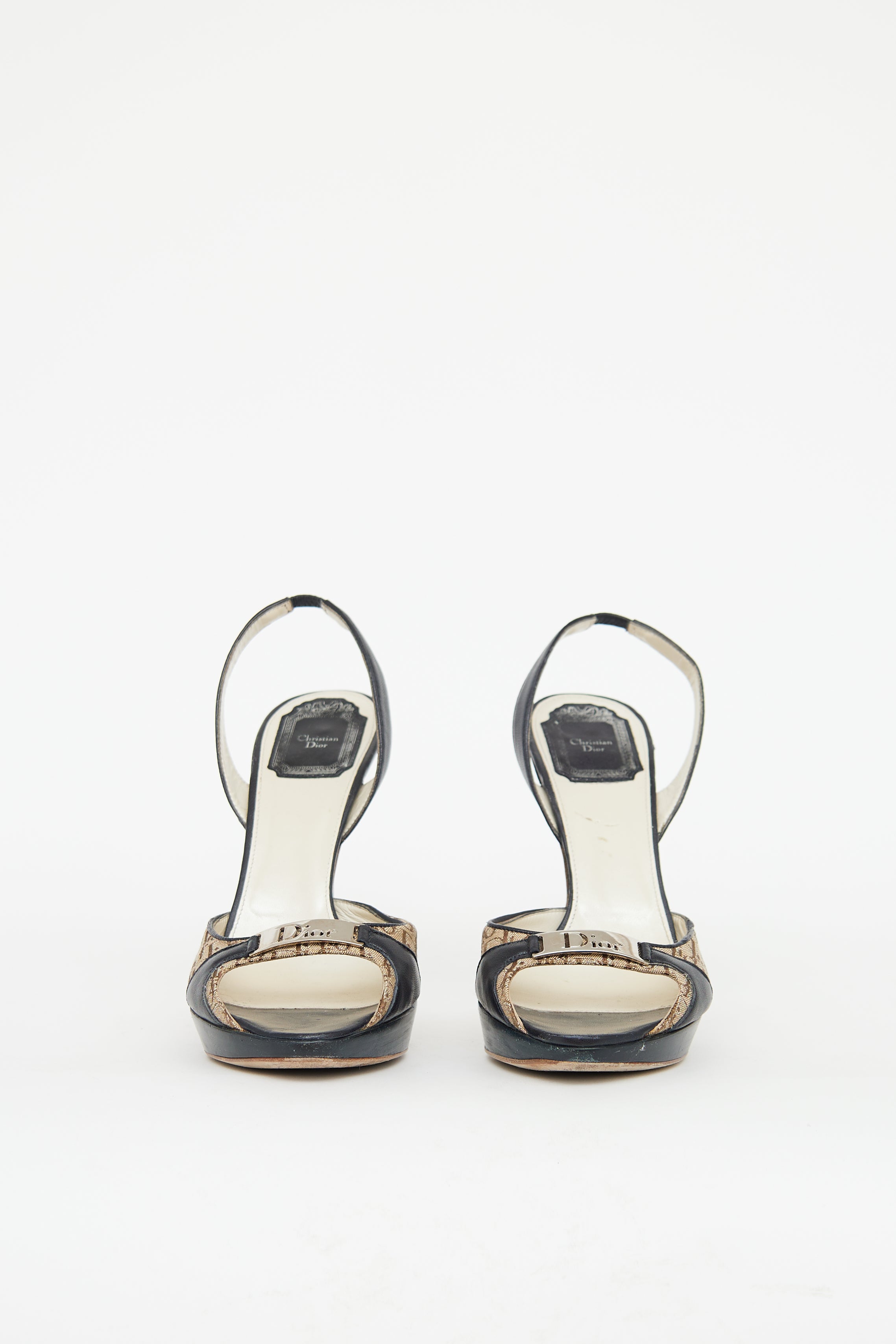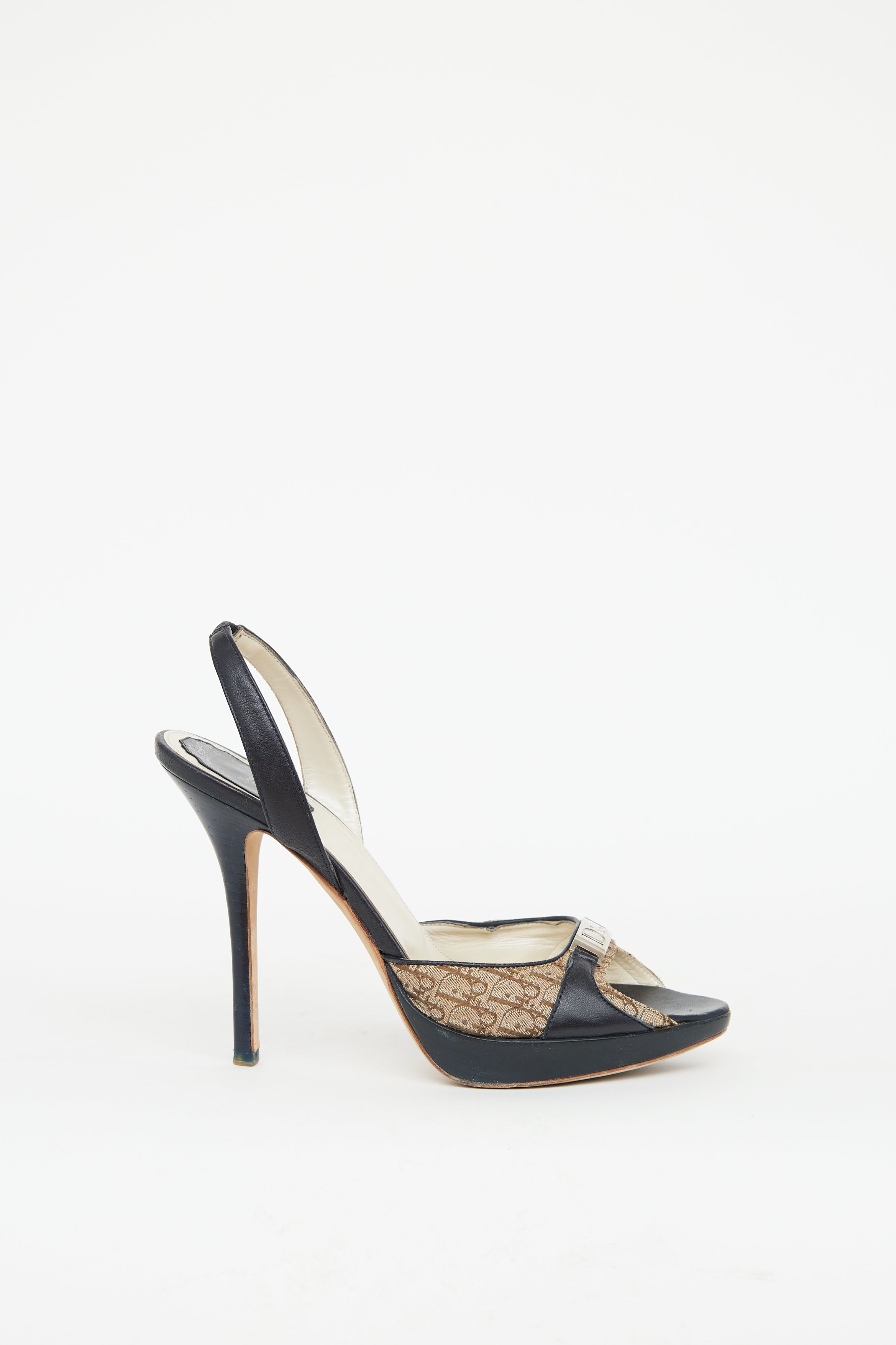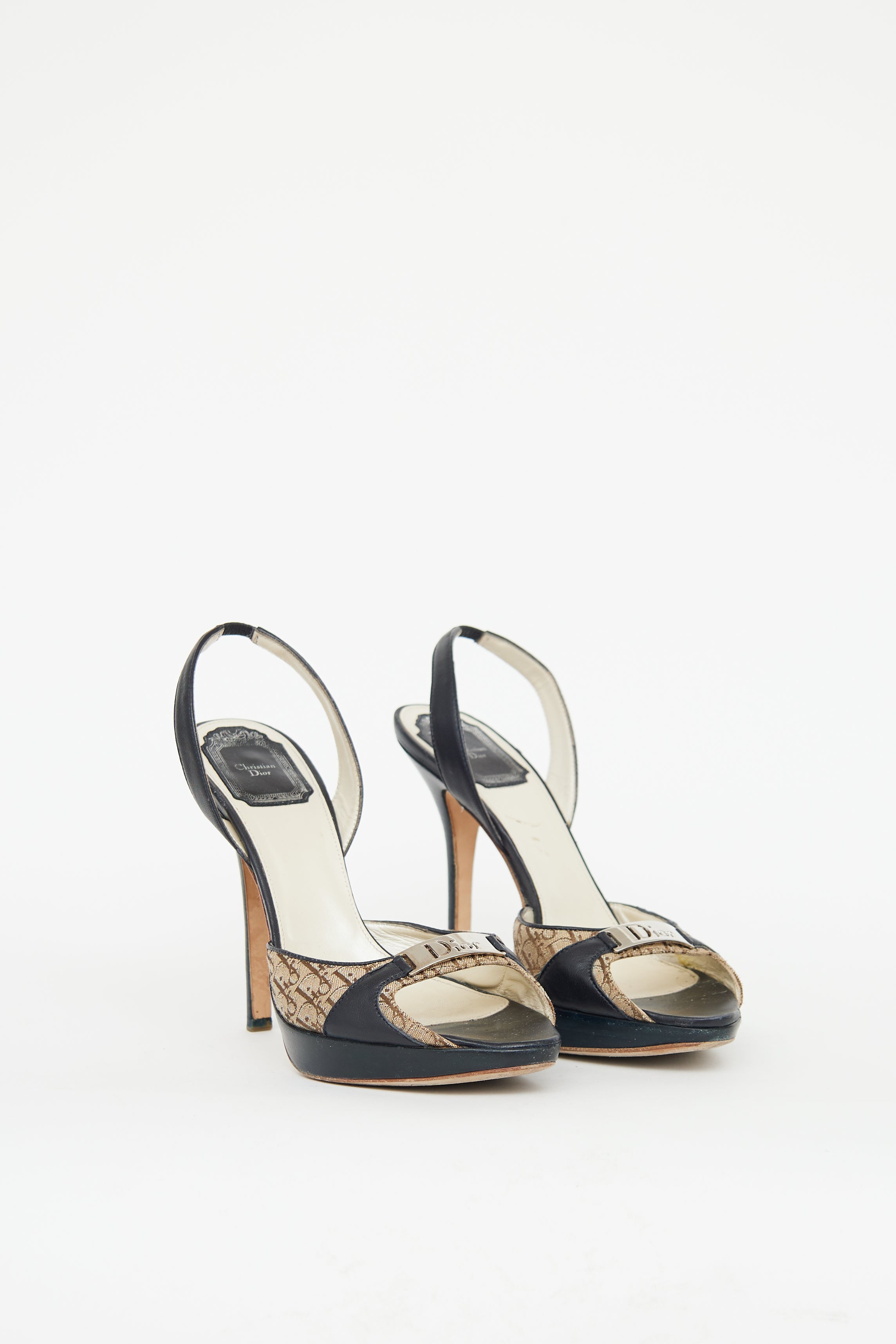 Pre-owned Dior brown and black Diorissimo slingback heels featuring a peep toe, canvas monogram print strap over vamp, leather trim with silver tone Dior logo buckle, platform midsole, leather slingback and covered heel.