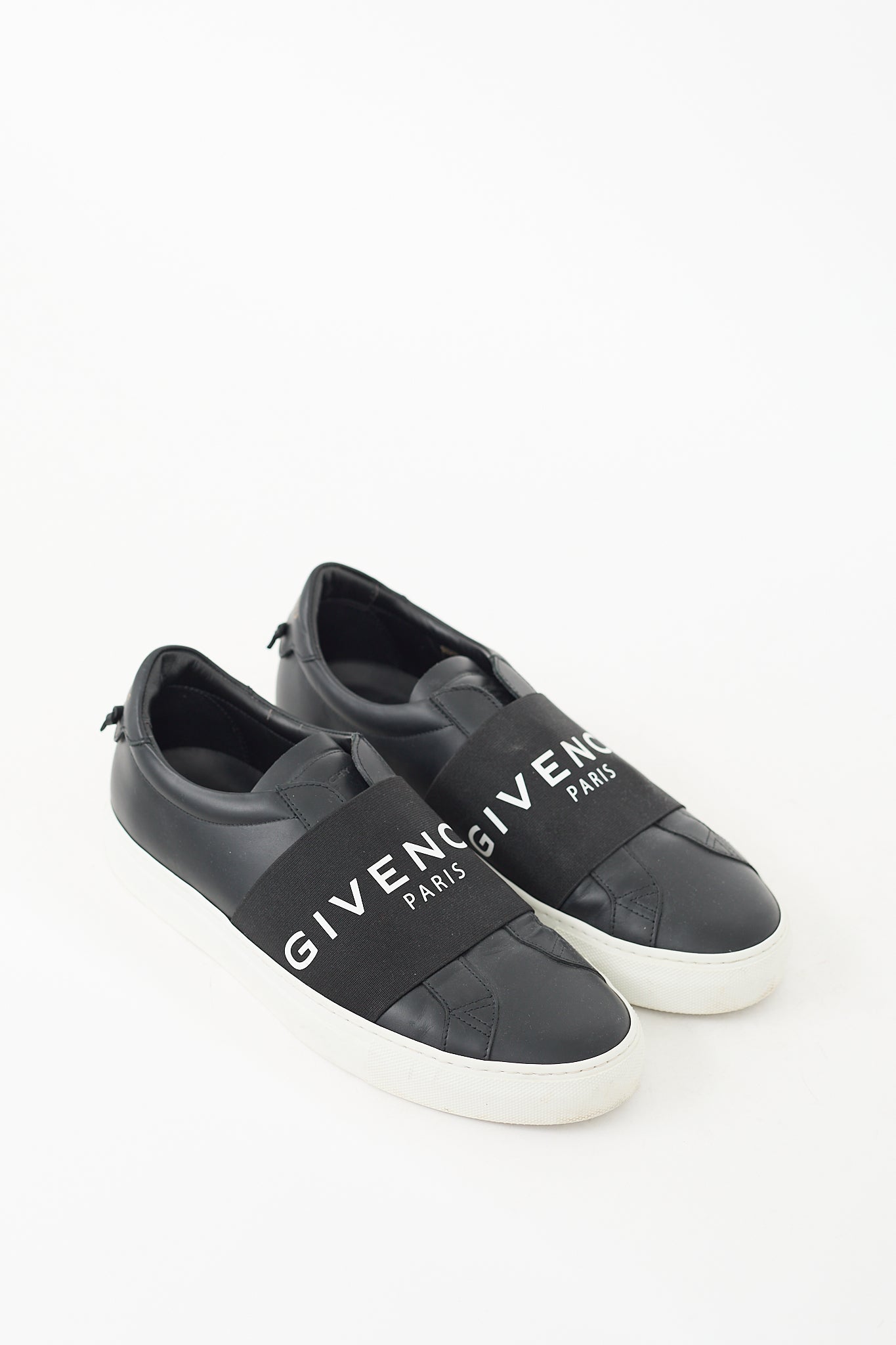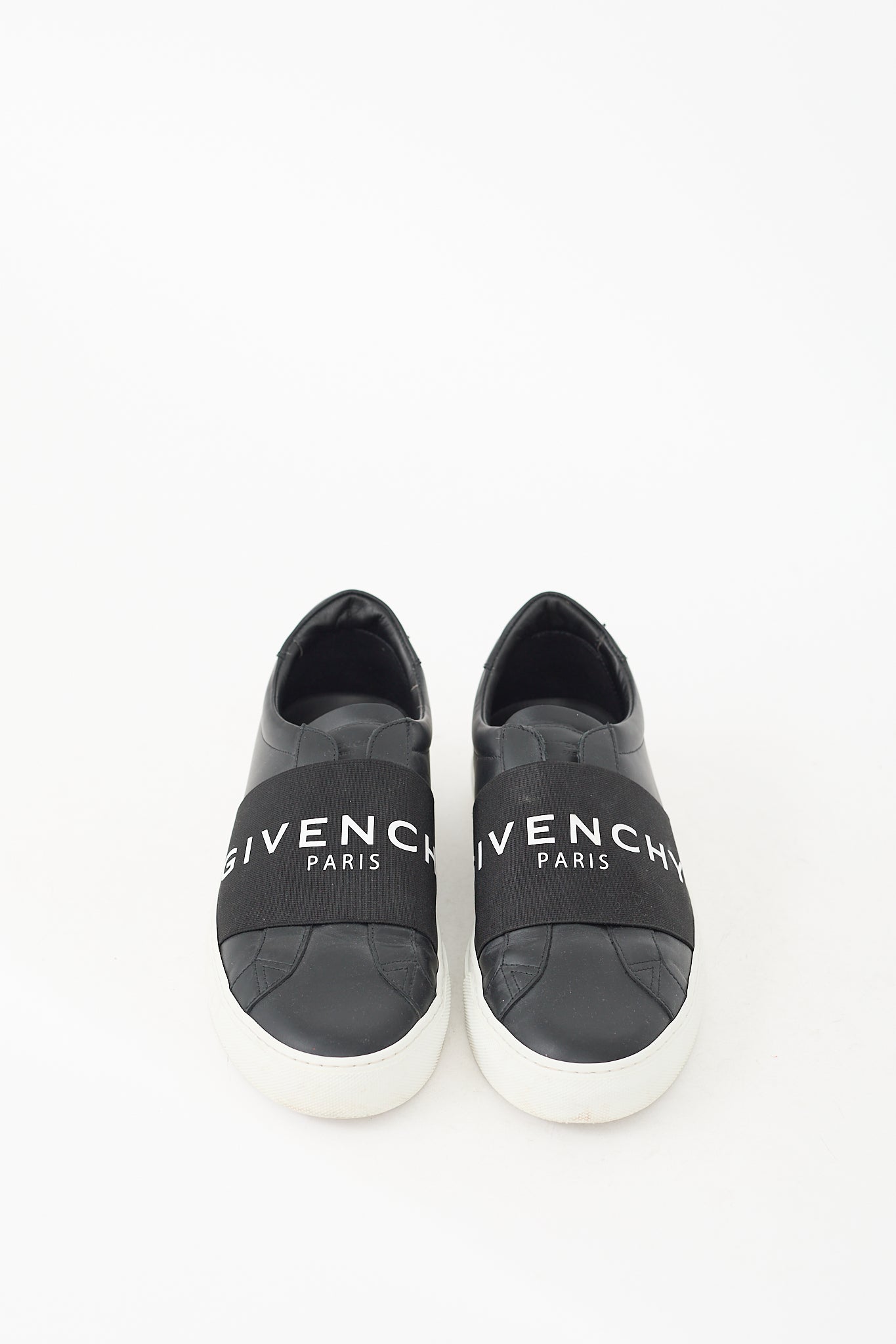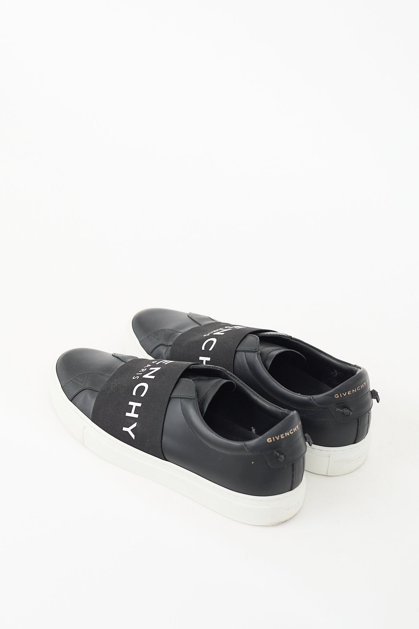Pre-owned Givenchy black and white Urban Street low top sneakers featuring a rounded toe, leather upper, wide elastic band with white printed logo across instep, stamped logo at tongue, gold tone printed logo and dual tie detail at counter, and white rubber sole with debossed logo at heel.