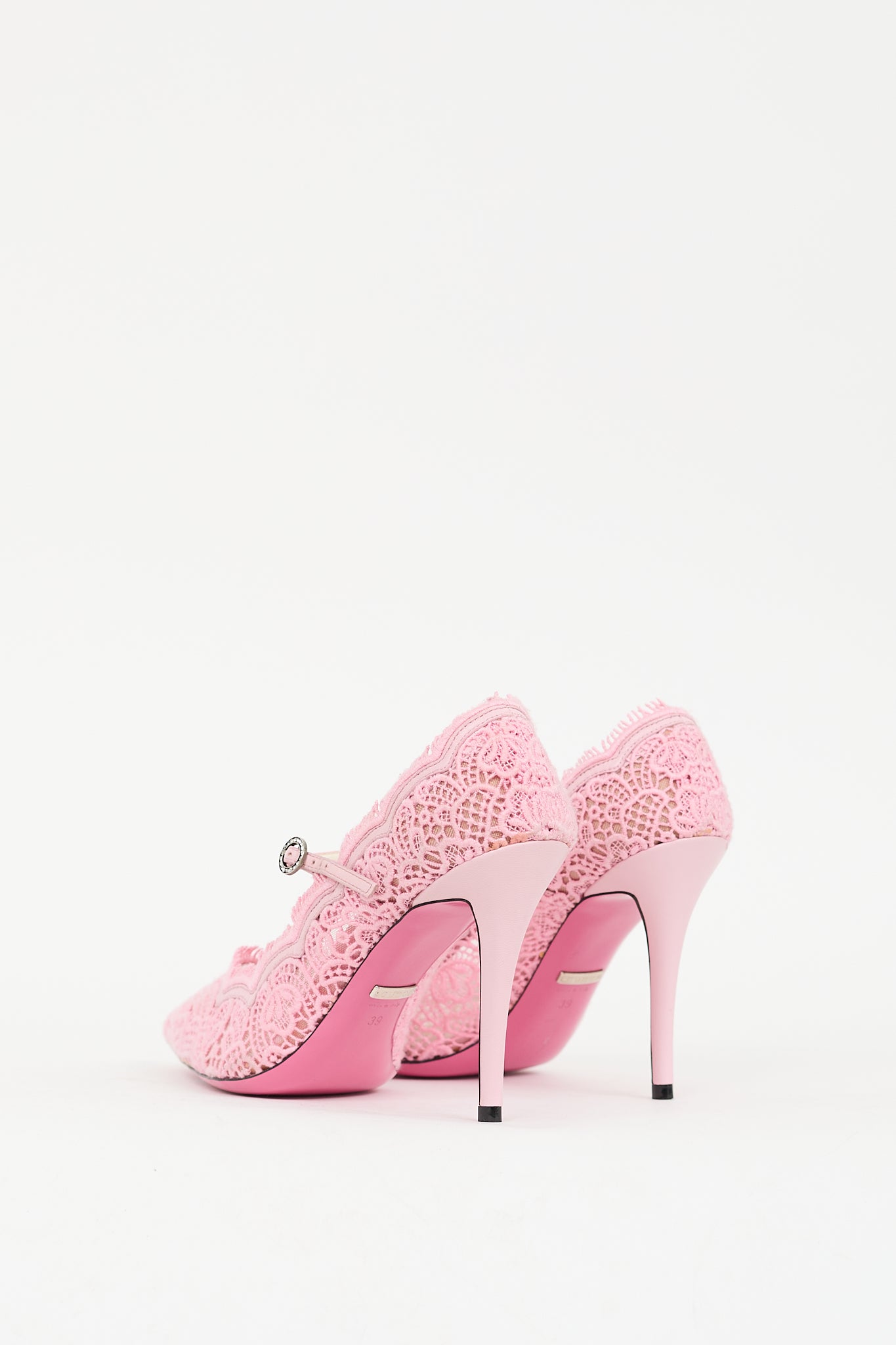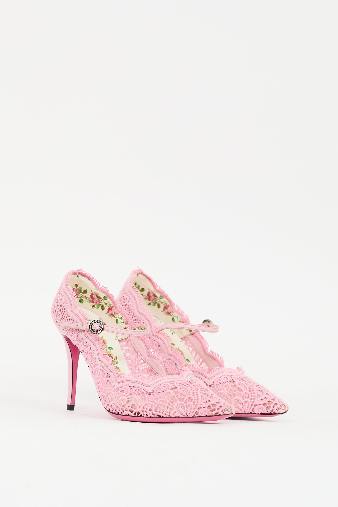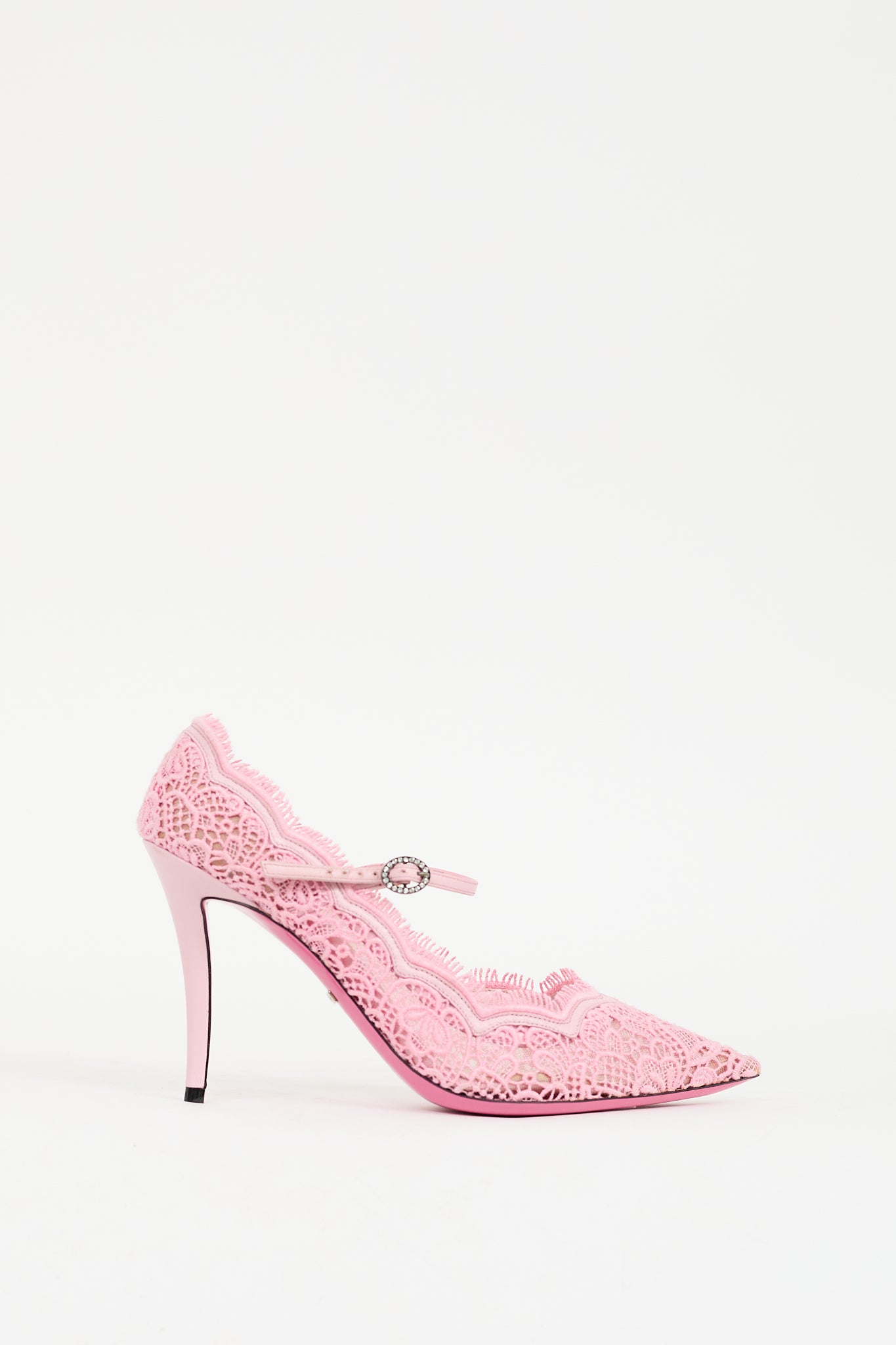 Pre-owned Gucci pink textile Virginia Mary Jane pumps featuring pointed toe, leather trimming throughout, leather adjustable straps, crystal buckle closure, floral leather insoles, and leather covered stiletto heel.