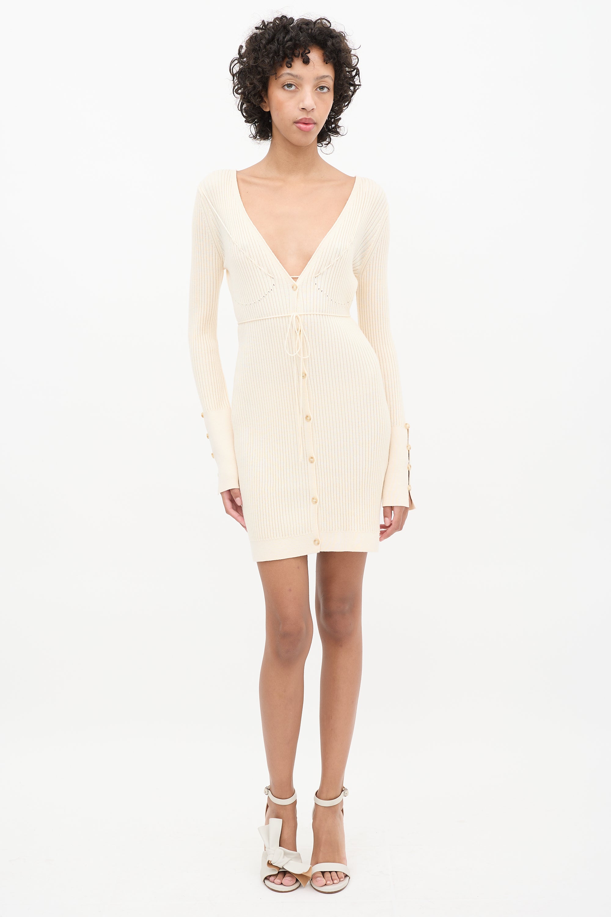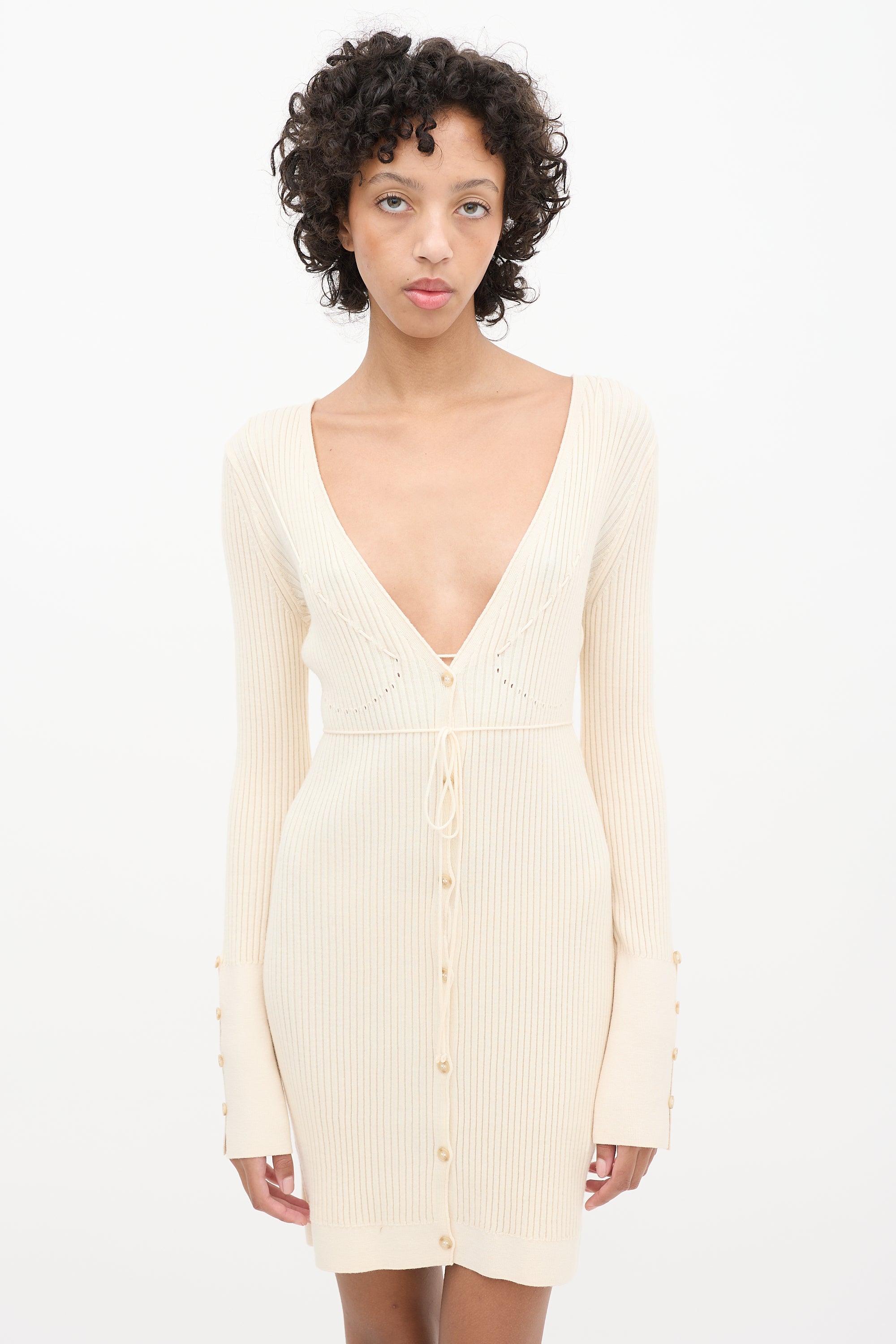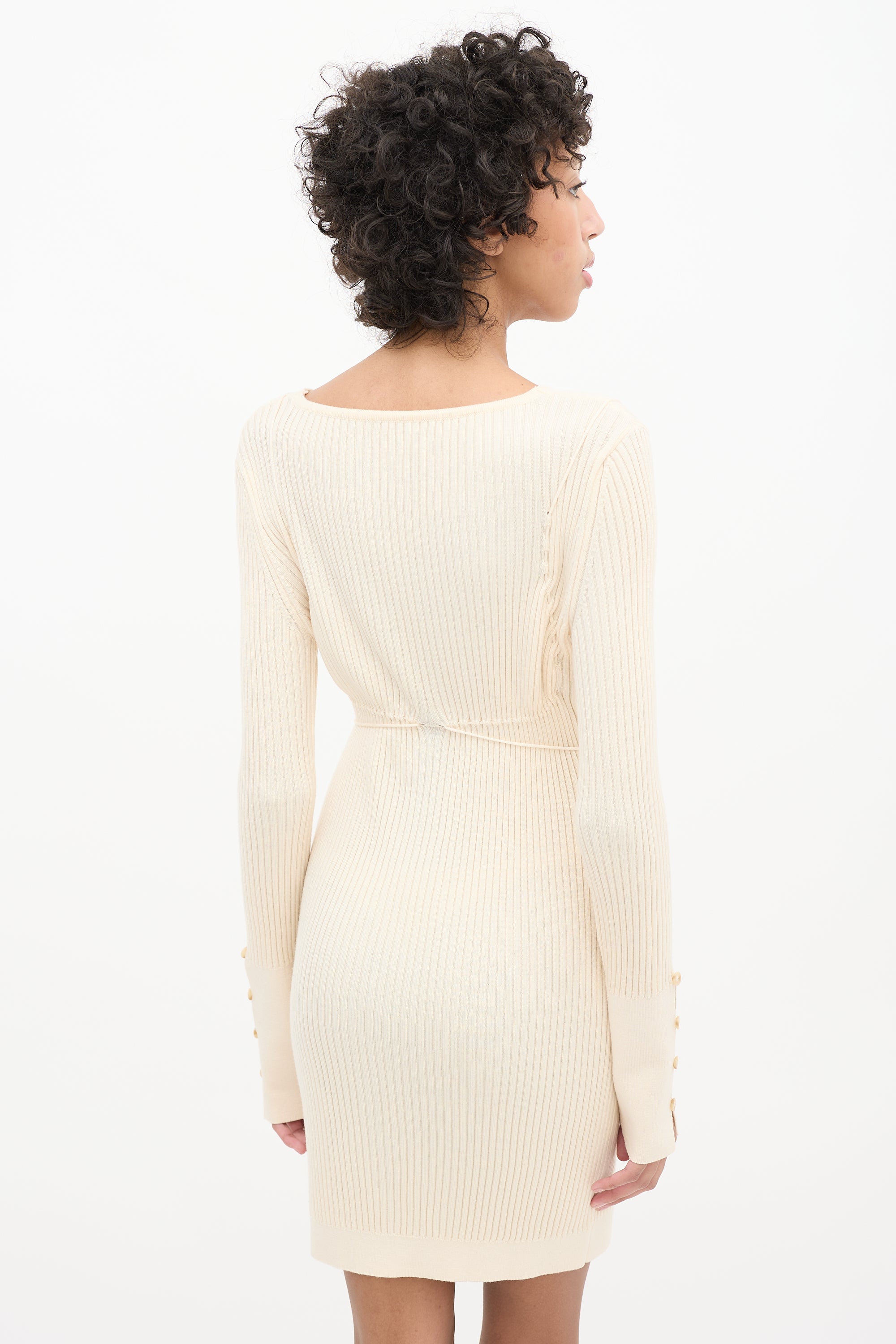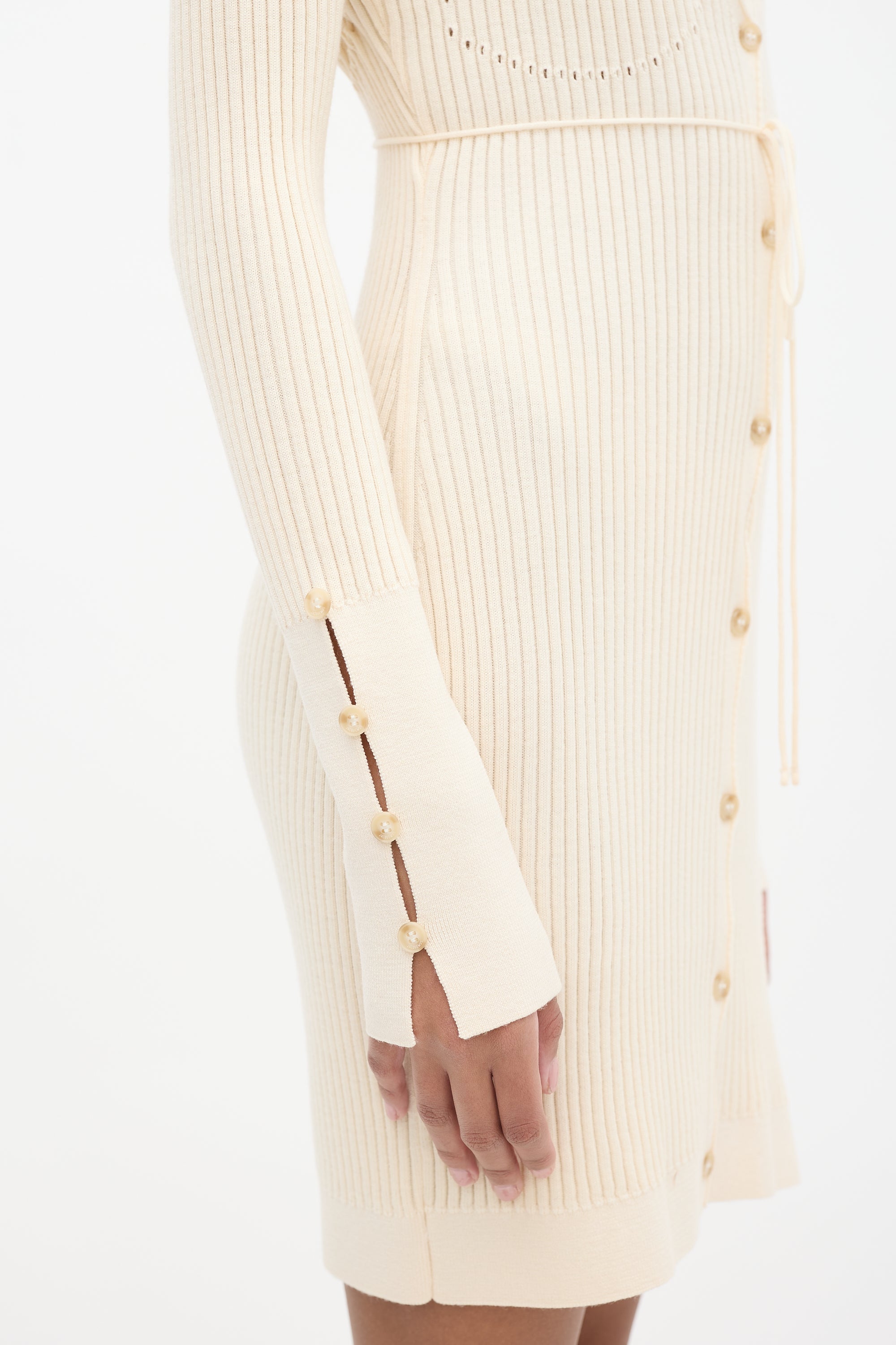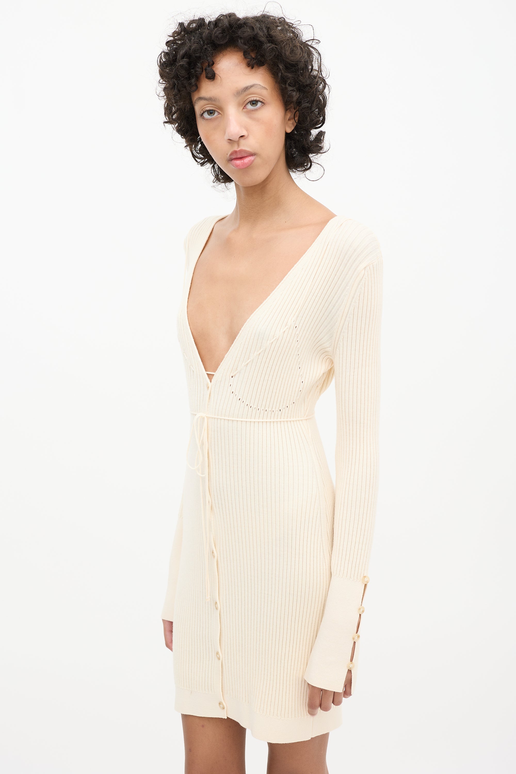 Pre-owned Jacquemus cream wool Le Cardigan Lauris dress featuring V-neckline, button up front, perforated bra outline, adjustable front and back tie, and long buttoned cuffs.