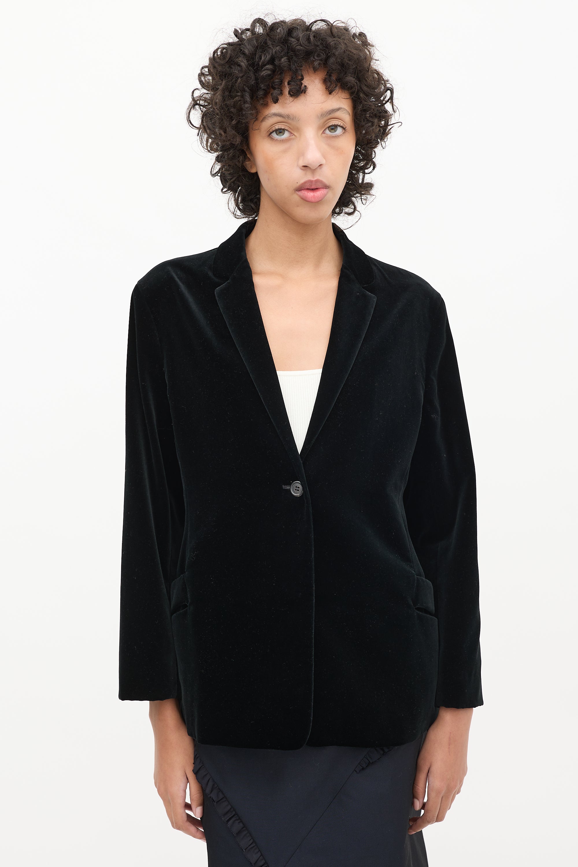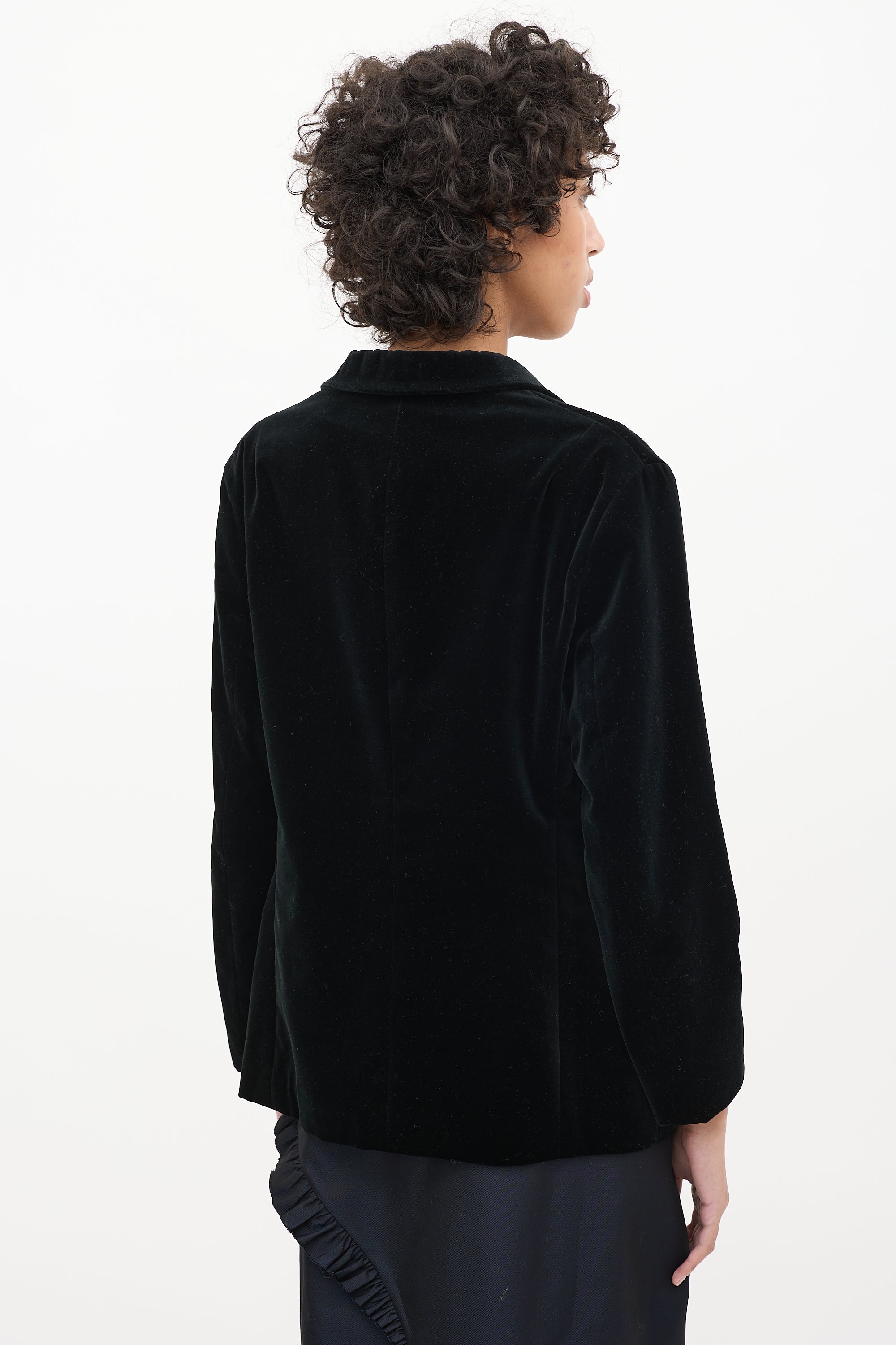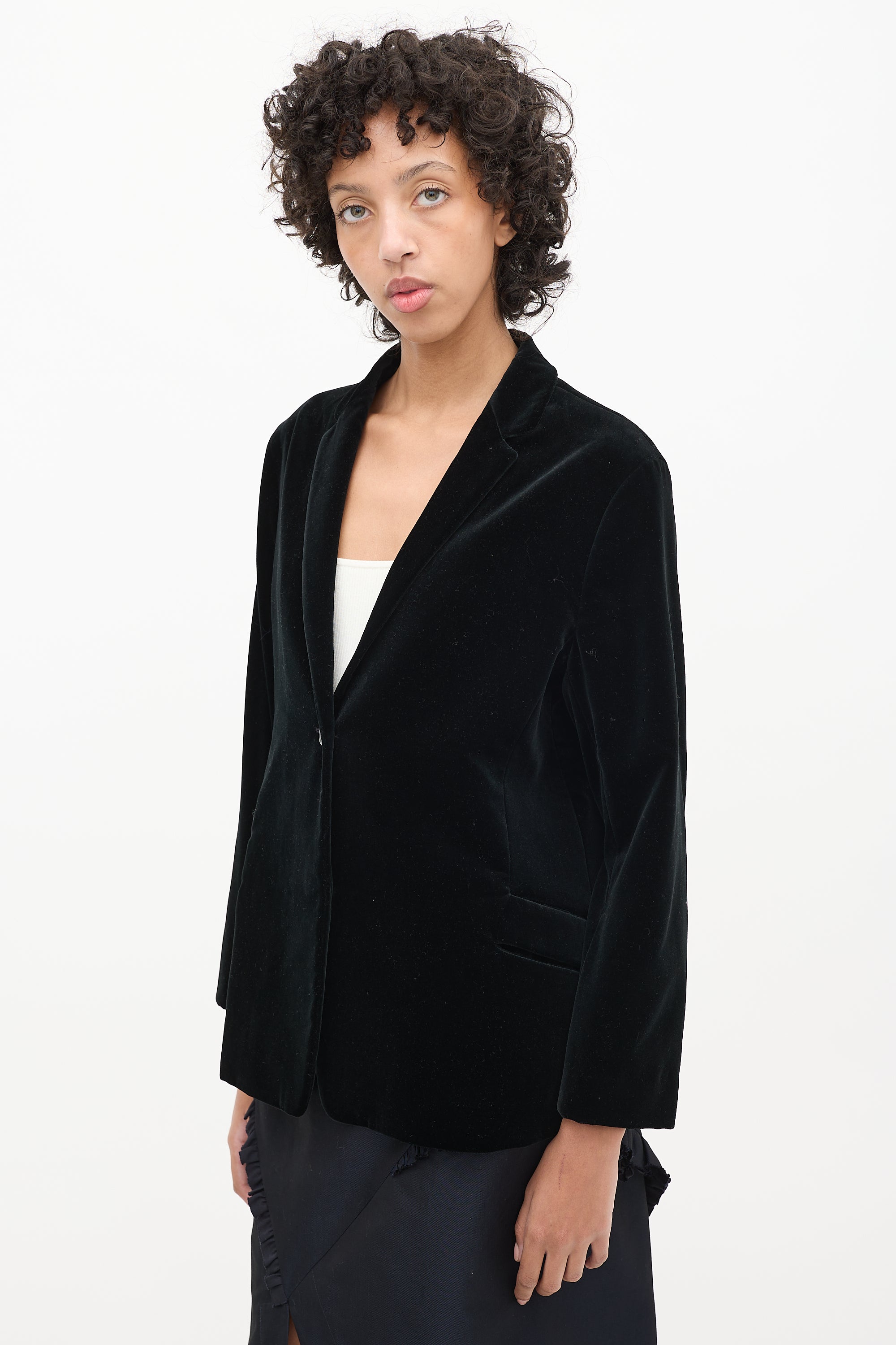 Pre-owned Jil Sander black velvet blazer featuring notched lapel, one slip pocket with cutout at waist, and button up front. Lined.