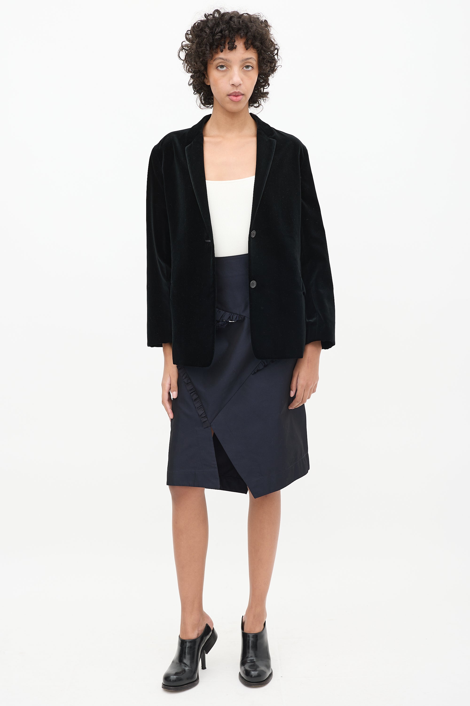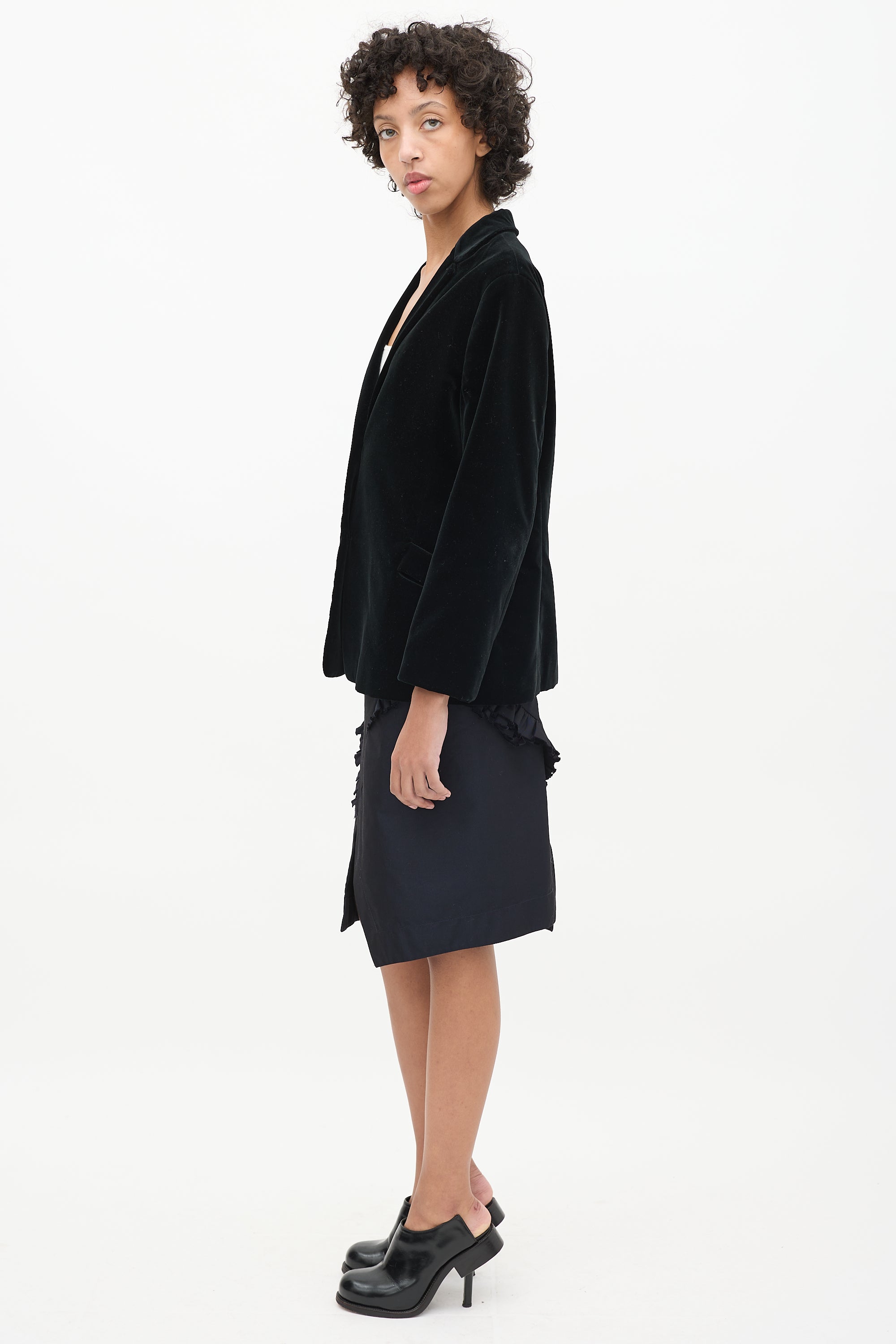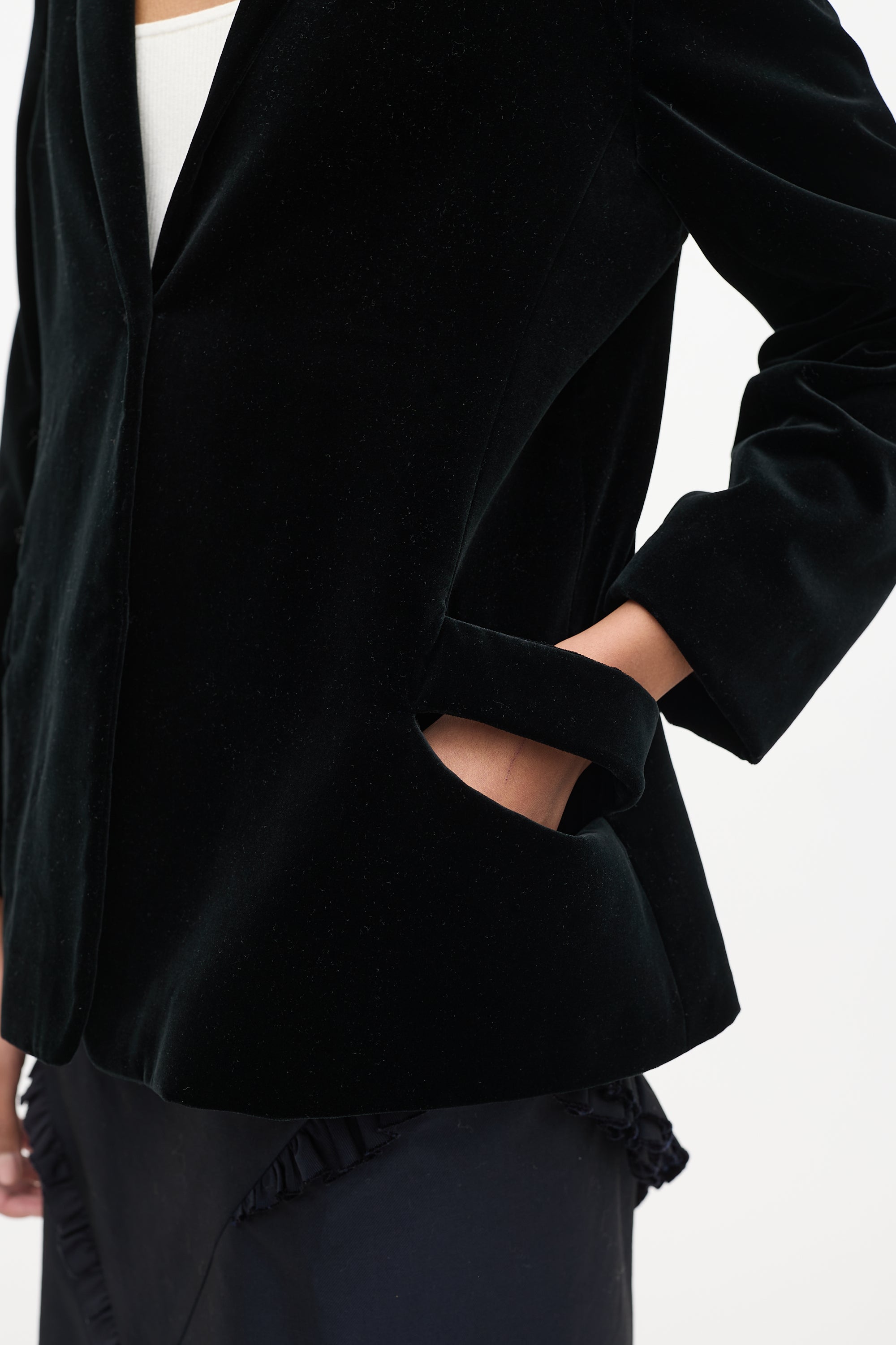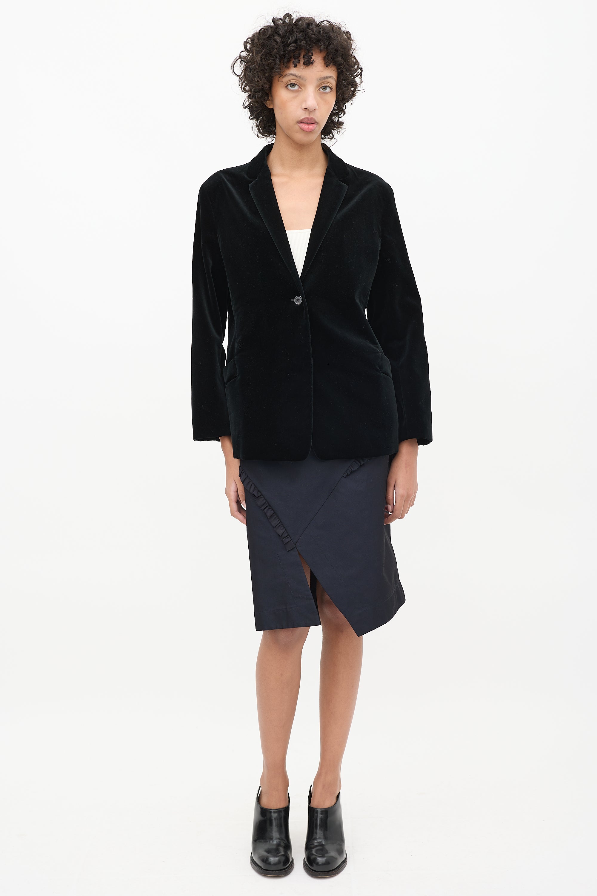 Pre-owned Jil Sander black velvet blazer featuring notched lapel, one slip pocket with cutout at waist, and button up front. Lined.