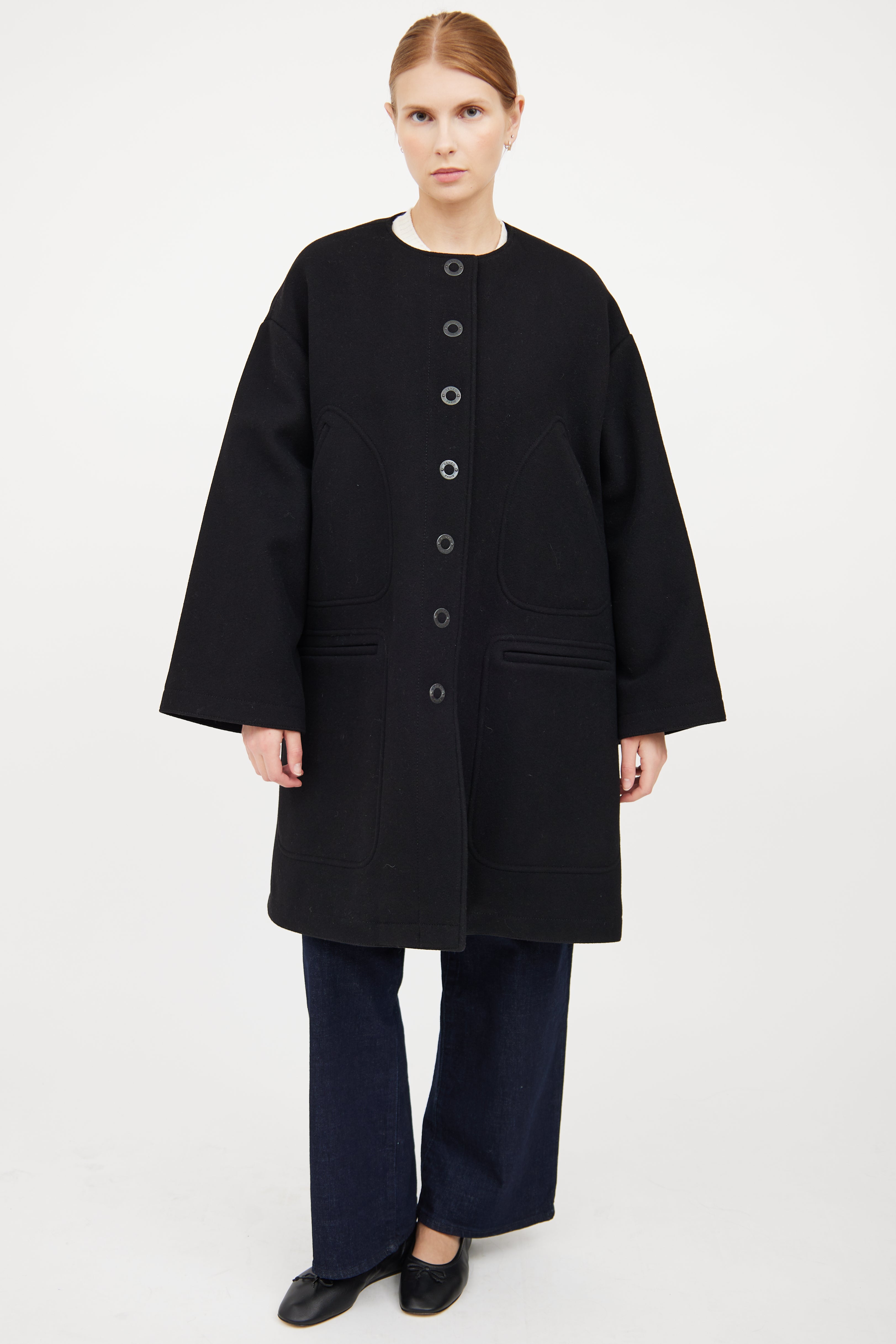 Pre-owned Kenzo black wool coat featuring round neckline, drop shoulder, long wide sleeves, snap front closure, four patch pockets at front and flared hem. Fully lined.