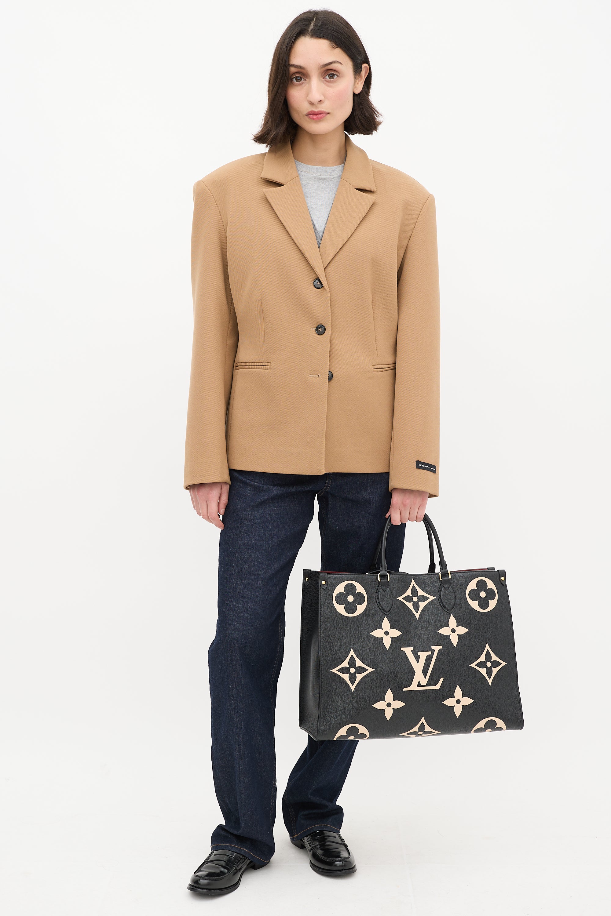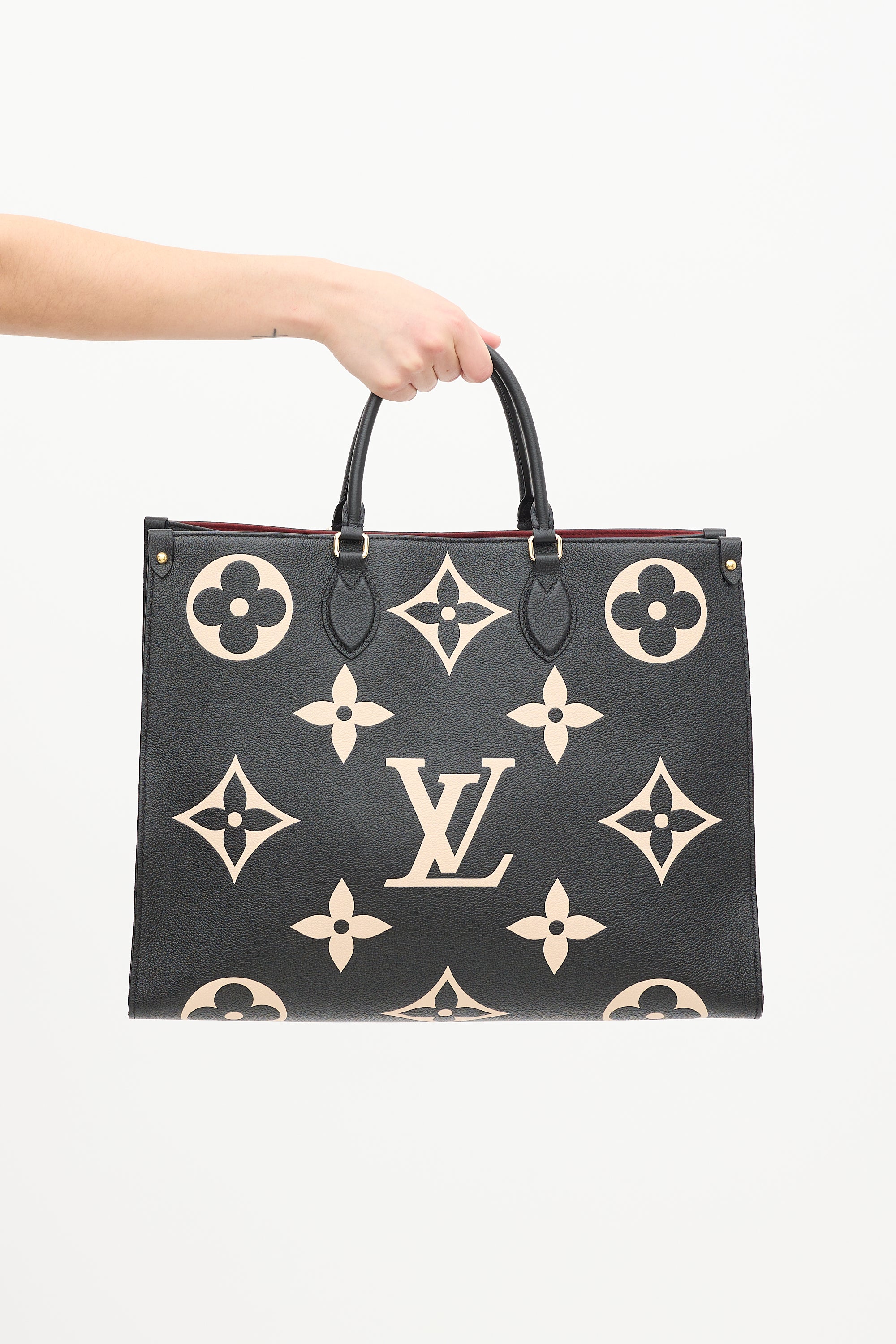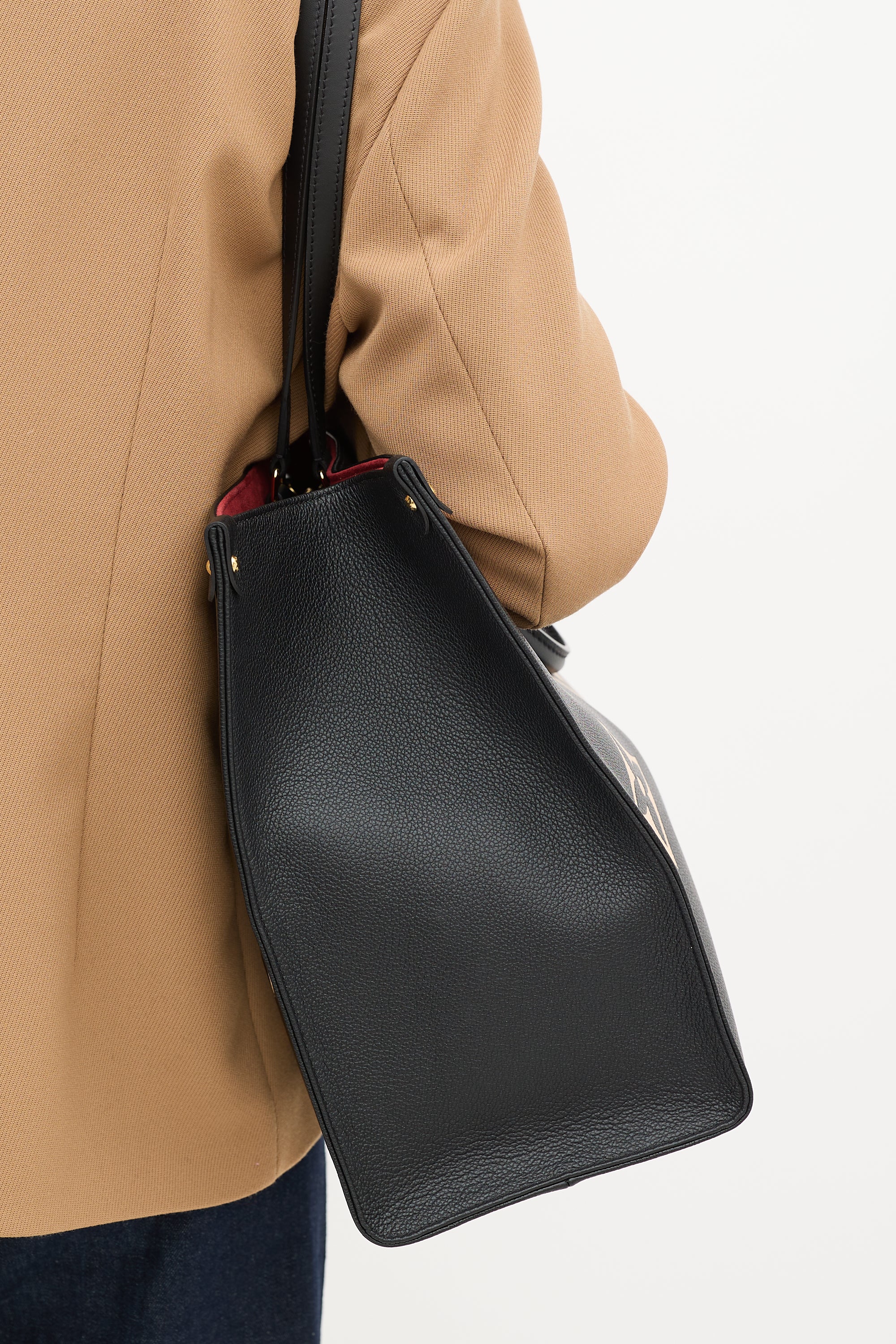 Pre-owned Louis Vuitton black and beige Onthego GM tote bag in monogram empreinte leather featuring tonal stitching, gold tone hardware, dual rolled top handles, dual fixed straps at interior, top clasp fastening, and one lined main compartment with one zip pocket and two slip pockets. Comes with original box and dust bag.