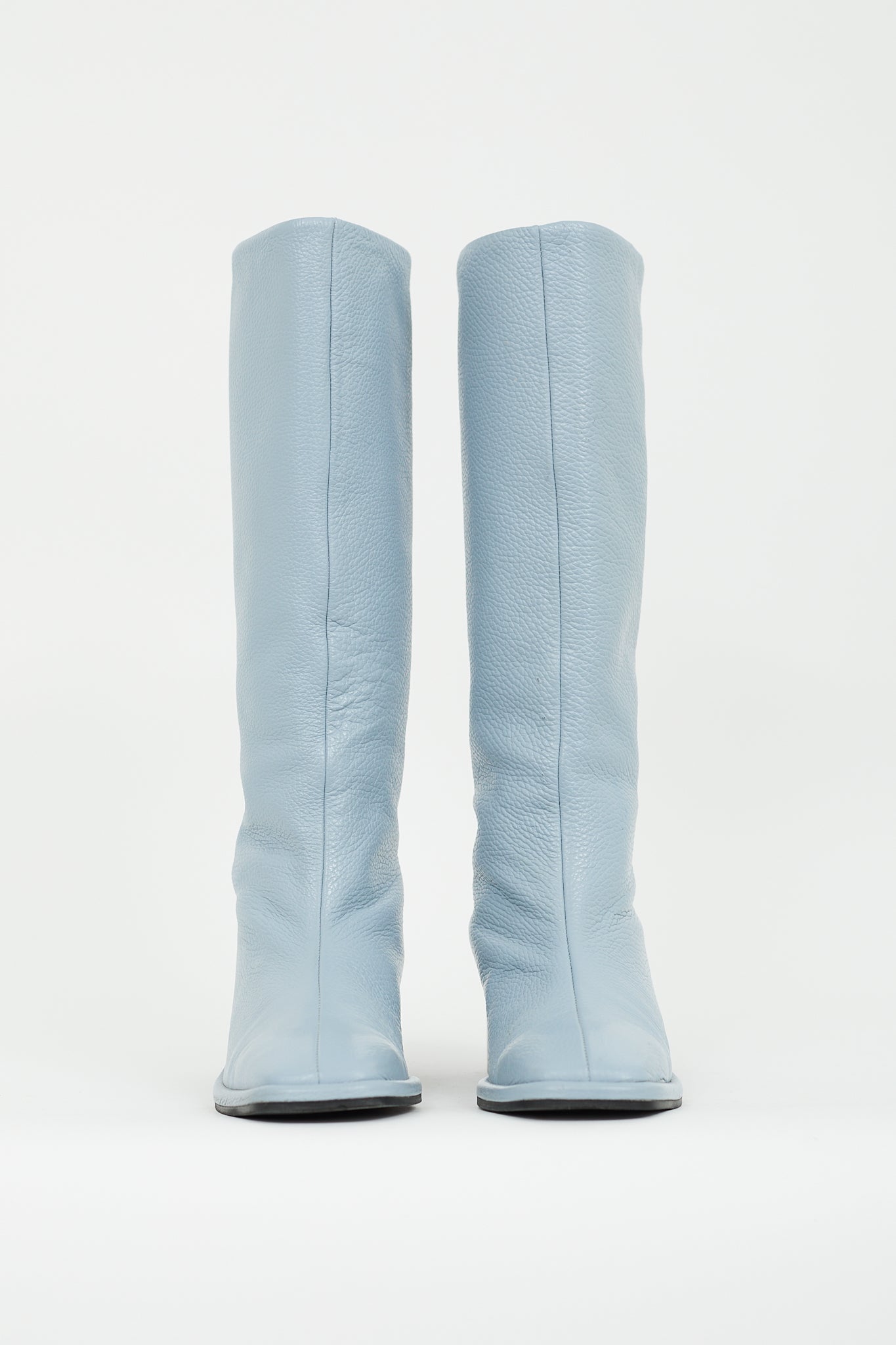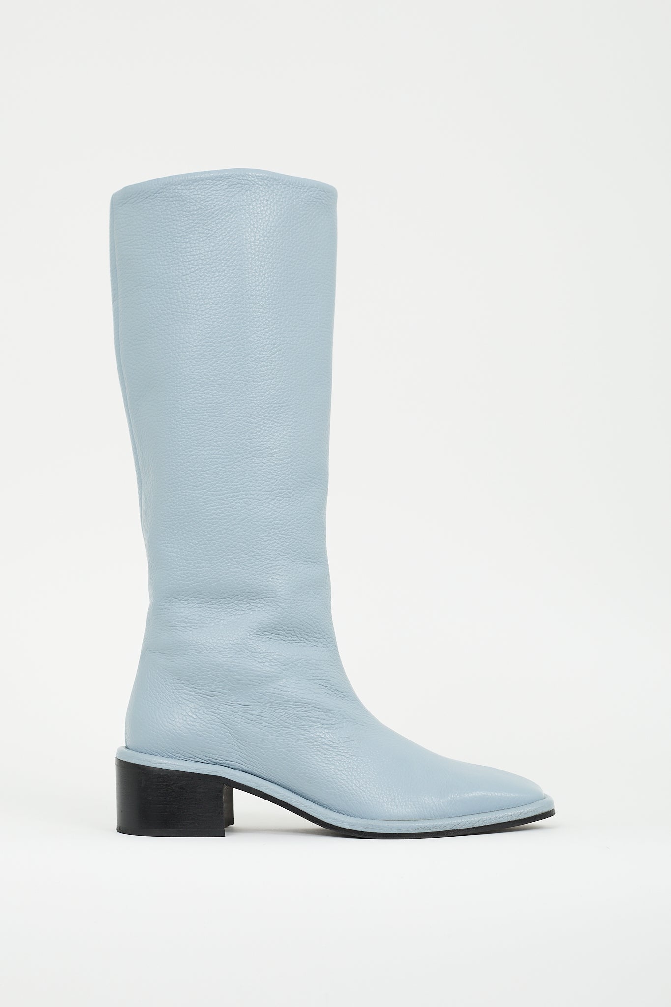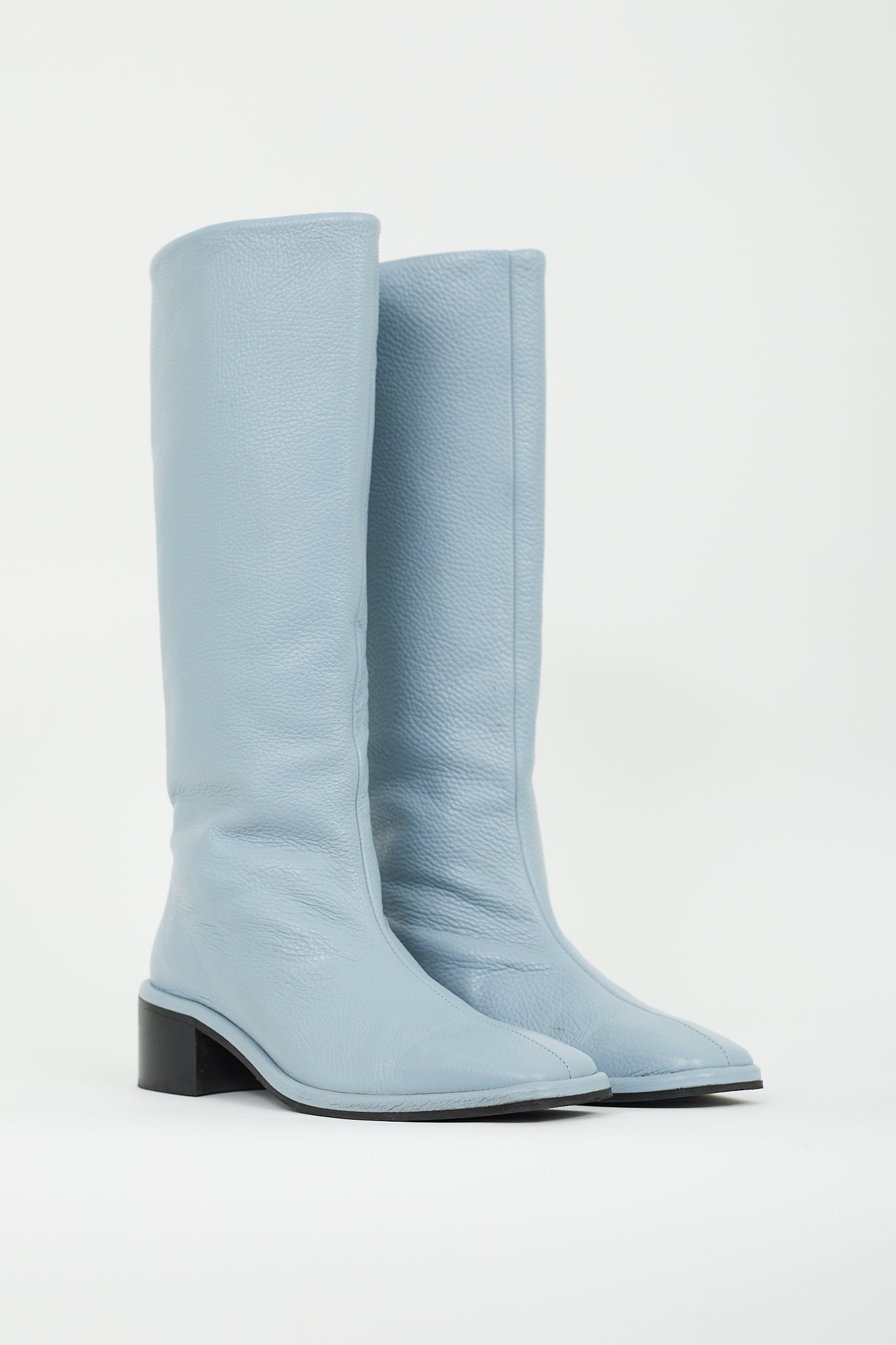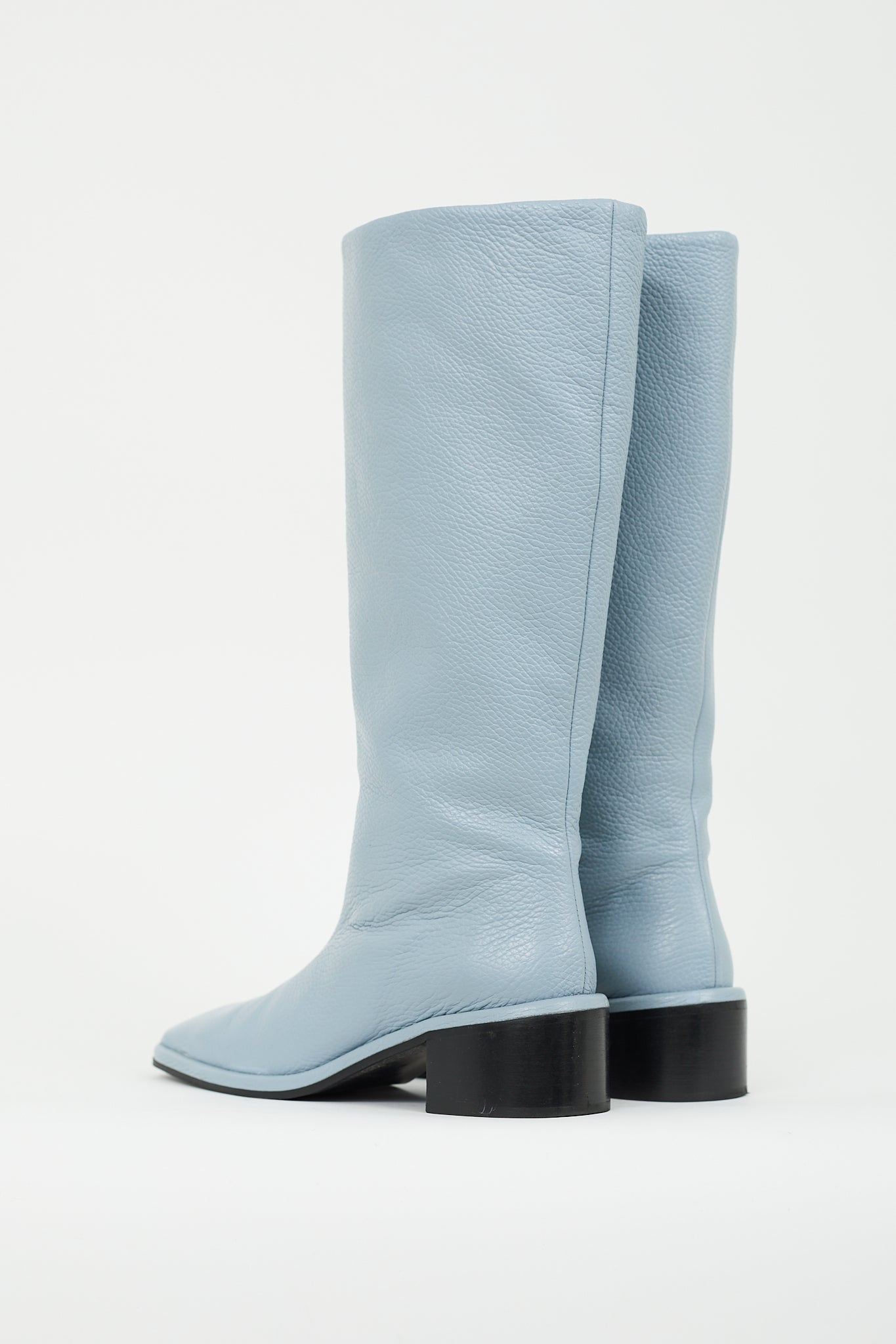 Pre-owned Maguire blue leather Carmona boots featuring tapered square toe, pull on entry, knee high shaft, and stacked block heel.