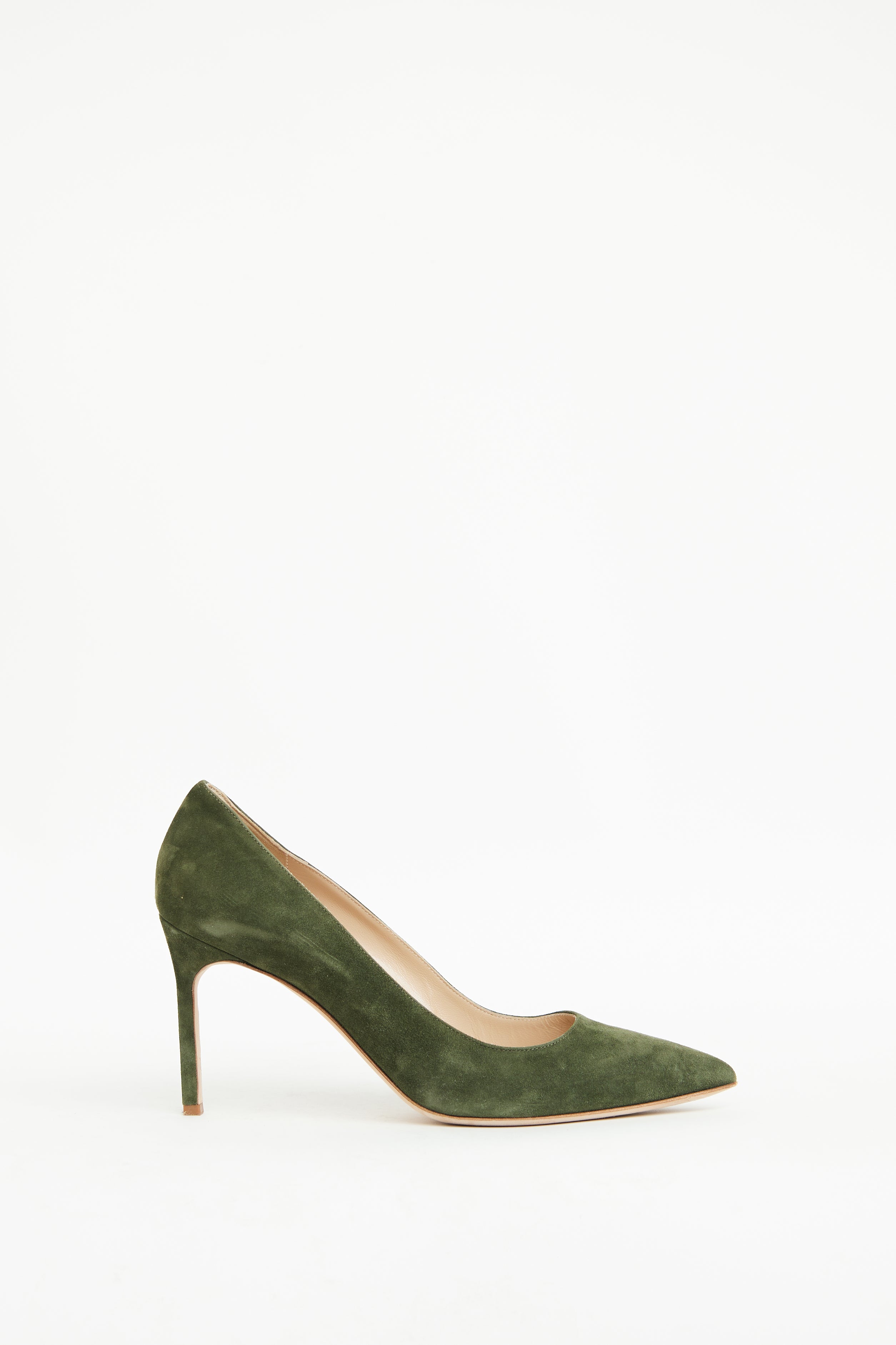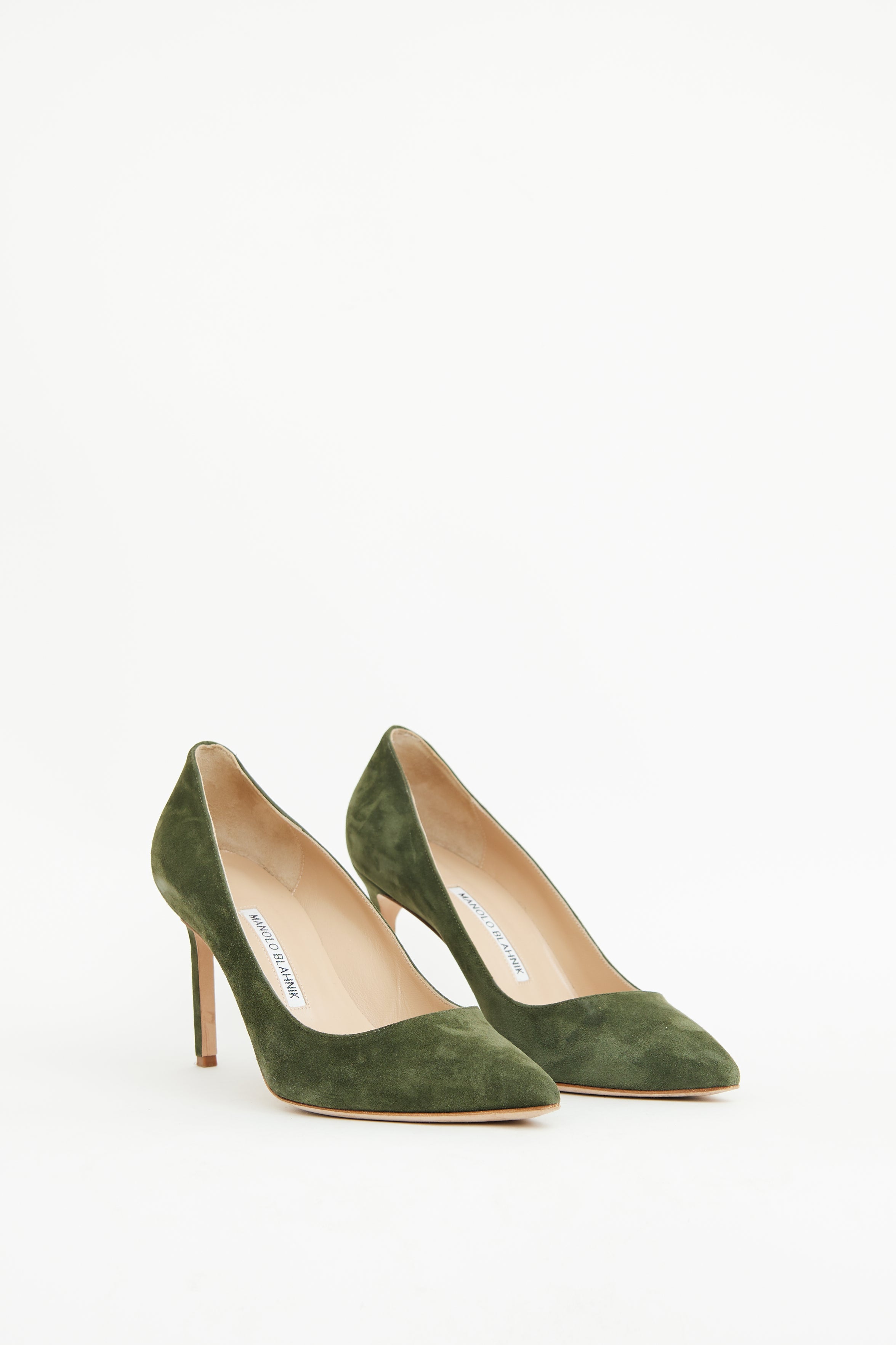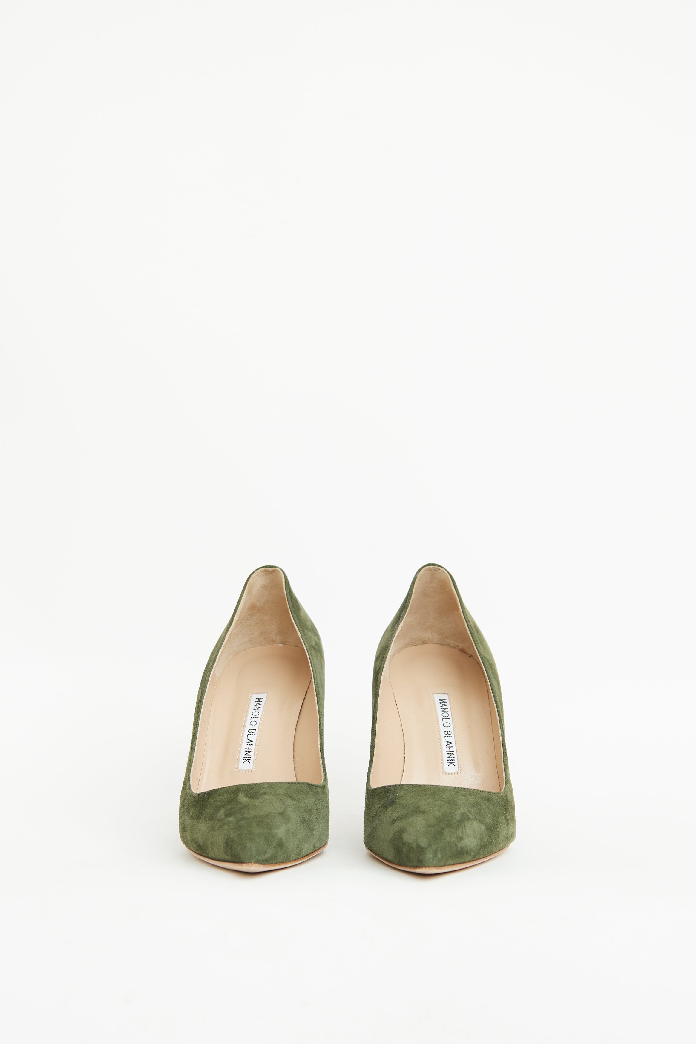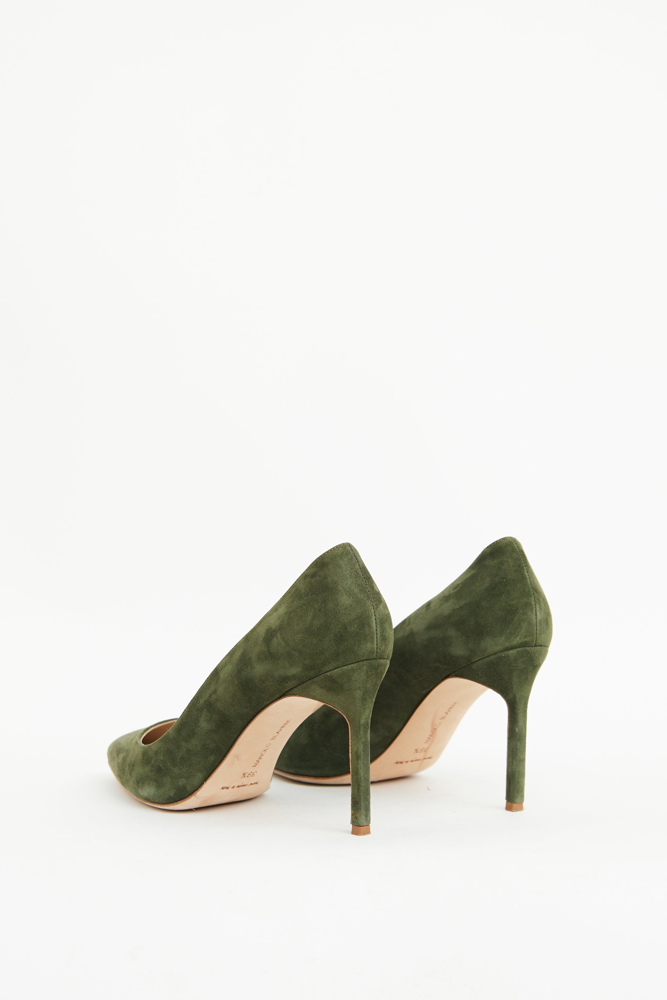 Pre-owned Manolo Blahnik green suede pumps featuring pointed toe and covered stiletto heel.