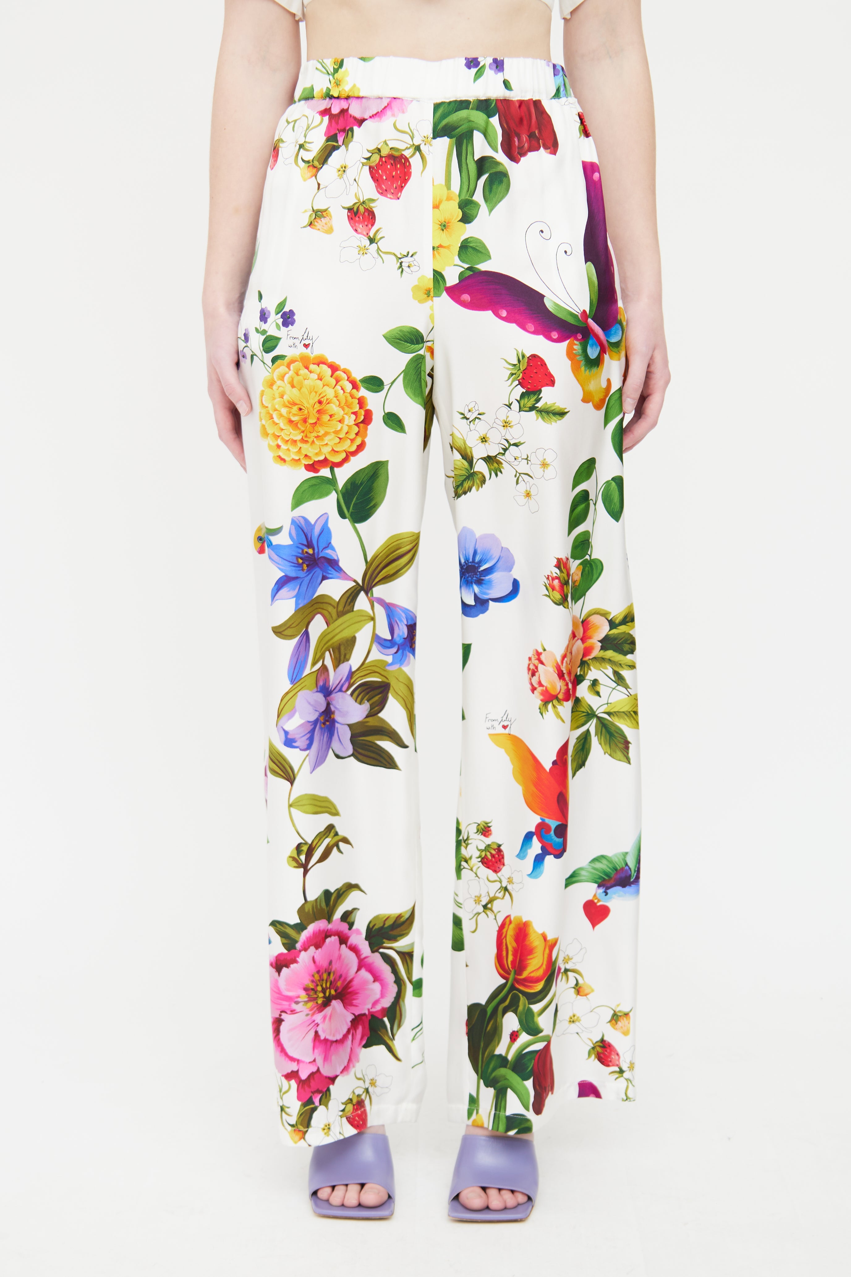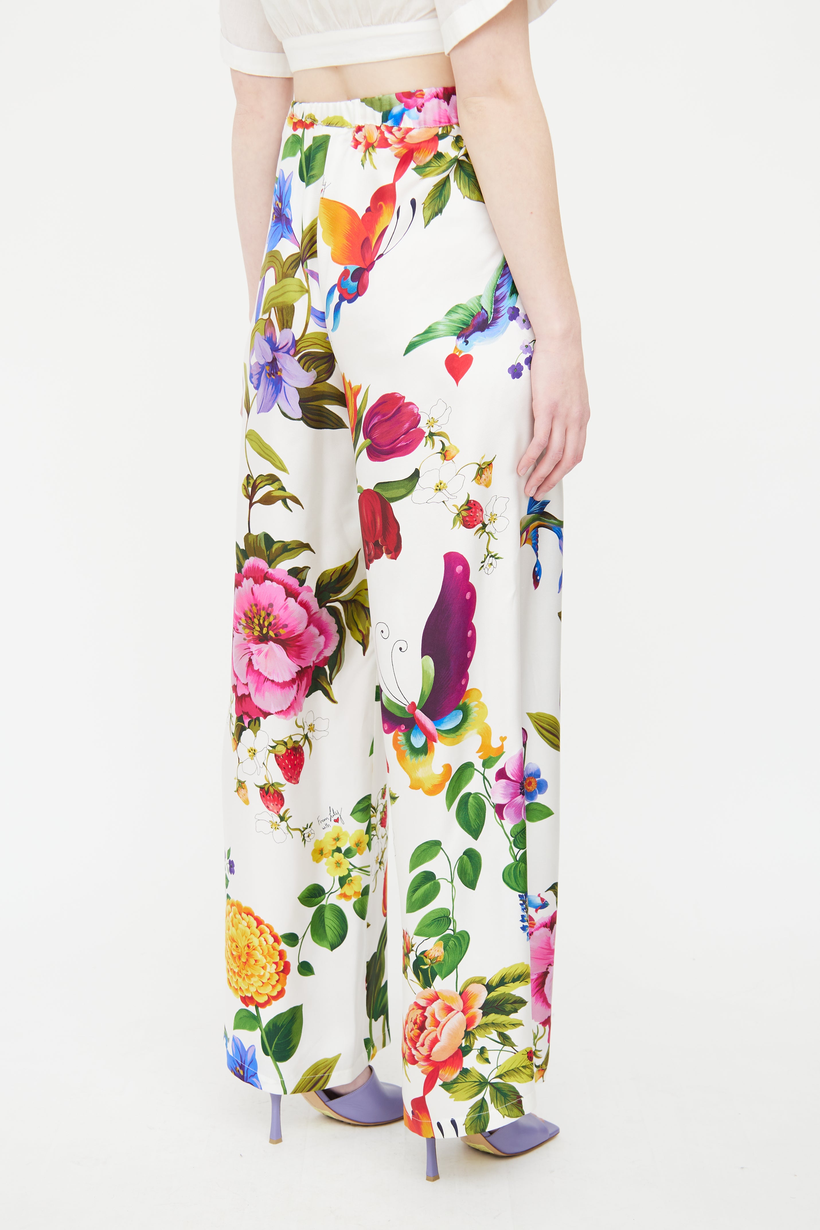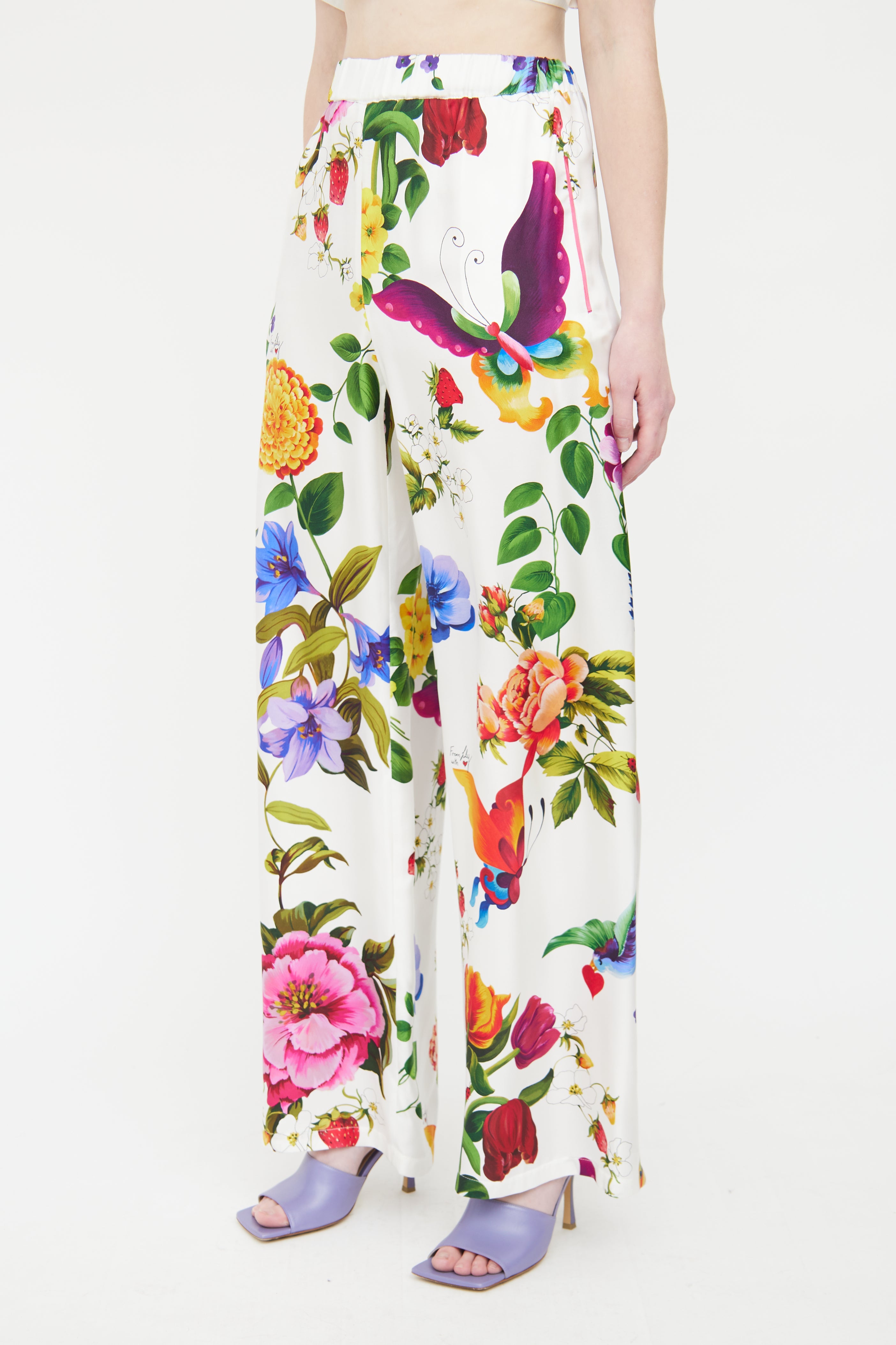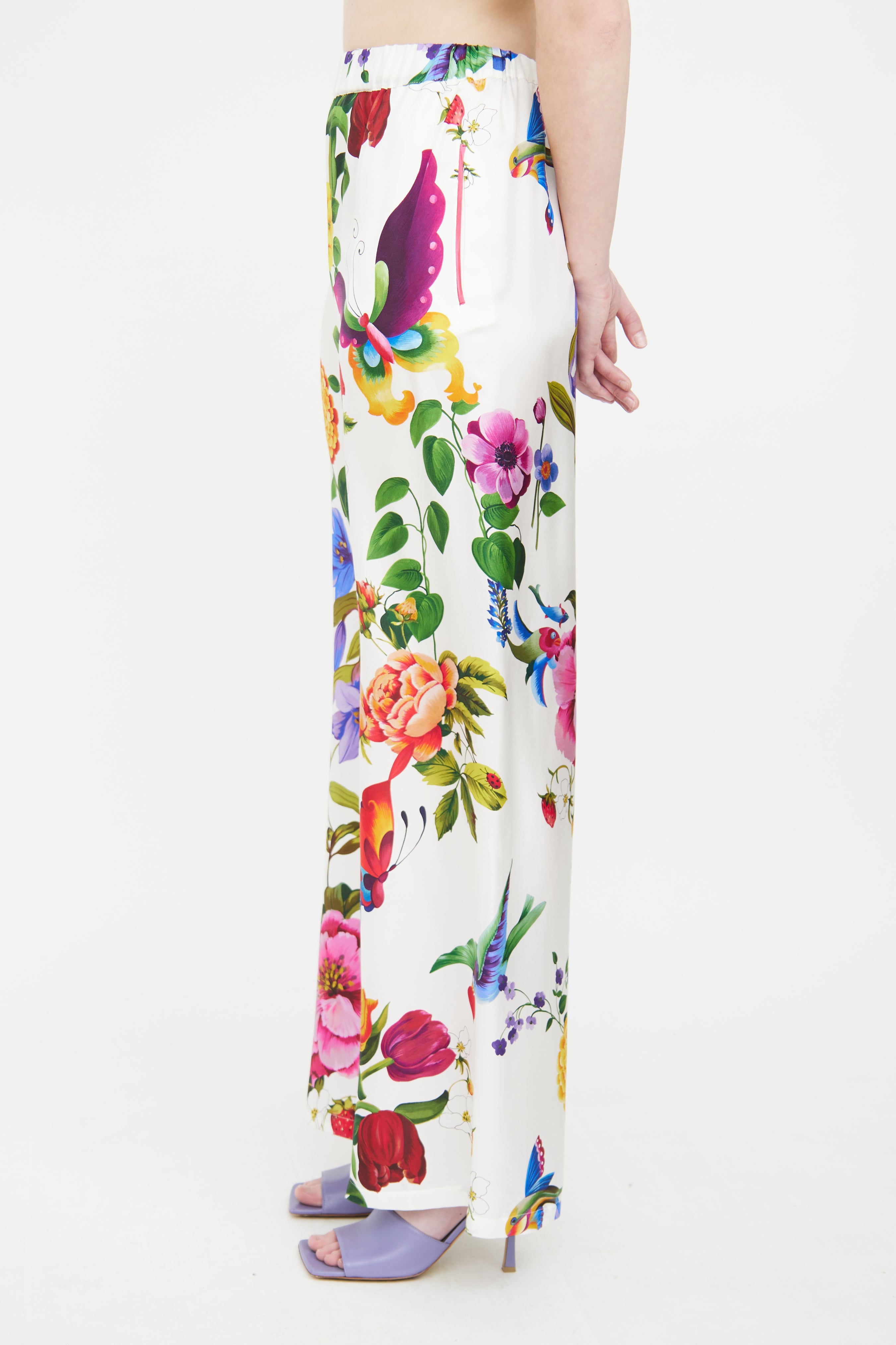Pre-owned Weekend Max Mara white silk trousers featuring multicolour floral pattern throughout, elastic waist, two slip pockets at hip, and wide leg. Clipped to fit model.