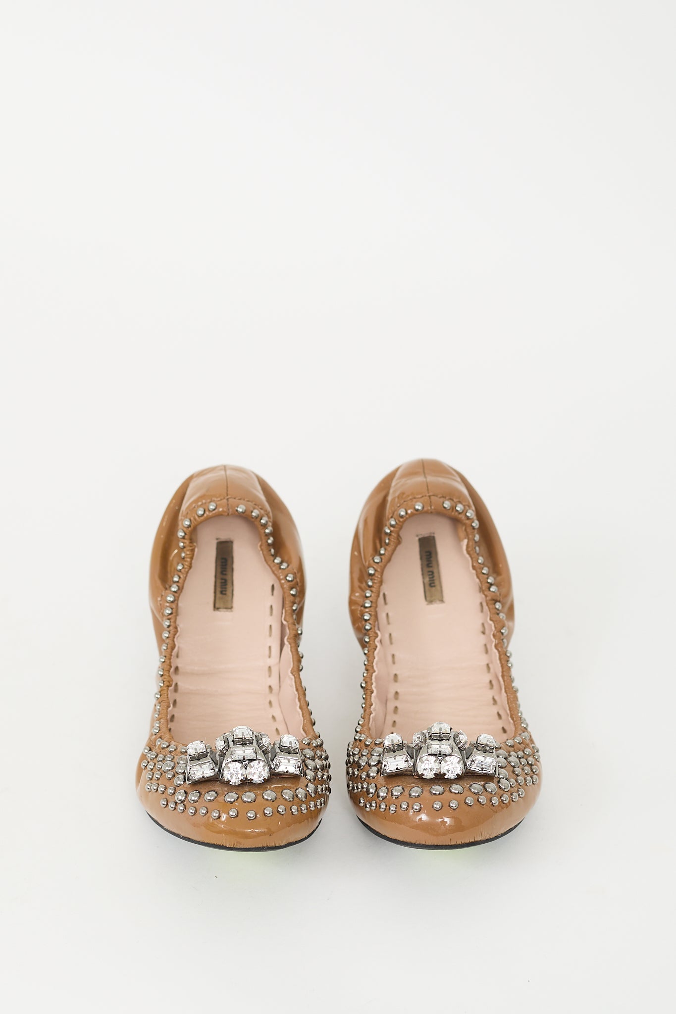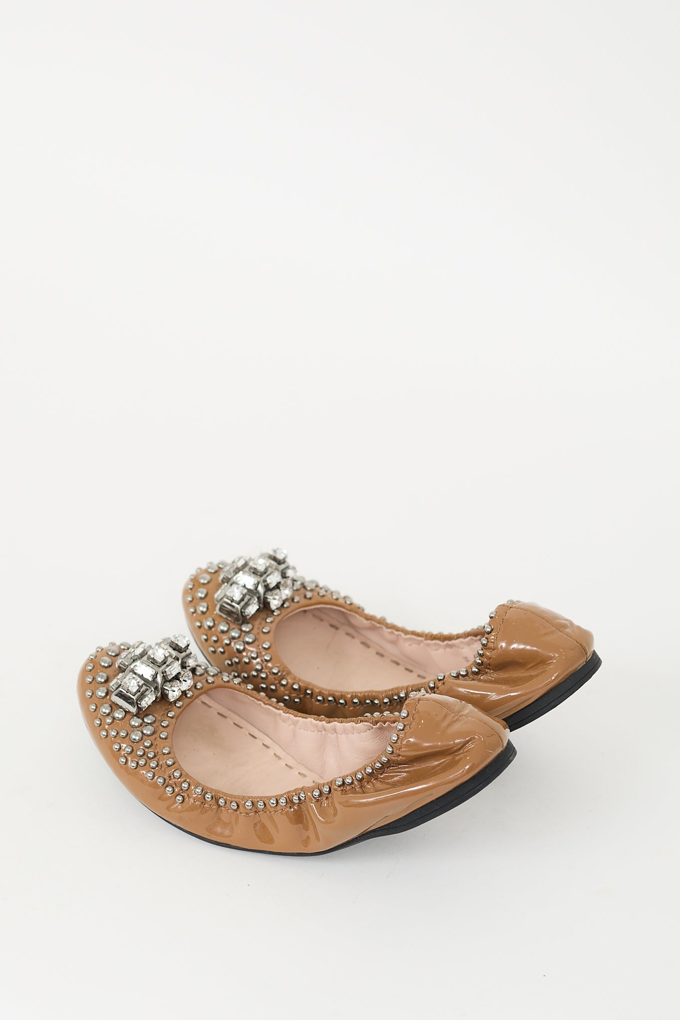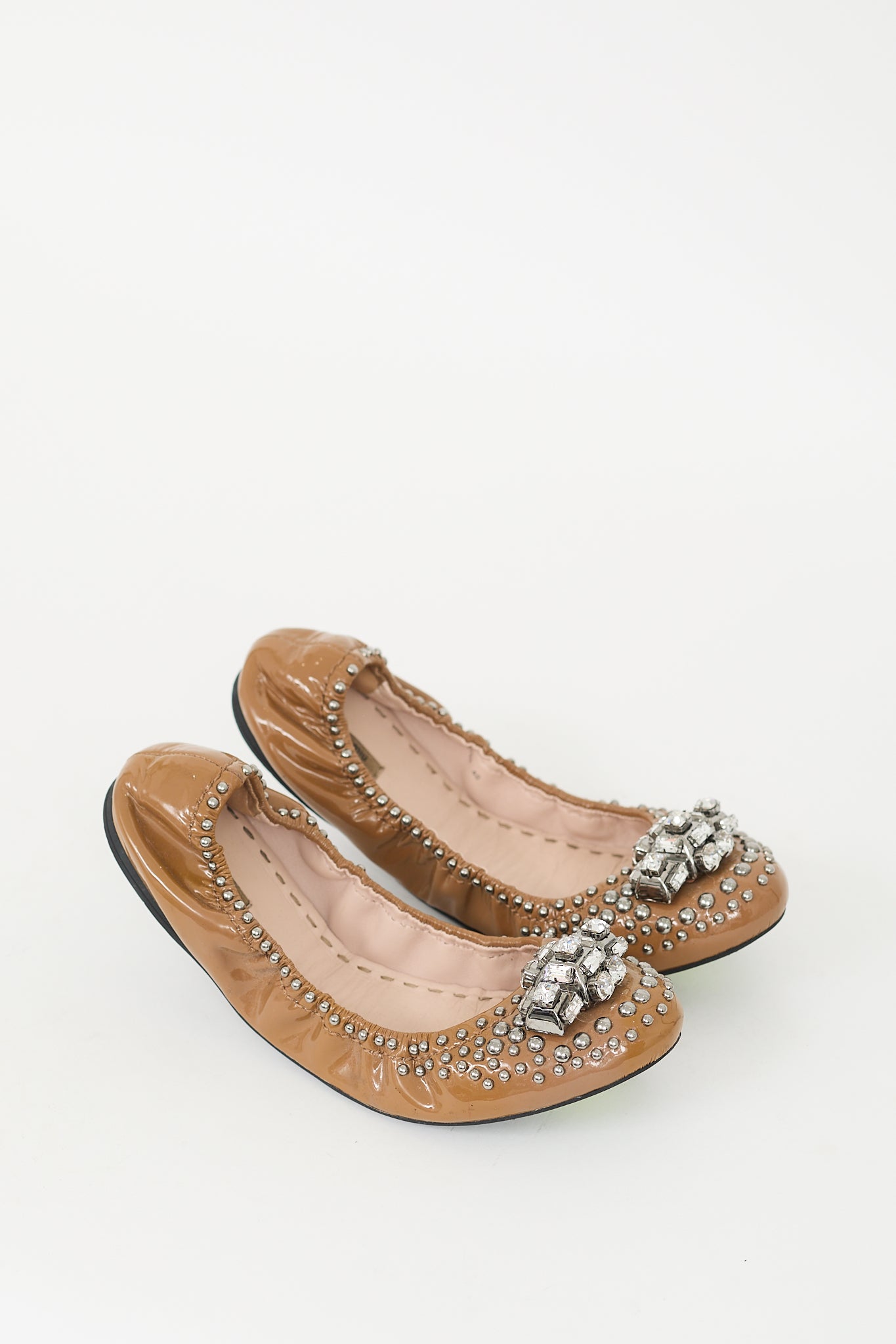 Pre-owned Miu Miu brown patent leather flats featuring rounded toe, elasticized collar, silver tone jewel and stud embellishment at vamp, and slip on entry.