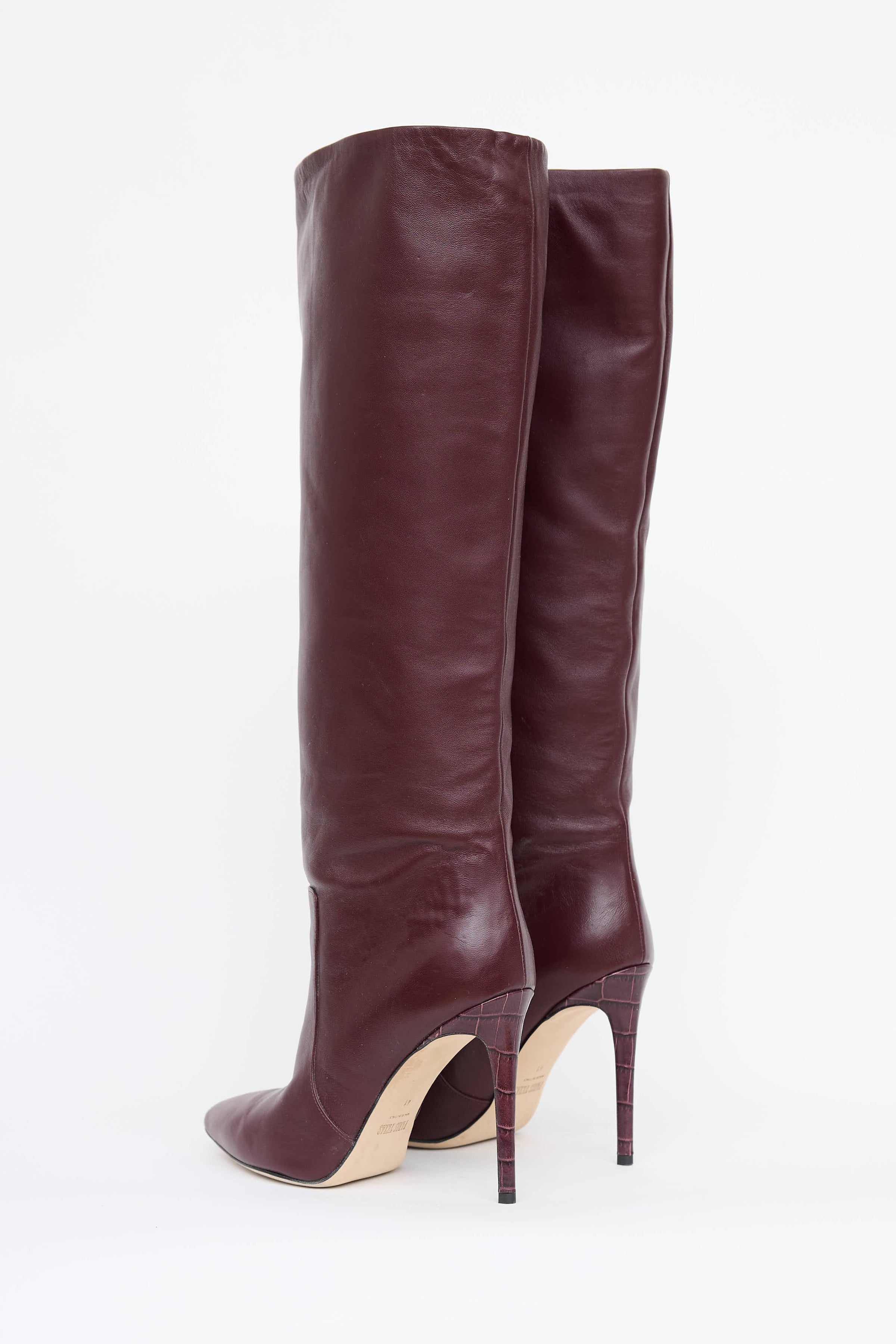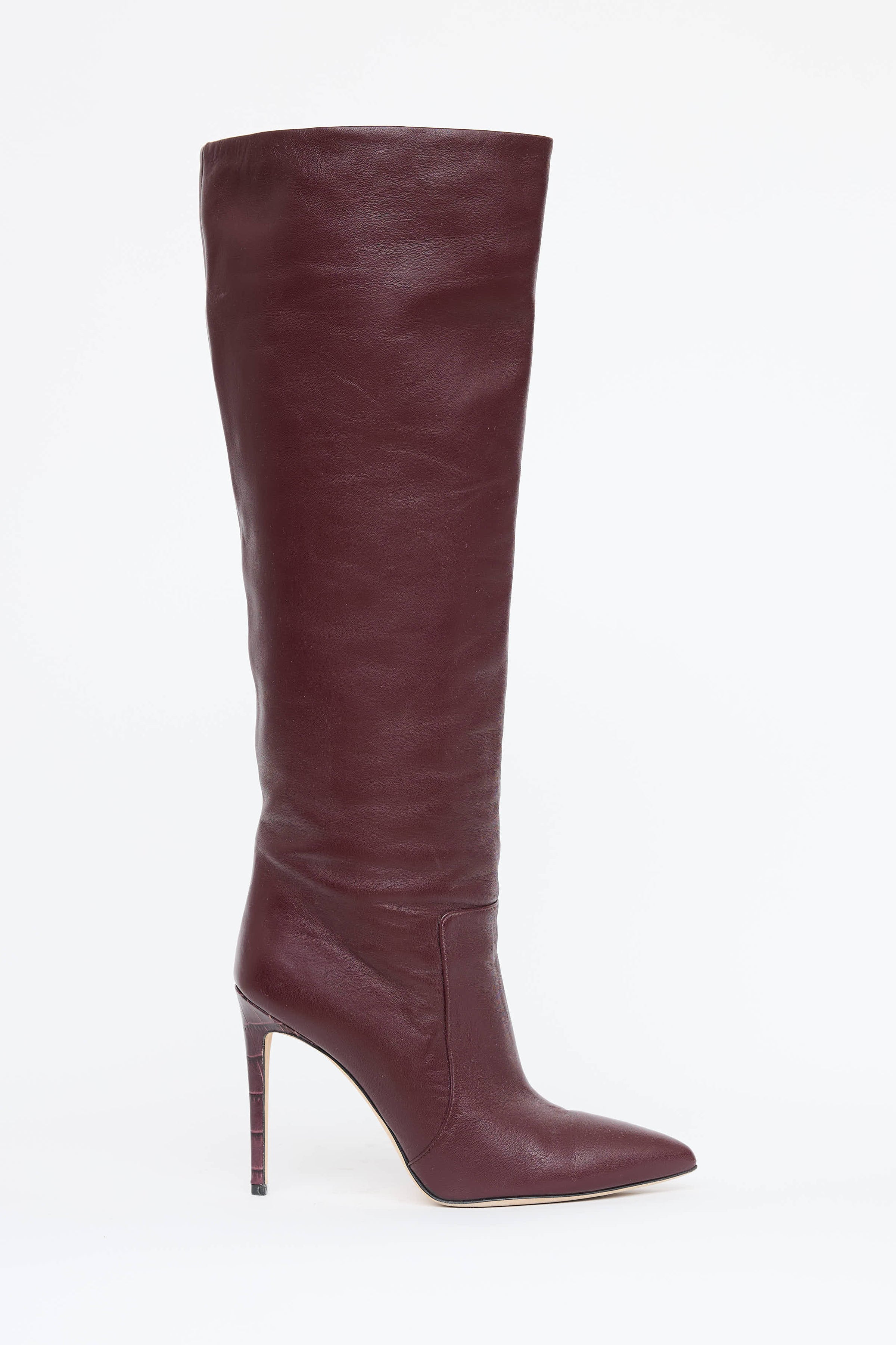 Pre-owned Paris Texas burgundy leather knee high boot featuring pointed toe, embossed leather stiletto heel, and wide shaft.