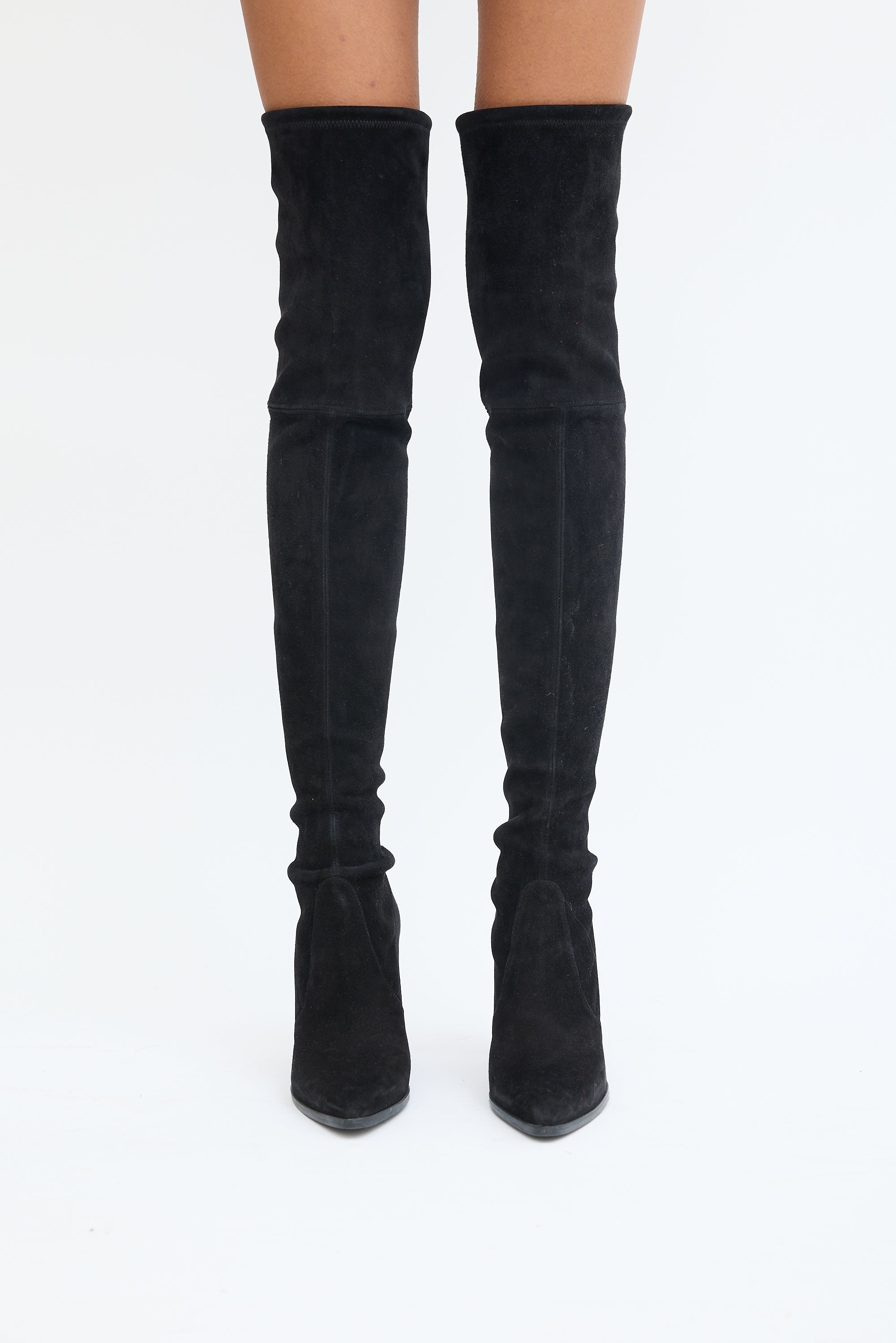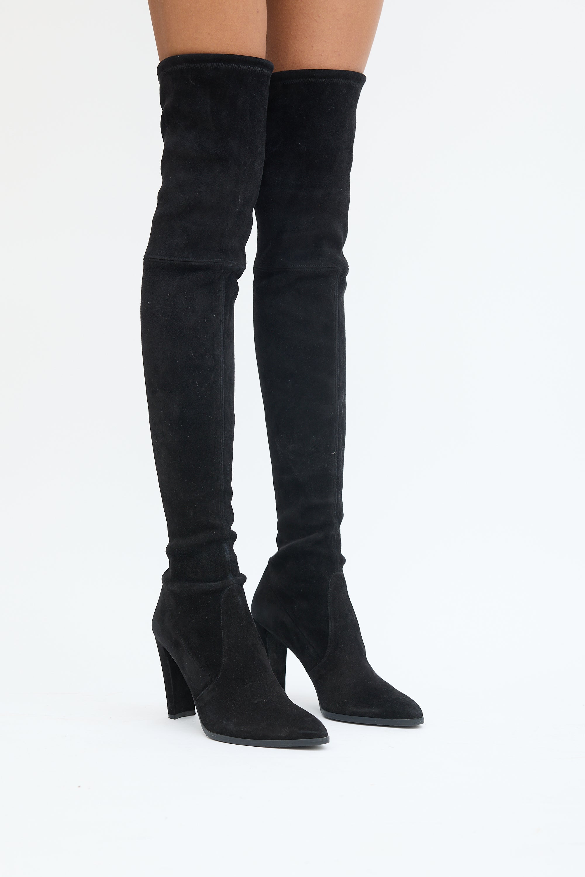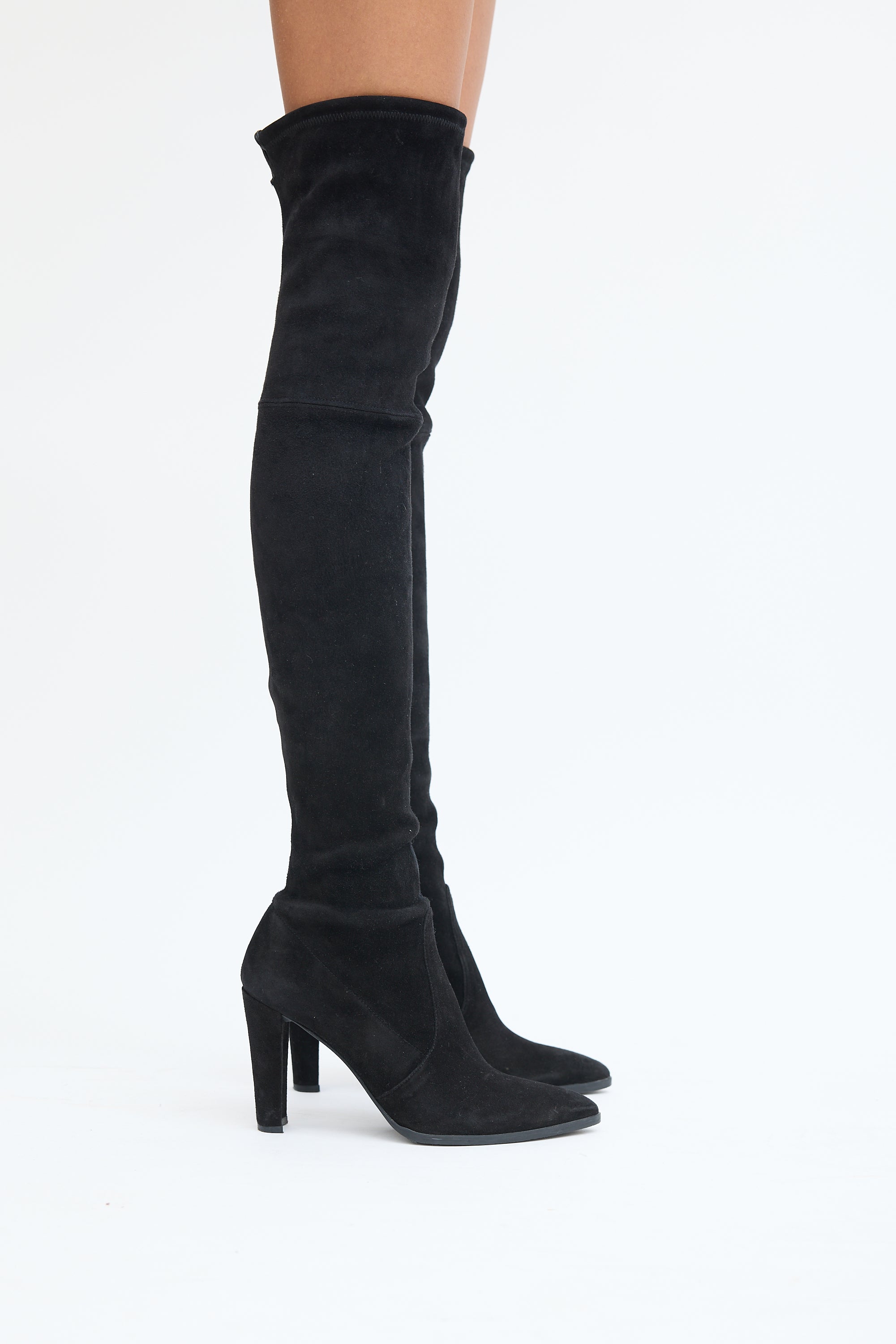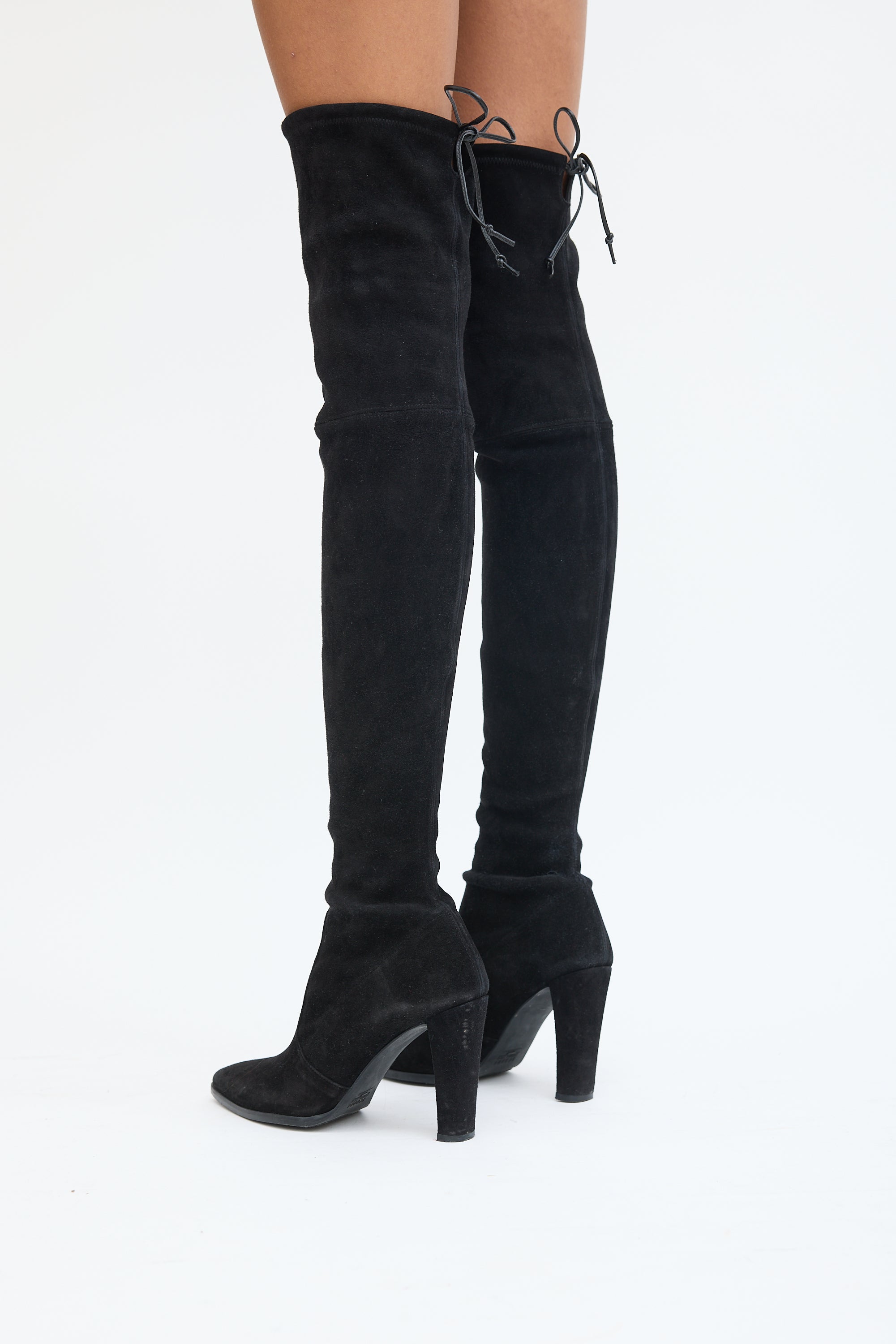 Pre-owned Stuart Weitzman black suede knee high boot featuring a pointed toe, block heel, knee high shaft with leather lace up closure at back, and rubber logo embossed outsole.