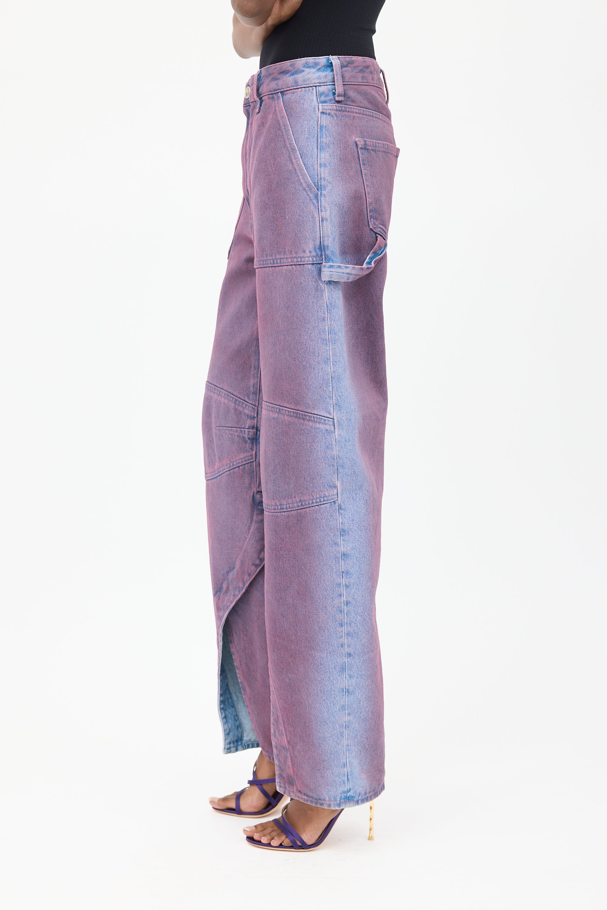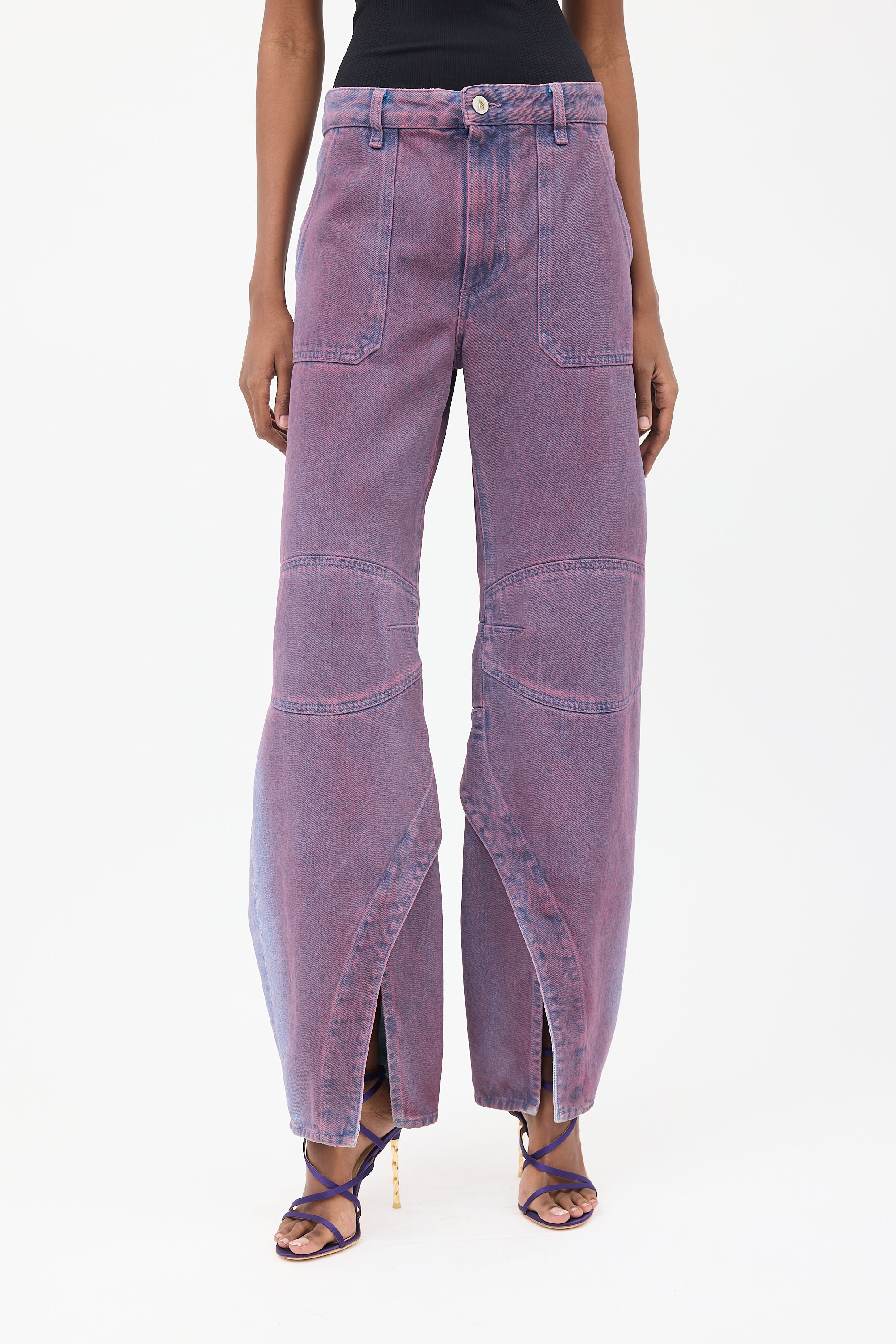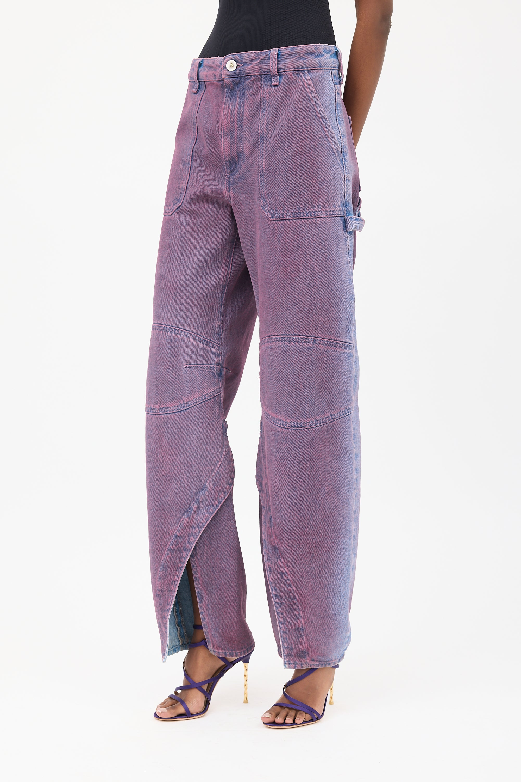 Pre-owned The Attico purple tinted Nox cargo jeans featuring belt loops, four pocket styling, and split cuffs. Clipped to fit model.