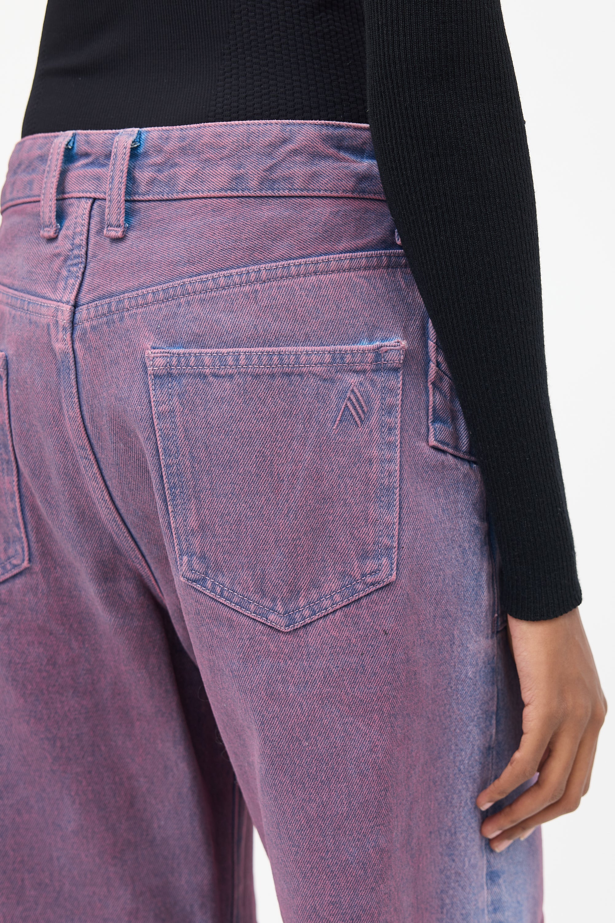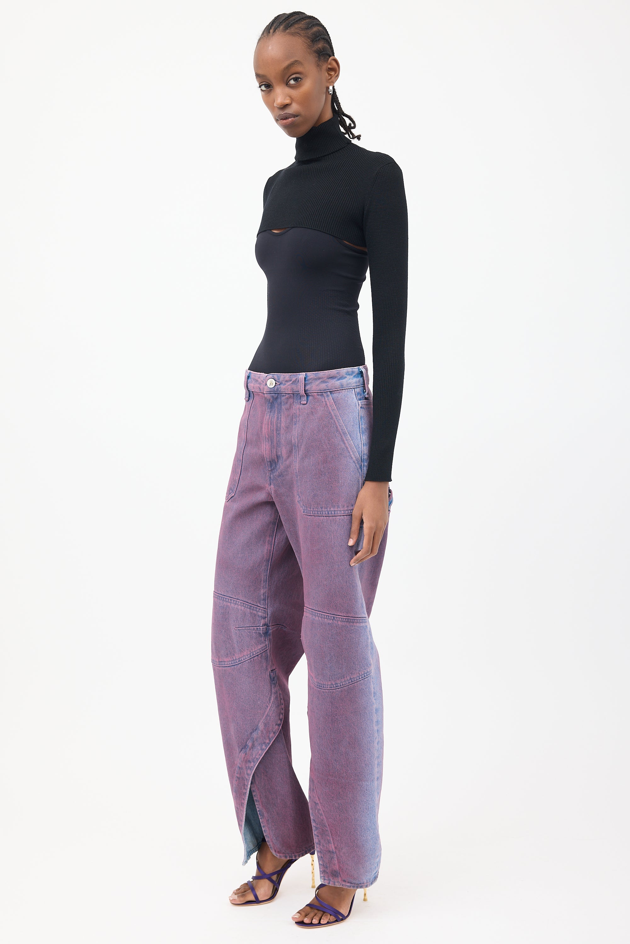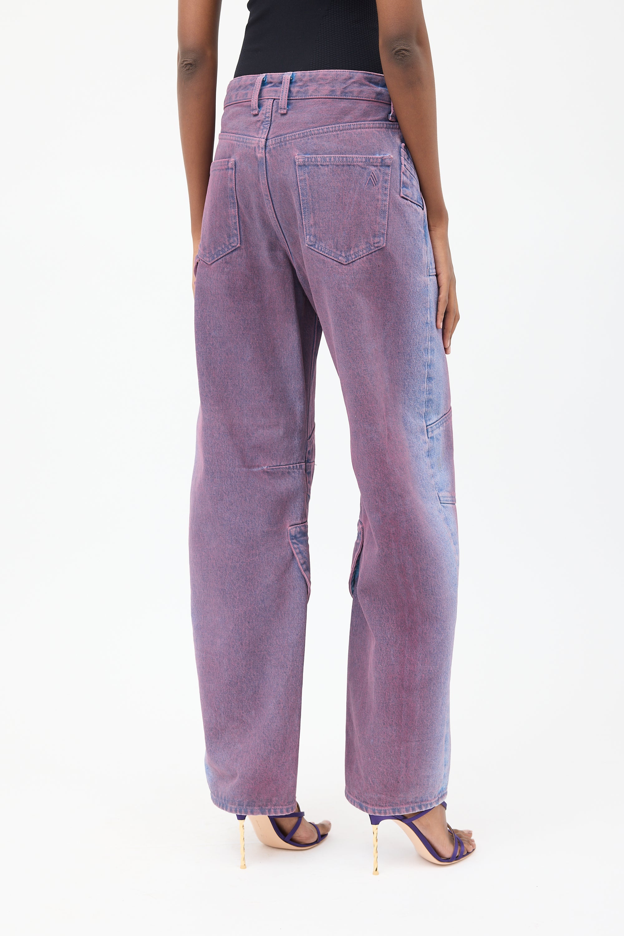 Pre-owned The Attico purple tinted Nox cargo jeans featuring belt loops, four pocket styling, and split cuffs. Clipped to fit model.
