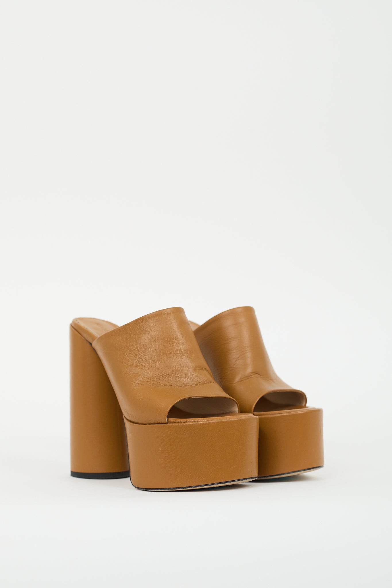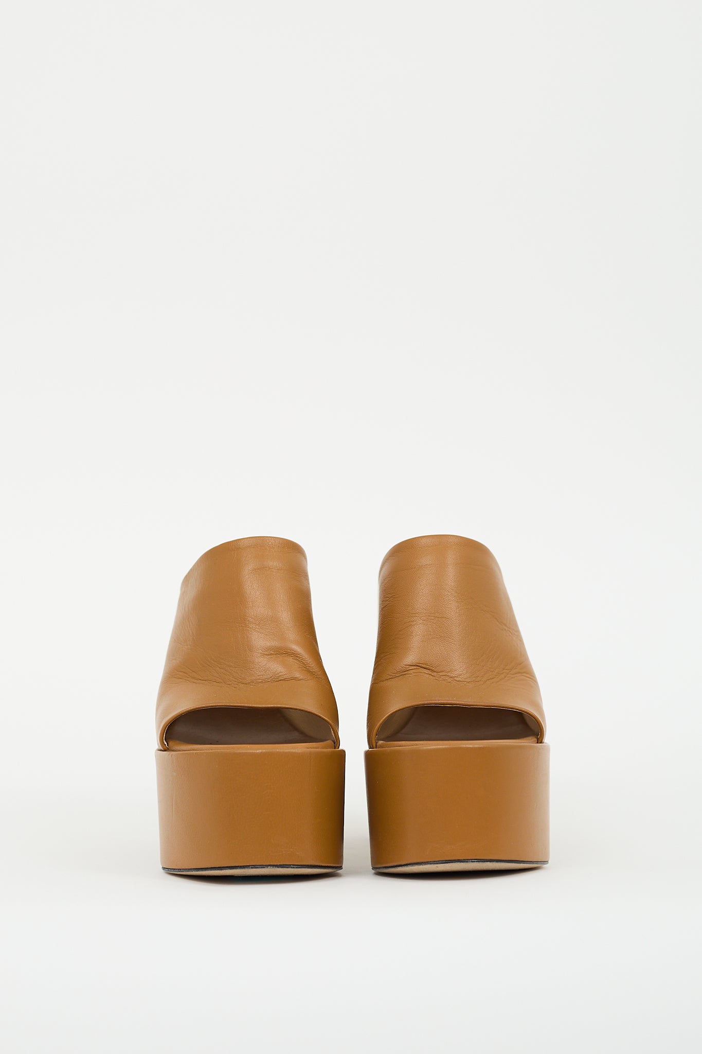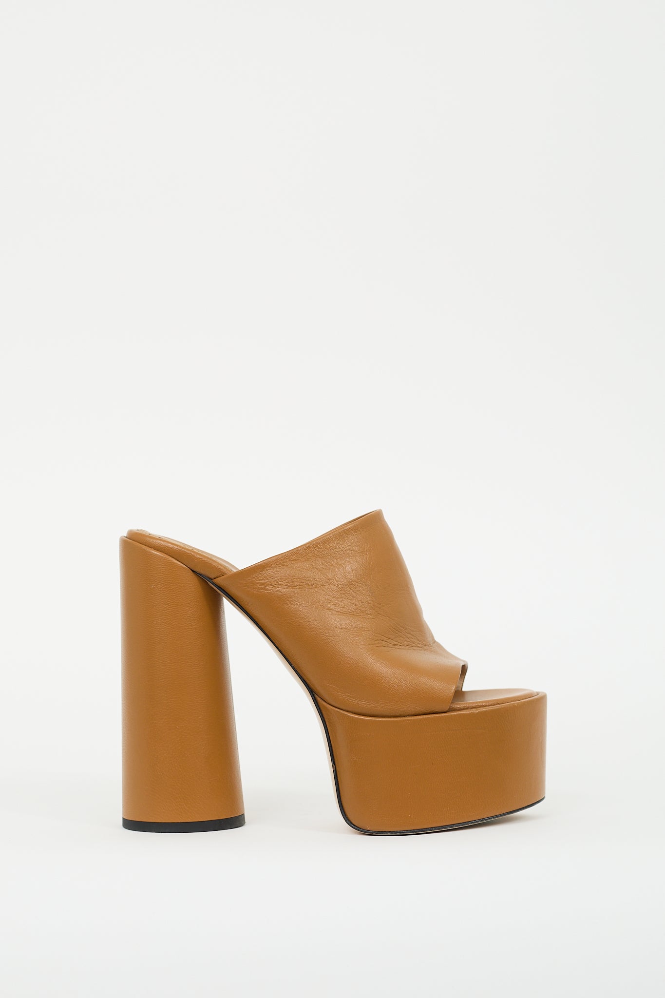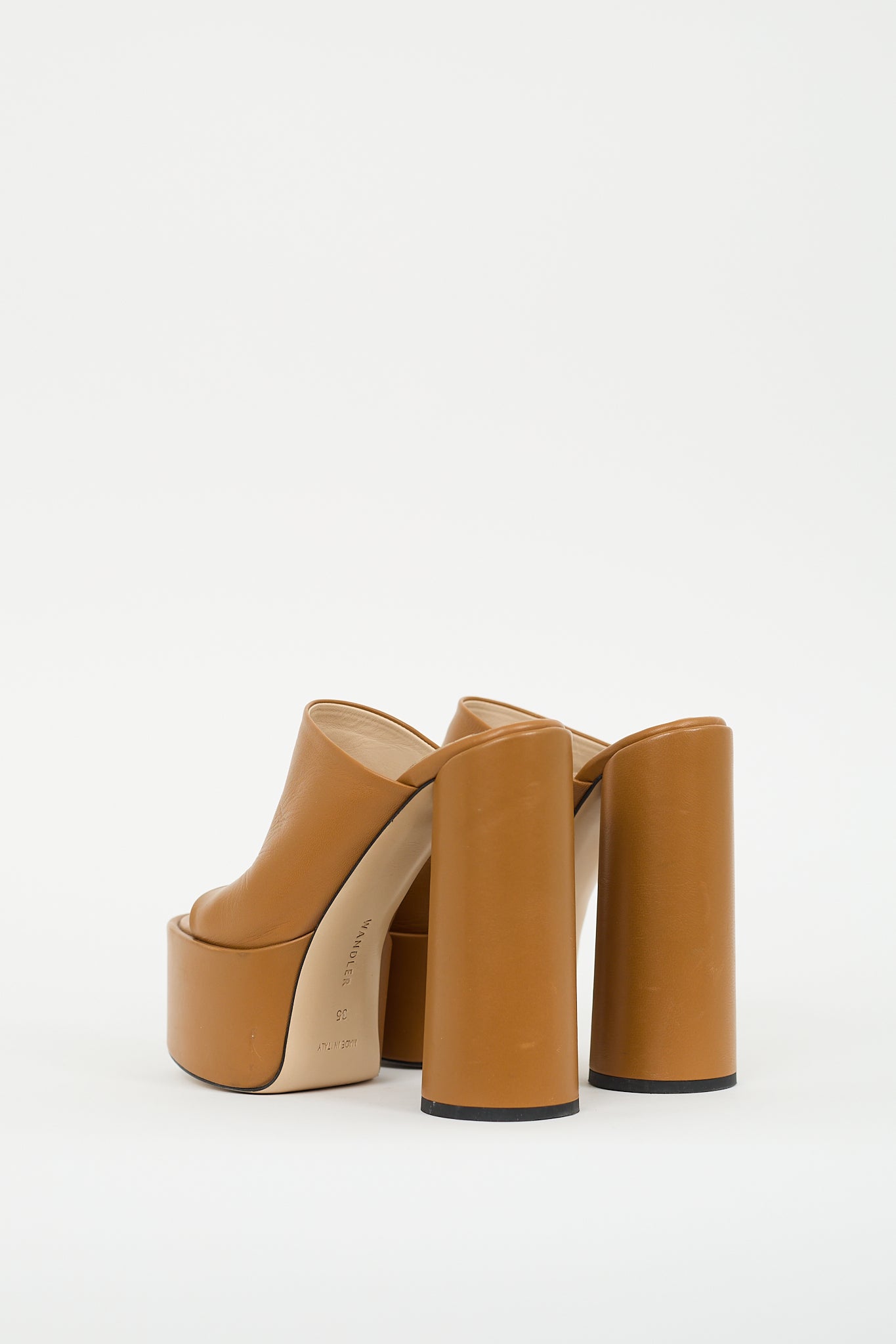 Pre-owned Wandler brown leather Electra heels featuring rounded peep toe, wide strap across vamp, covered platform and cylindrical heel, and slip on entry. Comes with original dust bag.