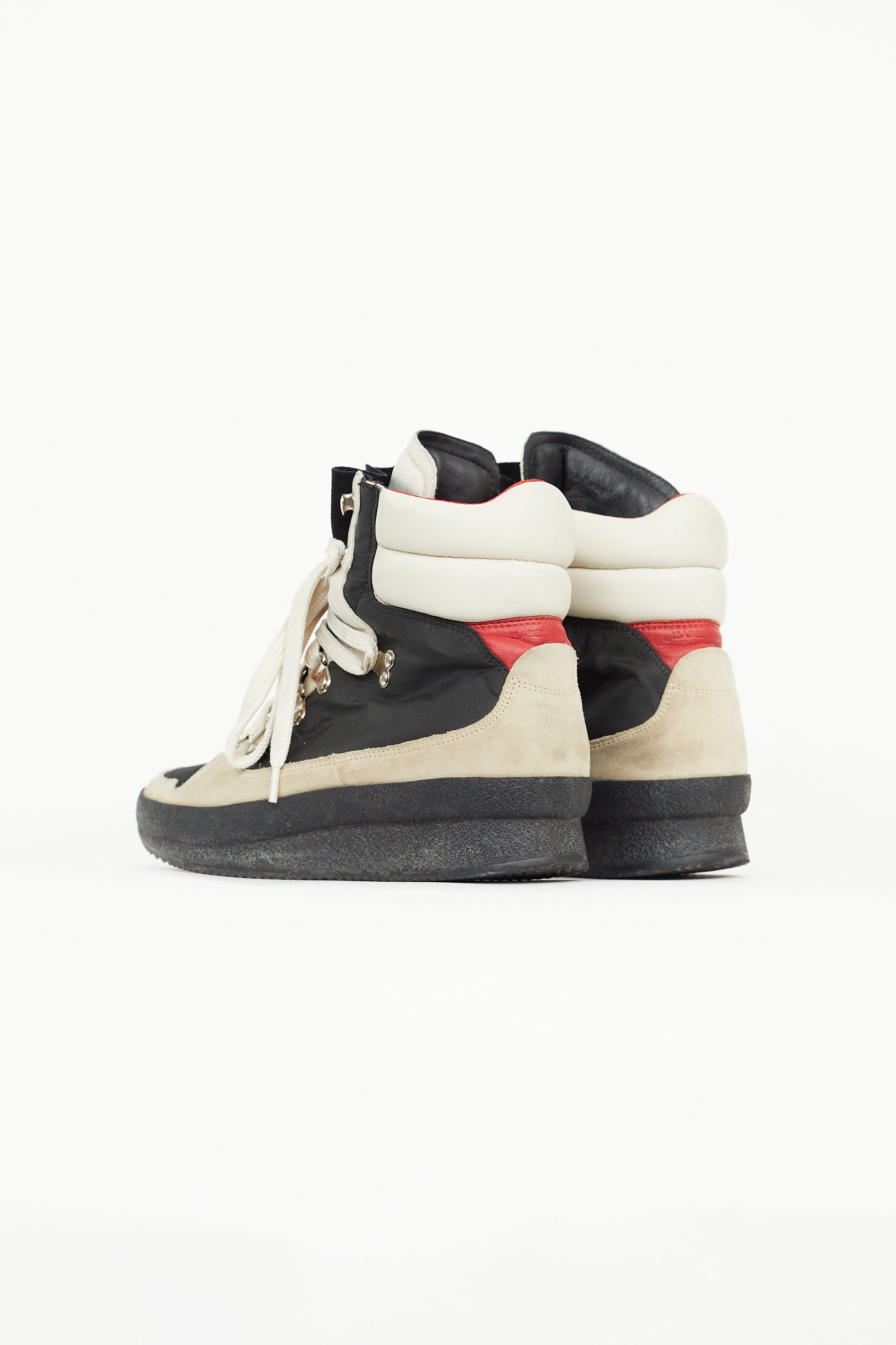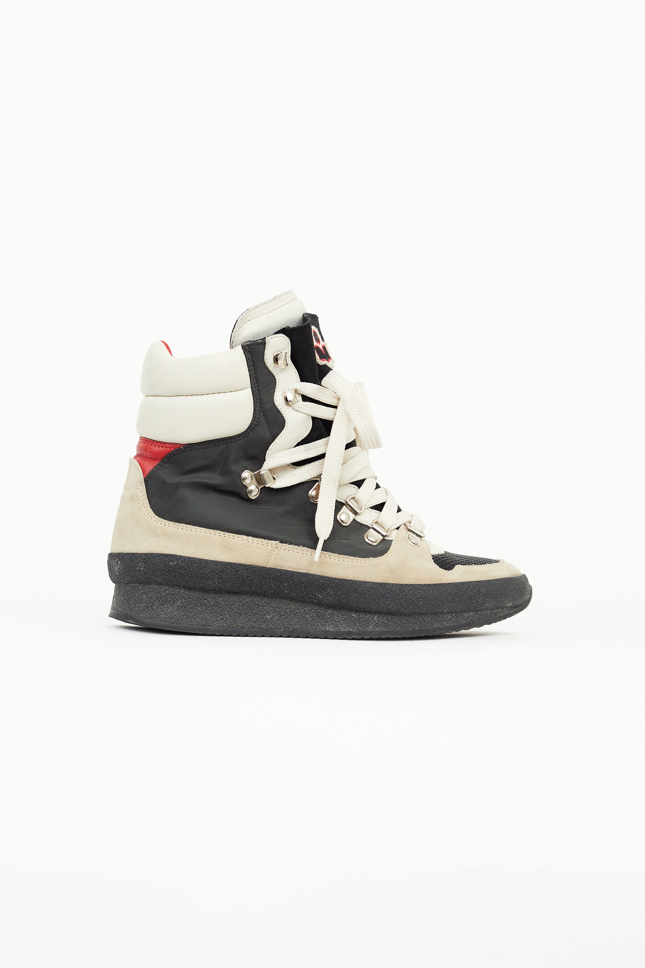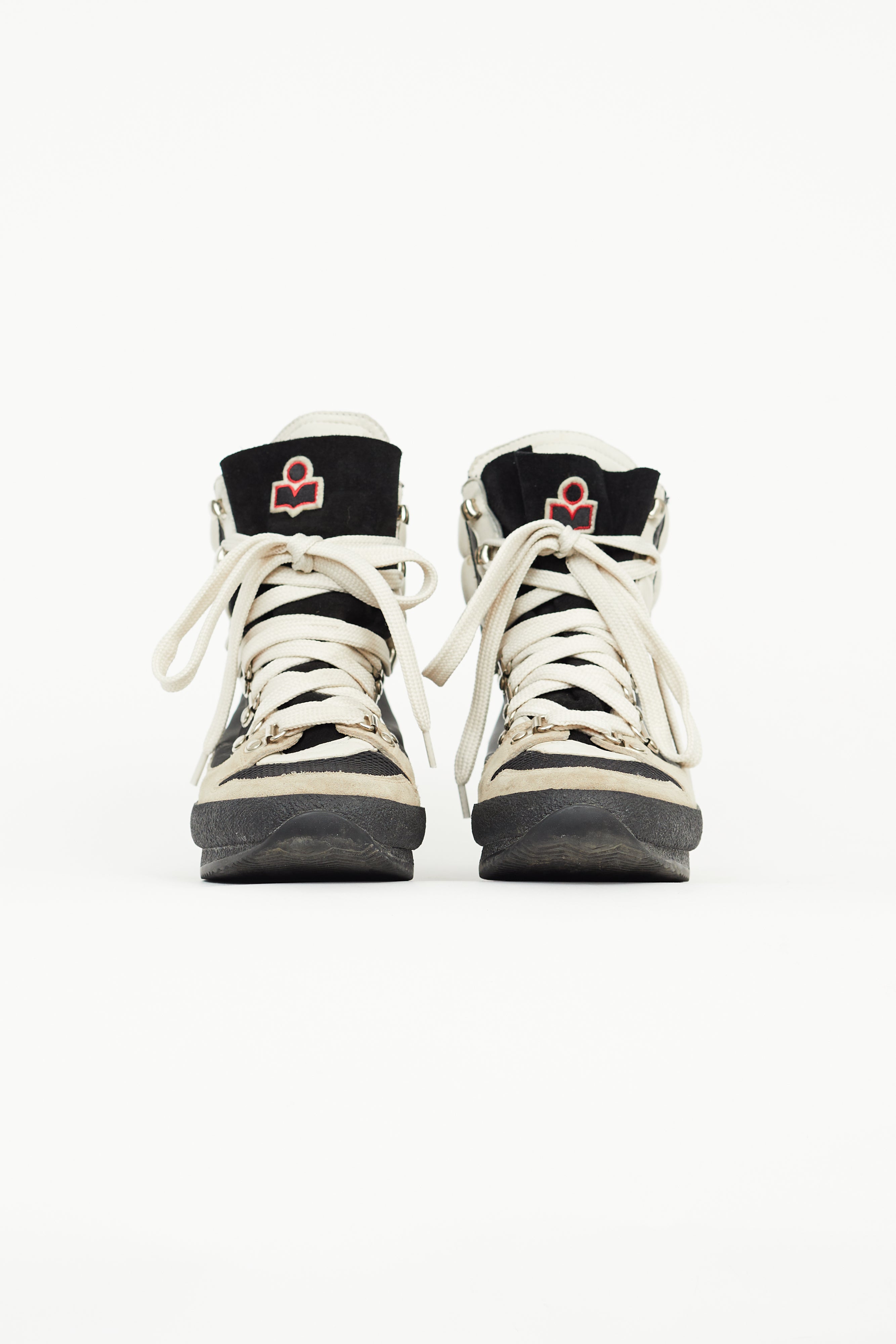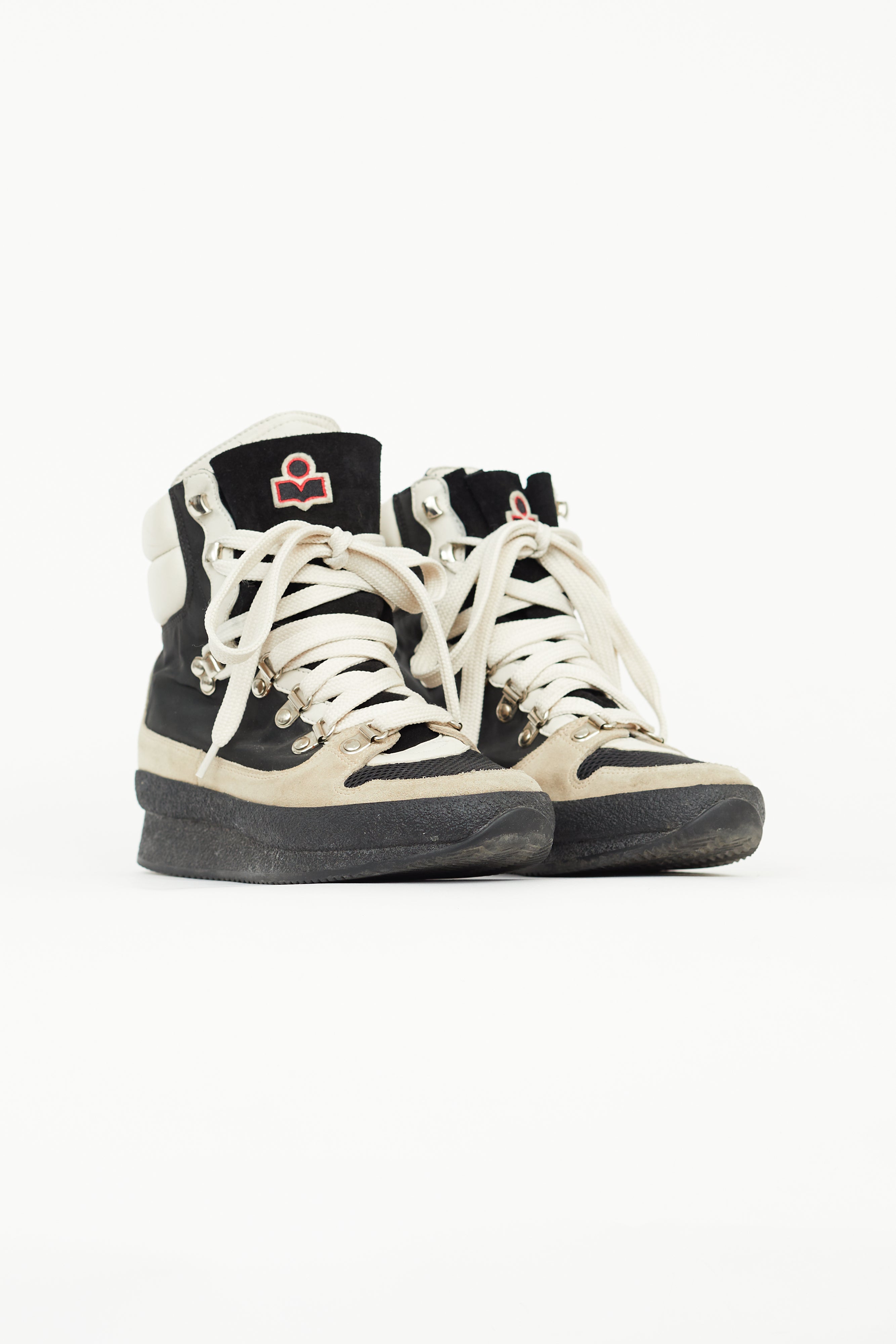 Pre-owned Isabel Marant black Brendta boots featuring rounded toe, beige suede trim, lace up vamp, silver tone hardware, logo patch at tongue, red nylon insole, embossed logo at heel counter, and concealed wedge heel.