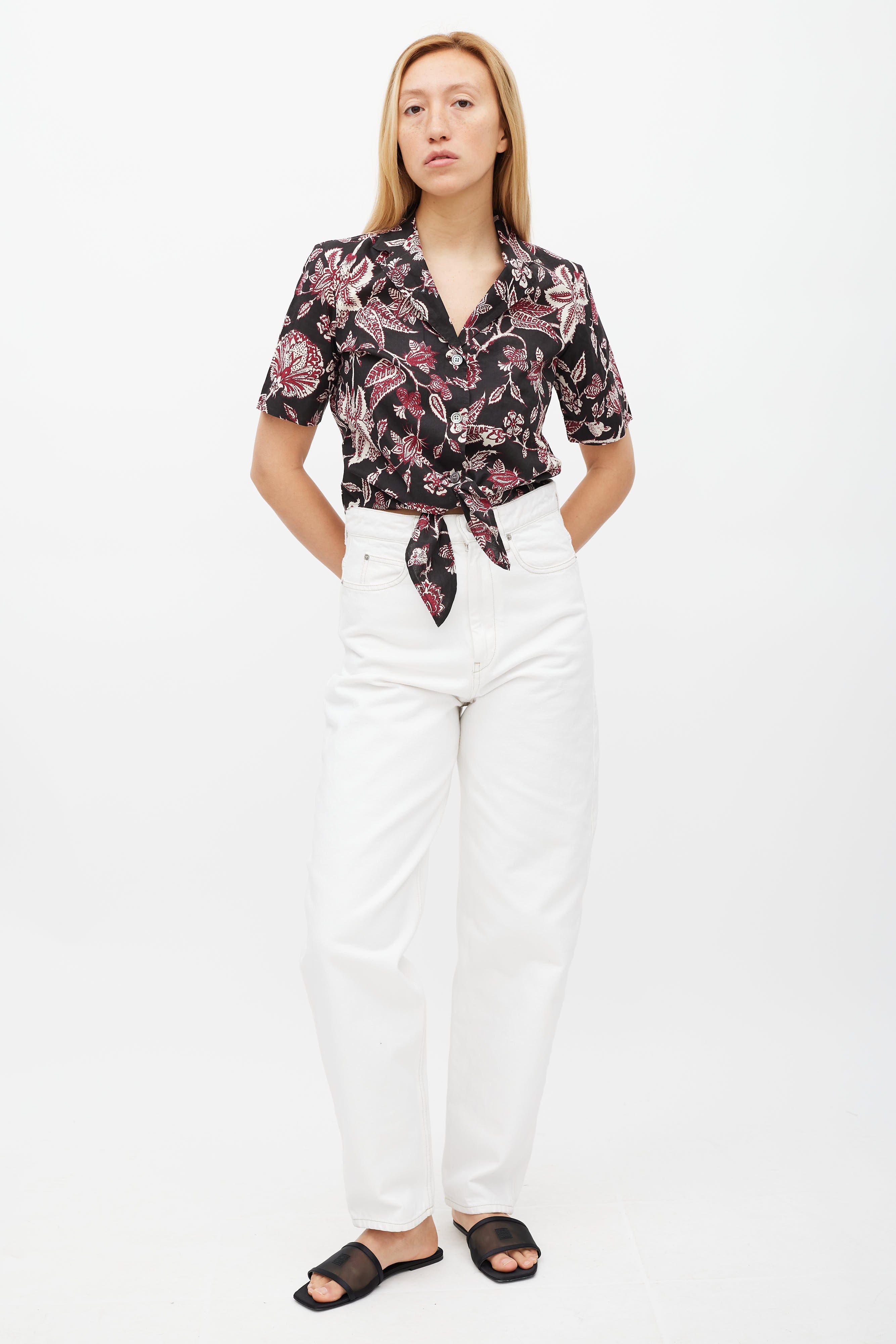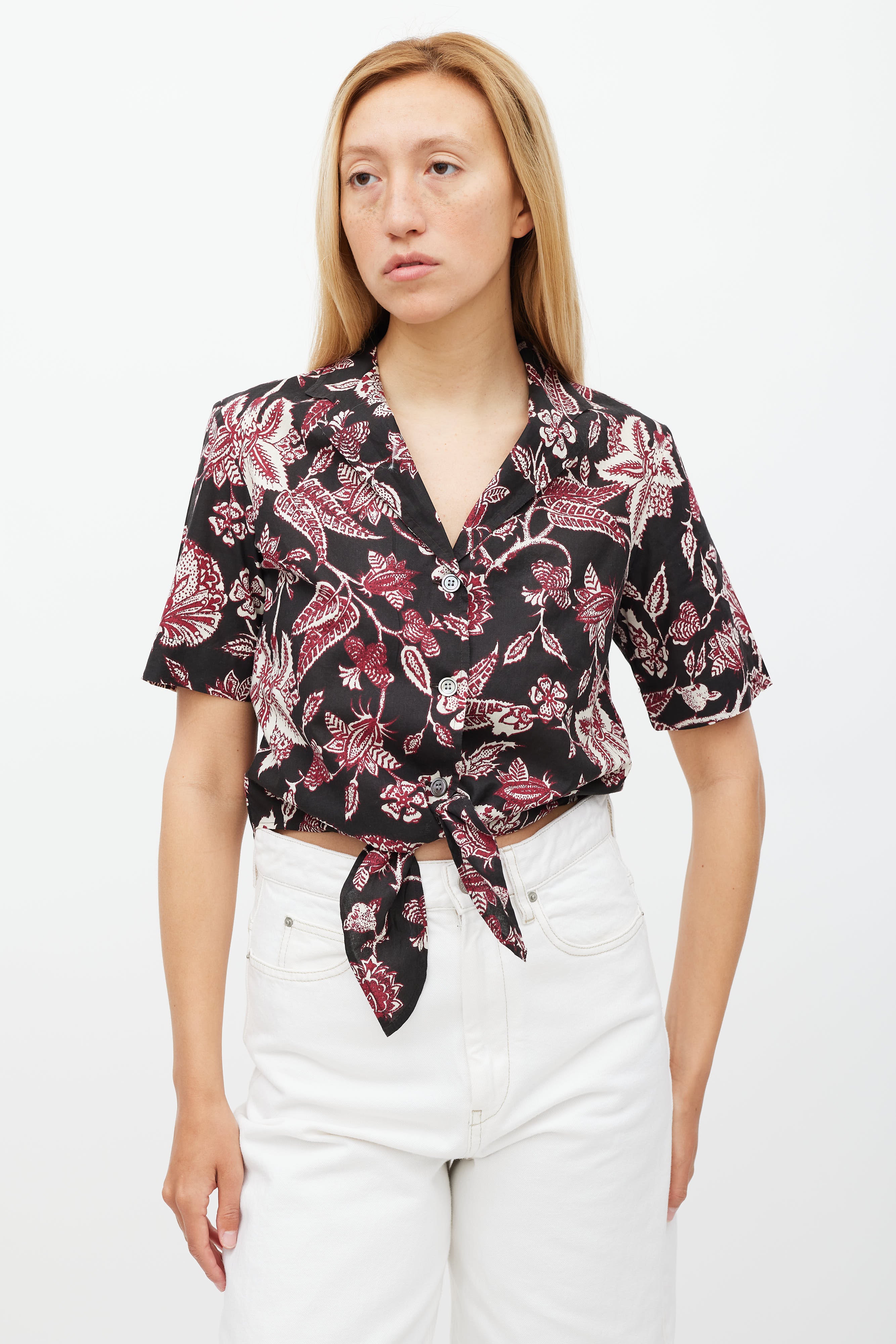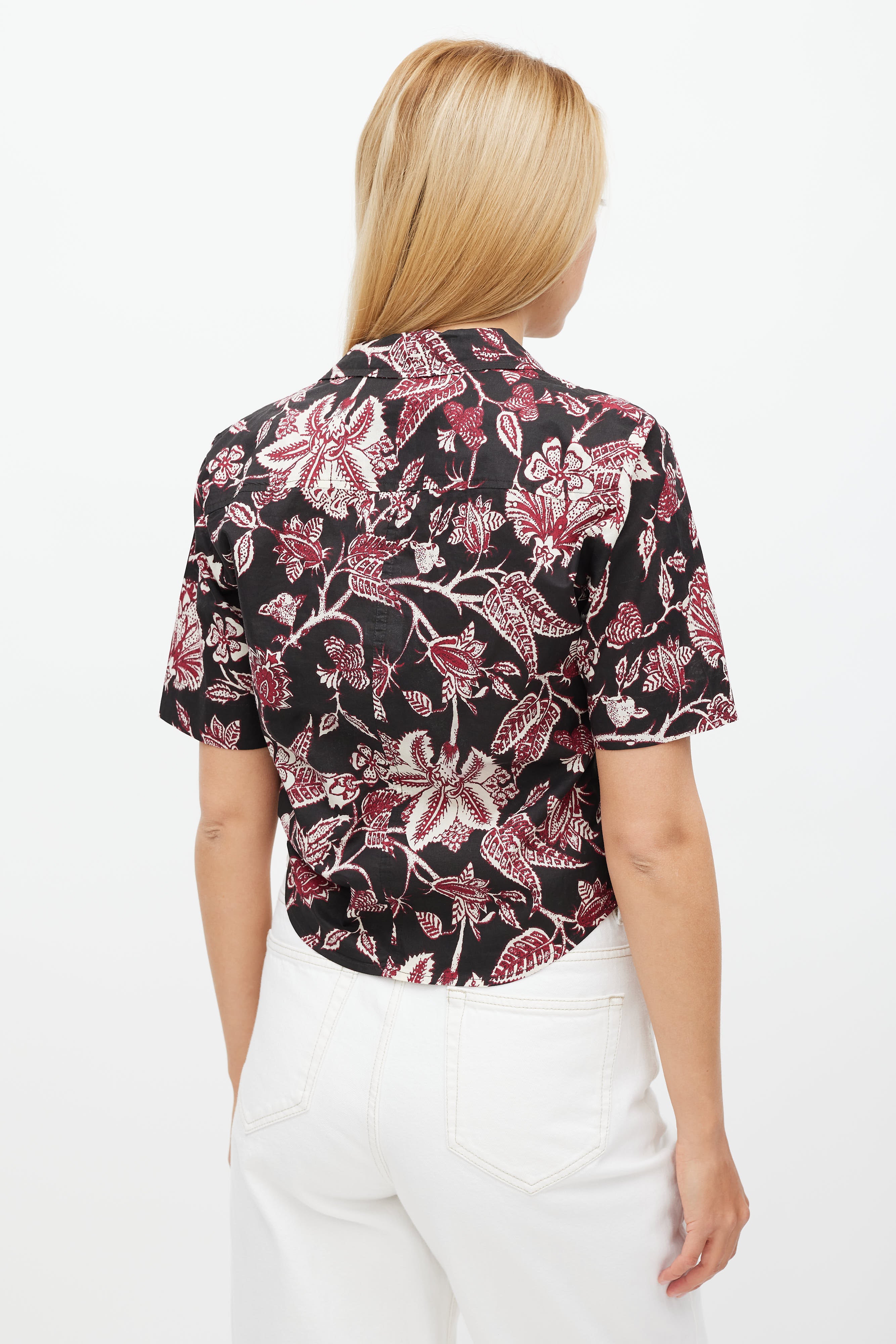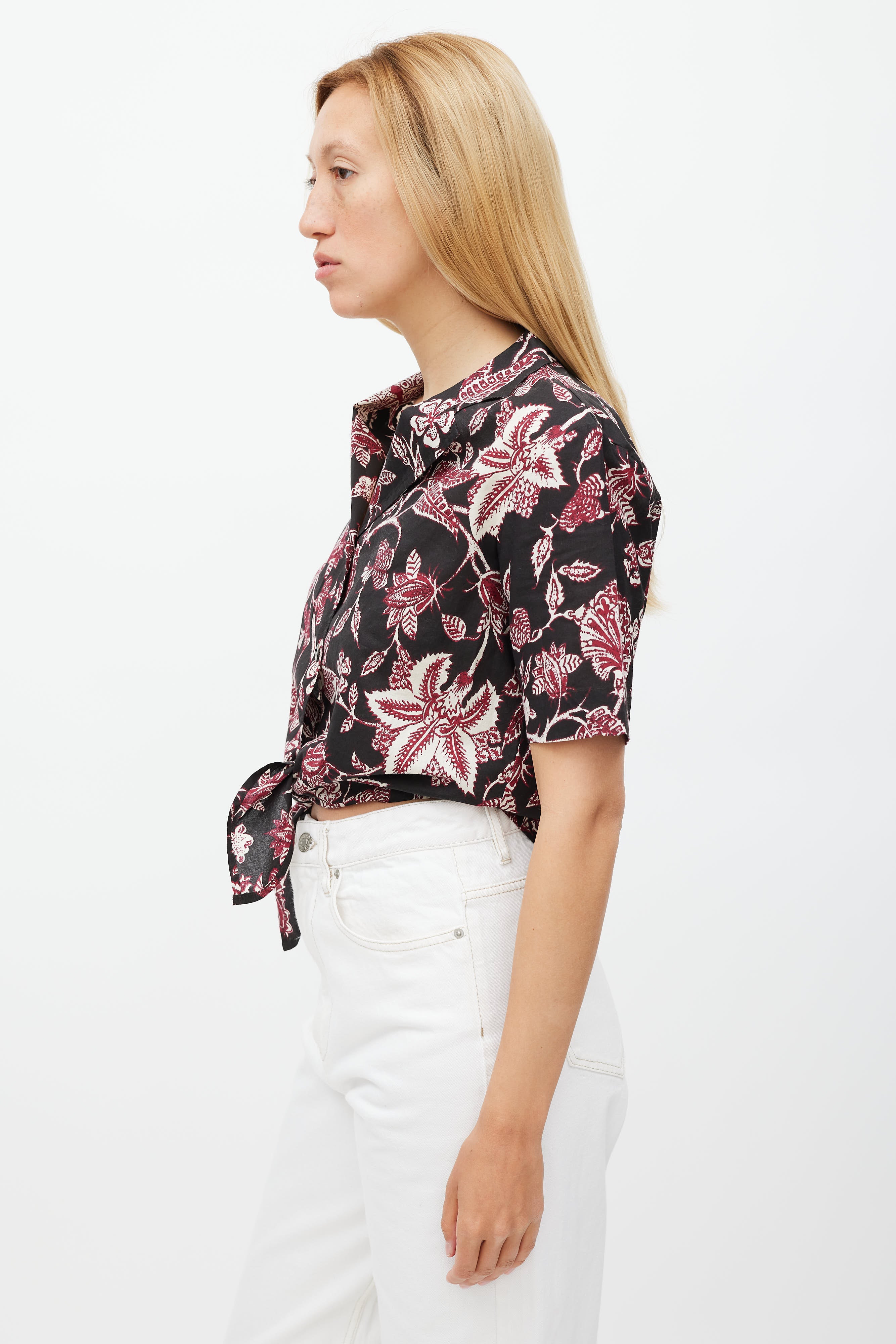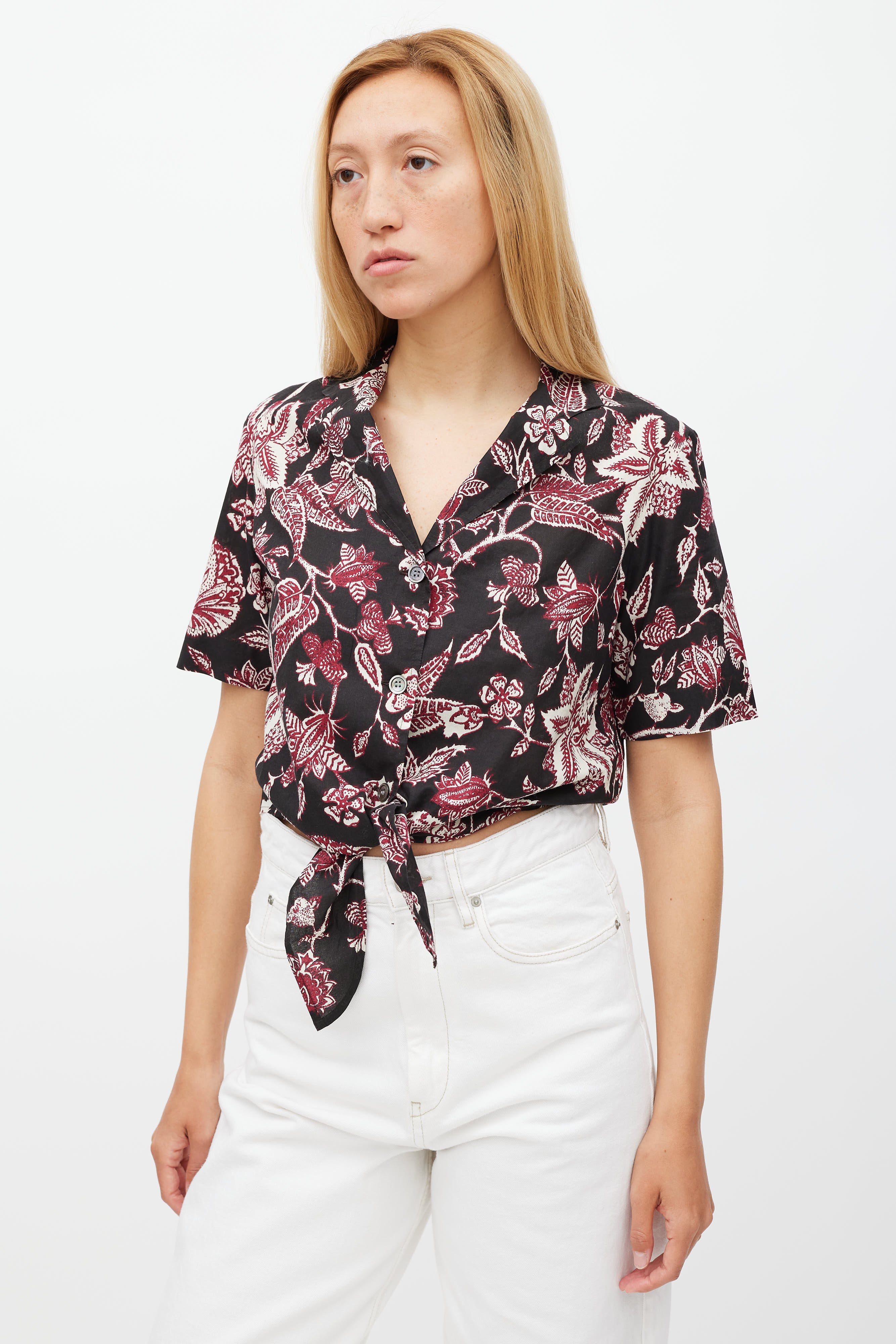 Pre-owned Isabel Marant black and red Neel shirt featuring floral print, classic collar, button up front, V-neckline, camp collar, and tie front.