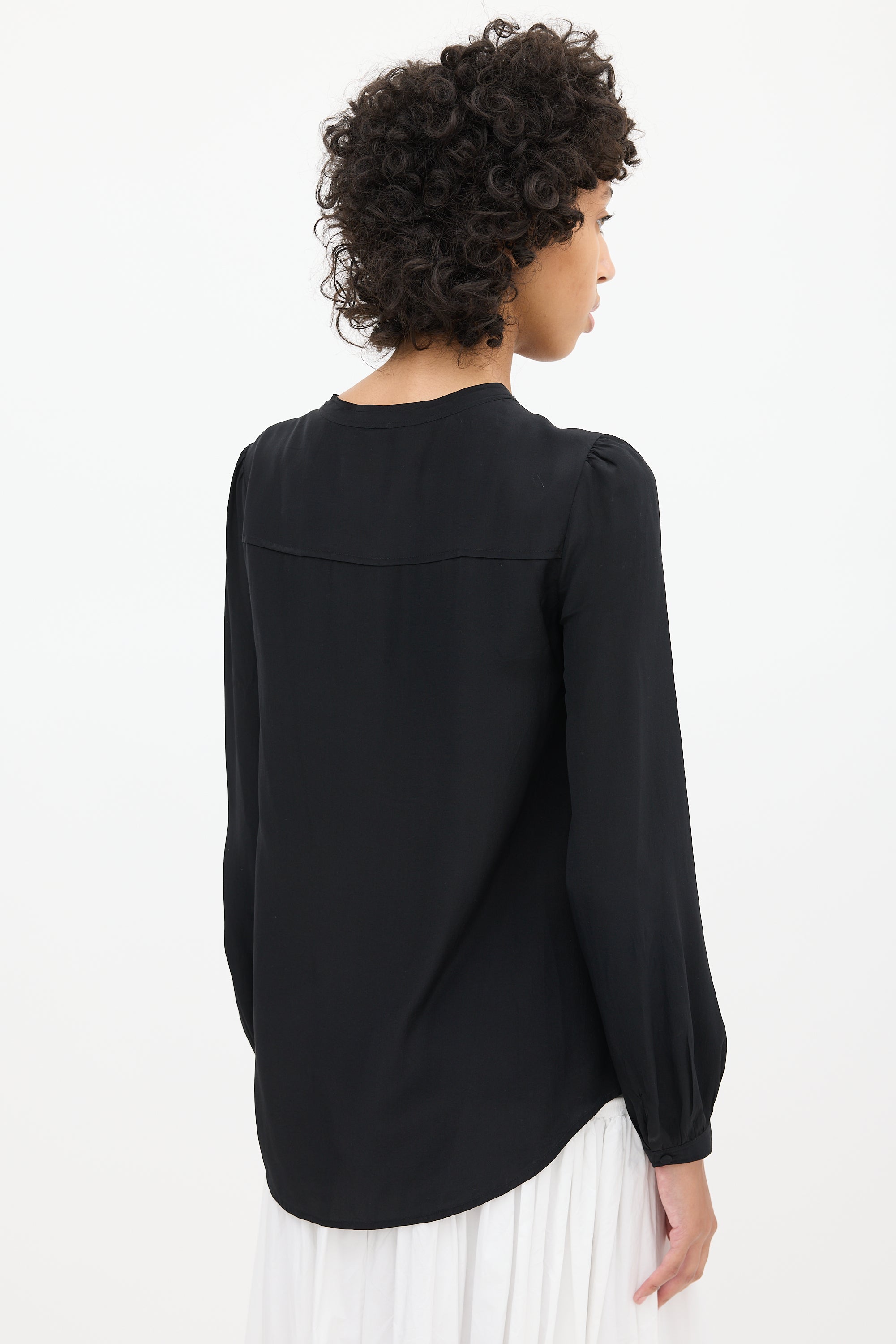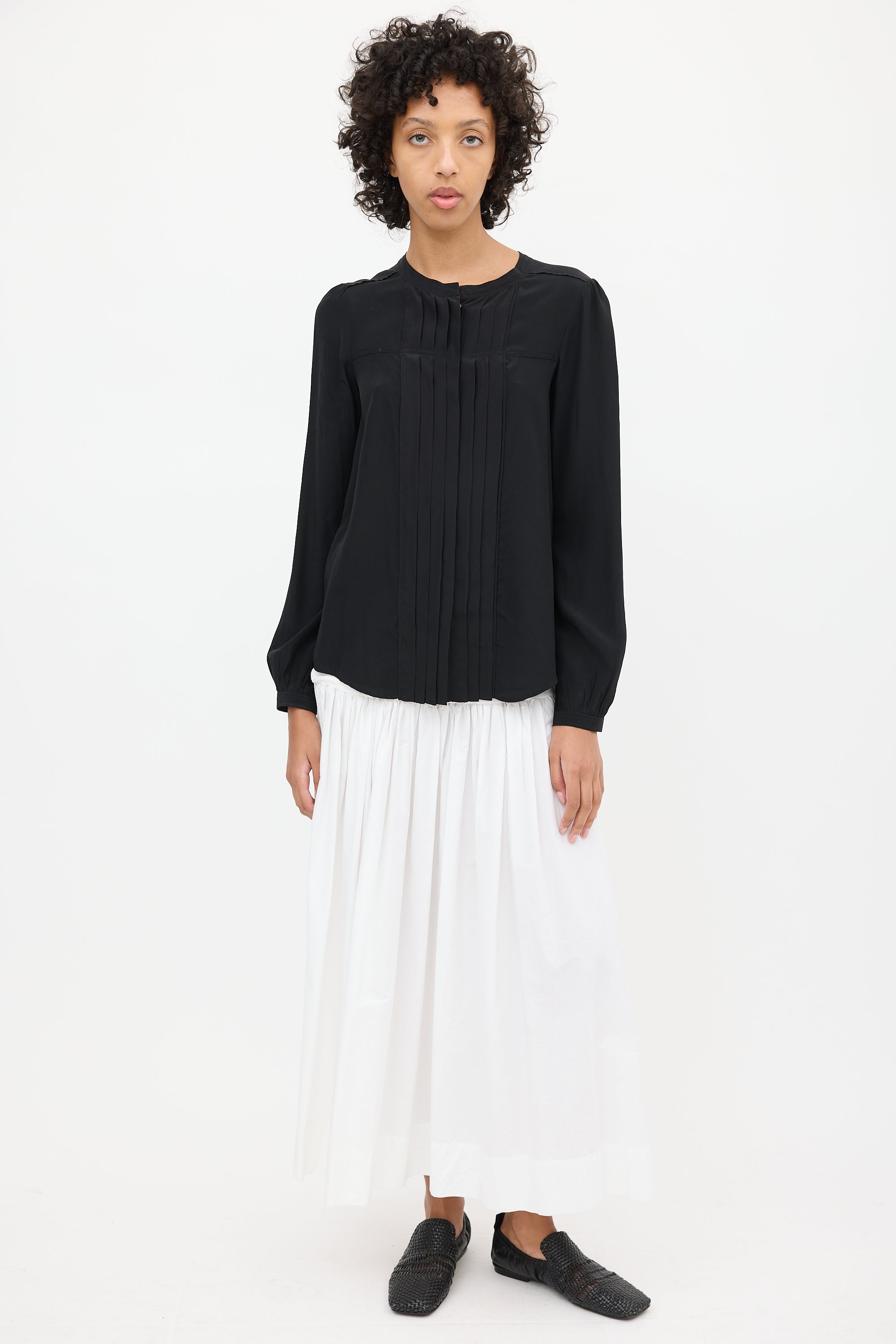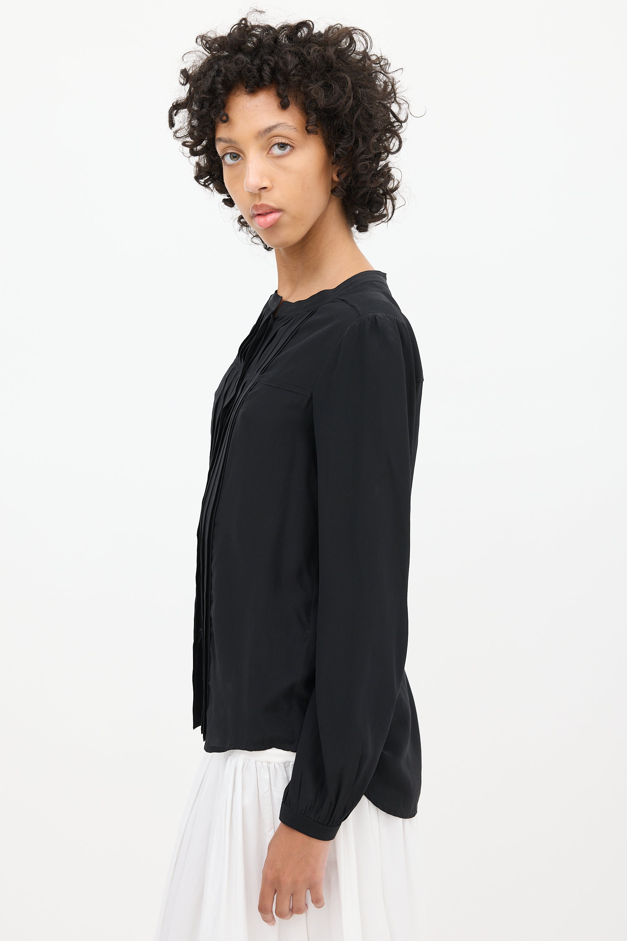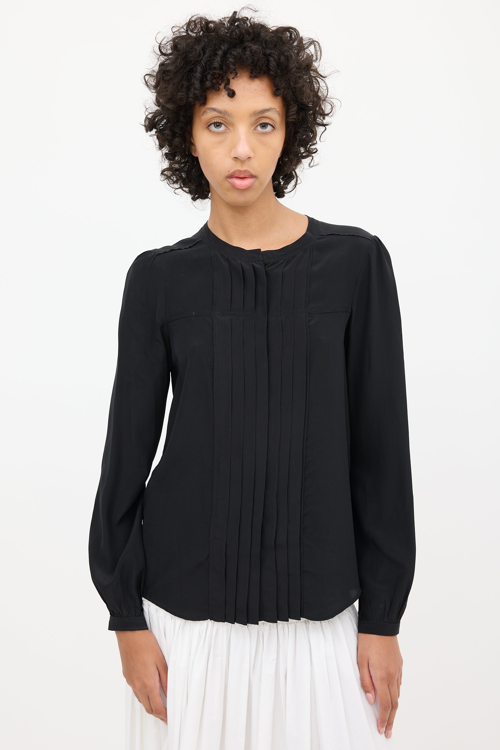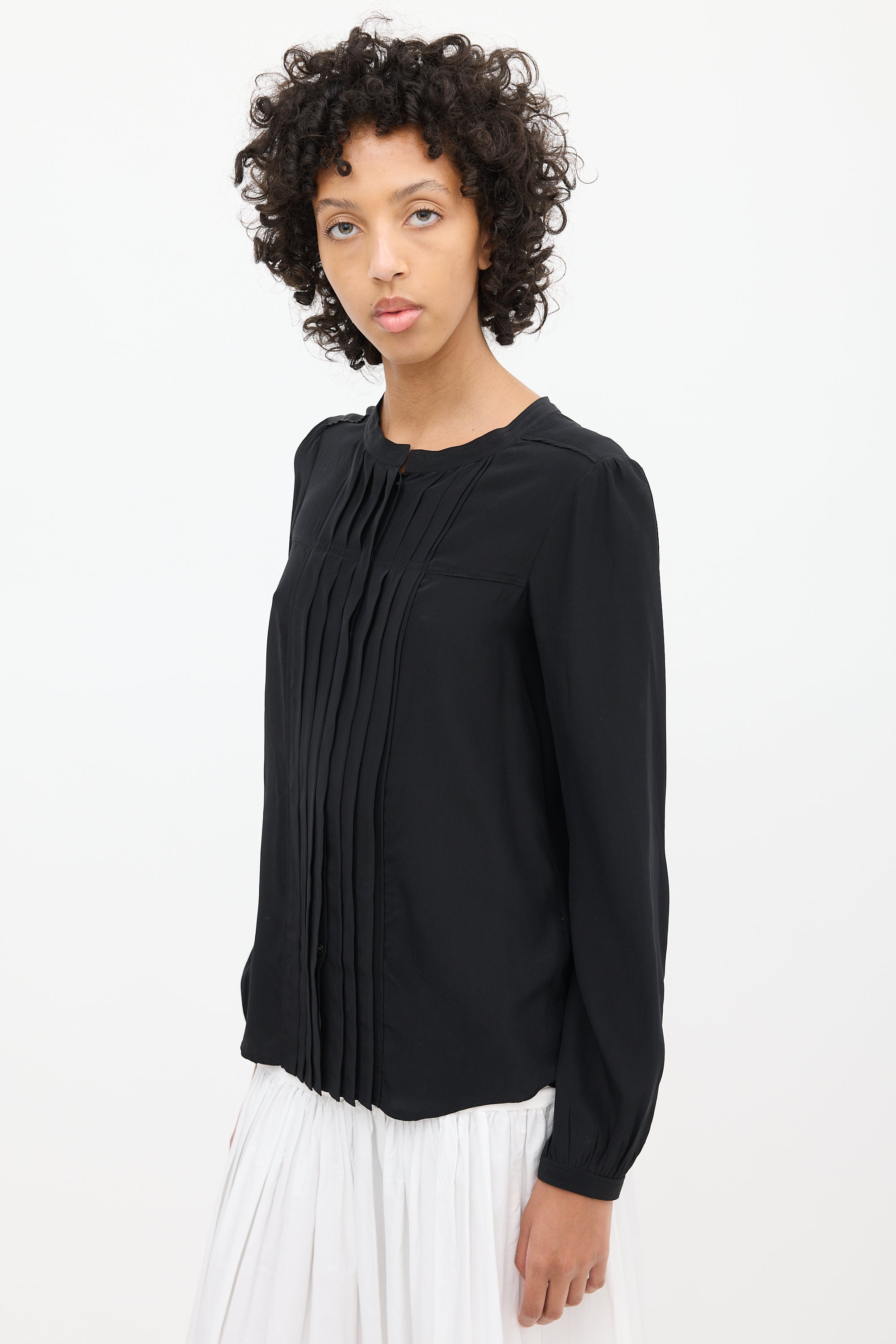 Pre-owned Isabel Marant black silk shirt featuring round neckline, pleated front, button up front, and buttoned cuffs.