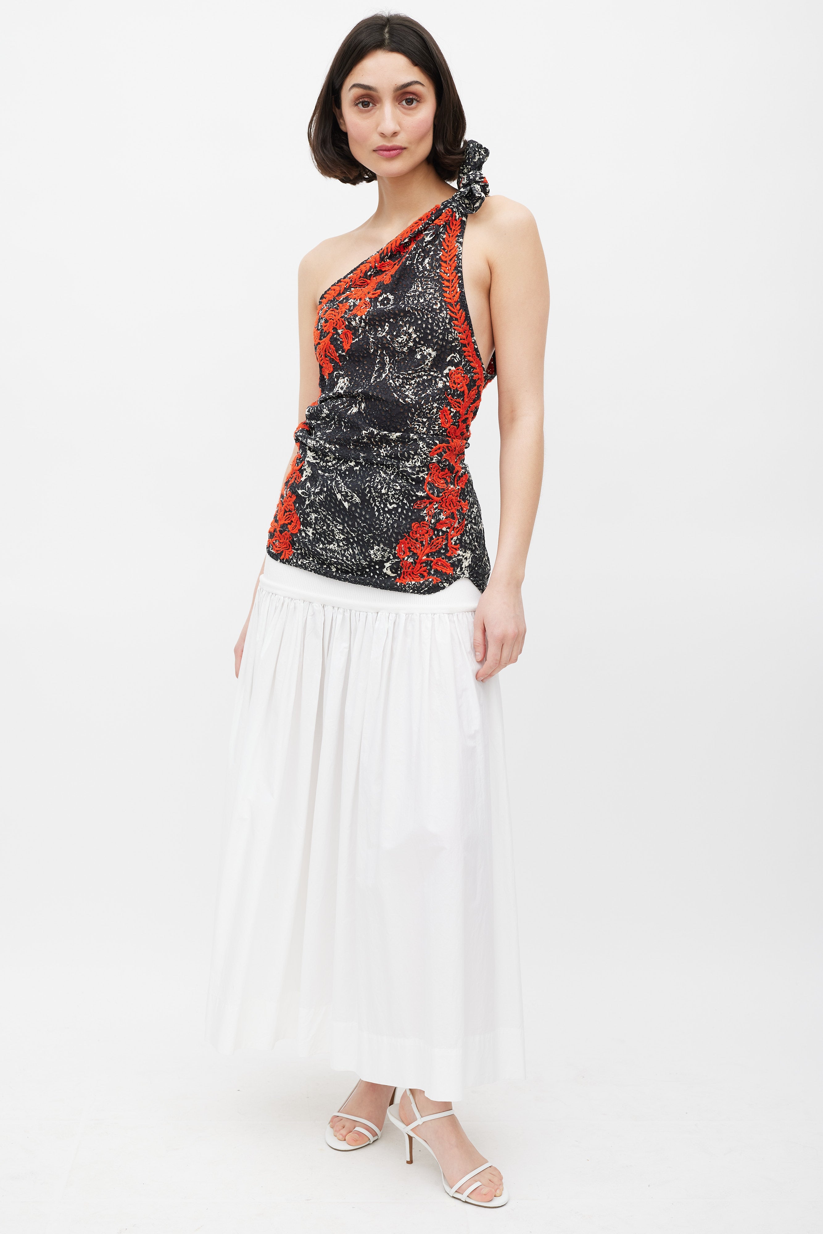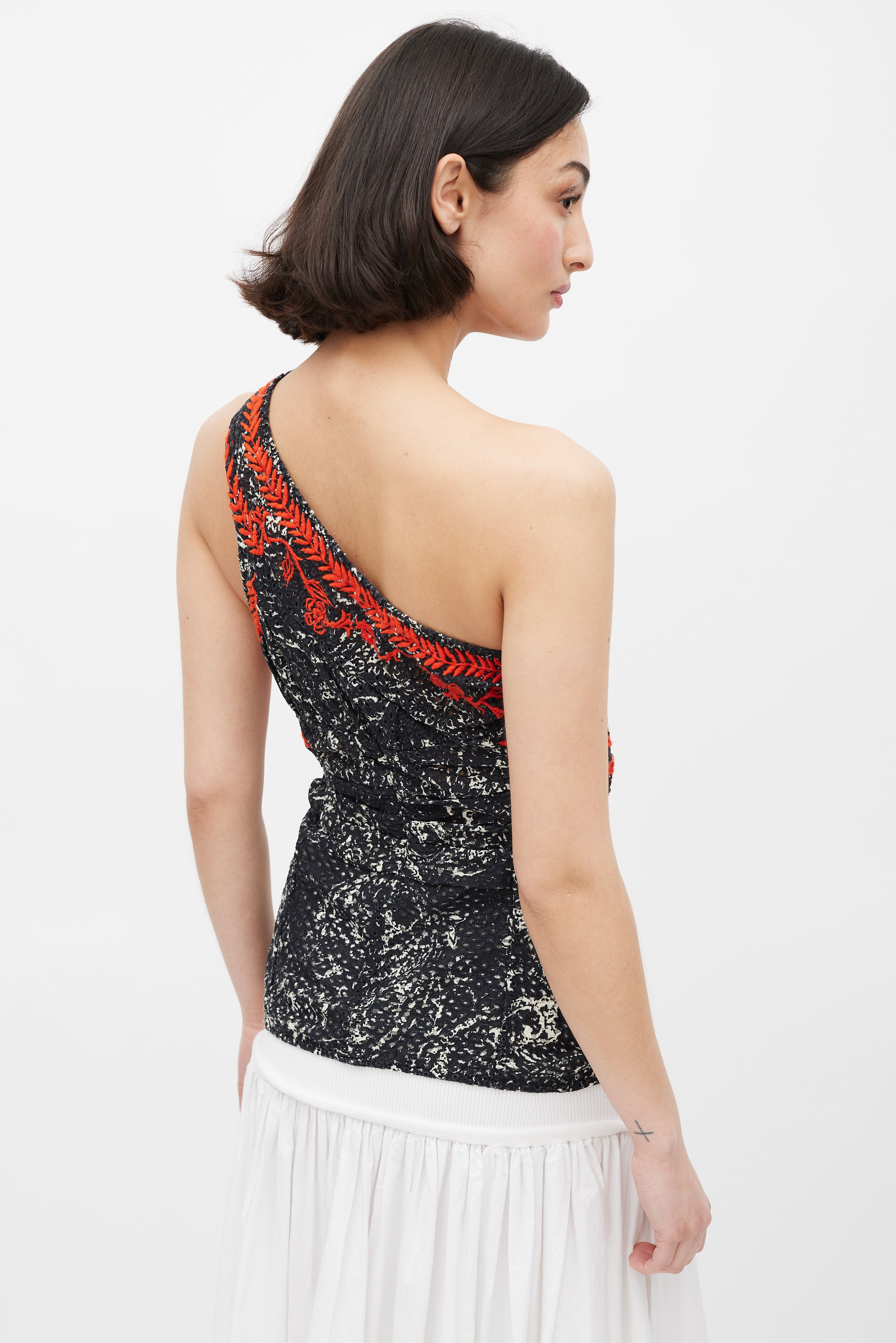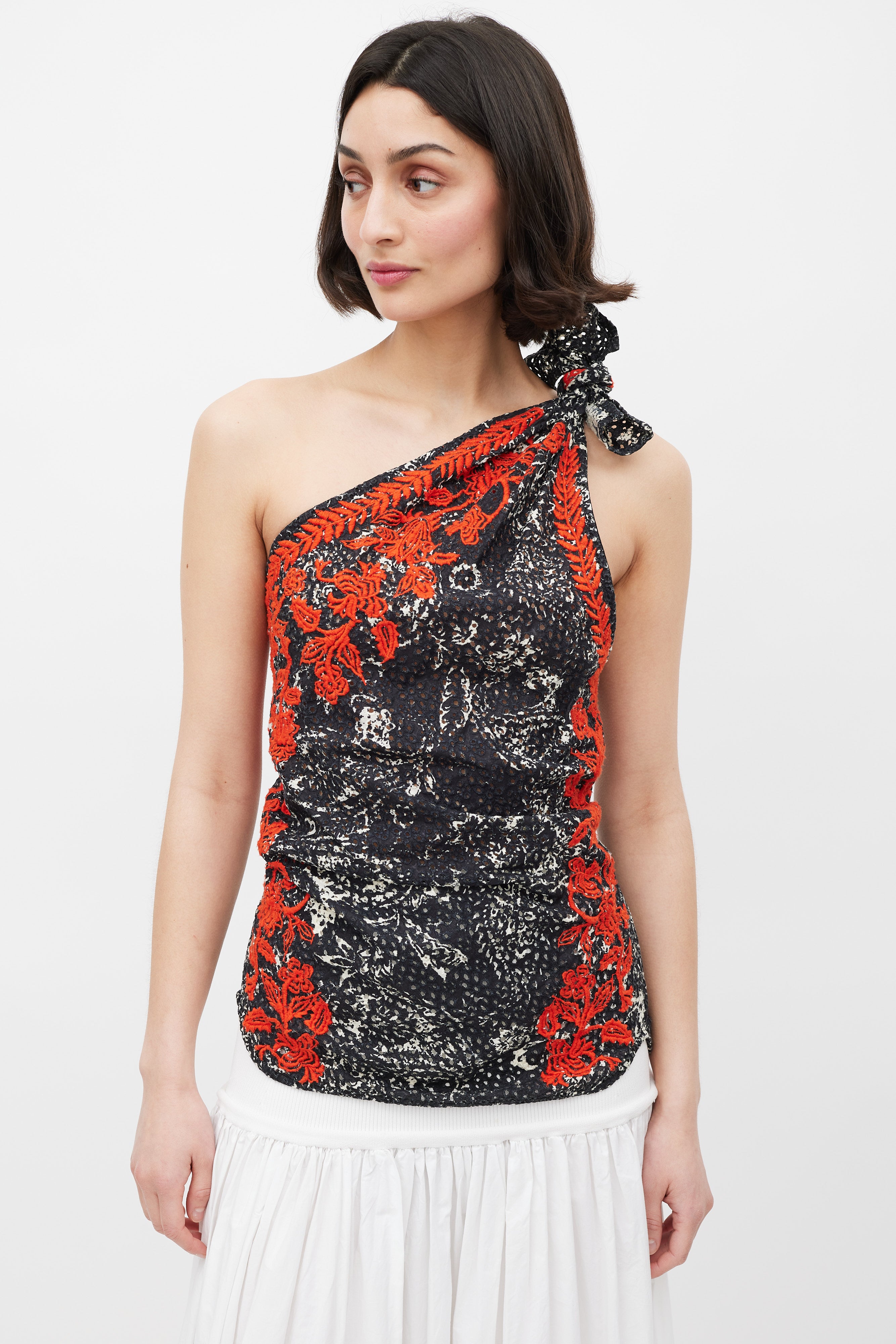 Black White & Red Floral Embroidered One Shoulder Top FR 42 Size Guide