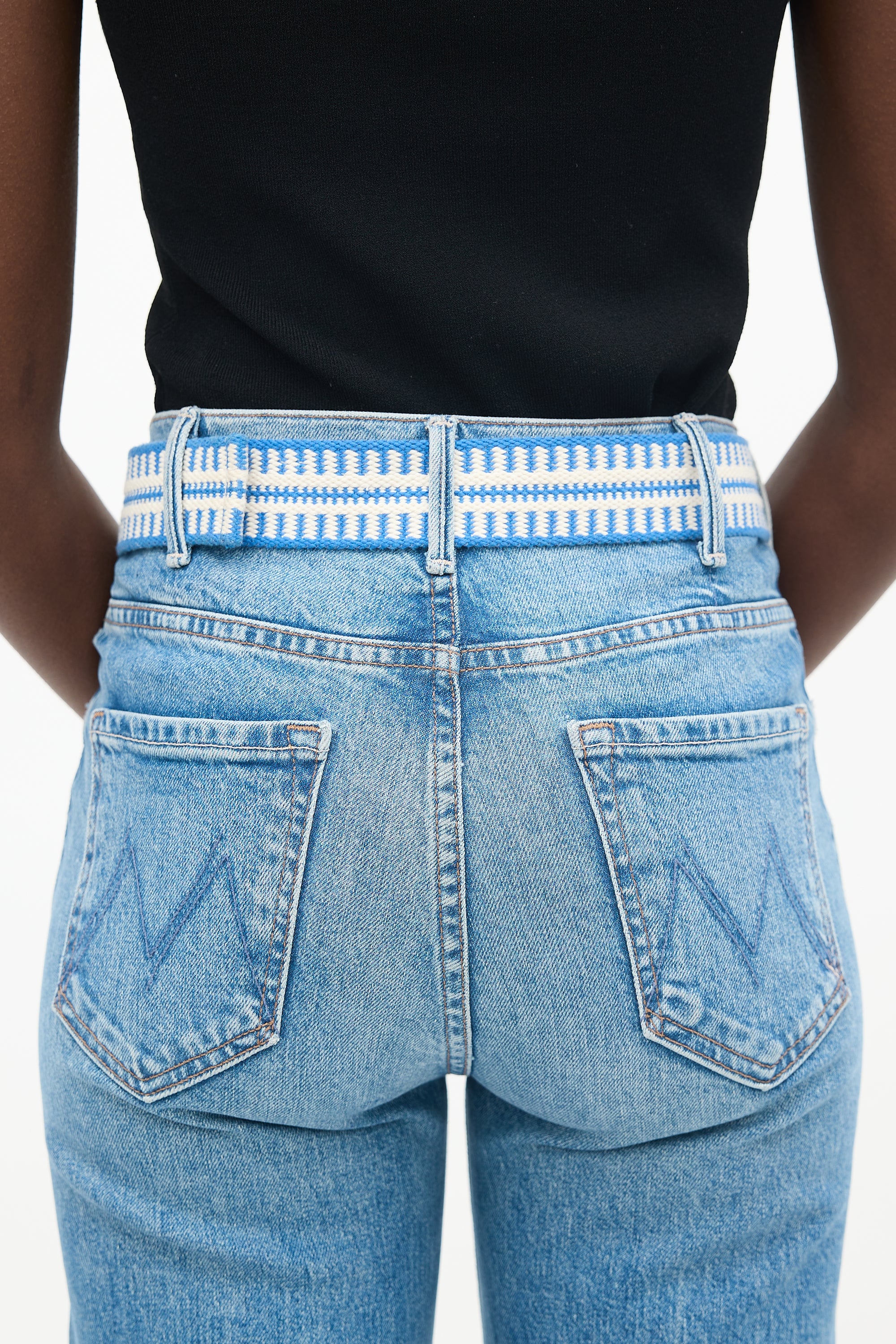 Pre-owned Isabel Marant blue and white Nyess woven belt featuring striped pattern, silver chrome D-ring buckle, and logo at interior.