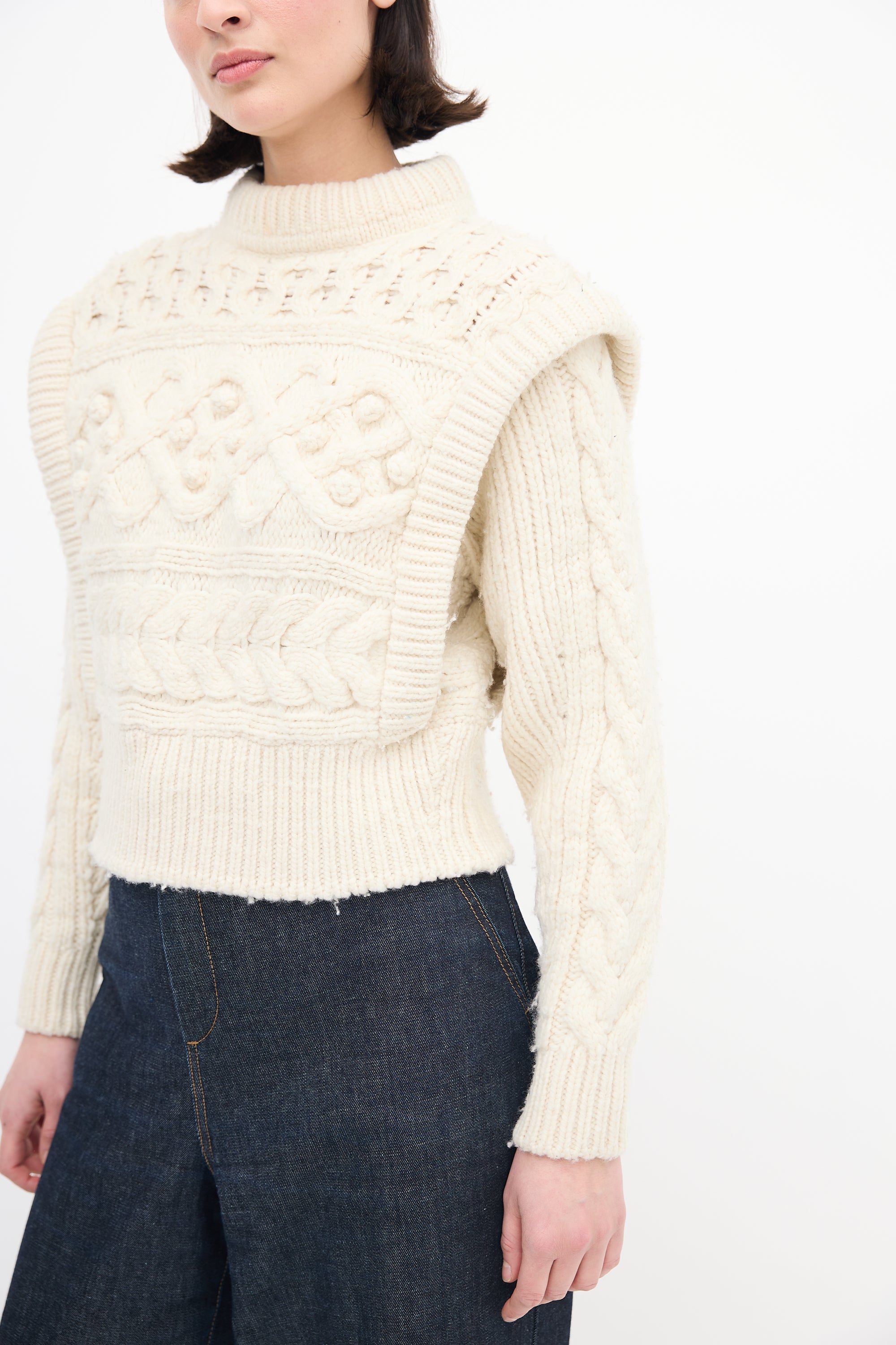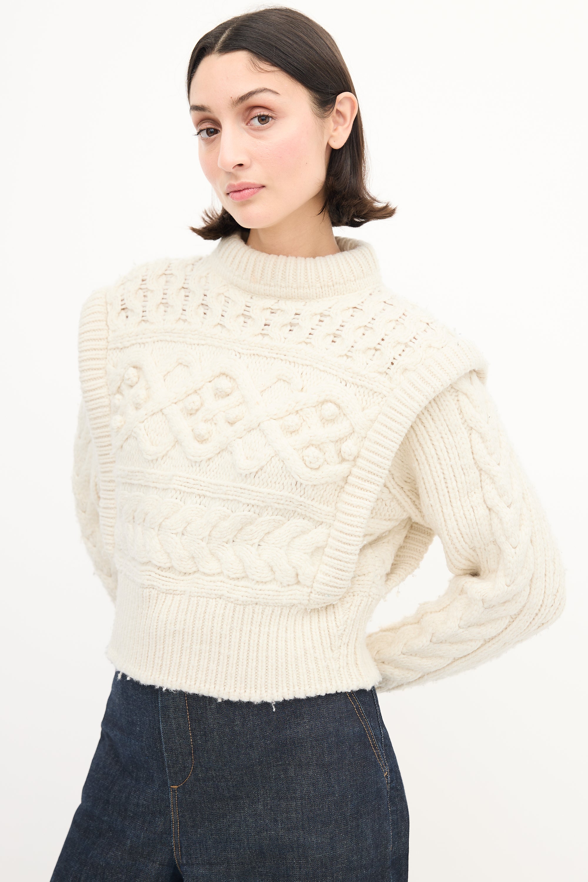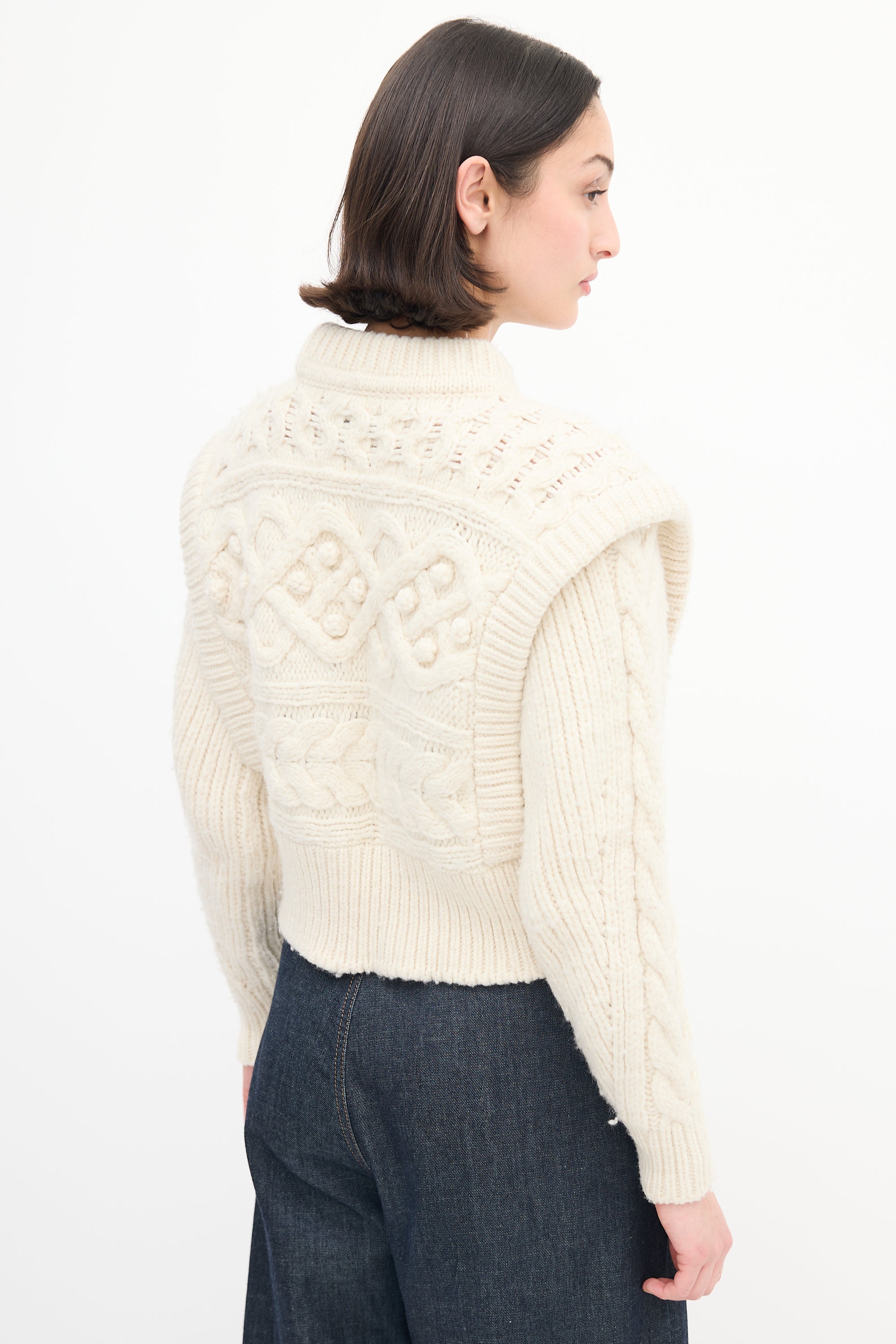 Pre-owned Isabel Marant beige wool sweater featuring cable knit with pom poms, mock neckline, wide shoulders with vertical panelling at front and back sides, and ribbed neckline, cuffs, and hem.