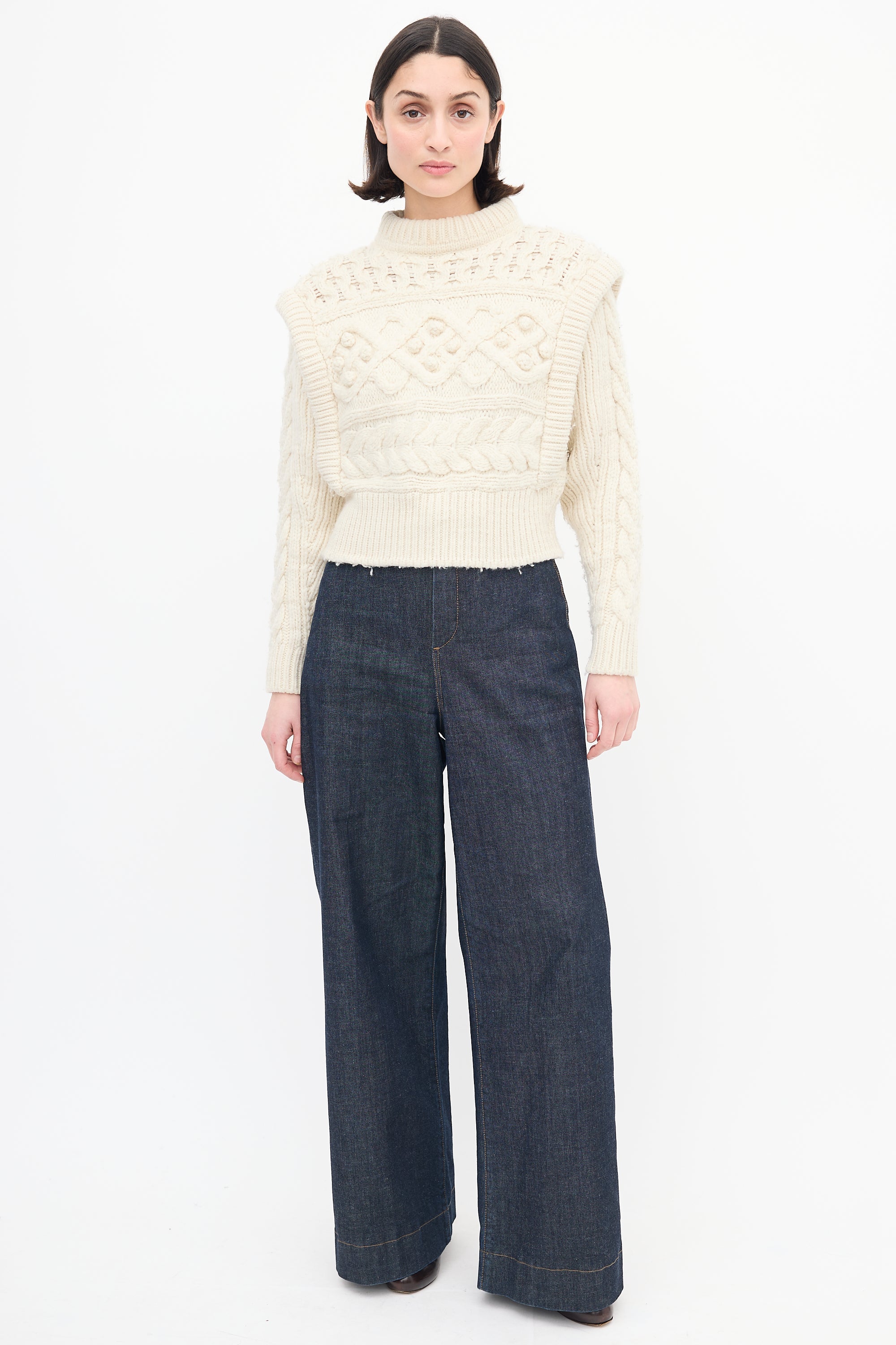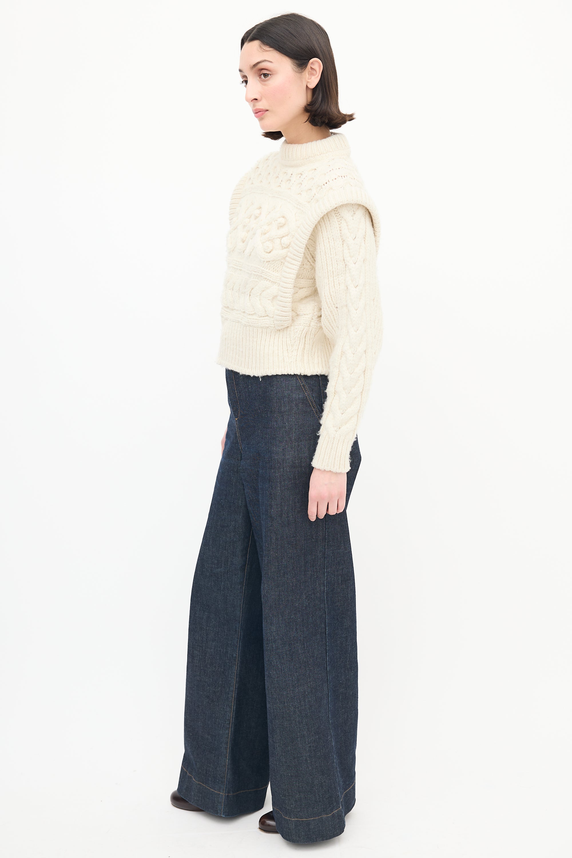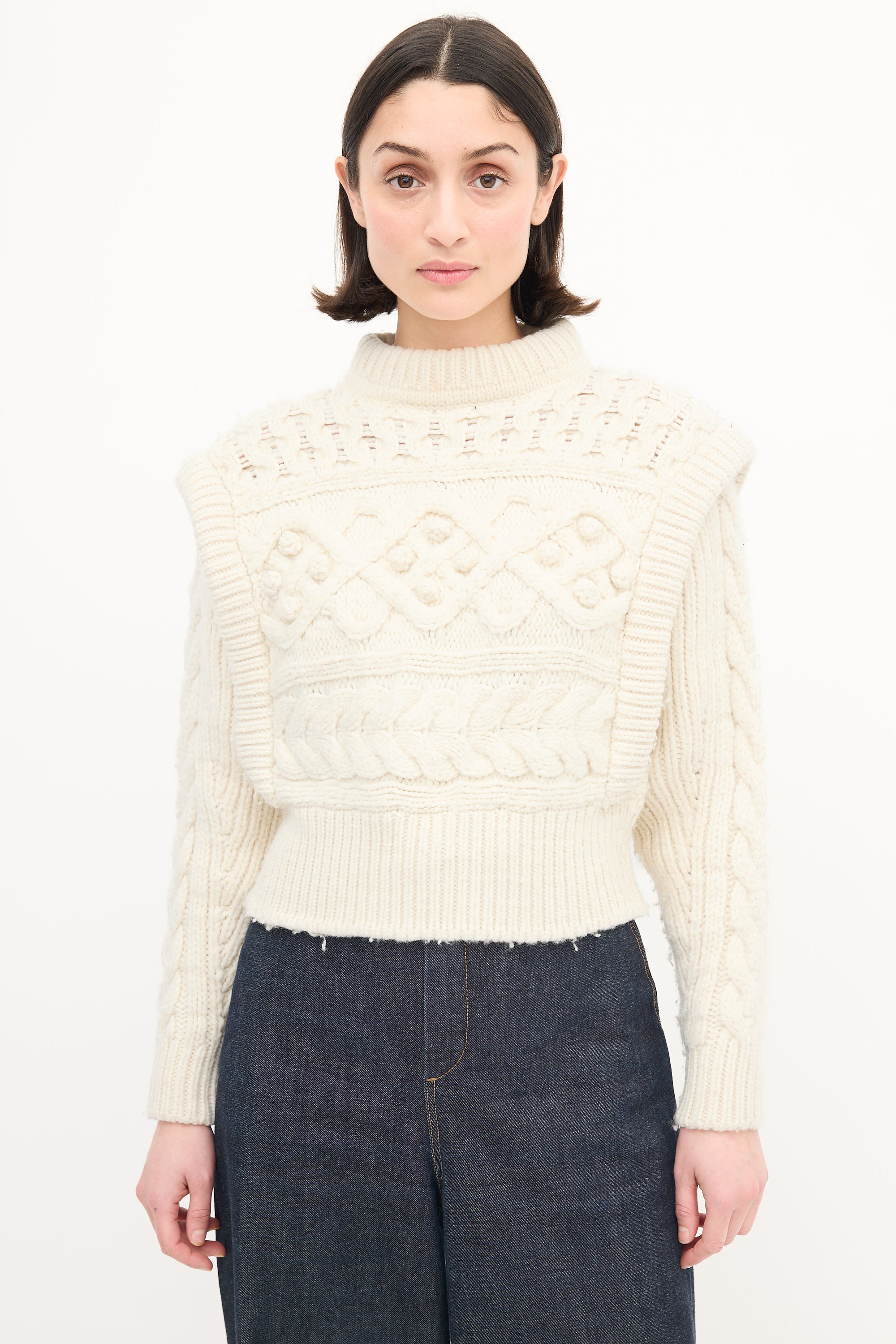 Pre-owned Isabel Marant beige wool sweater featuring cable knit with pom poms, mock neckline, wide shoulders with vertical panelling at front and back sides, and ribbed neckline, cuffs, and hem.