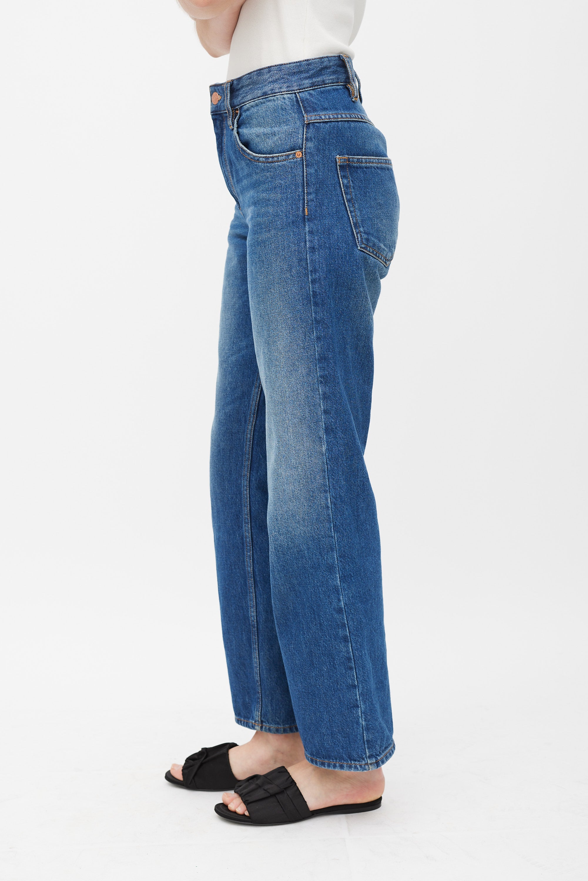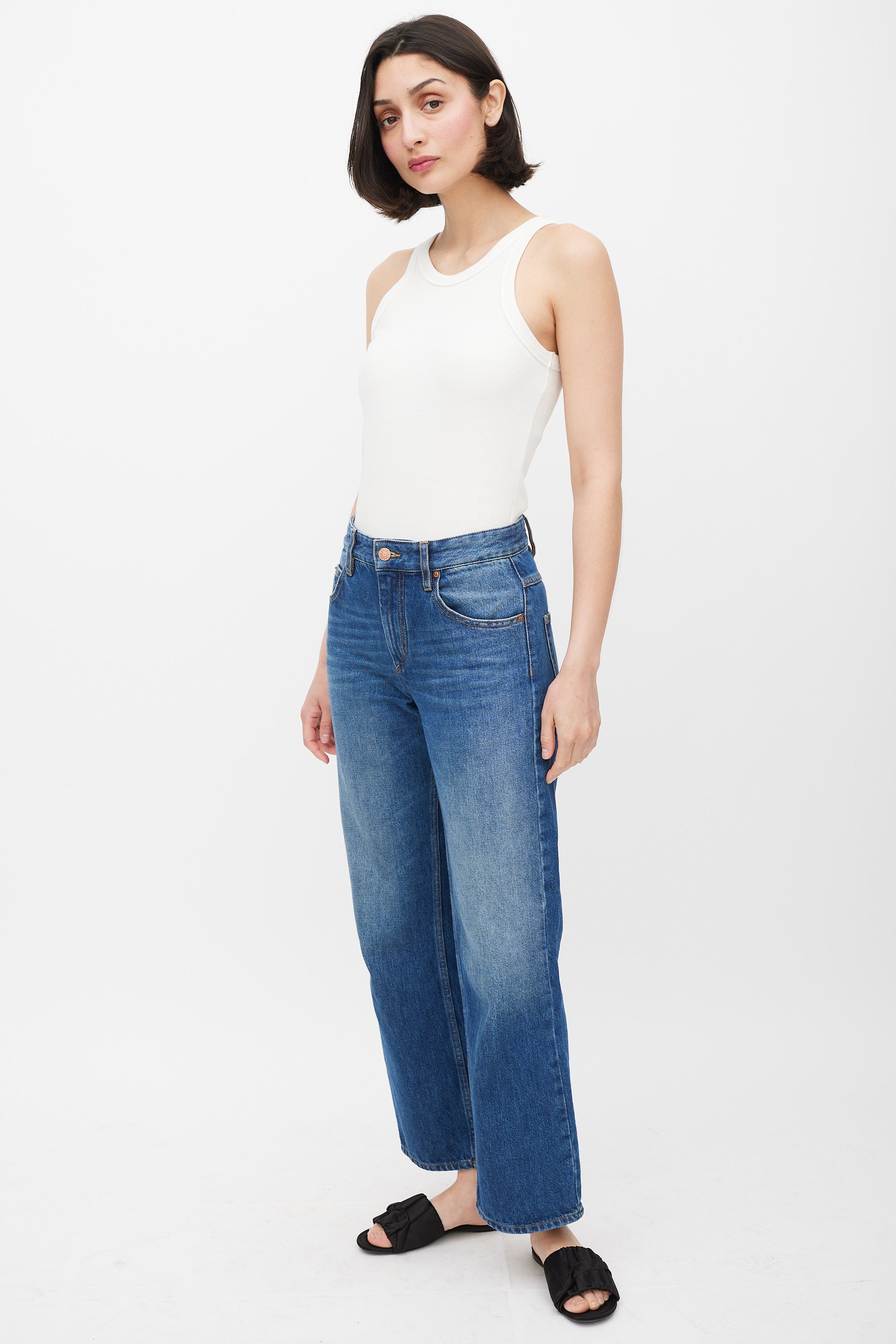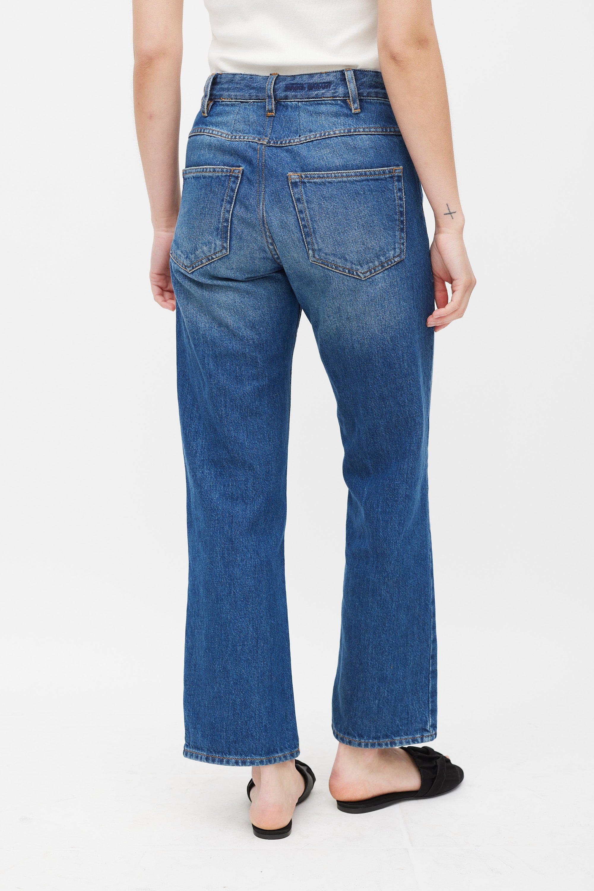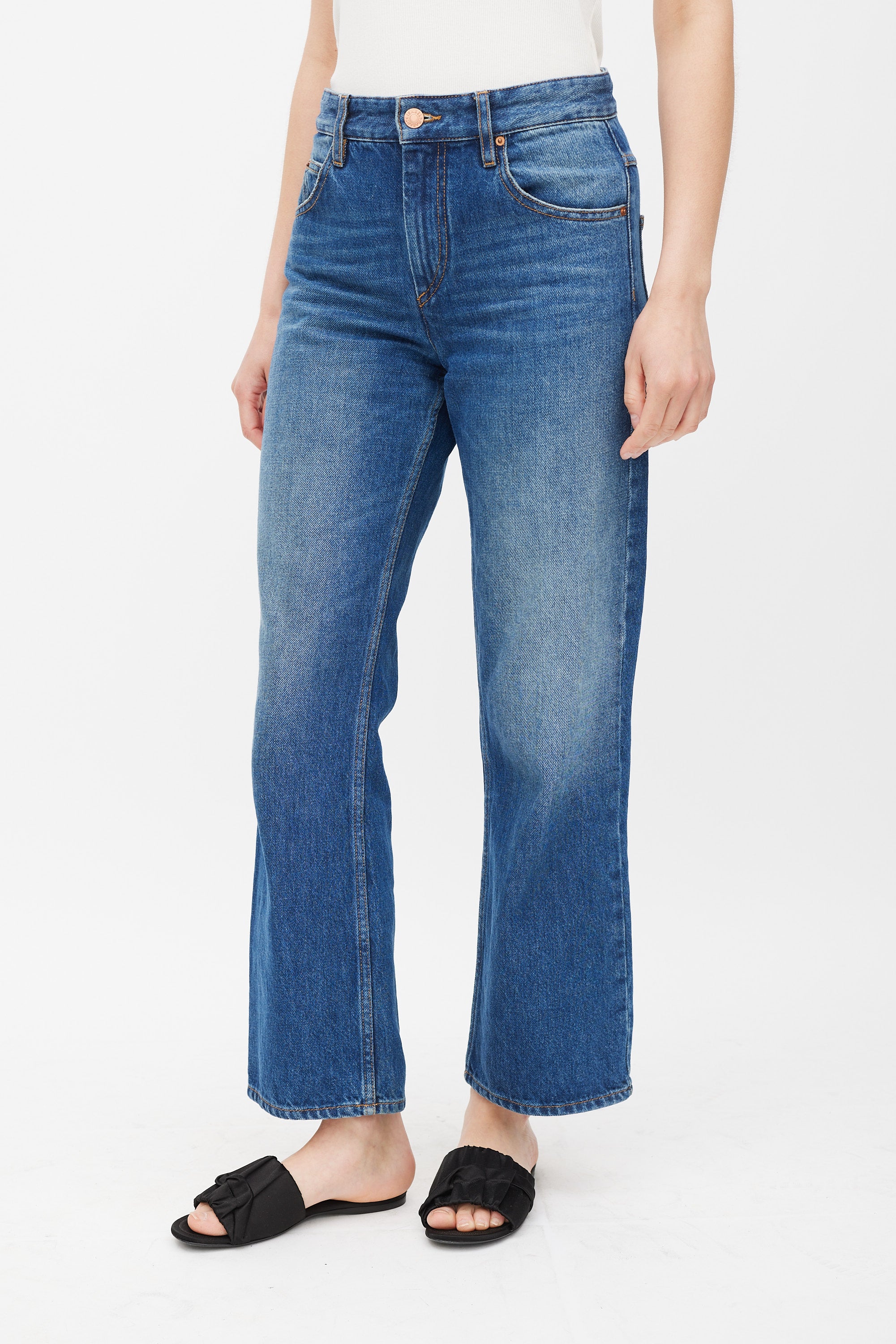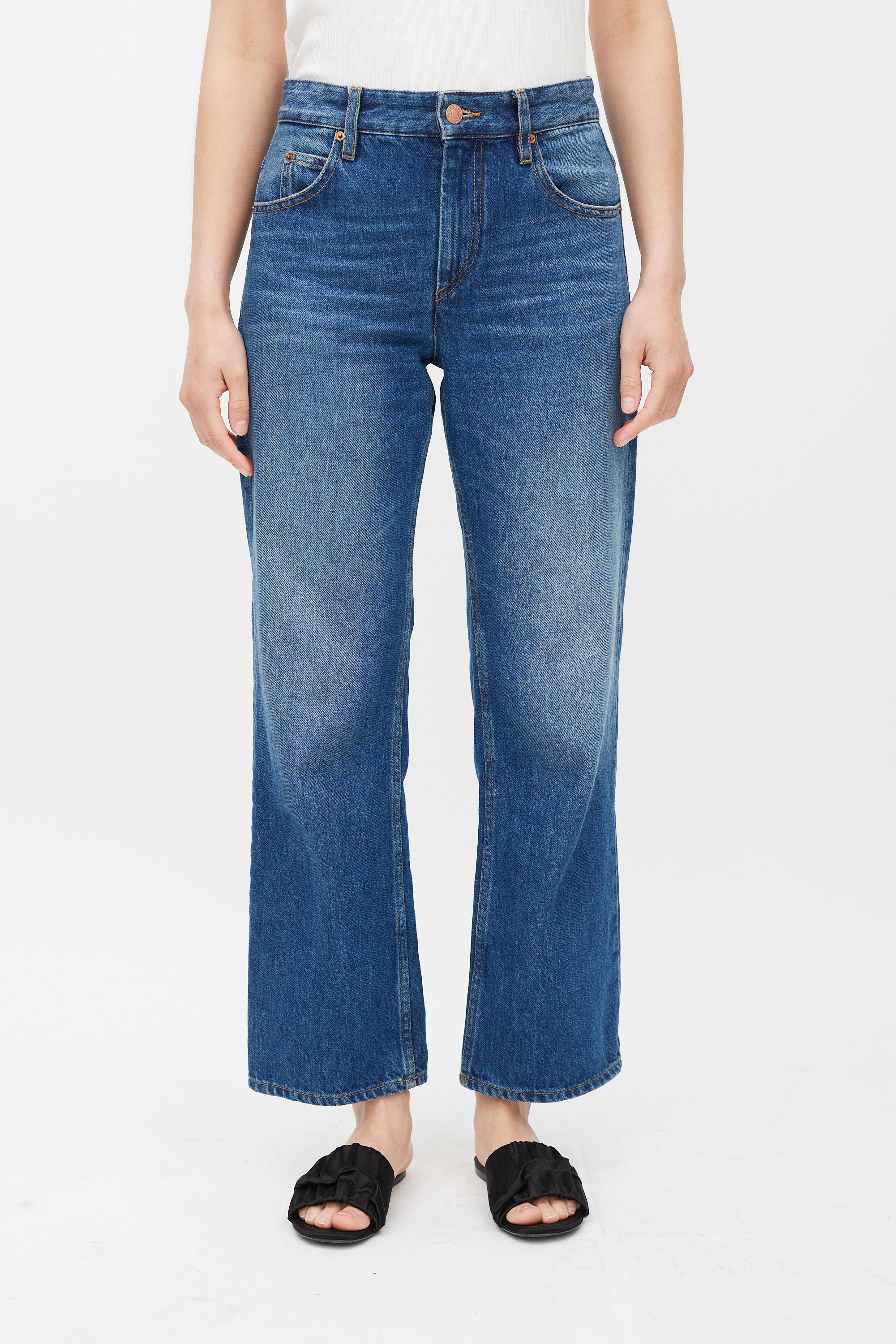 Pre-owned Isabel Marant medium wash jeans featuring five pocket styling, straight leg, embroidered logo at waist, and zip fly with button closure.