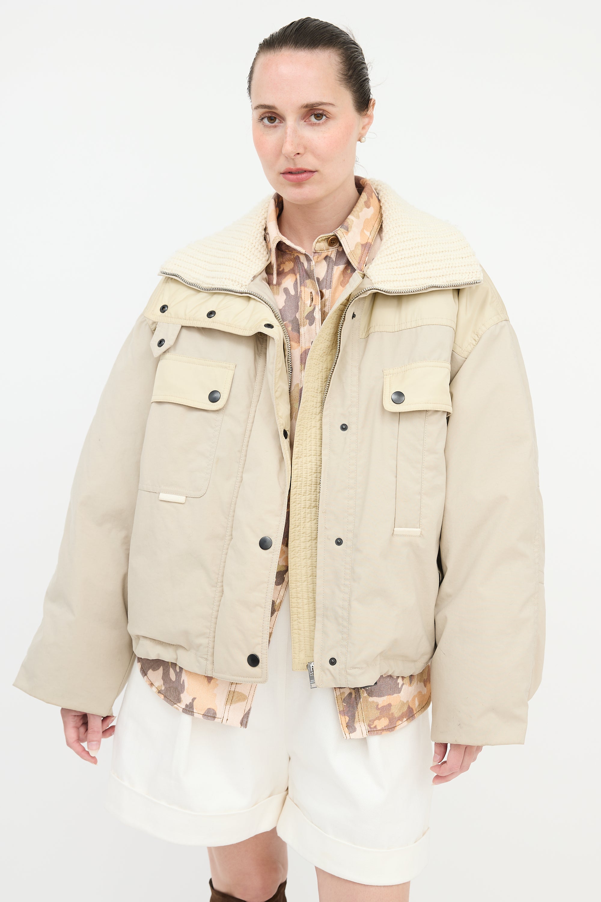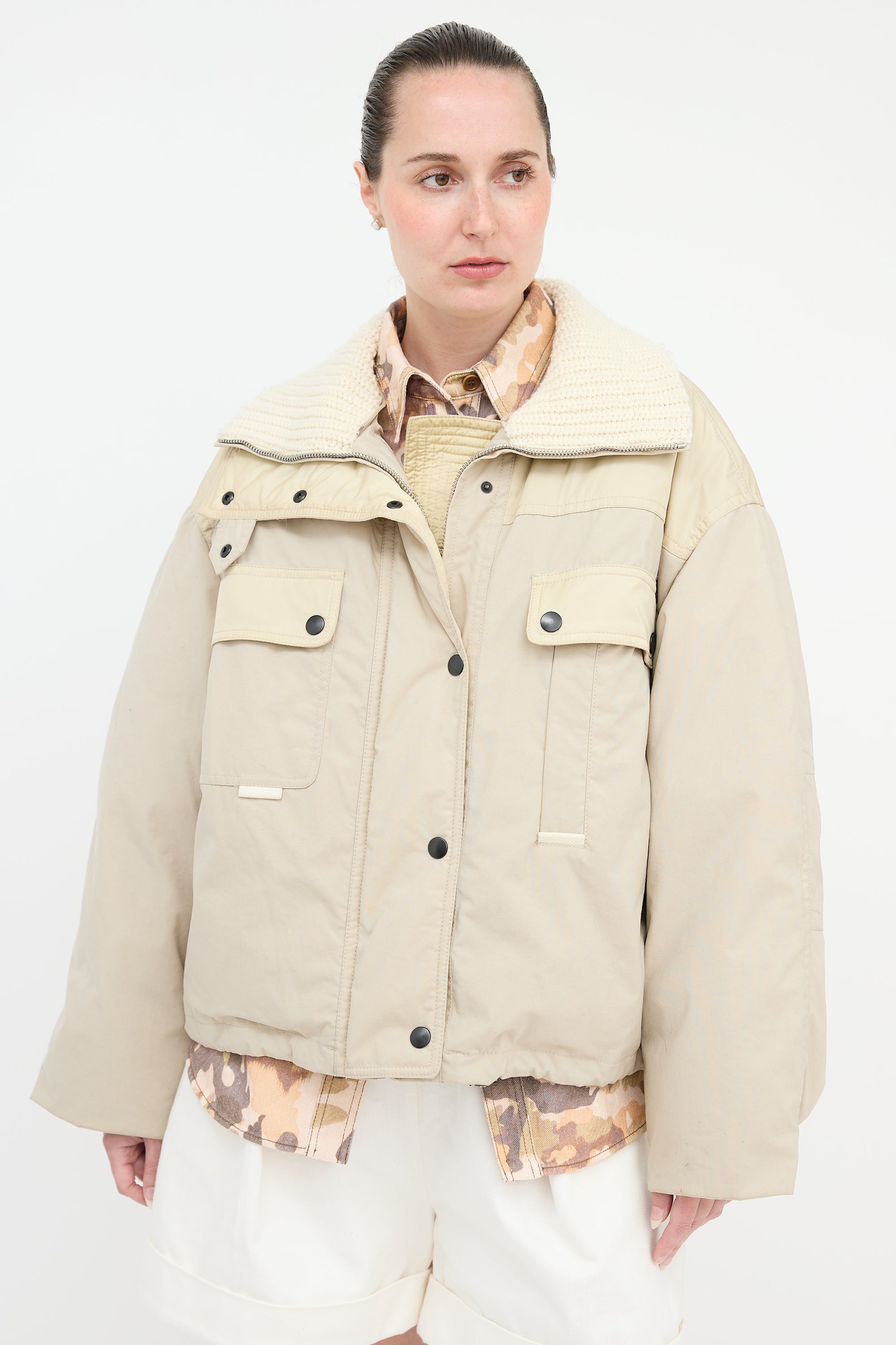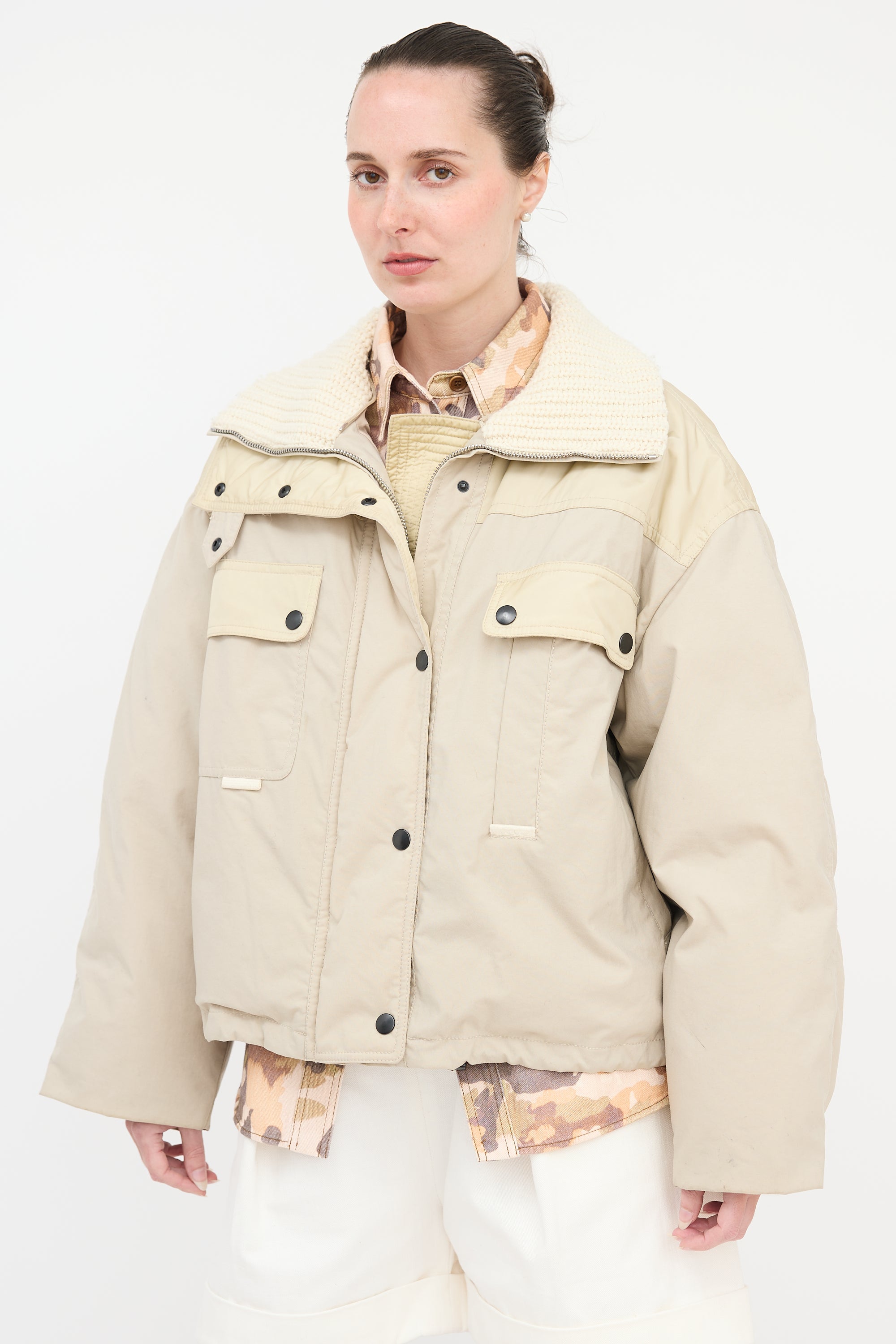 Pre-owned Isabel Marant beige oversized Dellazia puffer jacket featuring a stand collar with knit lining, concealed zip front with snap button closure, two snap button flap pockets at chest, two welt pockets at waist, and buttoned cuffs.