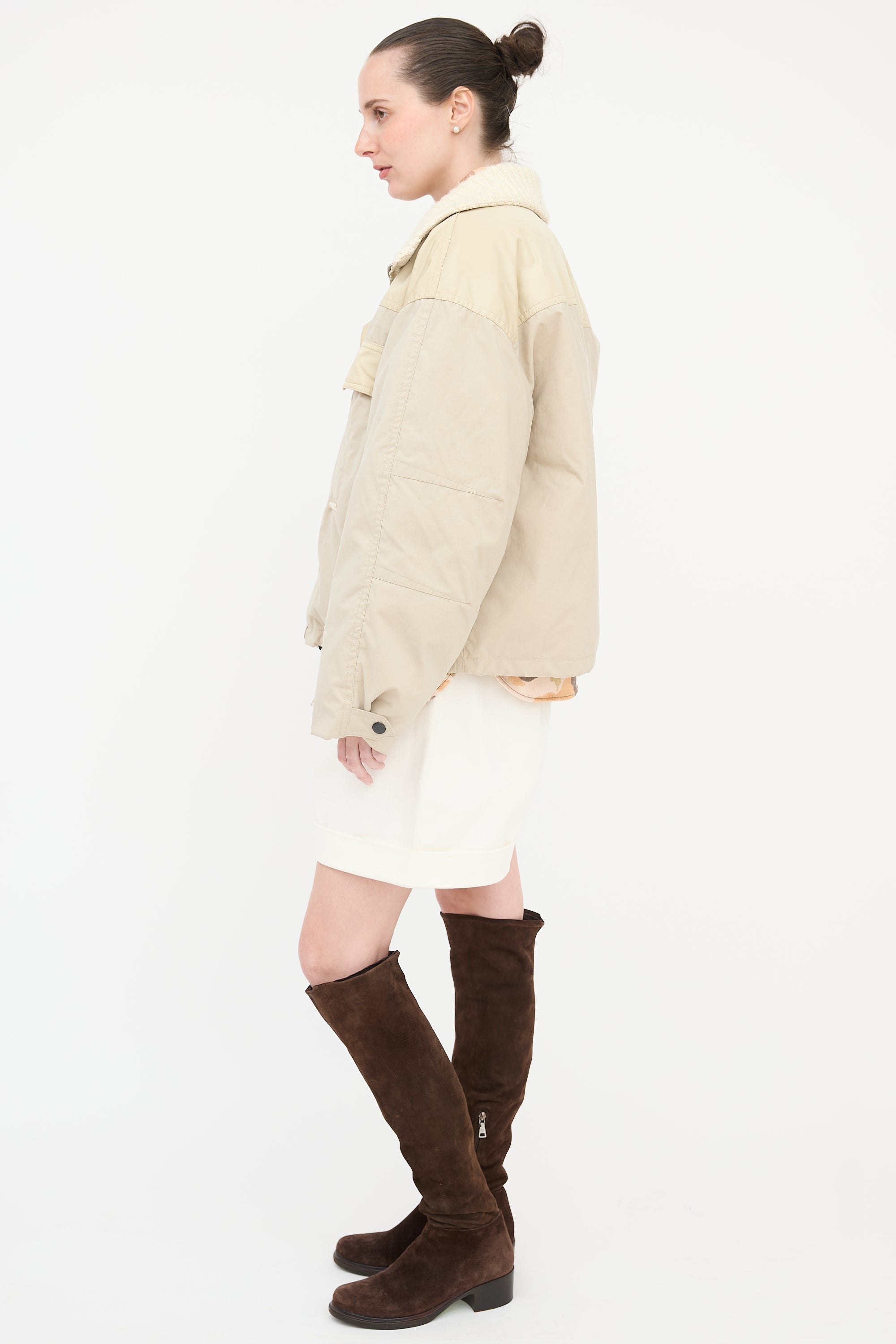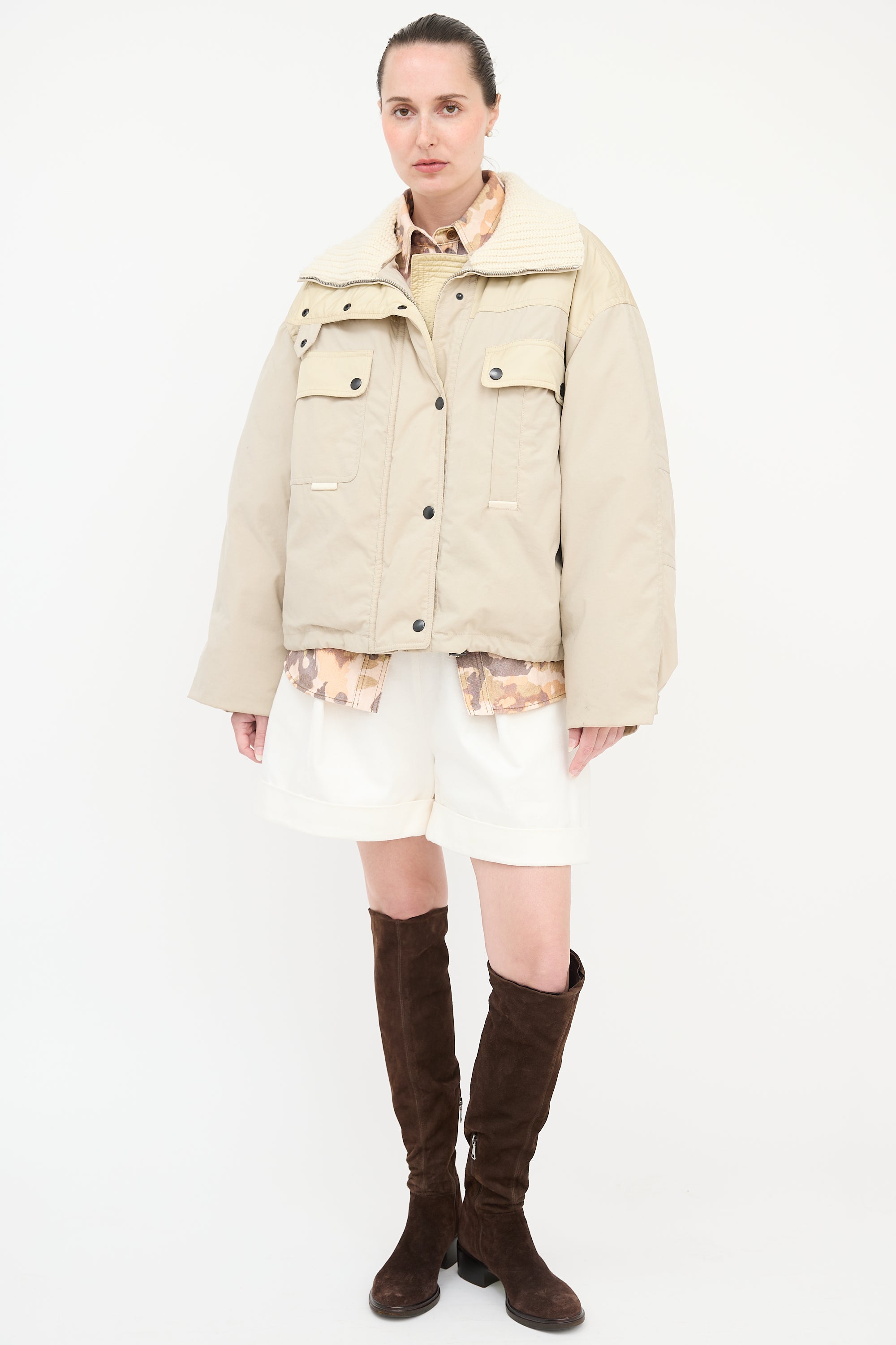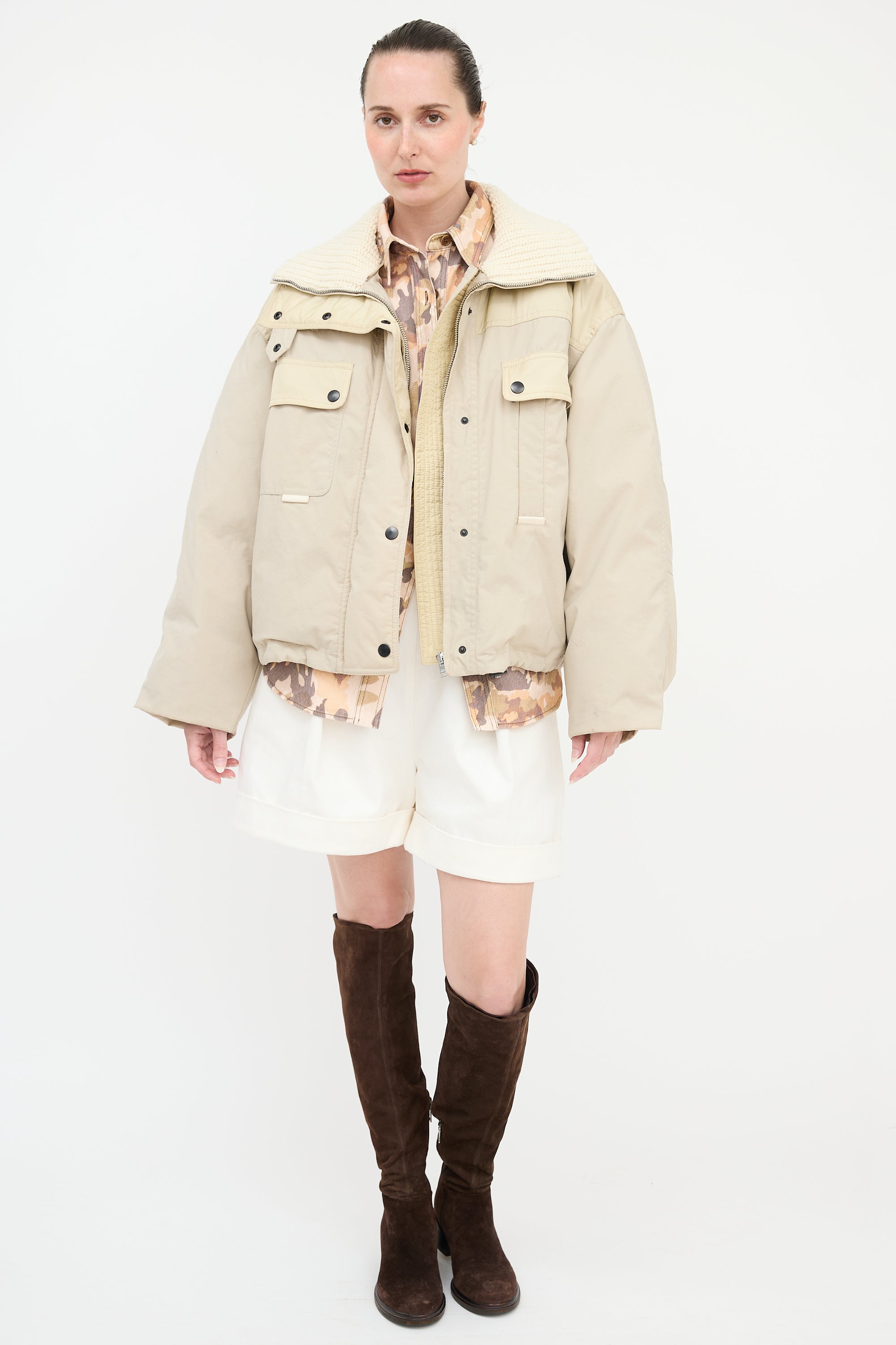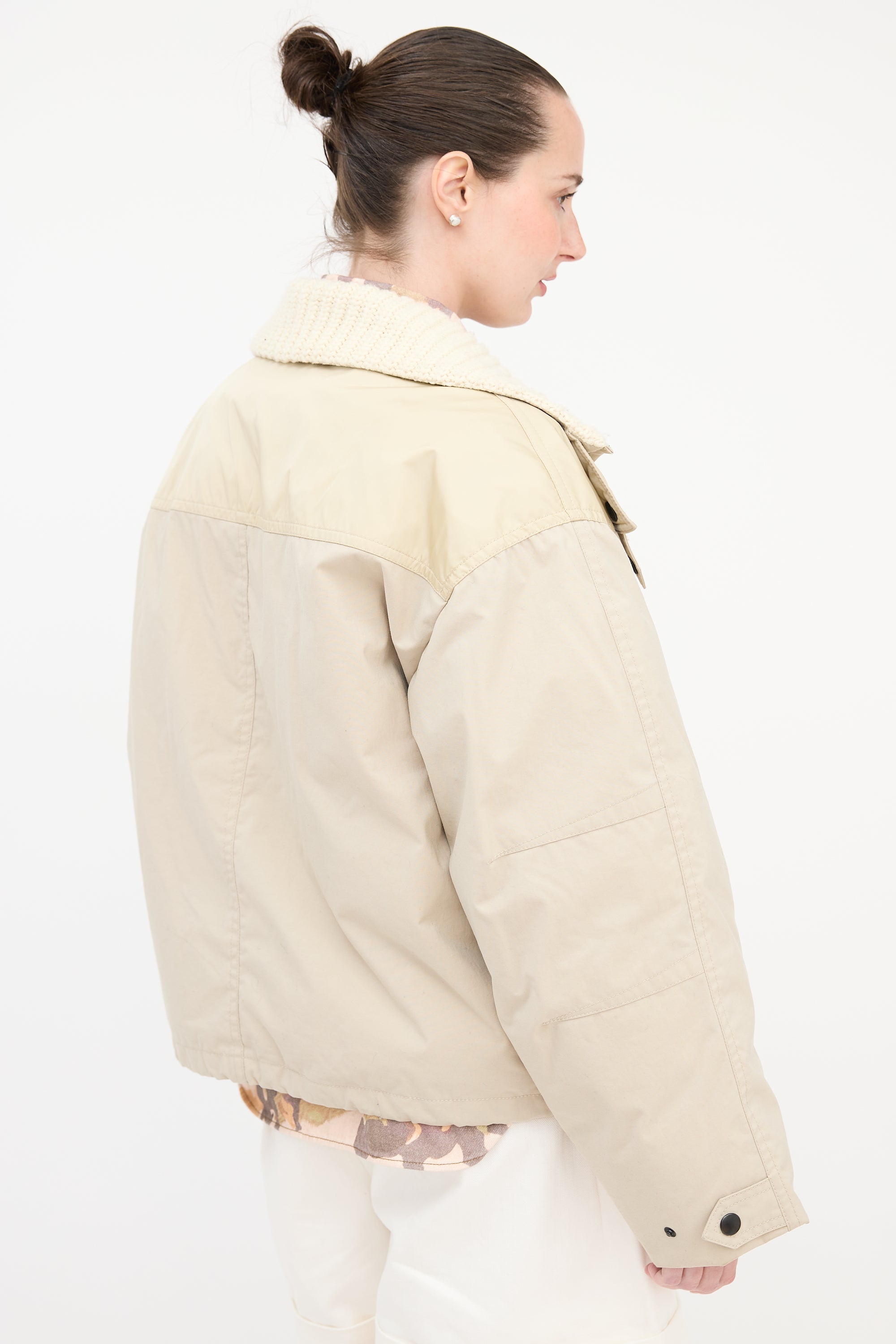Pre-owned Isabel Marant beige oversized Dellazia puffer jacket featuring a stand collar with knit lining, concealed zip front with snap button closure, two snap button flap pockets at chest, two welt pockets at waist, and buttoned cuffs.