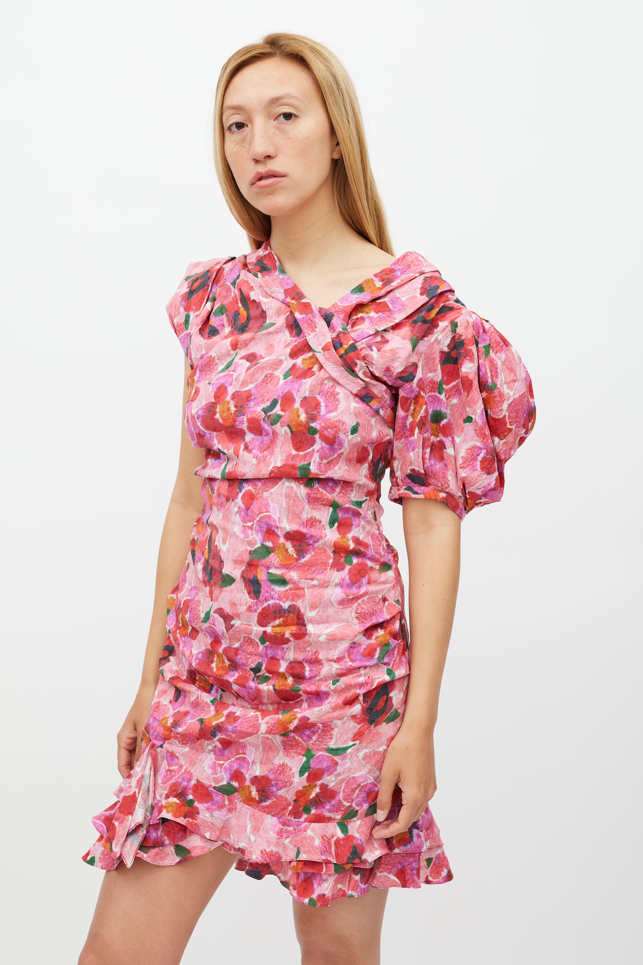 Pre-owned Isabel Marant red and pink Manadio dress featuring multicolour floral print, asymmetrical neckline, puff right sleeve, ruffle hem, and side concealed zip closure. Slightly clipped to fit model.