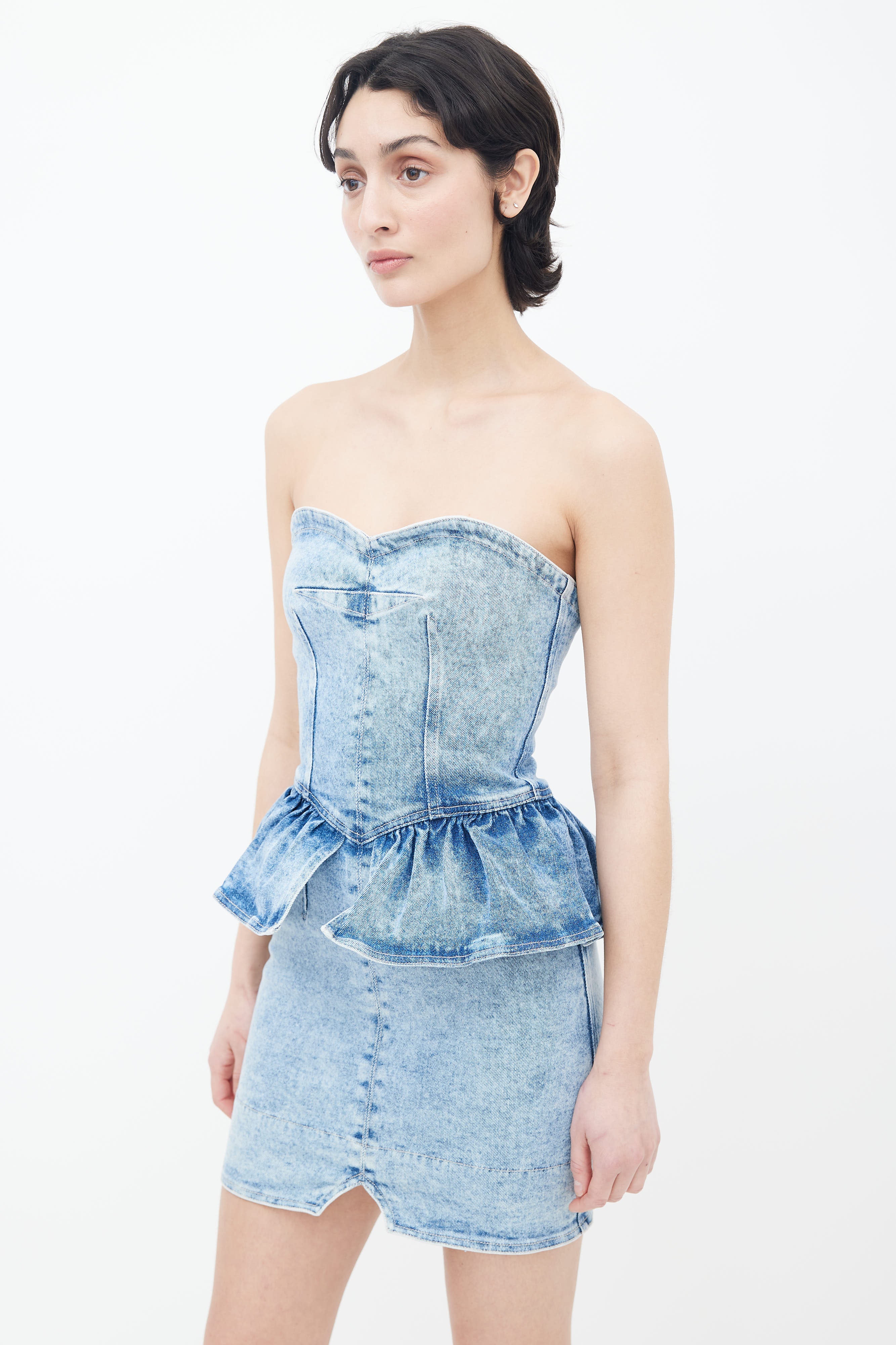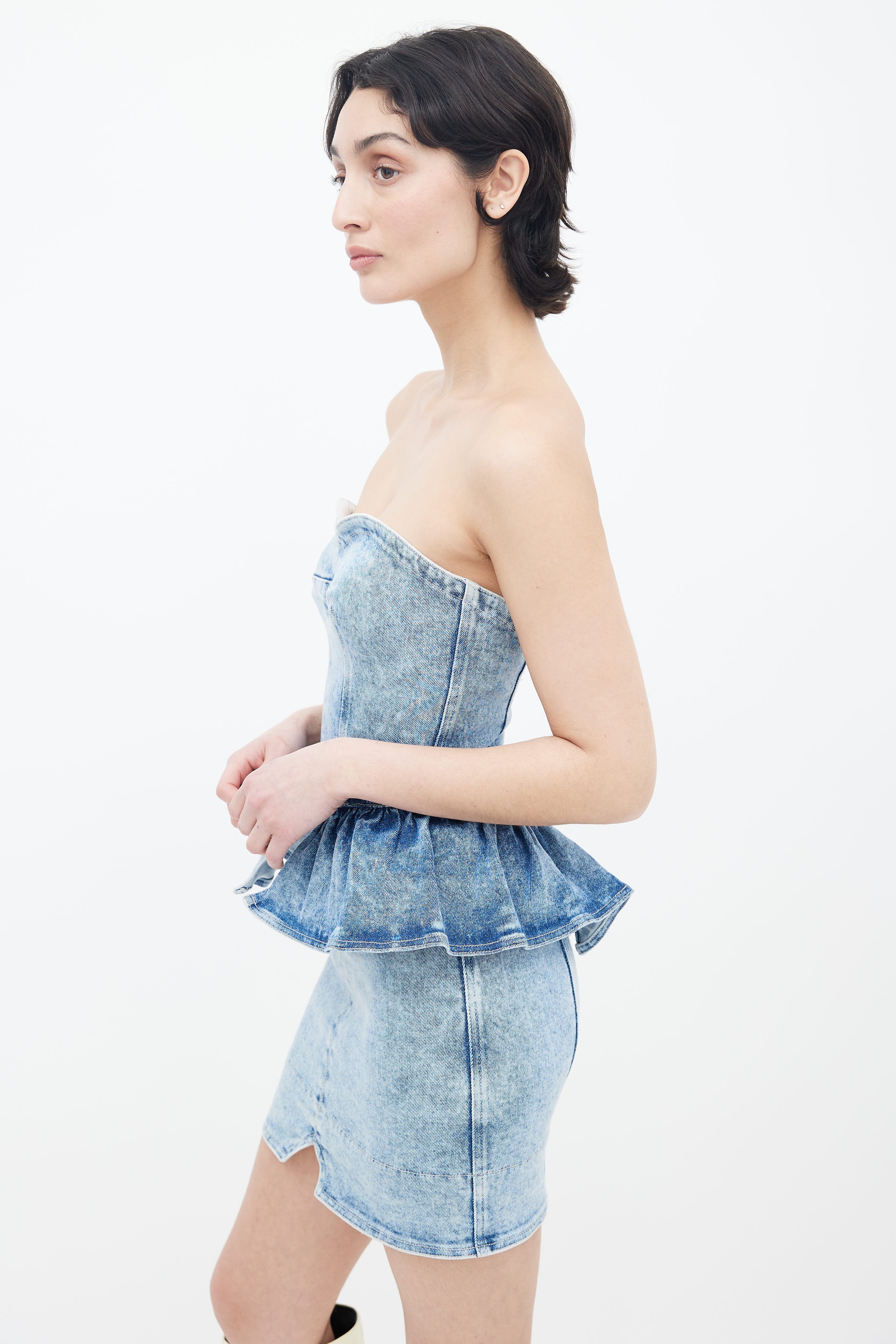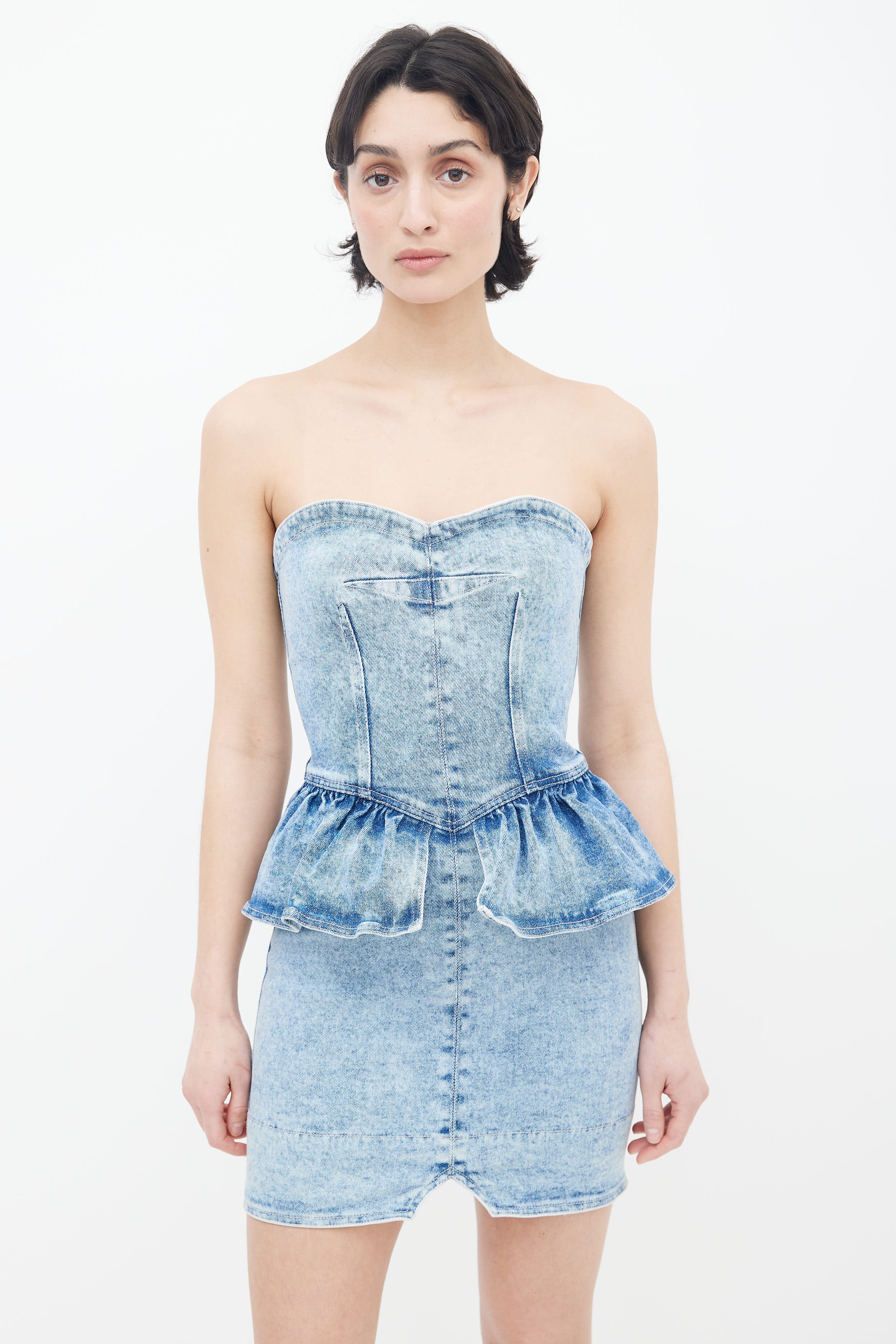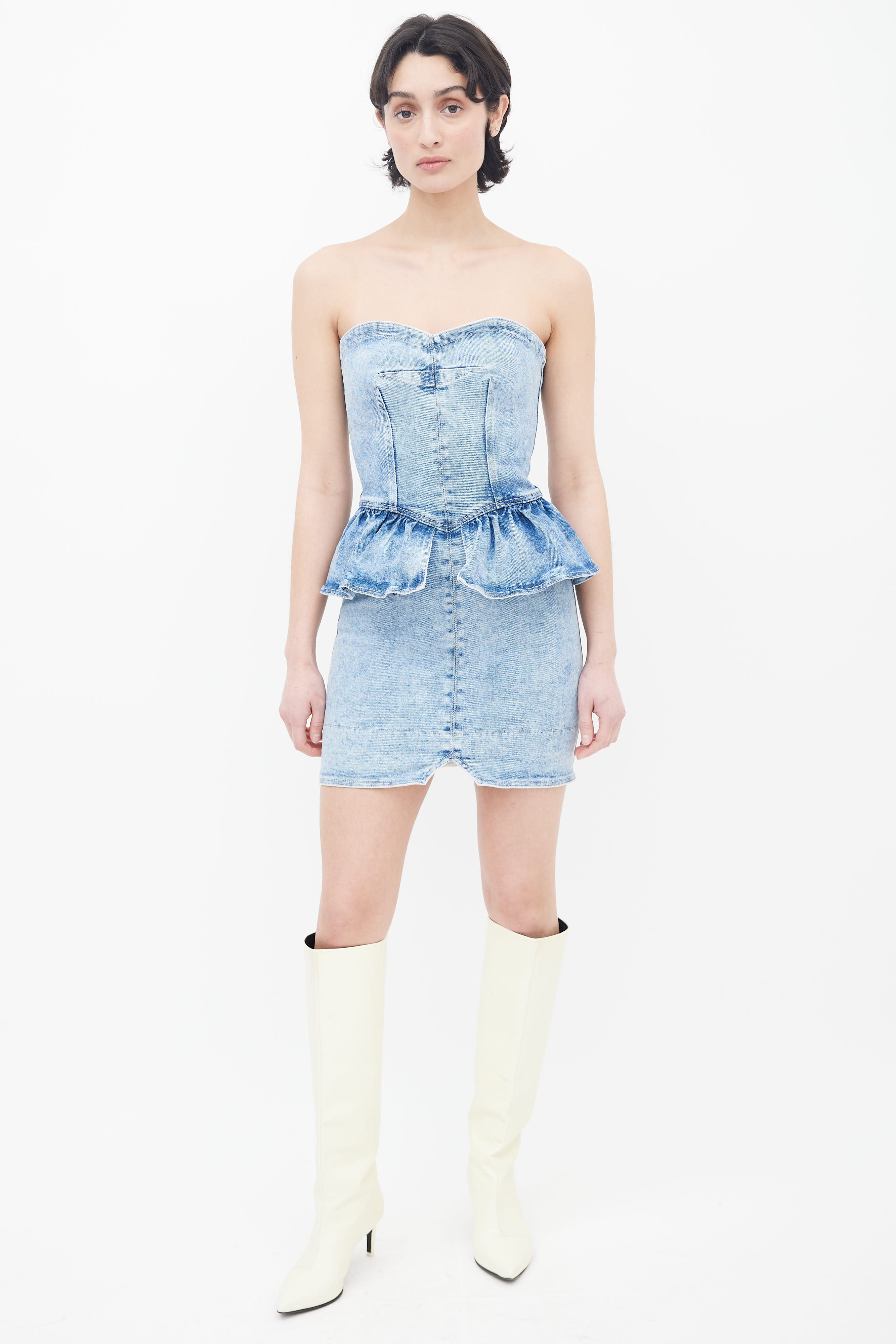 Pre-owned Spring 2021 Isabel Marant Dolizi strapless dress in blue denim featuring sweetheart neckline, darting at bust, zip closure at back, and peplum design. Look 29 of the collection.