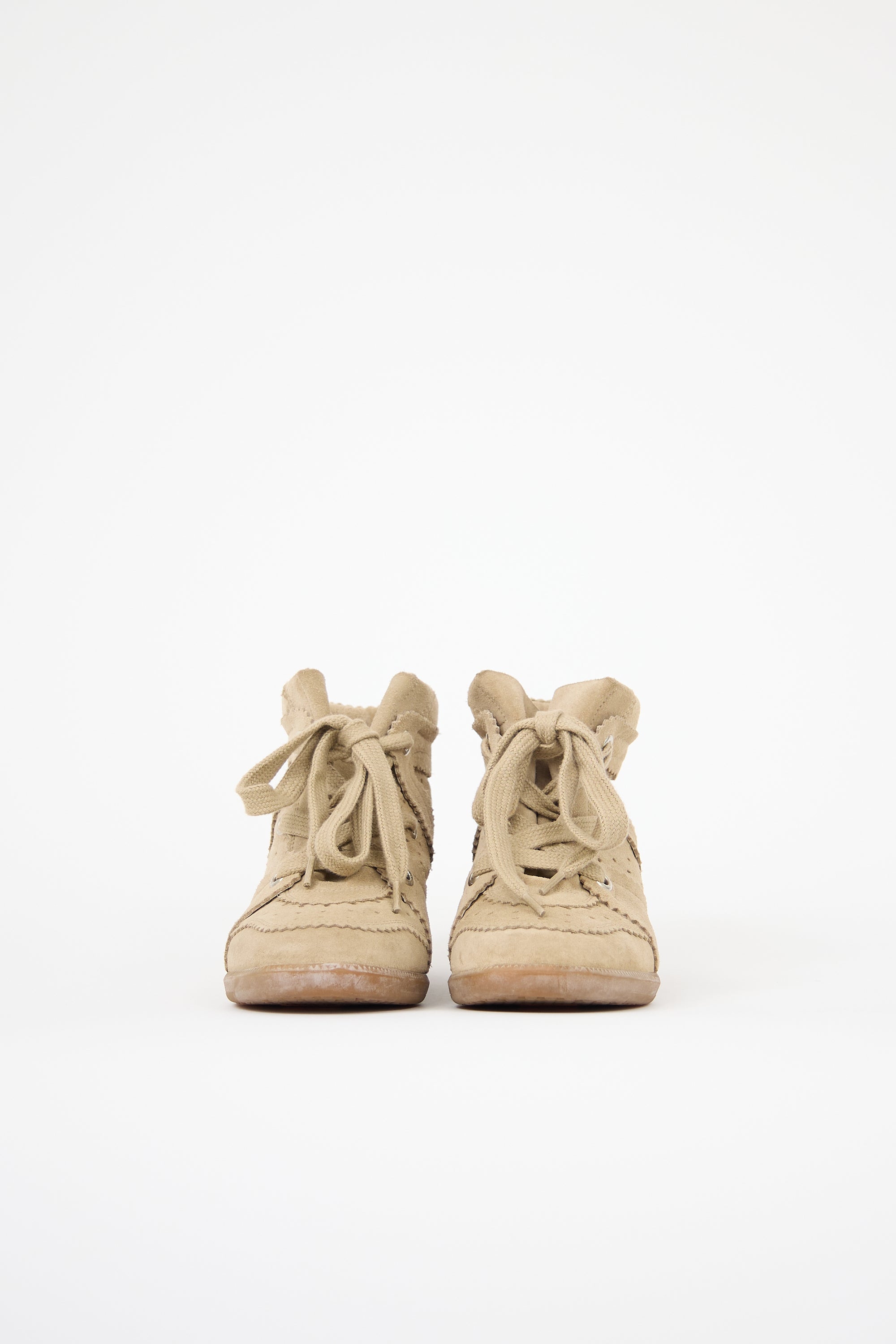 Pre-owned Isabel Marant brown suede Bobby wedge sneakers featuring rounded toe, perforated panelling, lace up vamp, concealed wedge, and brown rubber outsole.