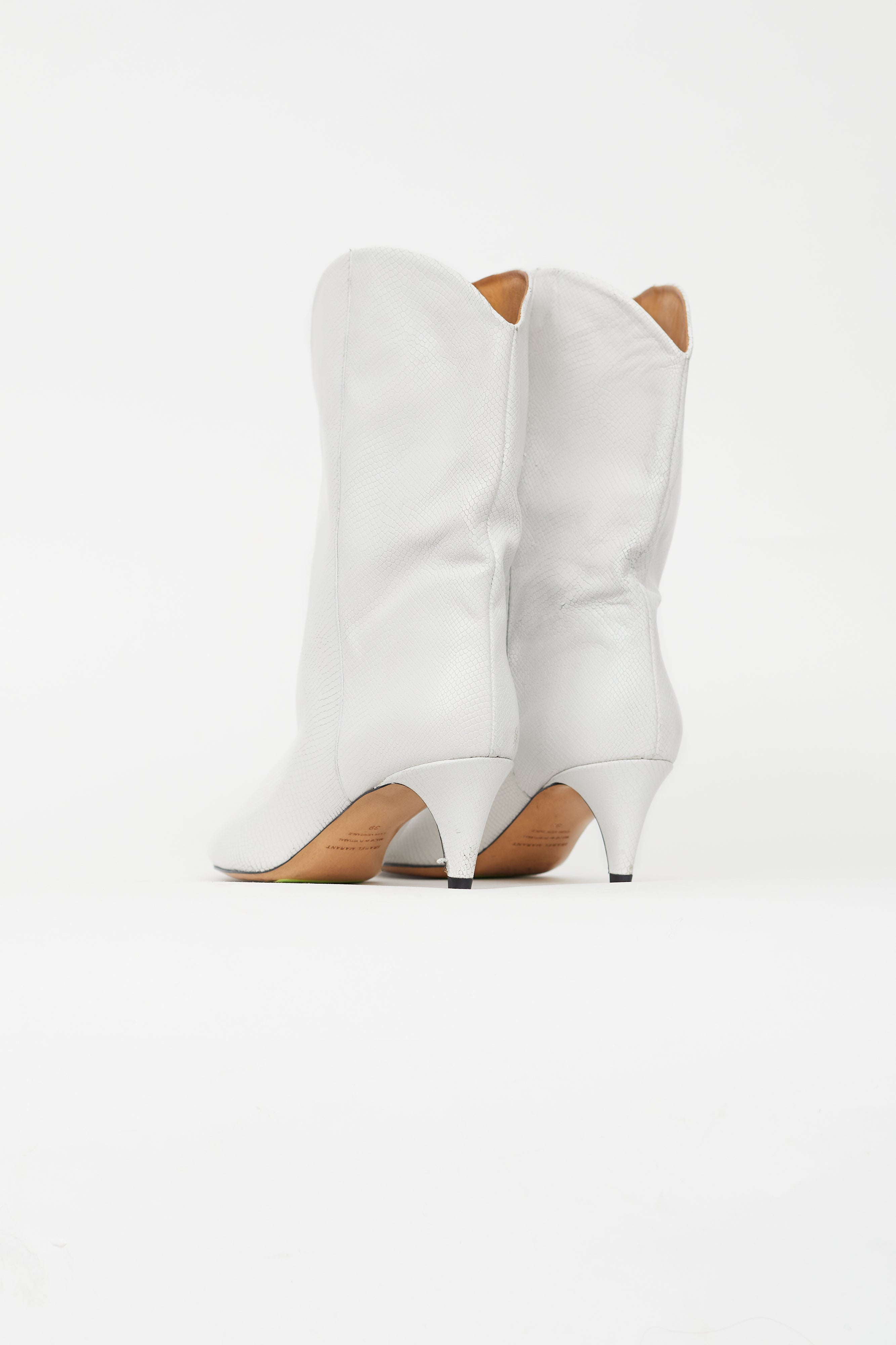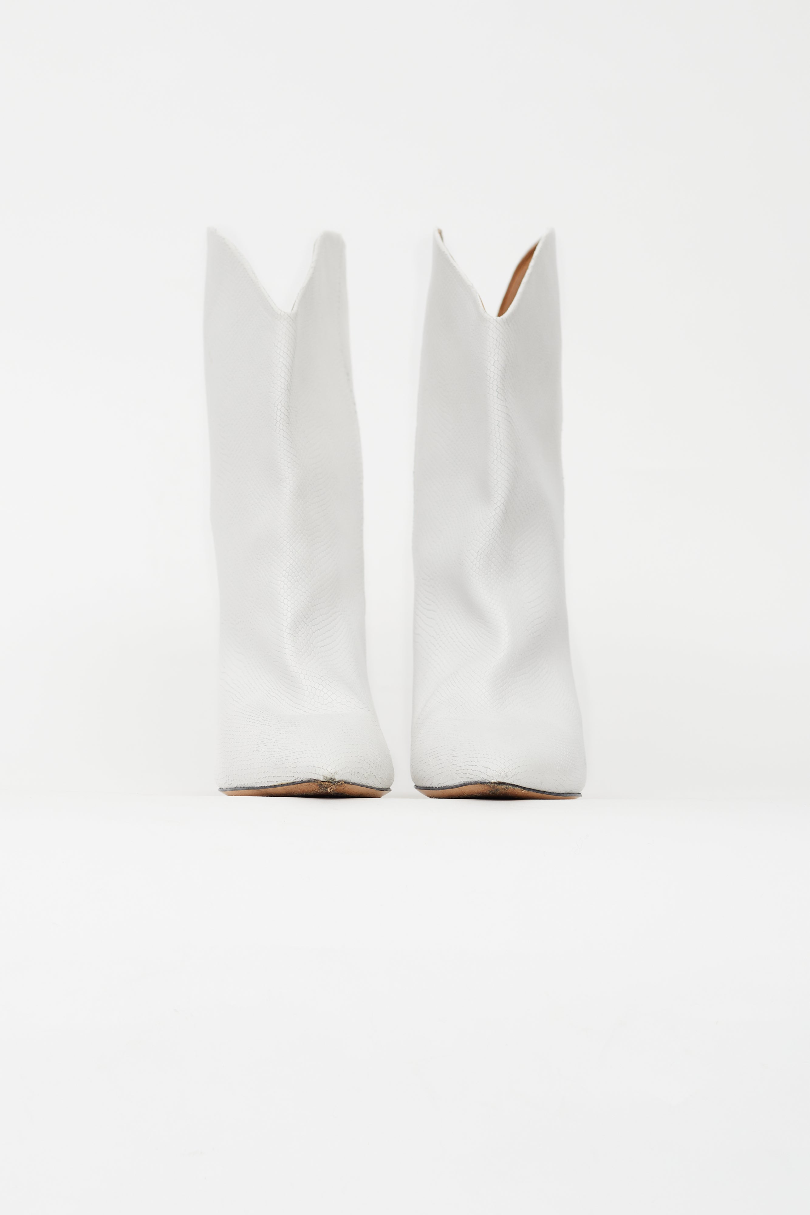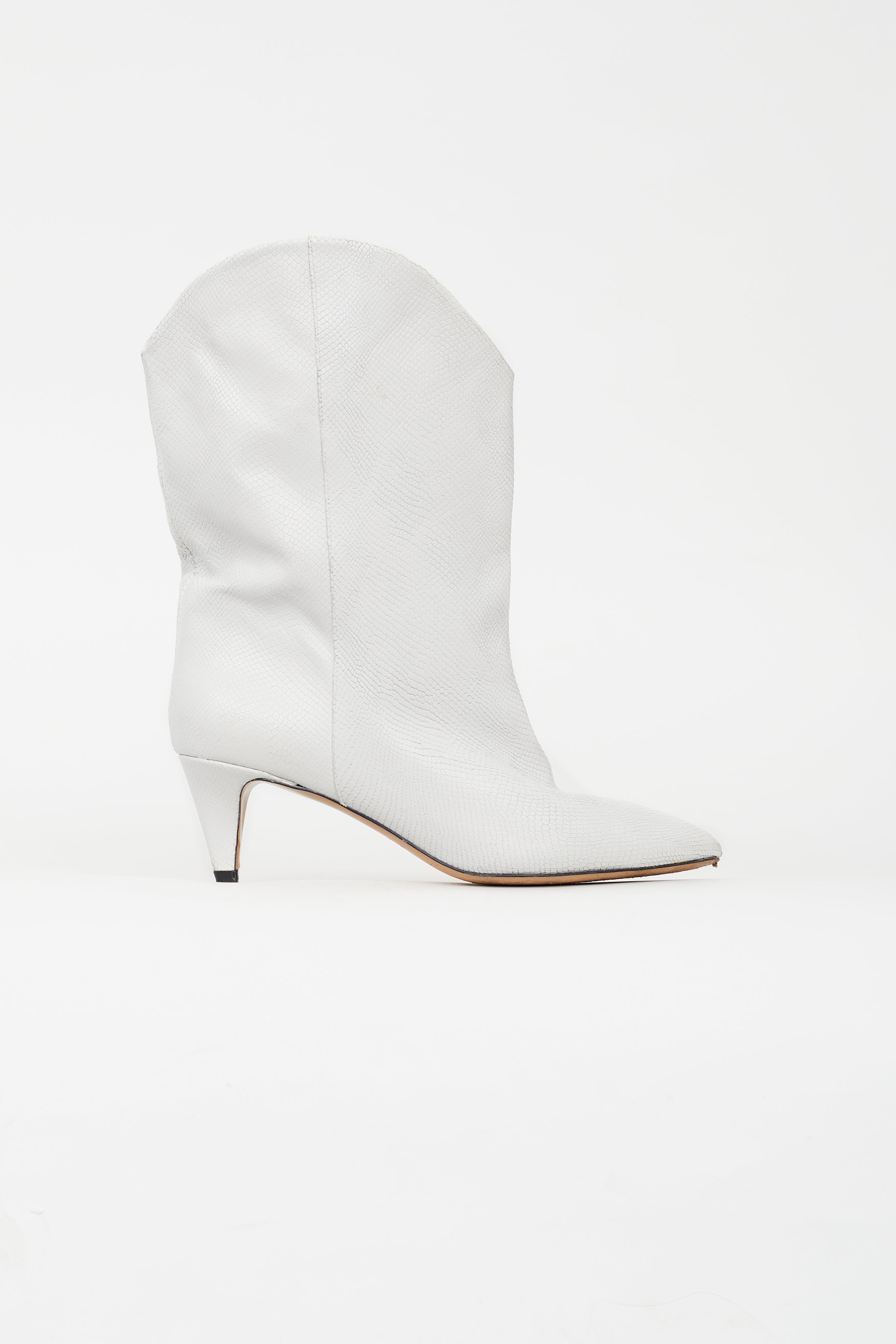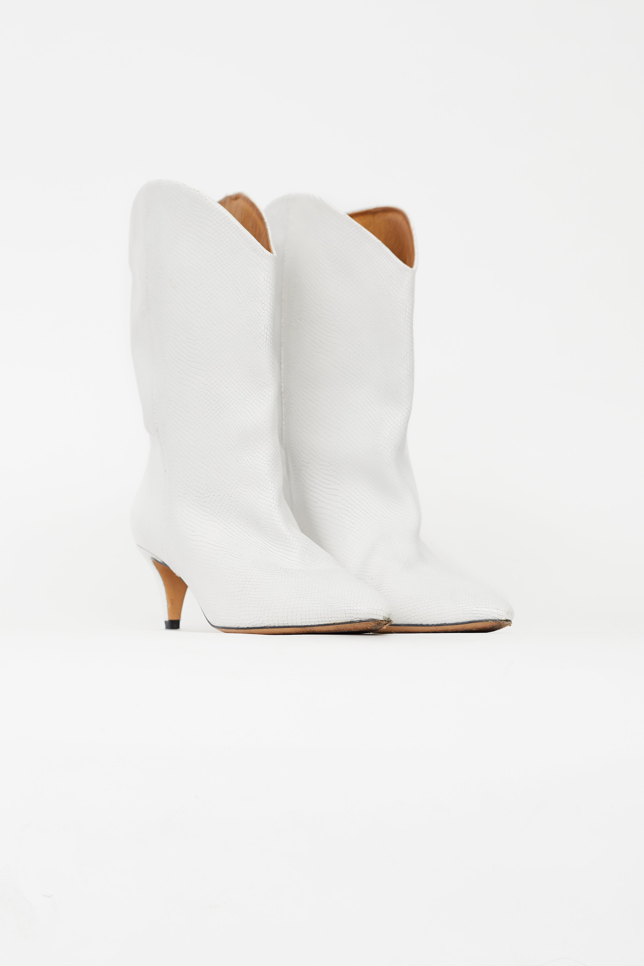 Pre-owned Isabel Marant white western boots featuring an embossed snakeskin print throughout, pointed toe, and wrapped kitten heel.