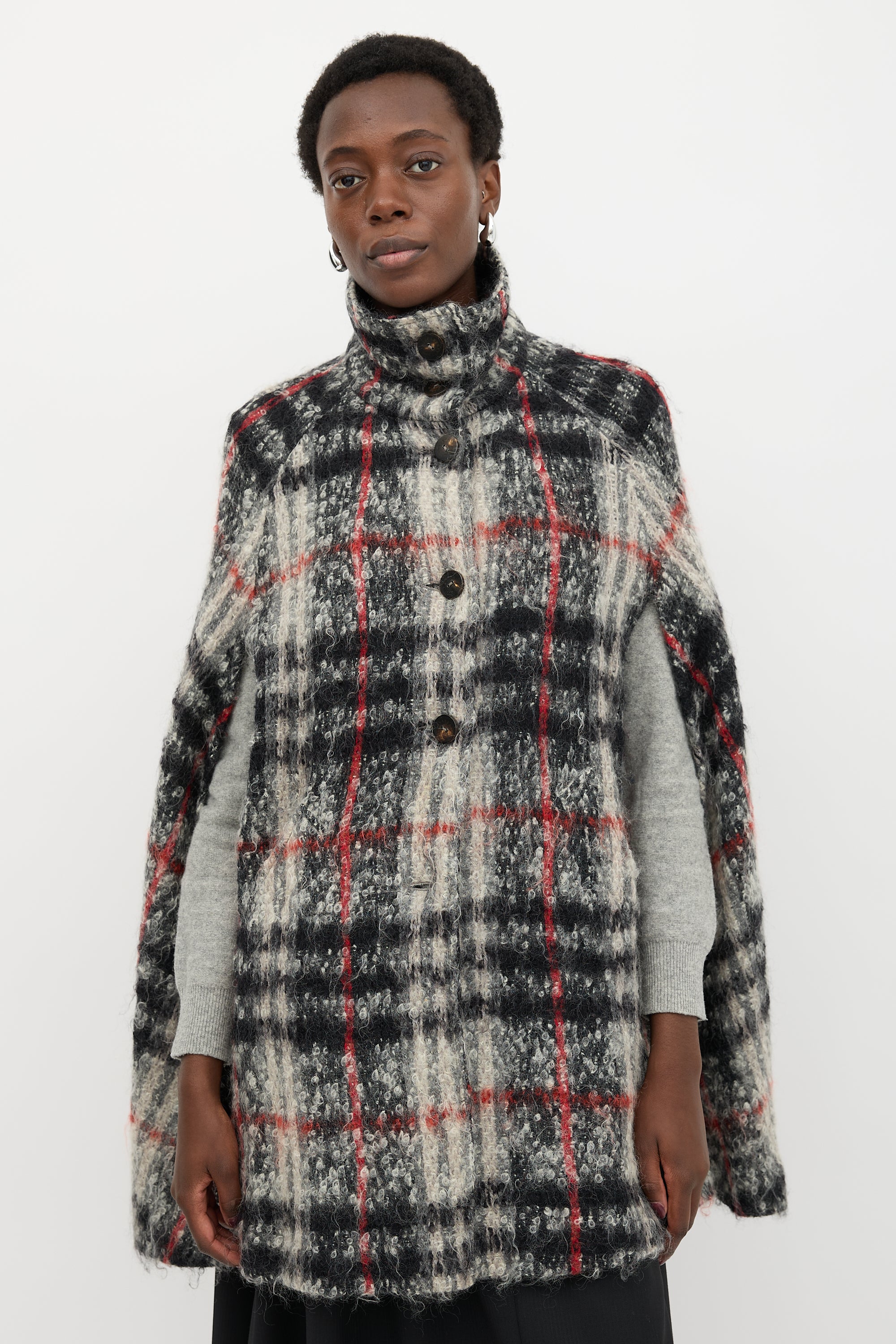 Pre-owned Burberry wool and mohair blend cape jacket featuring a multicolour check pattern, spread collar, button front, cape sleeves, and welt pockets. Lined.