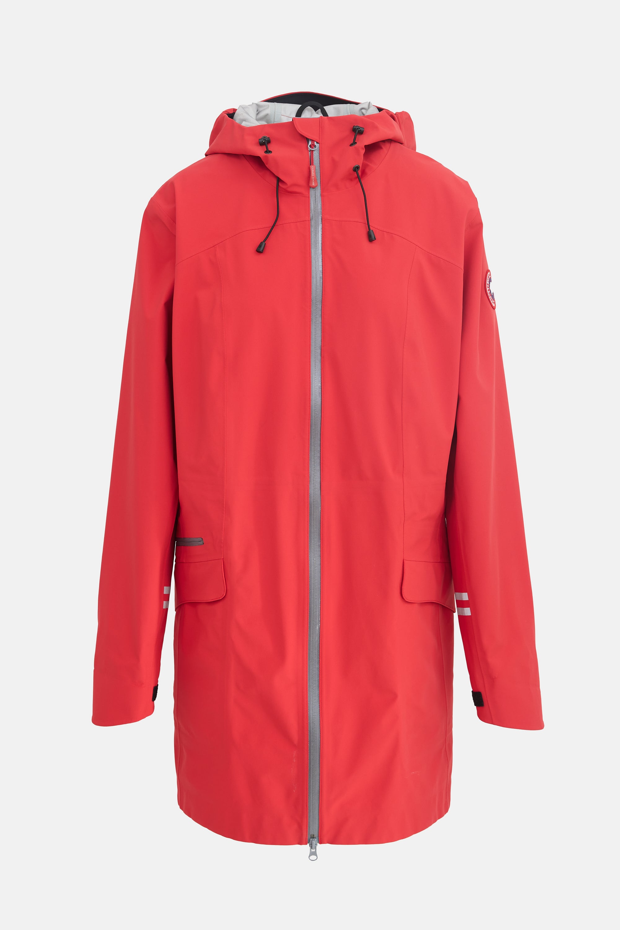 Pre-owned Canada Goose red Pacifica rain jacket featuring a funnel neck with attached drawstring hood, dual zip front closure, three welt pockets at front, two flap pockets at hip, reflective striping at hood and sleeves, signature red logo patch at left arm, and interior drawstring waist.