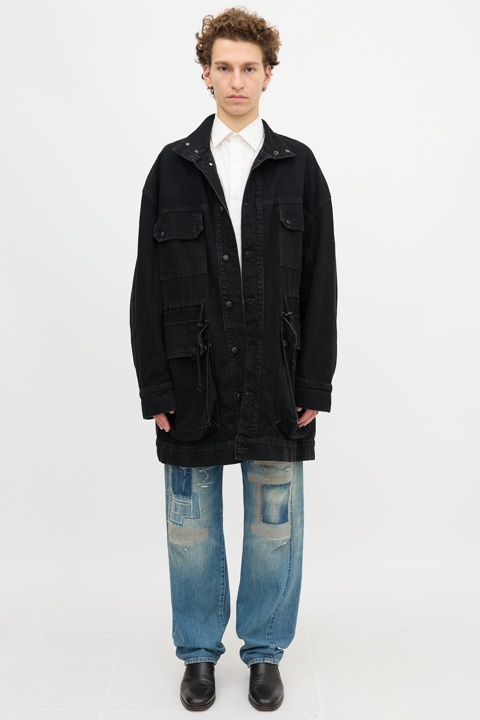 Pre-owned Eckhaus Latta black denim Tethered jacket featuring stand collar, button up front, four front pockets, drawcord waist, and buttoned cuffs.