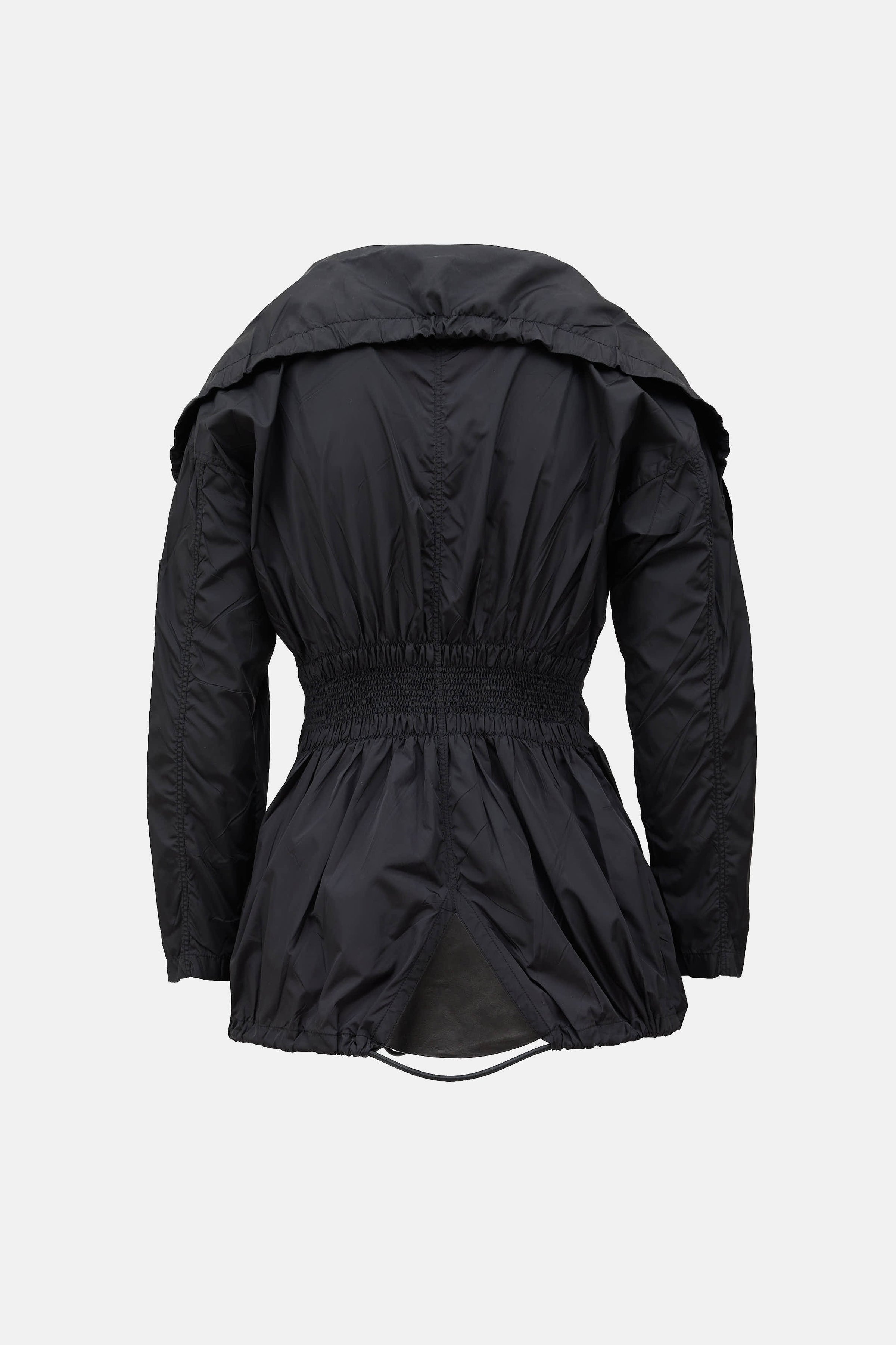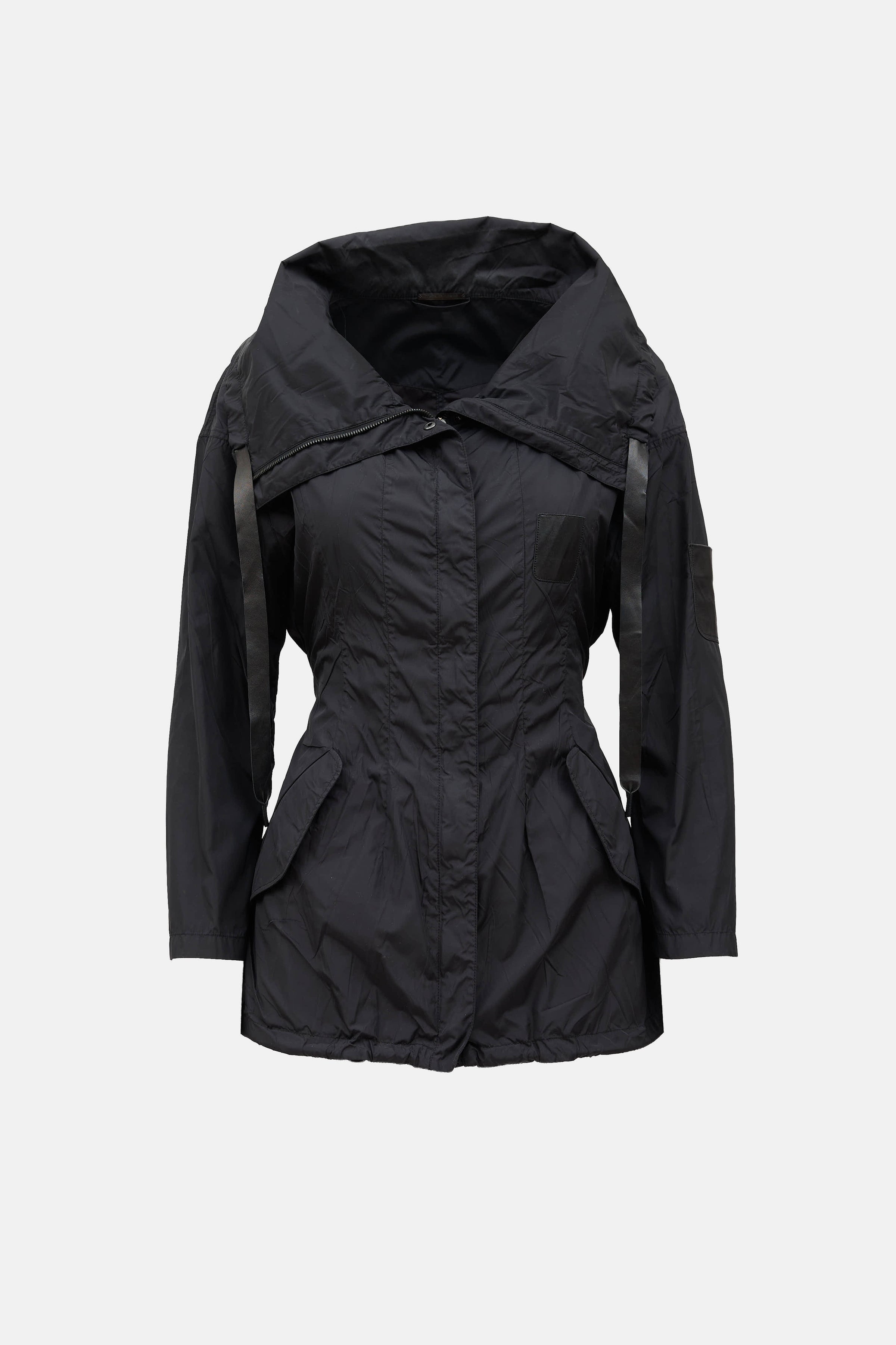 Pre-owned Prada black nylon jacket featuring a funnel neck drawstring collar, long sleeves, leather slip pocket at shoulder, cinched waist, two flap pockets at hip, drawstring hem, and zip closure.