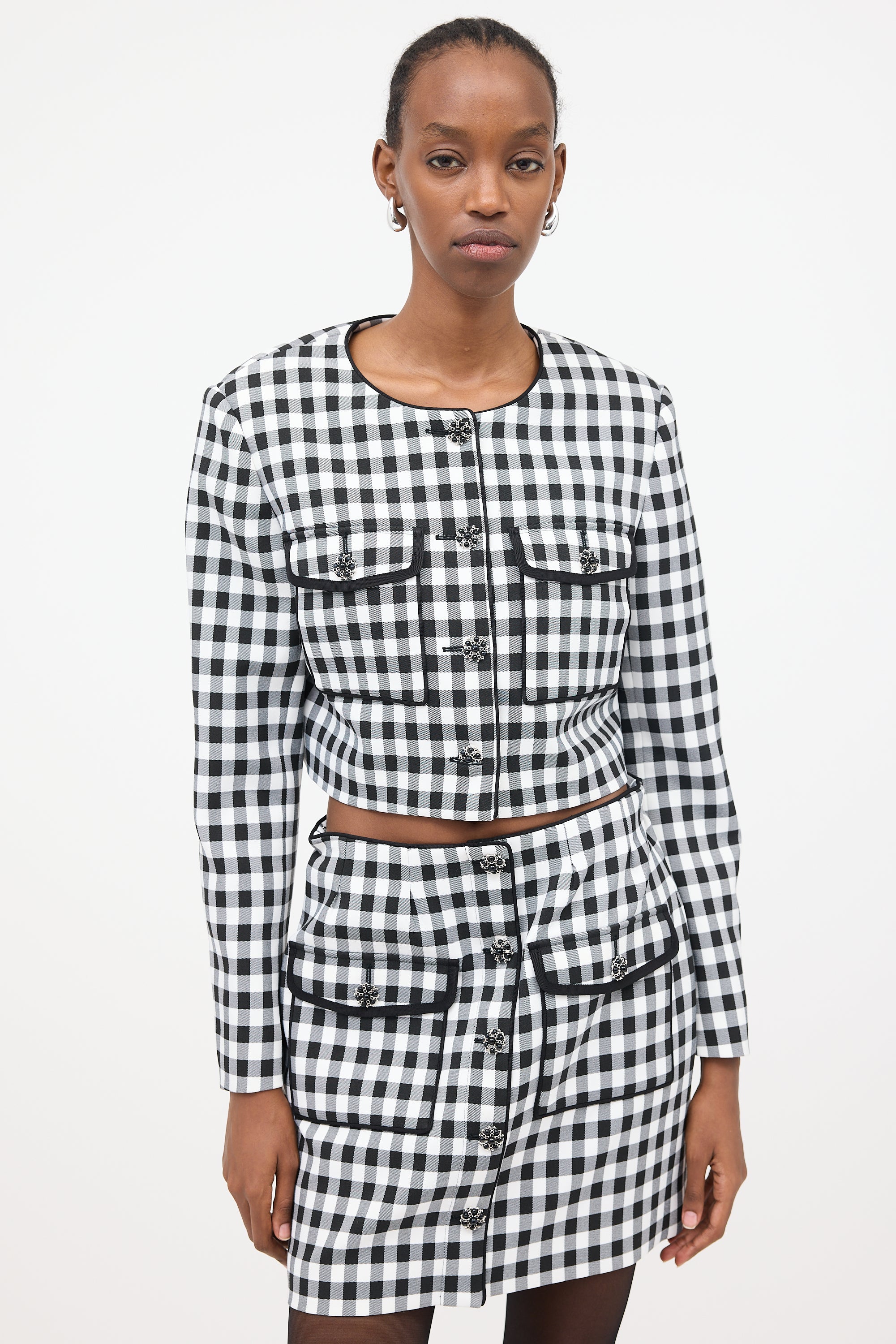 Pre-owned Self-Portrait black and white gingham cropped jacket featuring a round neckline, padded shoulders, silver tone embellished button front, buttoned flap pockets at chest, and buttoned cuffs. Lined.