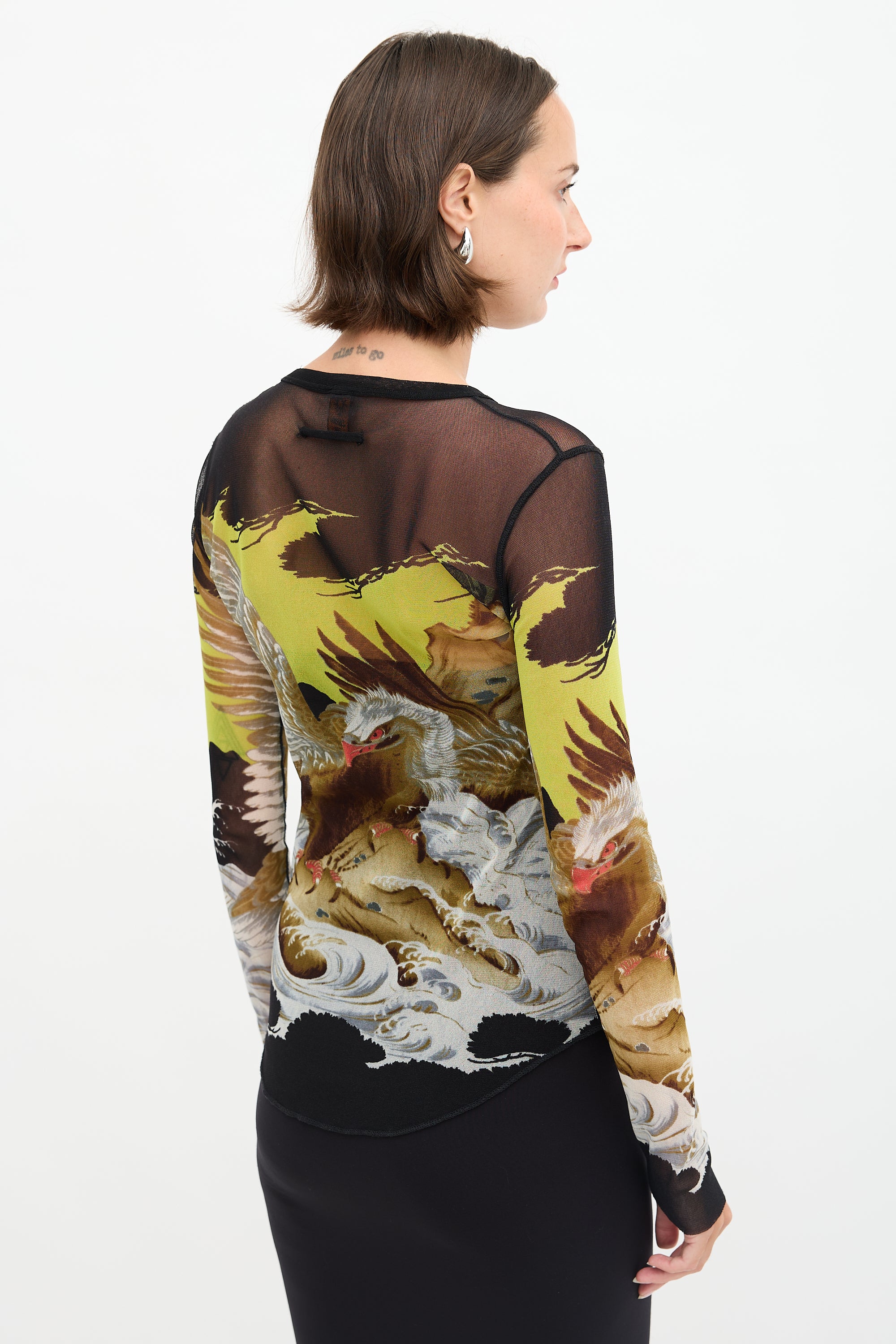 Pre-owned Jean Paul Gaultier Soleil black, green, and multicolour mesh top featuring round neckline, eagle print, curved back hem, and raw sleeve ends.