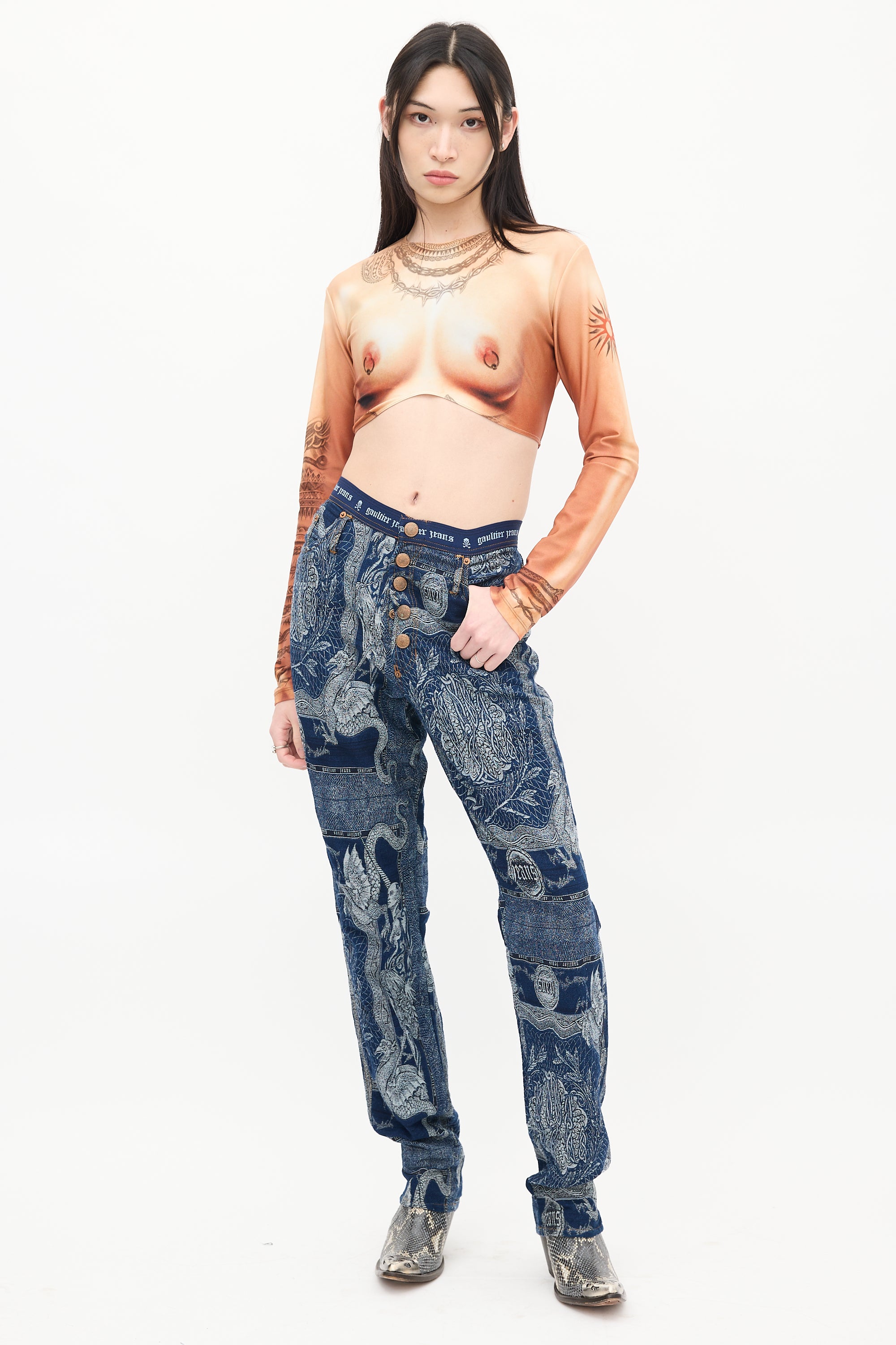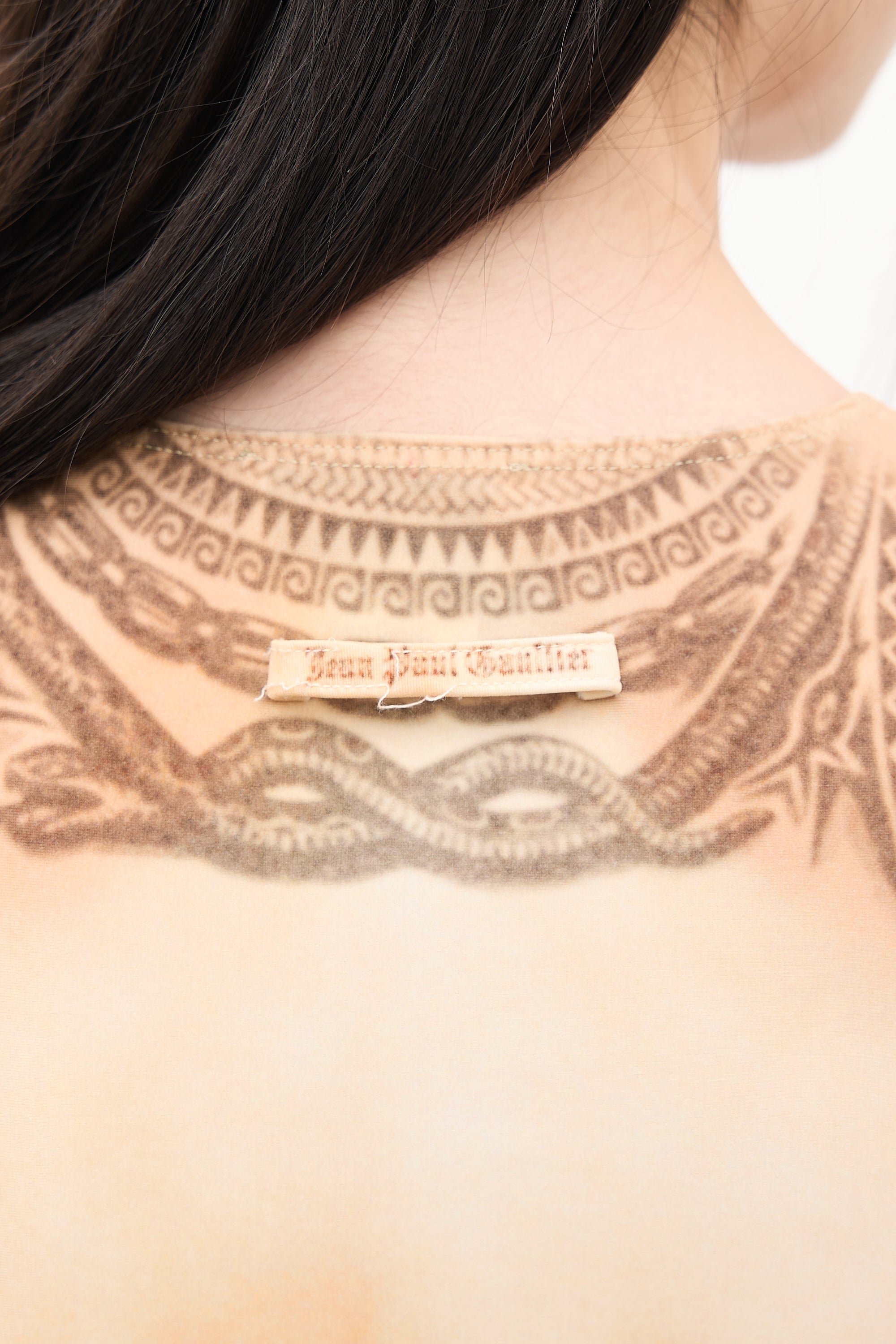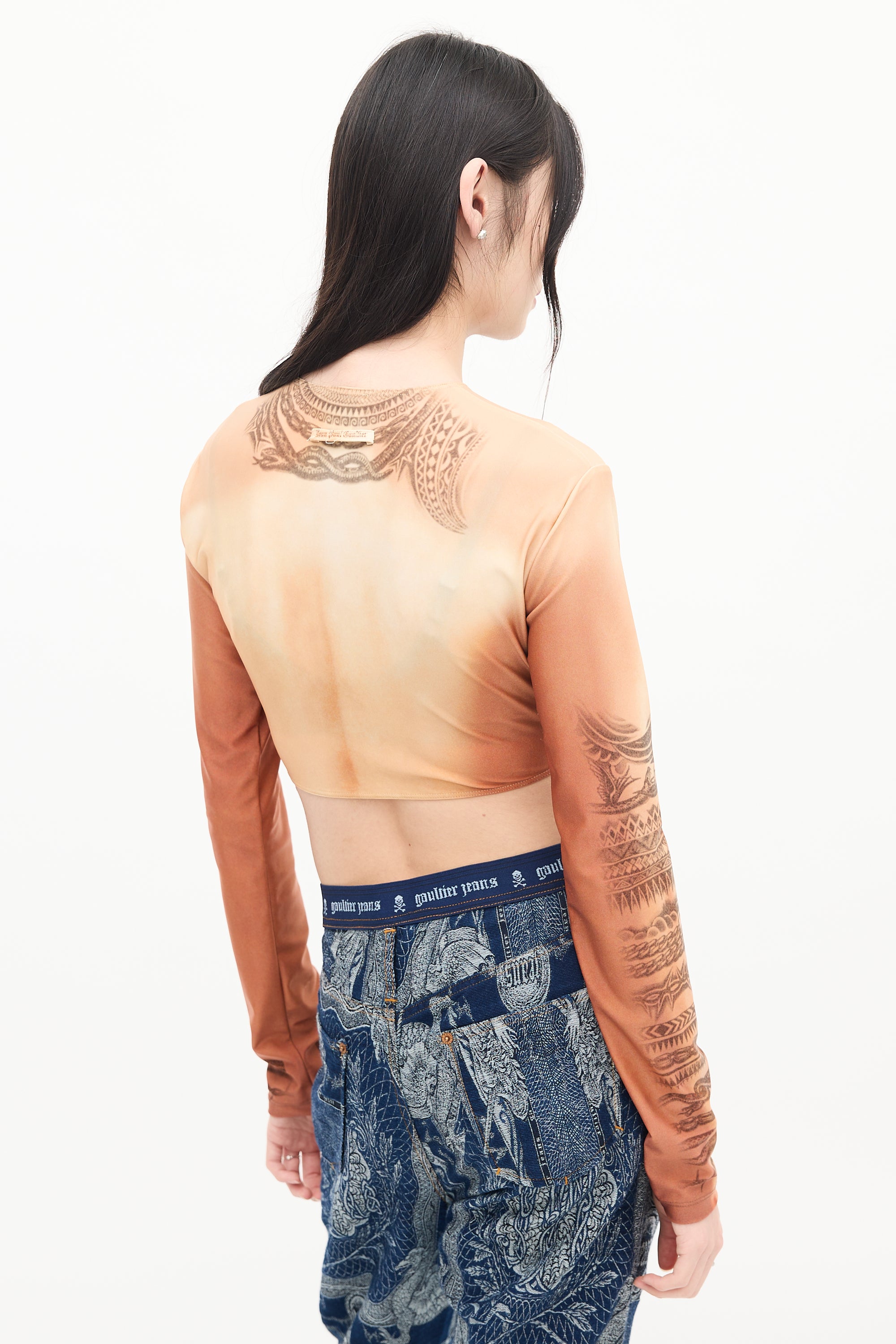 Pre-owned Jean Paul Gaultier Love Moi brown nylon blend crop top featuring a round neckline, curved front hem, long sleeves, trompe l'oeil chest and tattoo design throughout, and logo locker loop at upper centre back. Clipped to fit model.