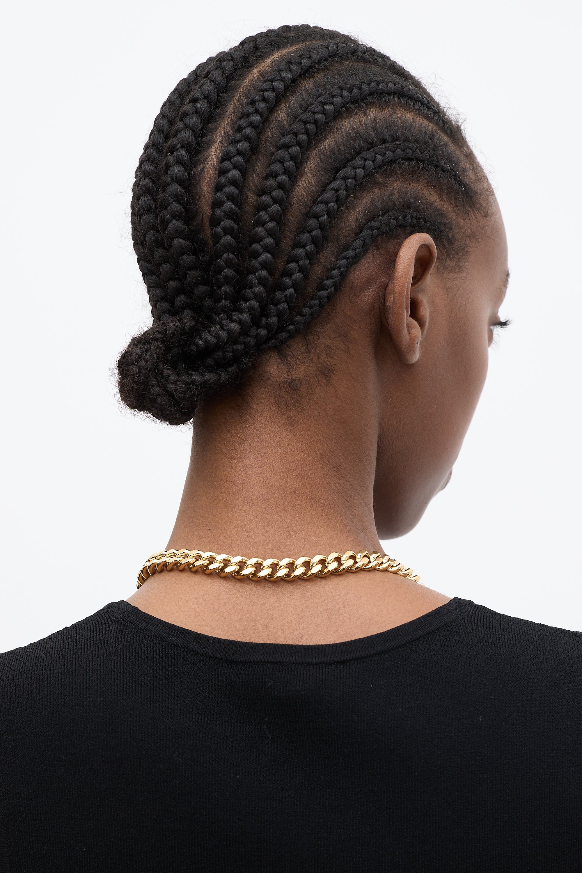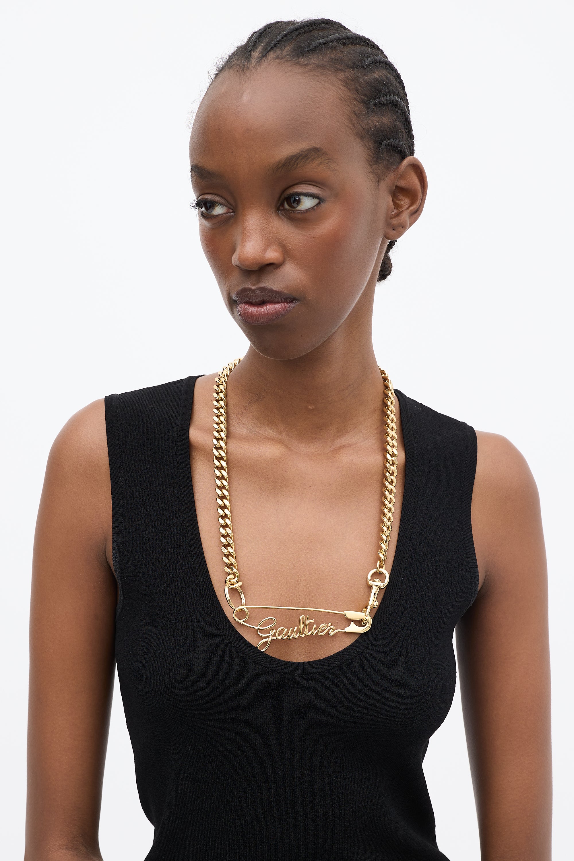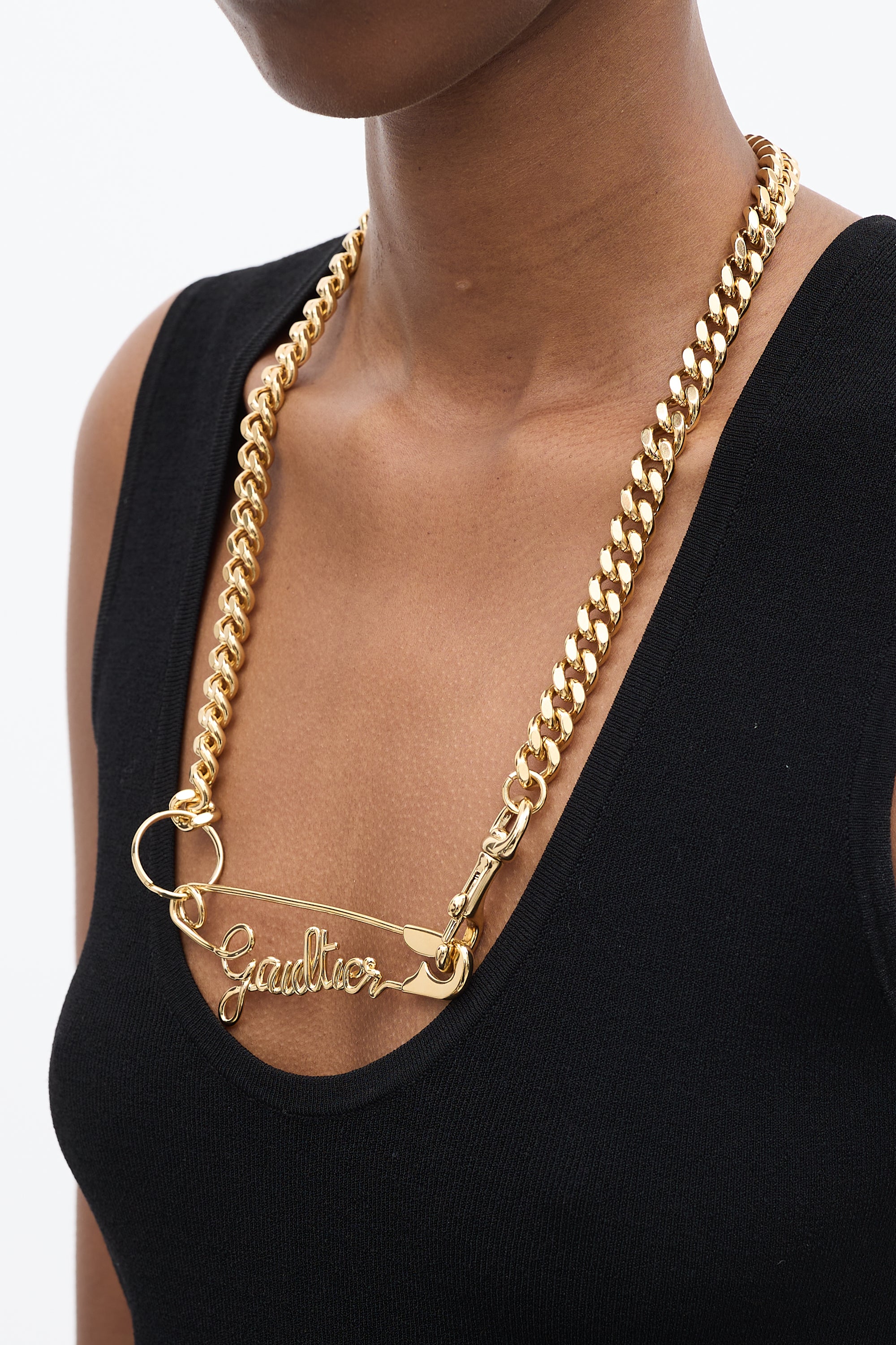 Pre-owned Jean Paul Gaultier gold tone necklace featuring sculptural logo safety pin neckline, chunky curb chain, and swivel snap hook closure.