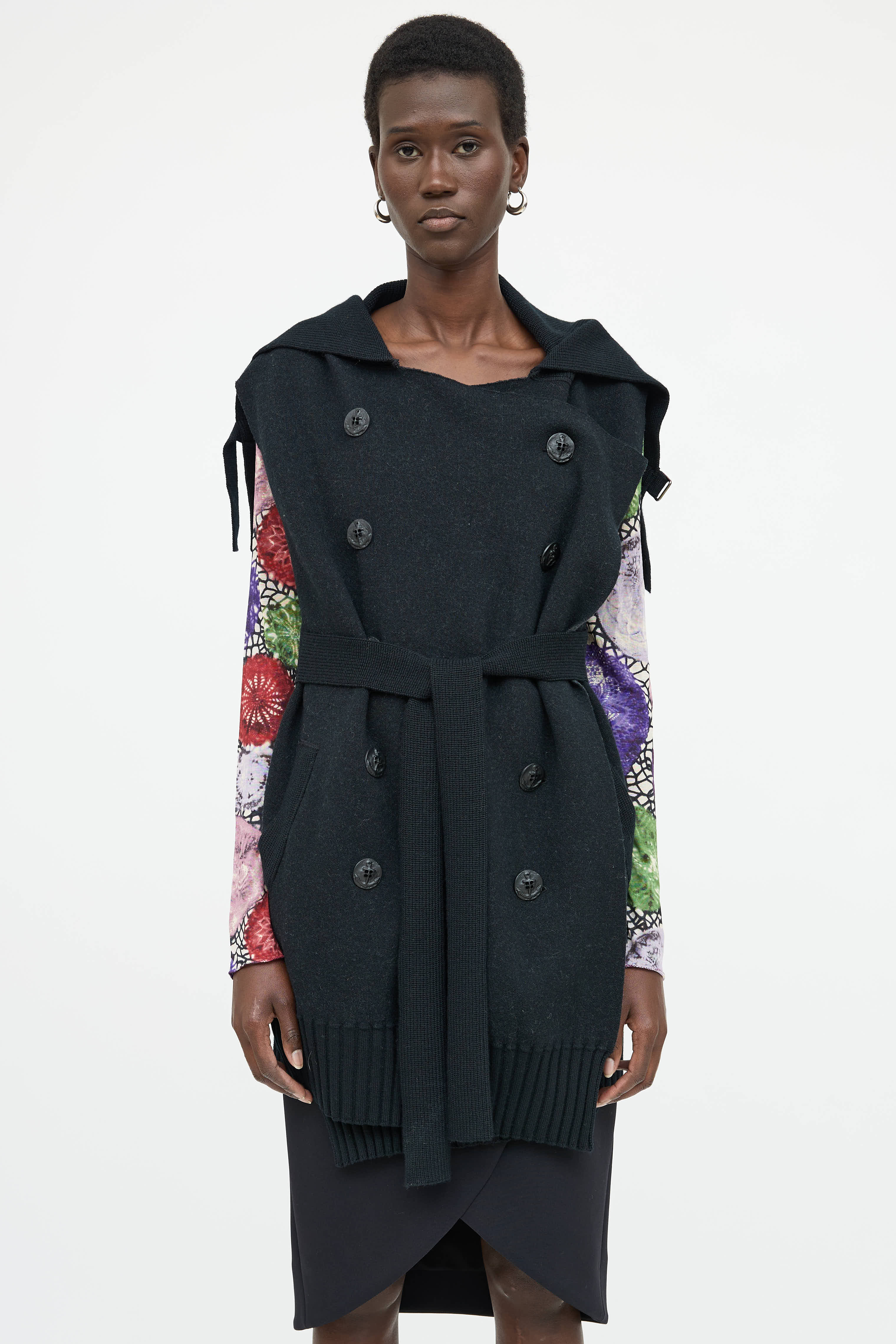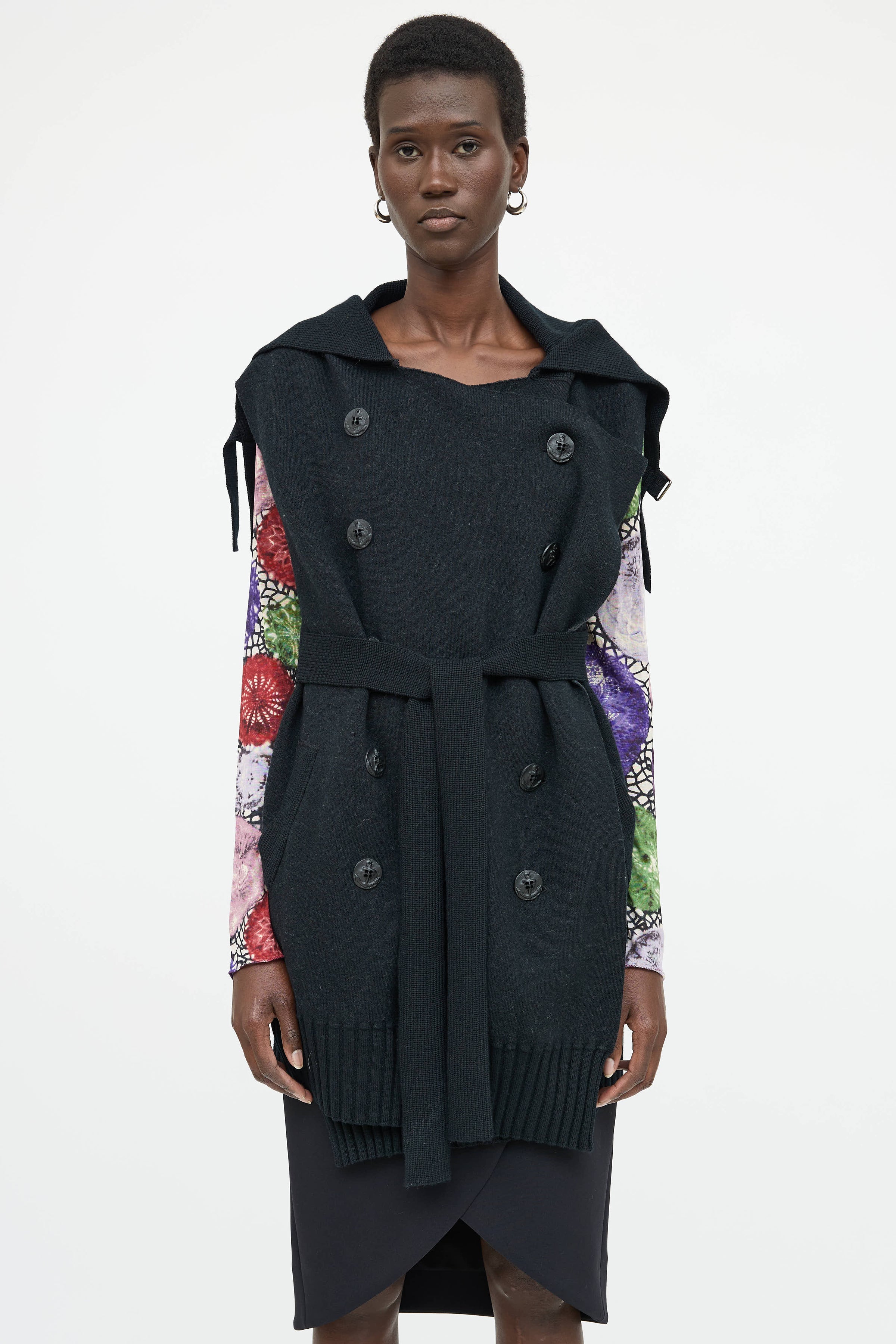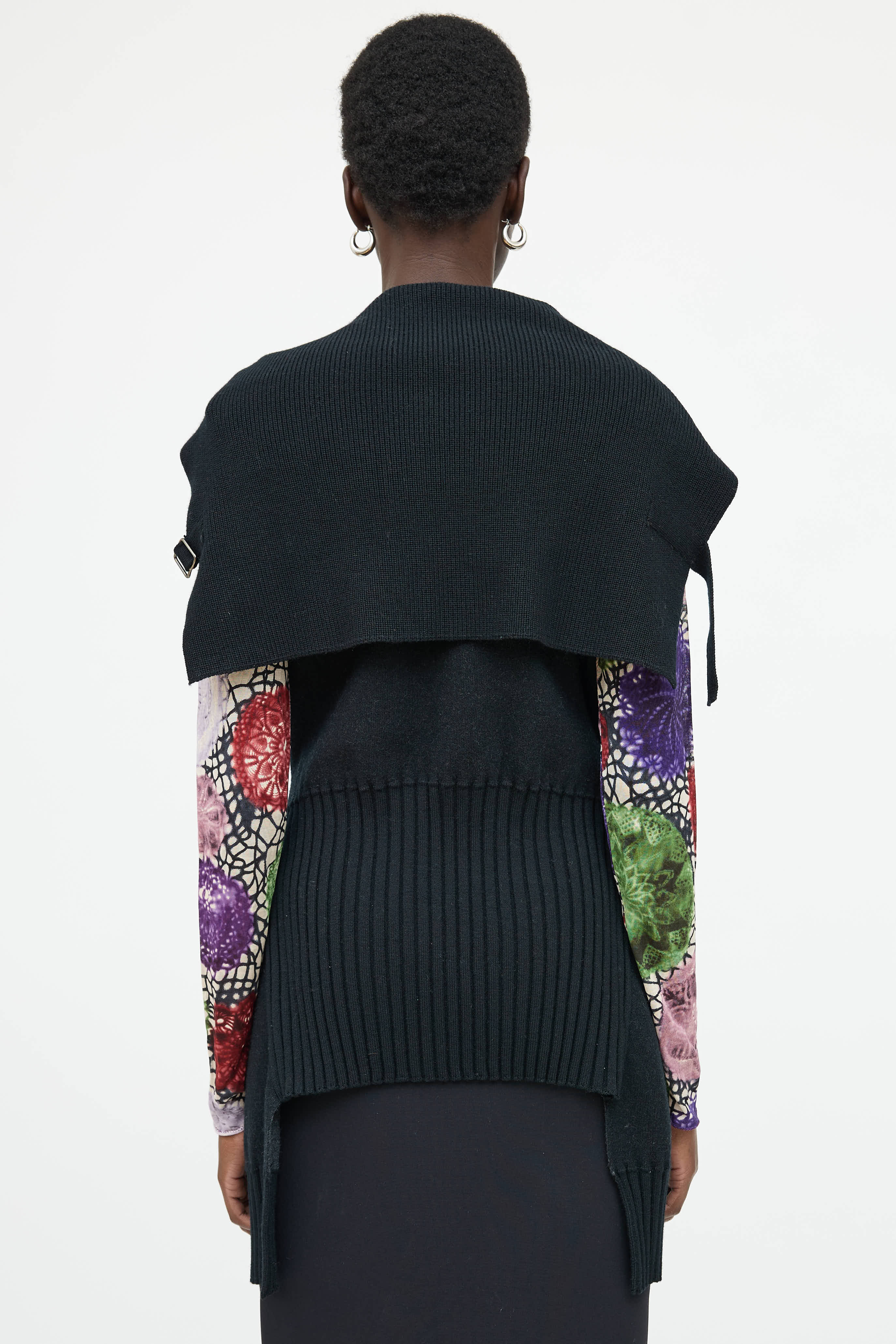 Pre-owned Jean Paul Gaultier black wool knit vest featuring a fold over funnel neck collar with buckle detail, two slip pockets at hip, tie belt at waist, high low ribbed hem, and wrap front with double breasted button closure.