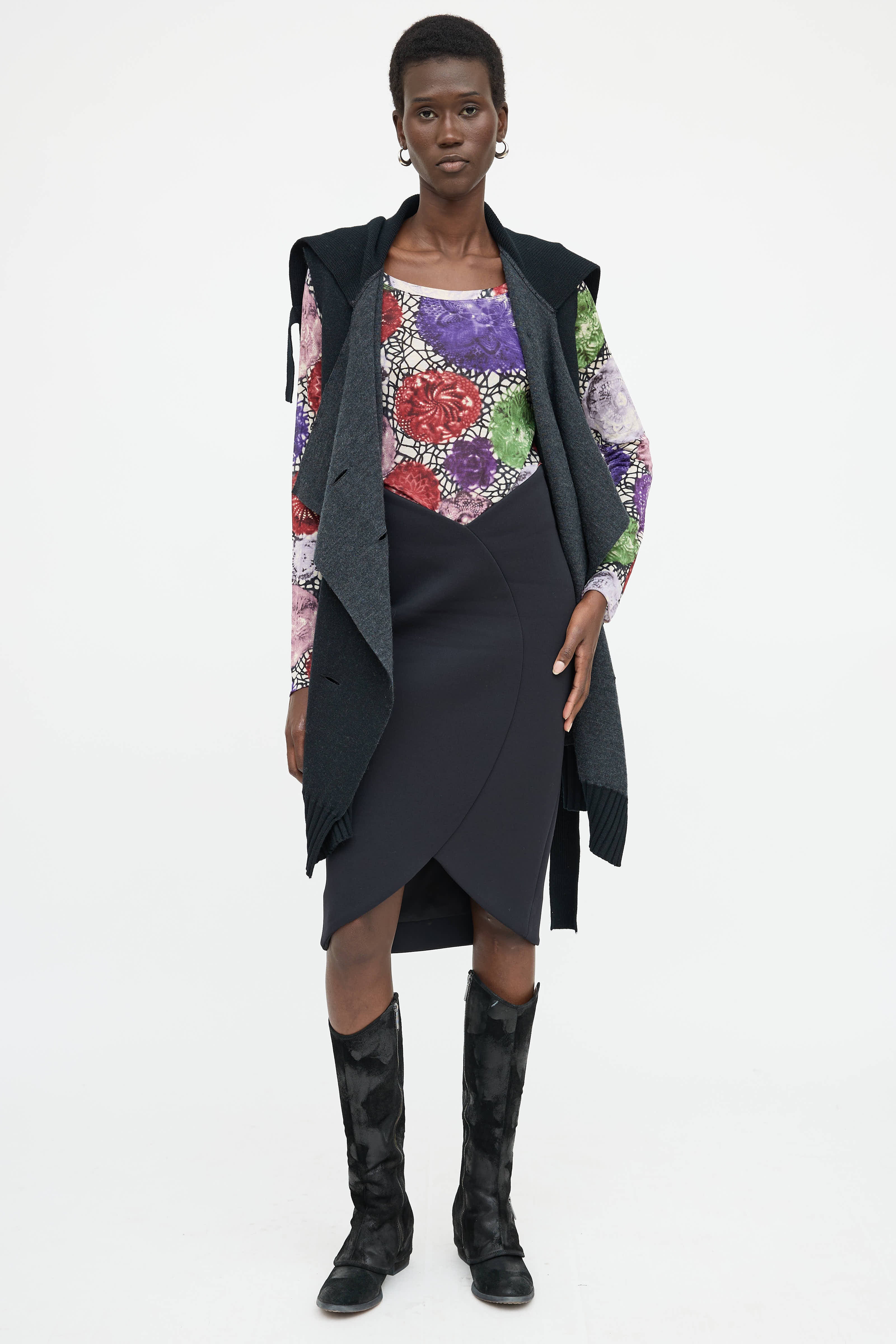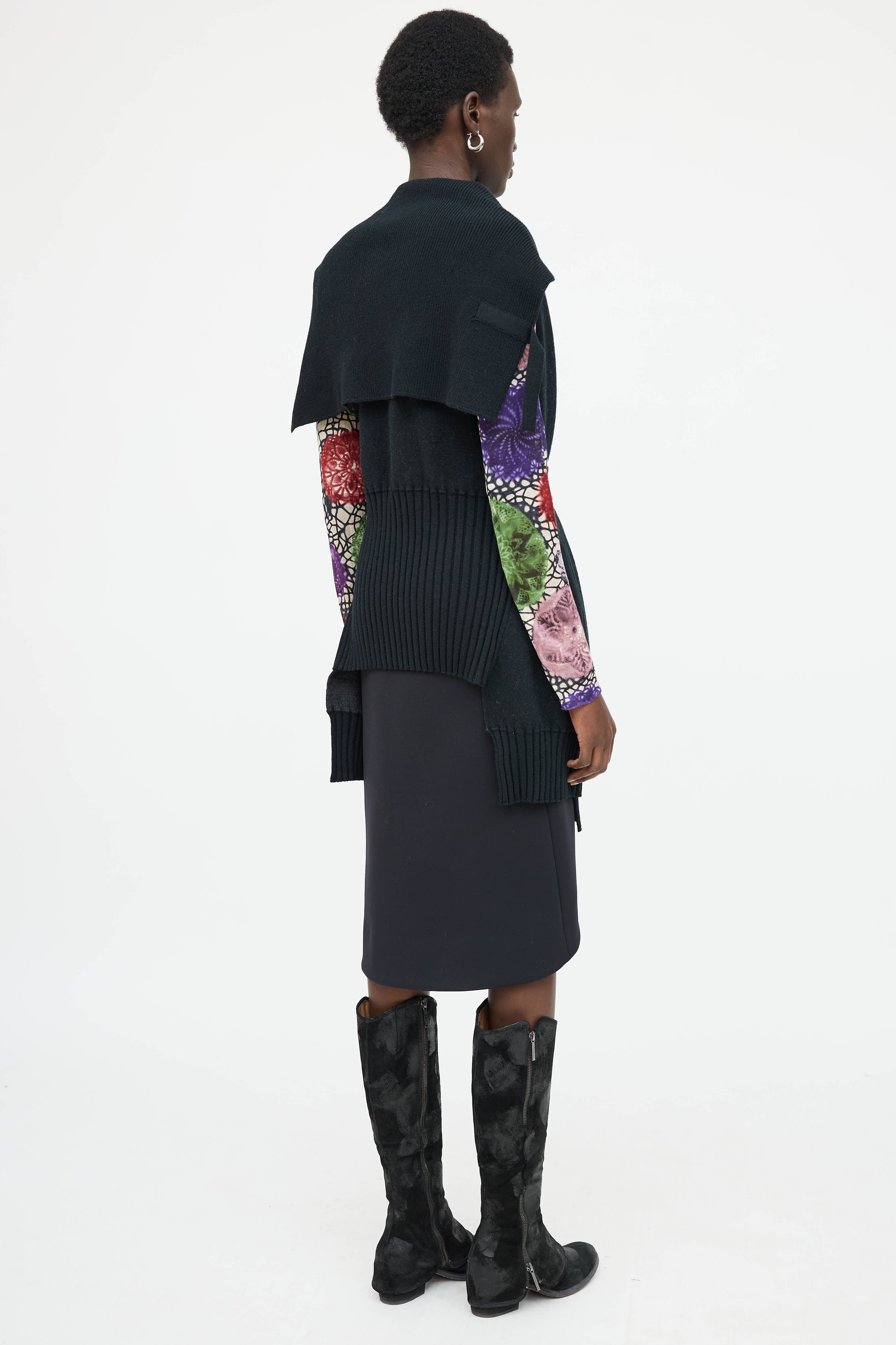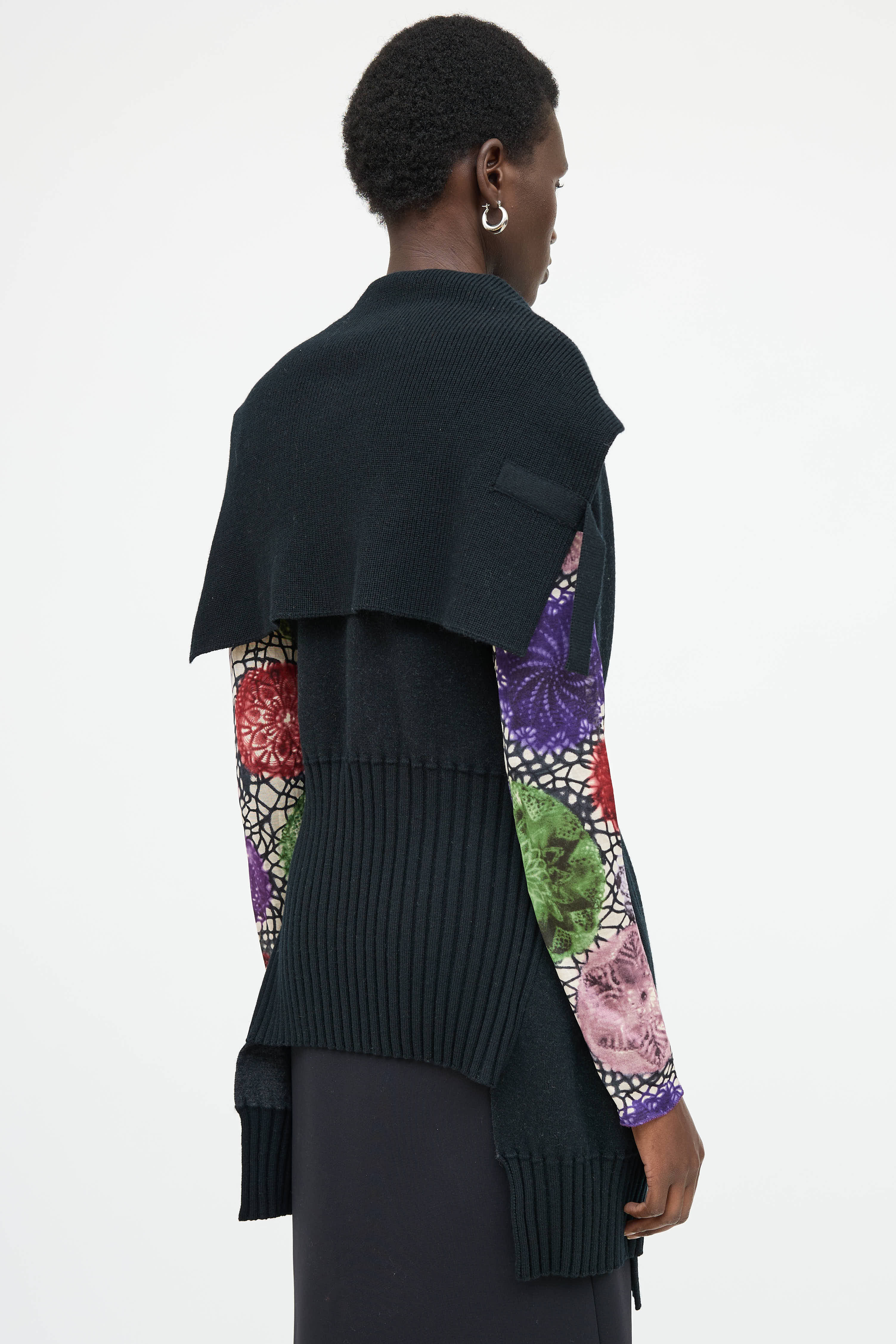Pre-owned Jean Paul Gaultier black wool knit vest featuring a fold over funnel neck collar with buckle detail, two slip pockets at hip, tie belt at waist, high low ribbed hem, and wrap front with double breasted button closure.