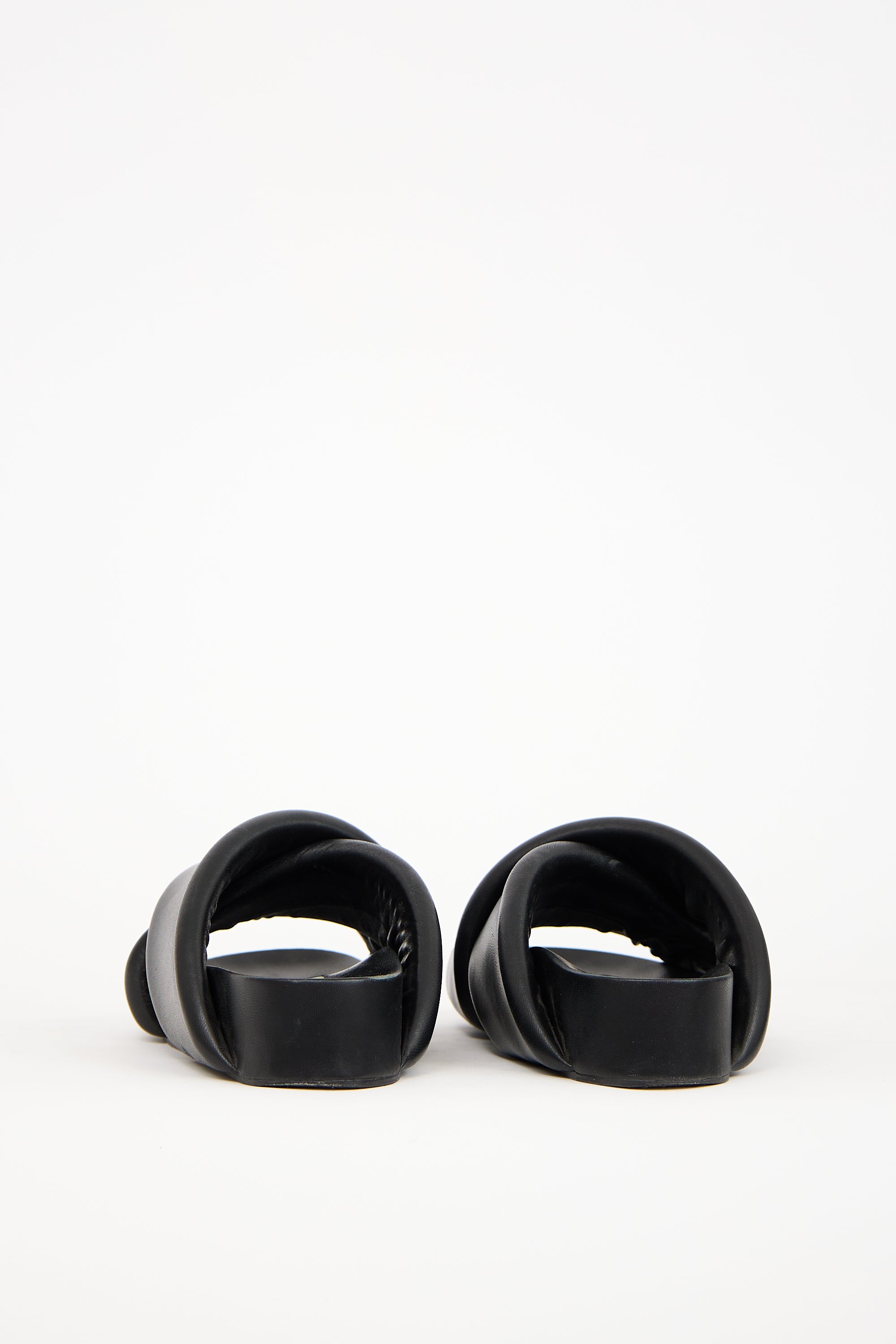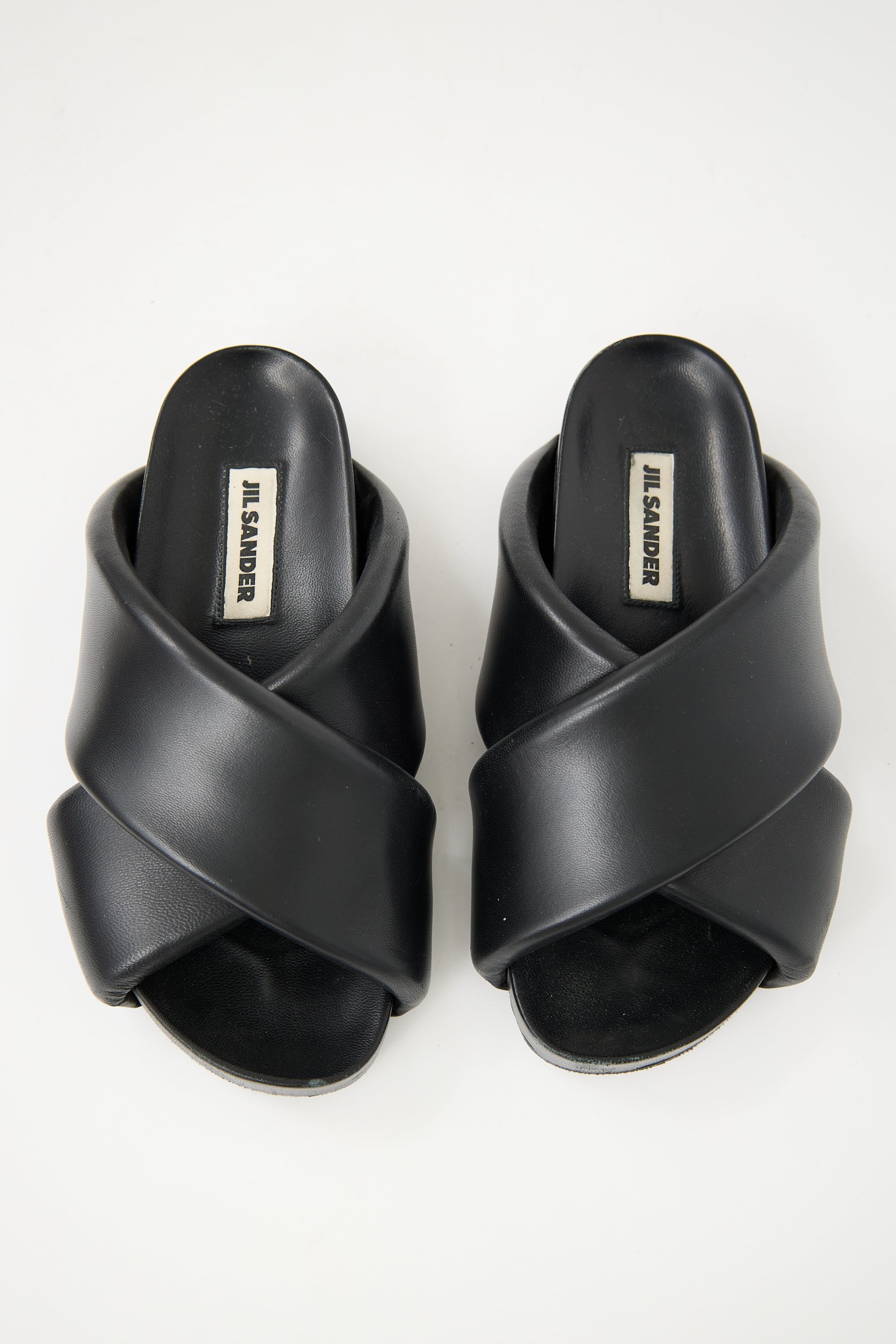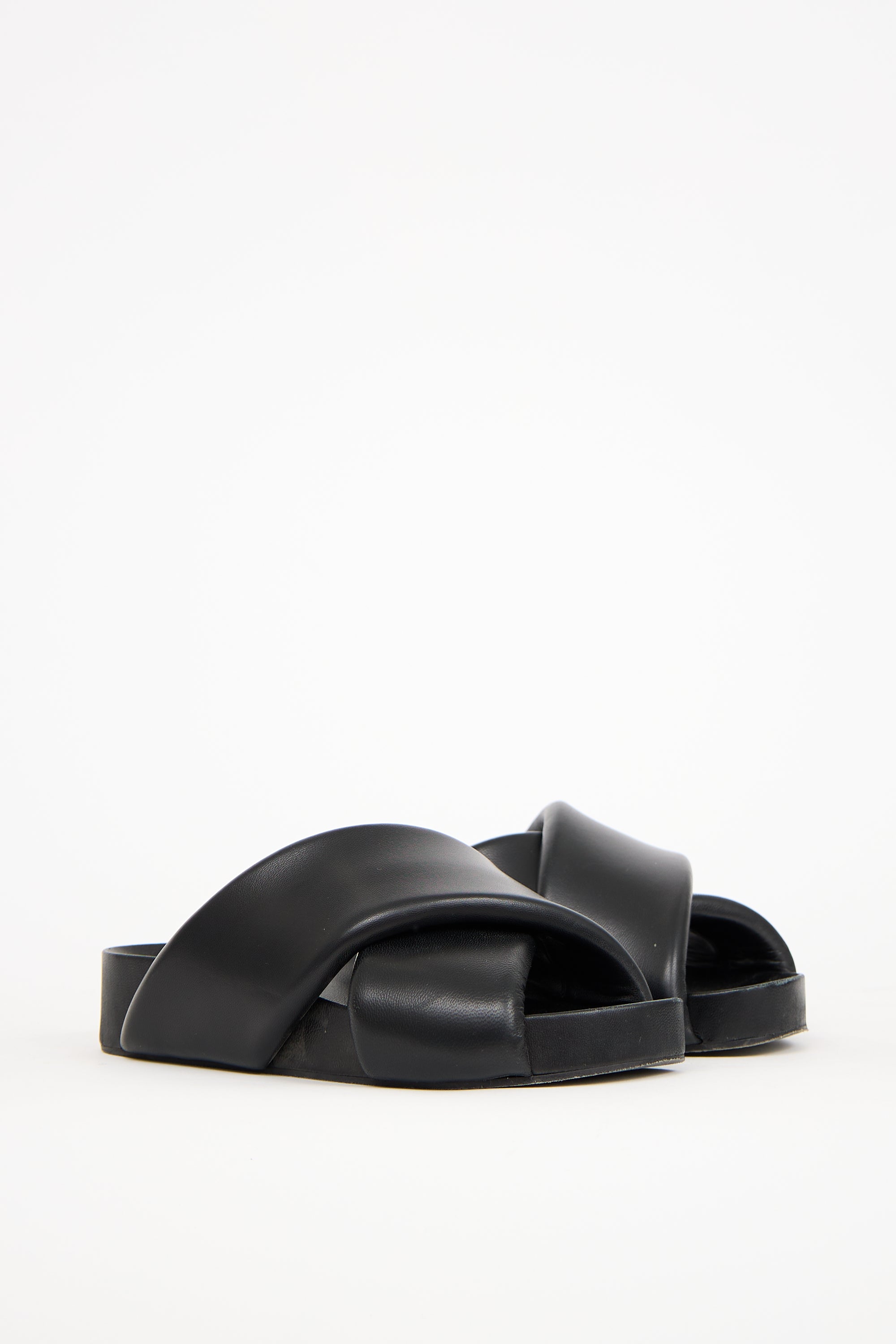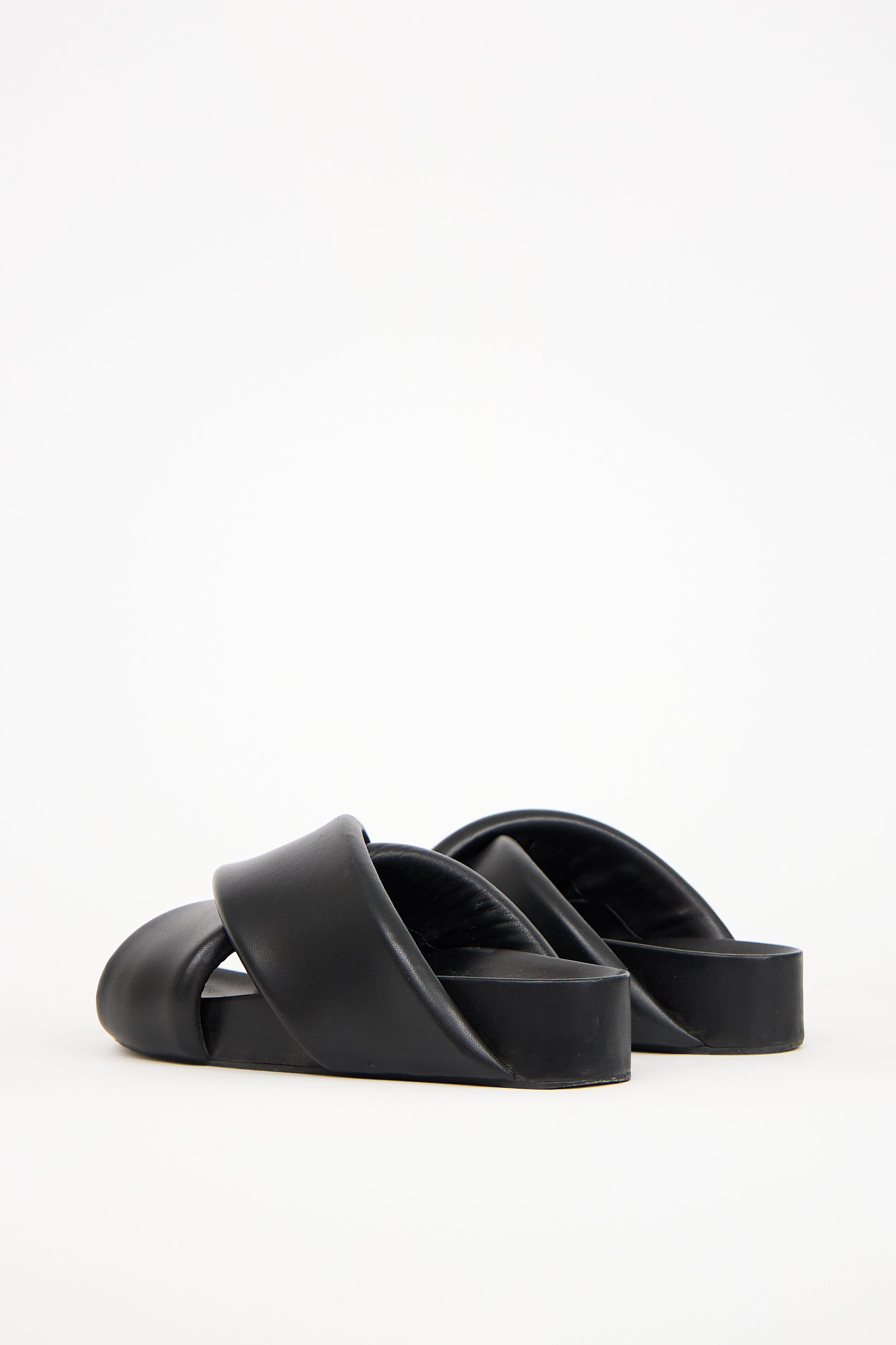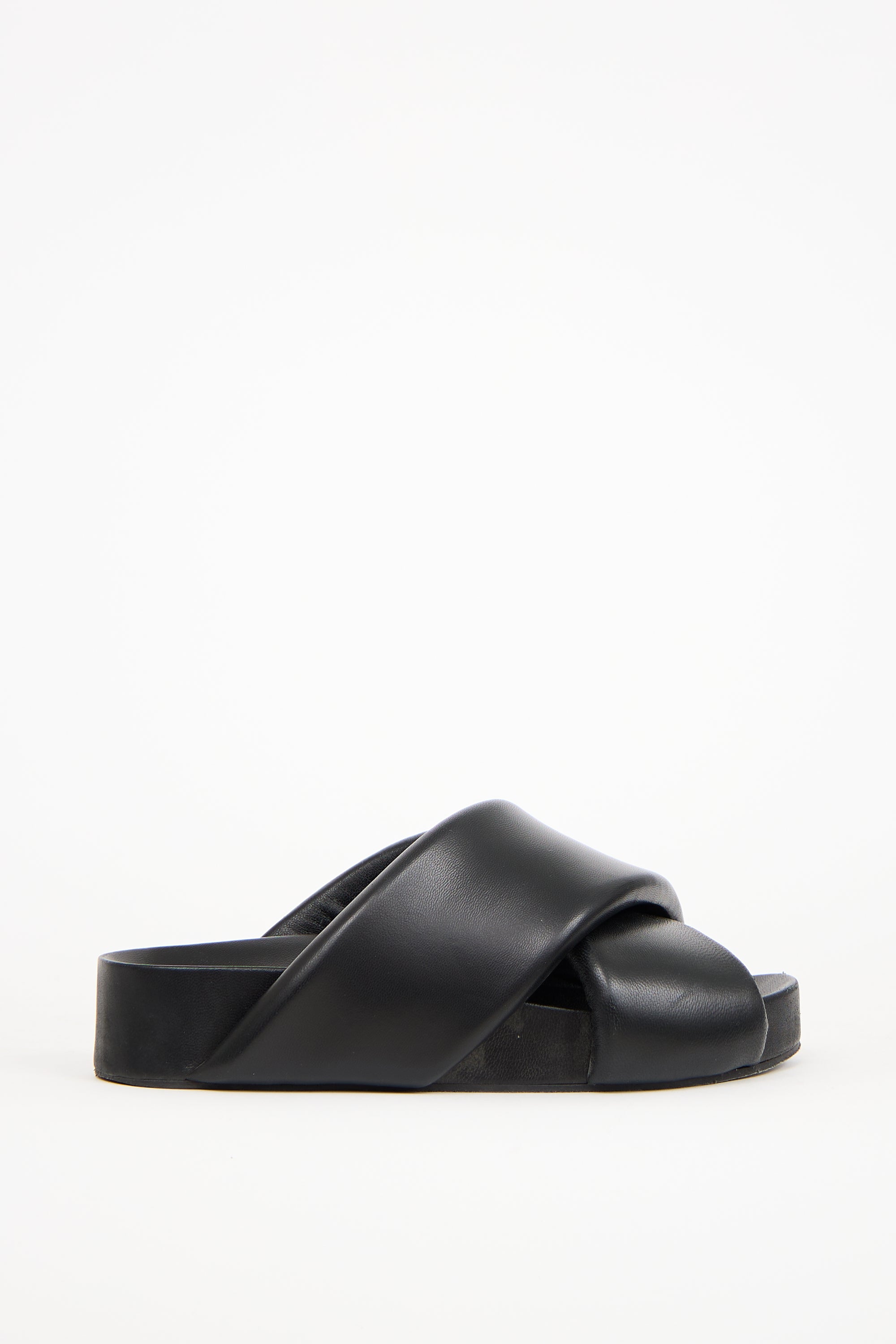 Pre-owned Jil Sander black leather slides featuring an open rounded toe, oversized padded criss cross straps at vamp, and platform sole. Includes original dust bag.