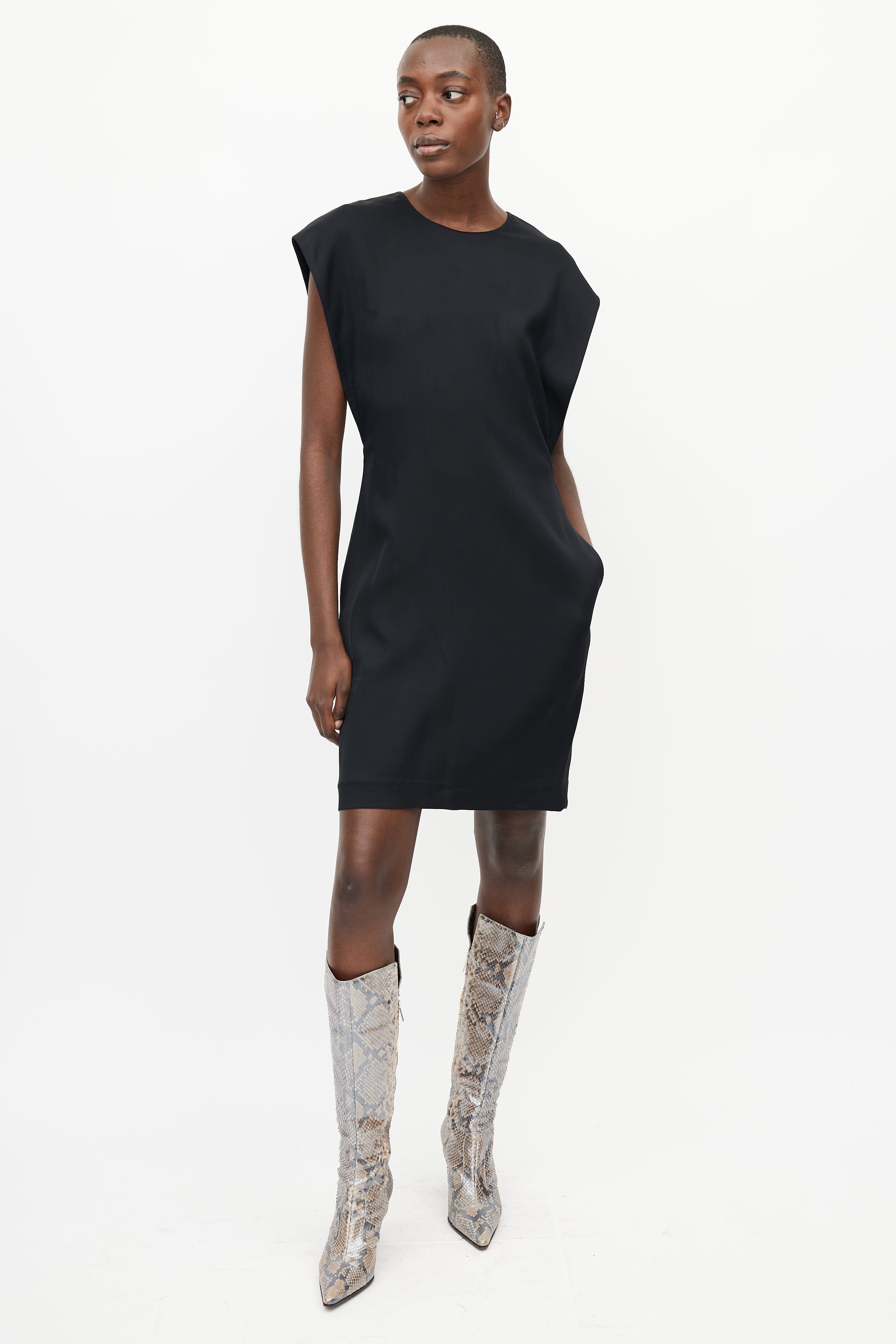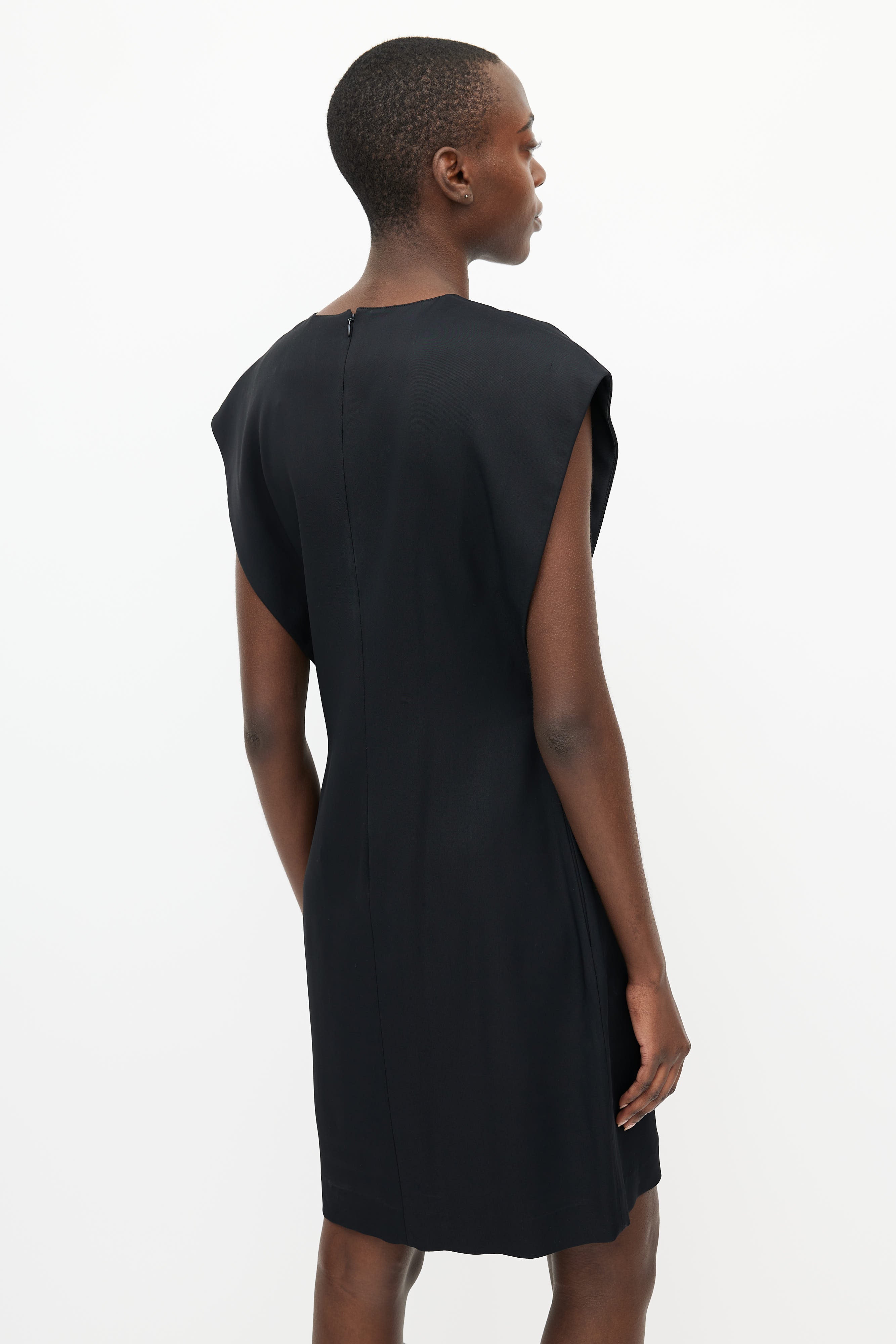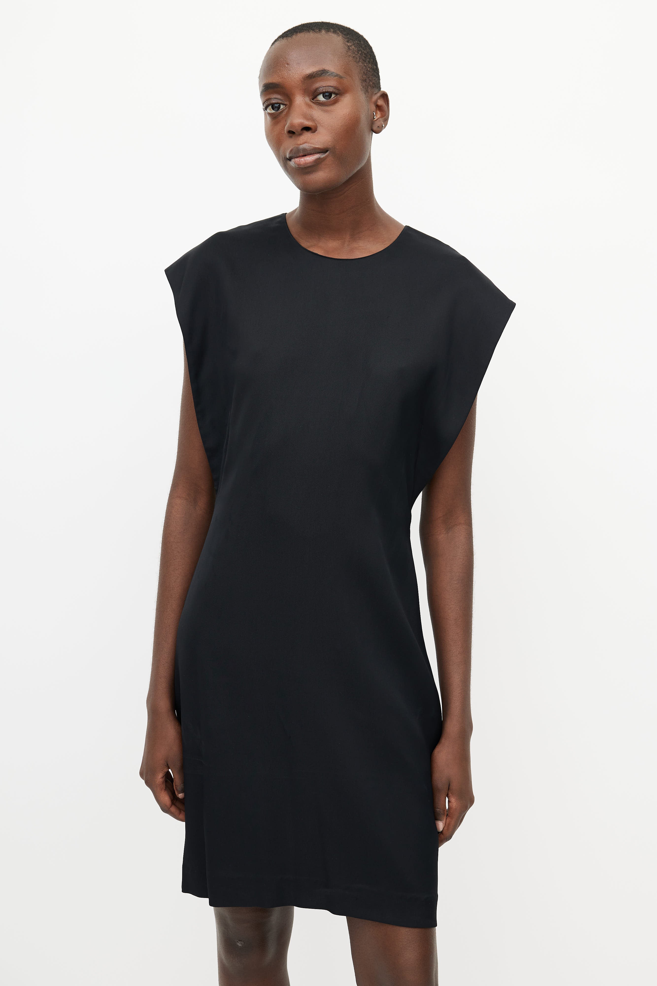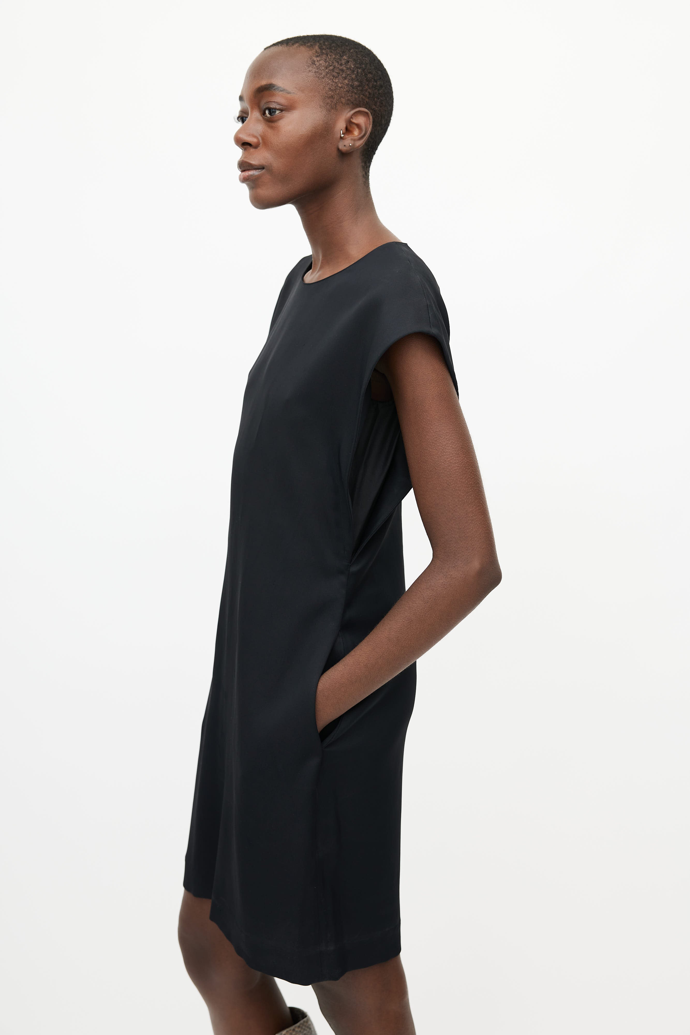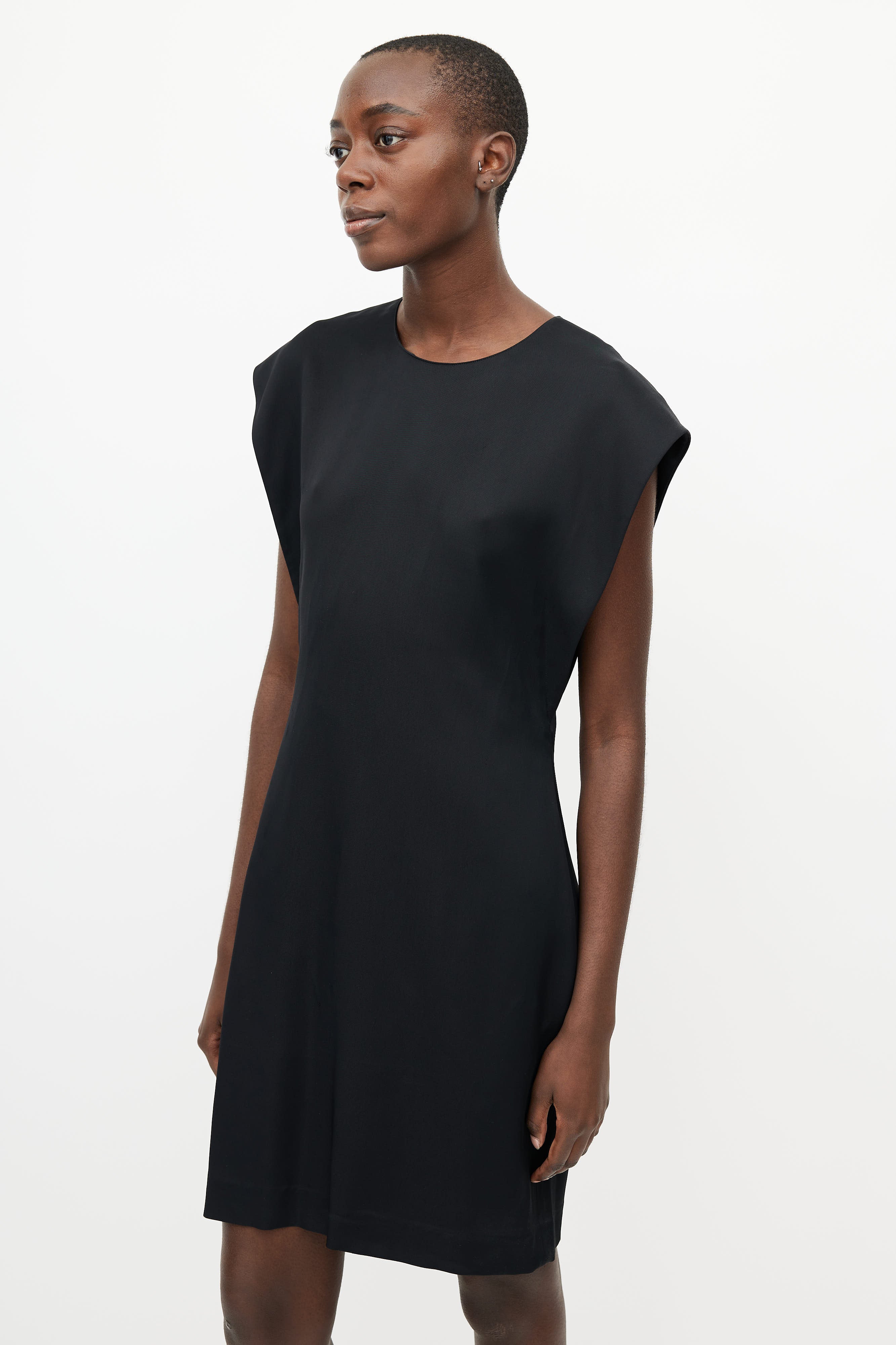Pre-owned Jil Sander black short dress featuring round neckline, cap sleeves, two slash pockets at hip, and concealed zip at back with a hook and eye closure. Lined.