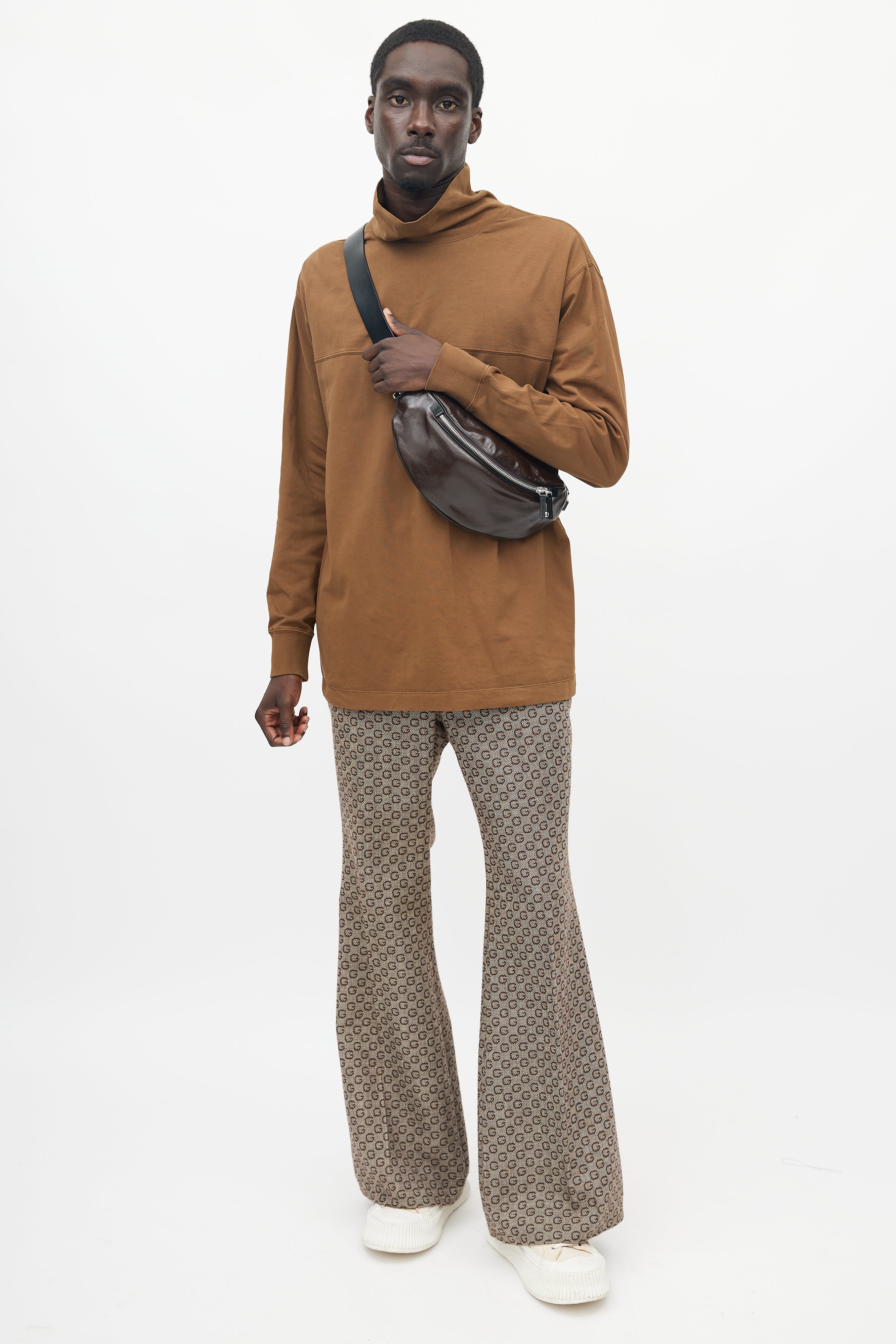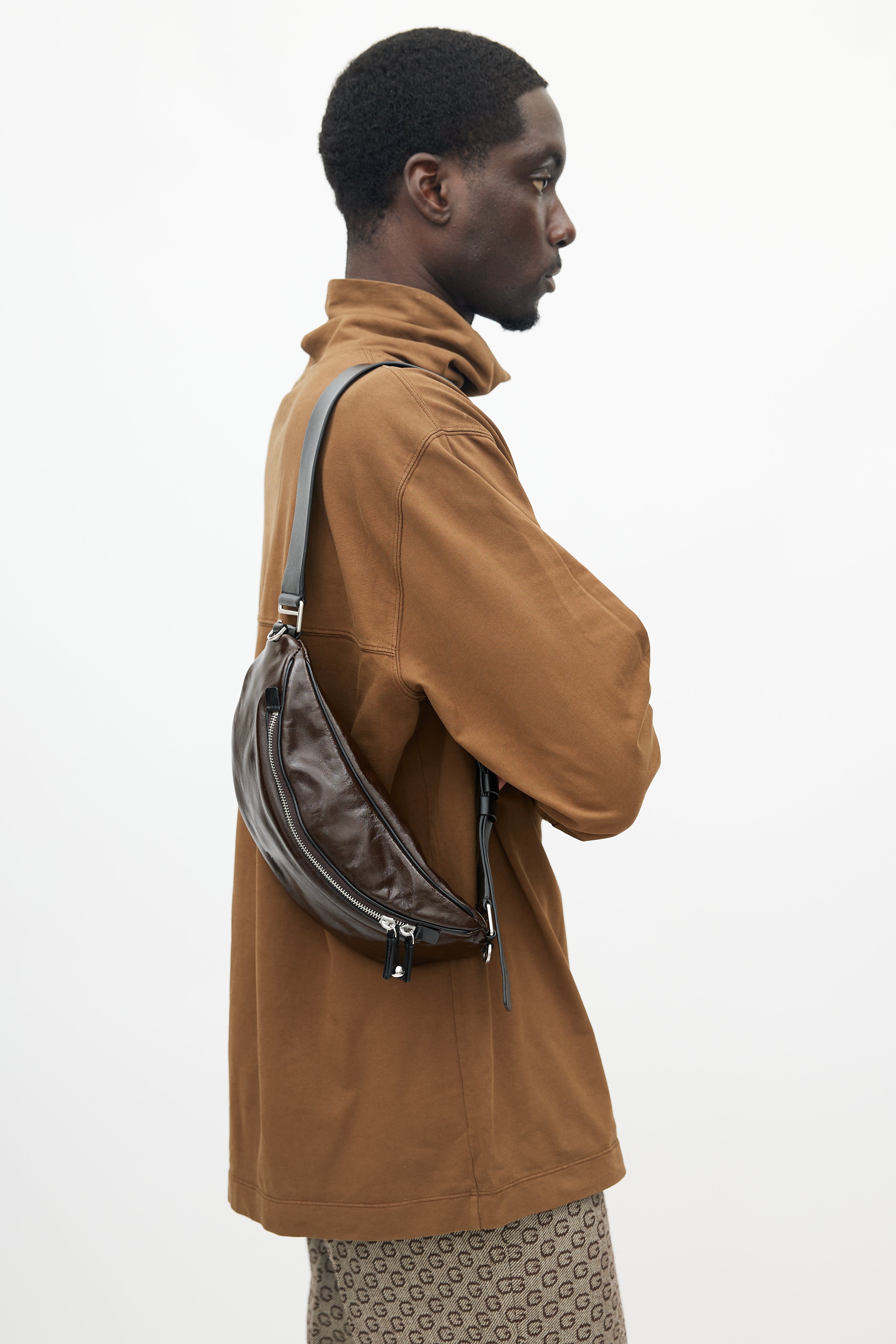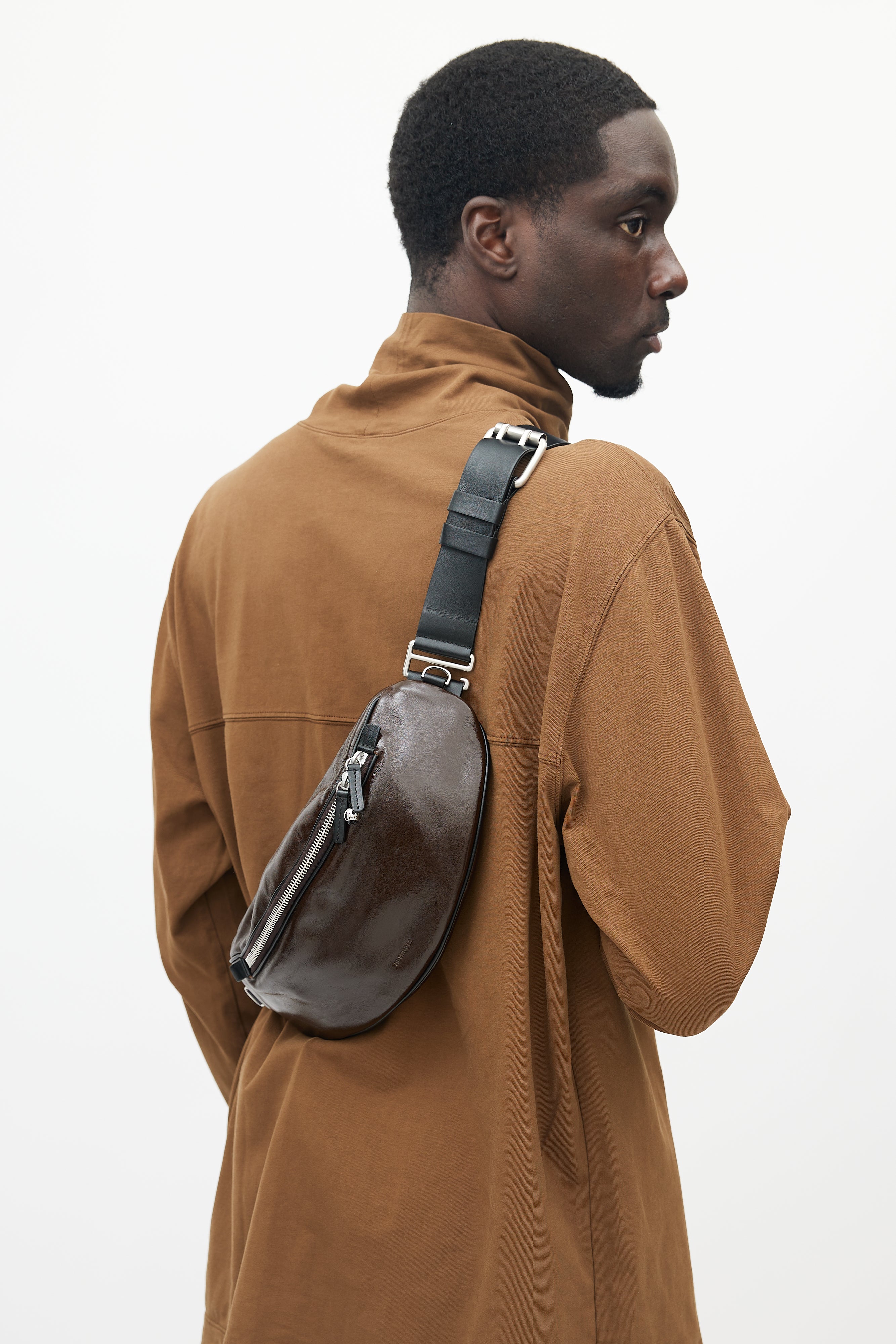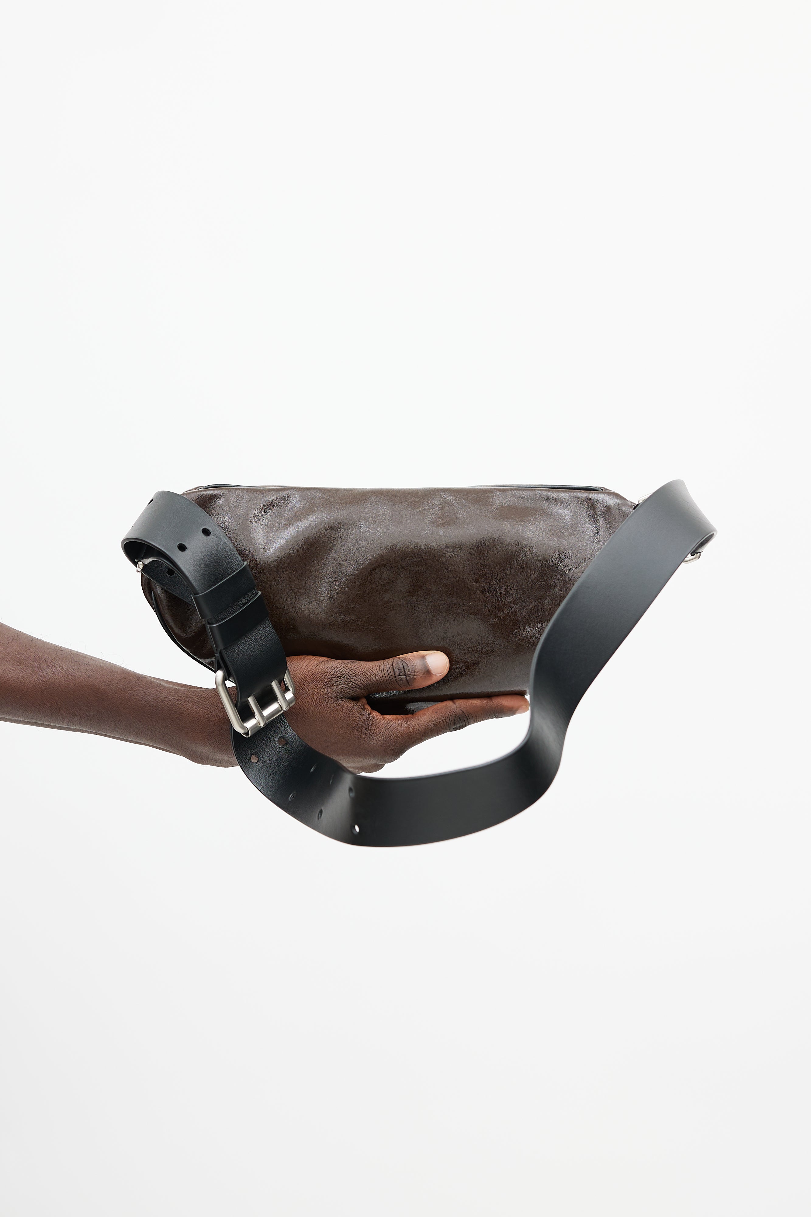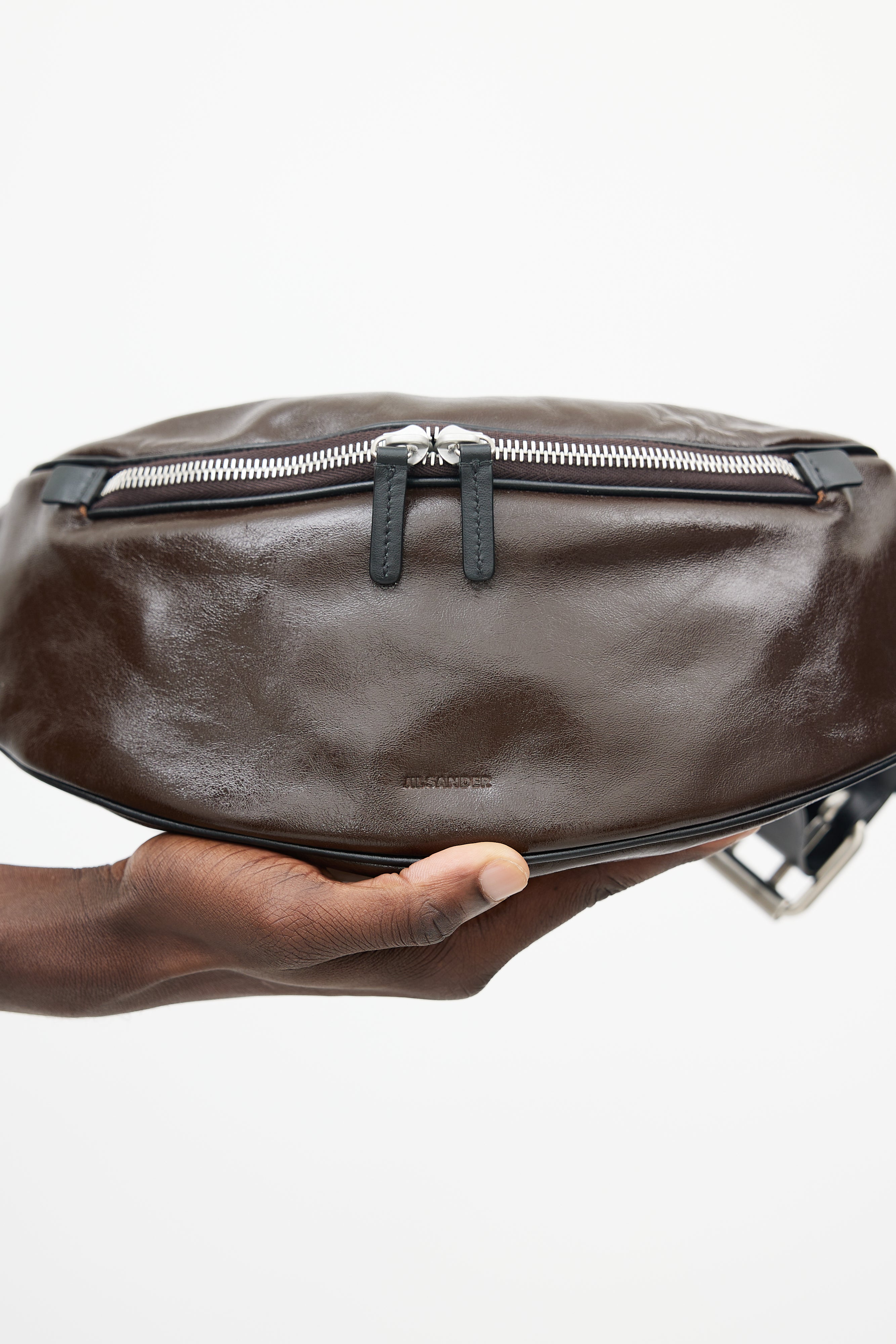 Pre-owned Jil Sander brown Moon belt bag featuring an embossed logo at front, one main compartment with one slip pocket, adjustable waist strap, and top zip closure. Comes with original dust bag.