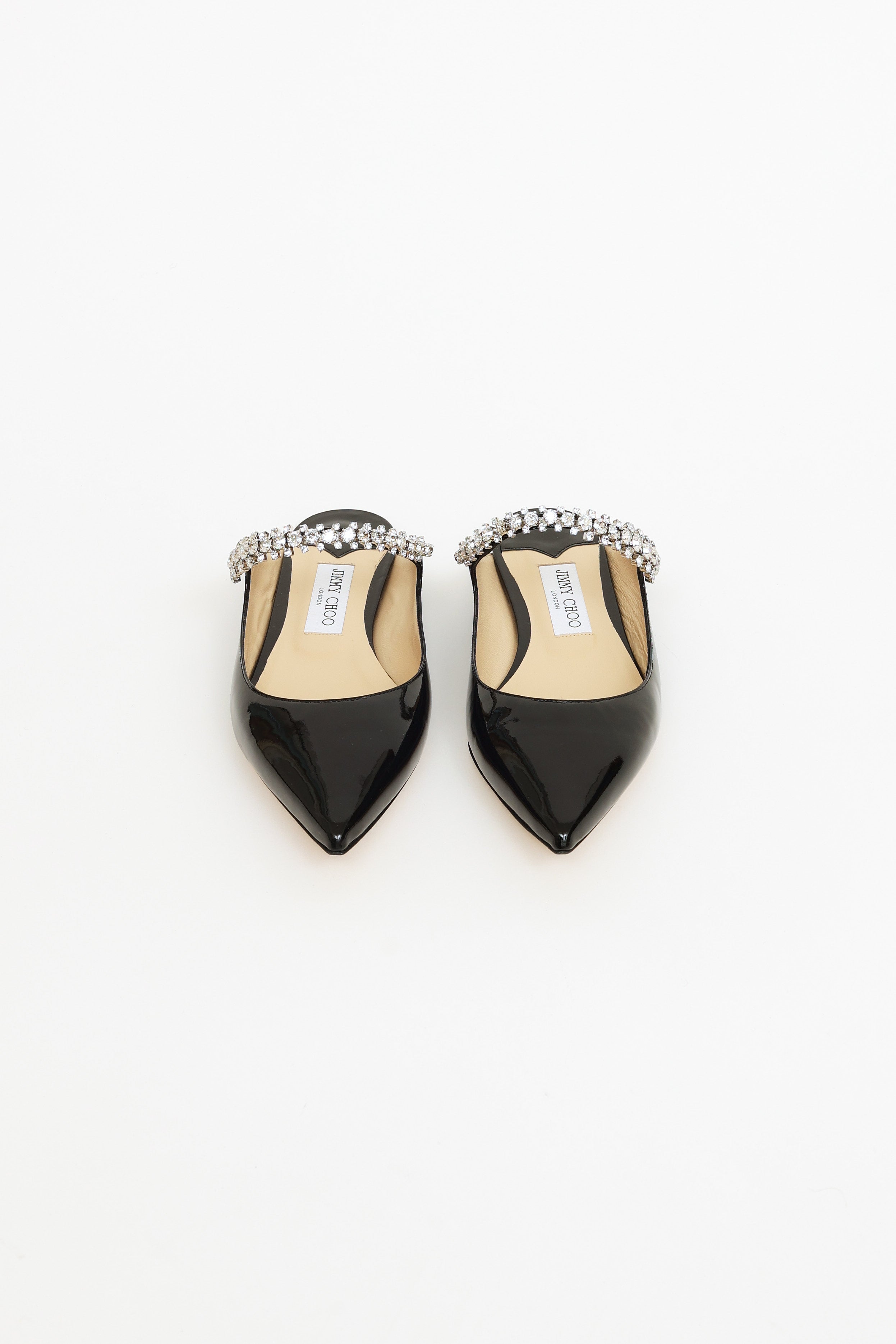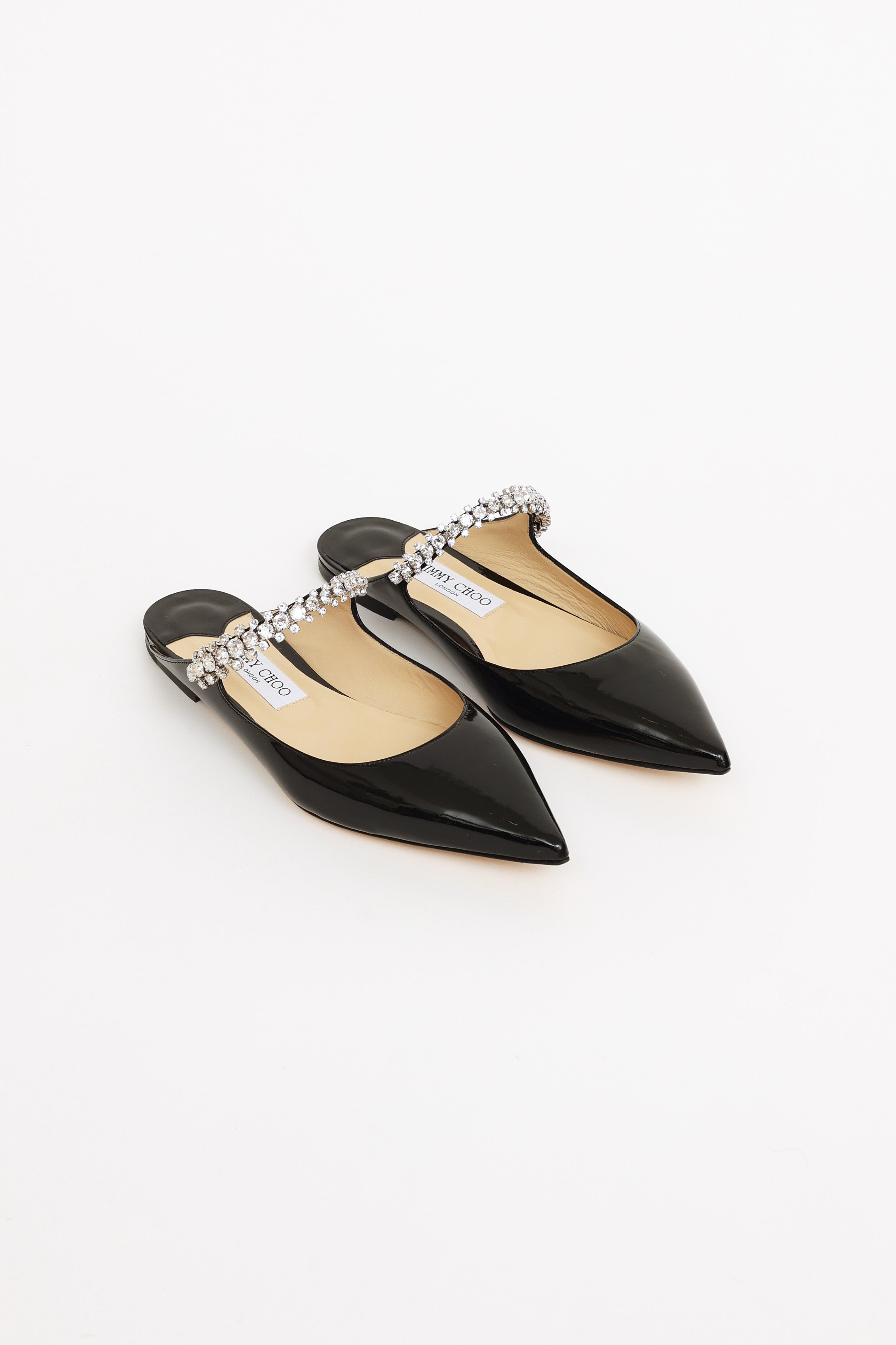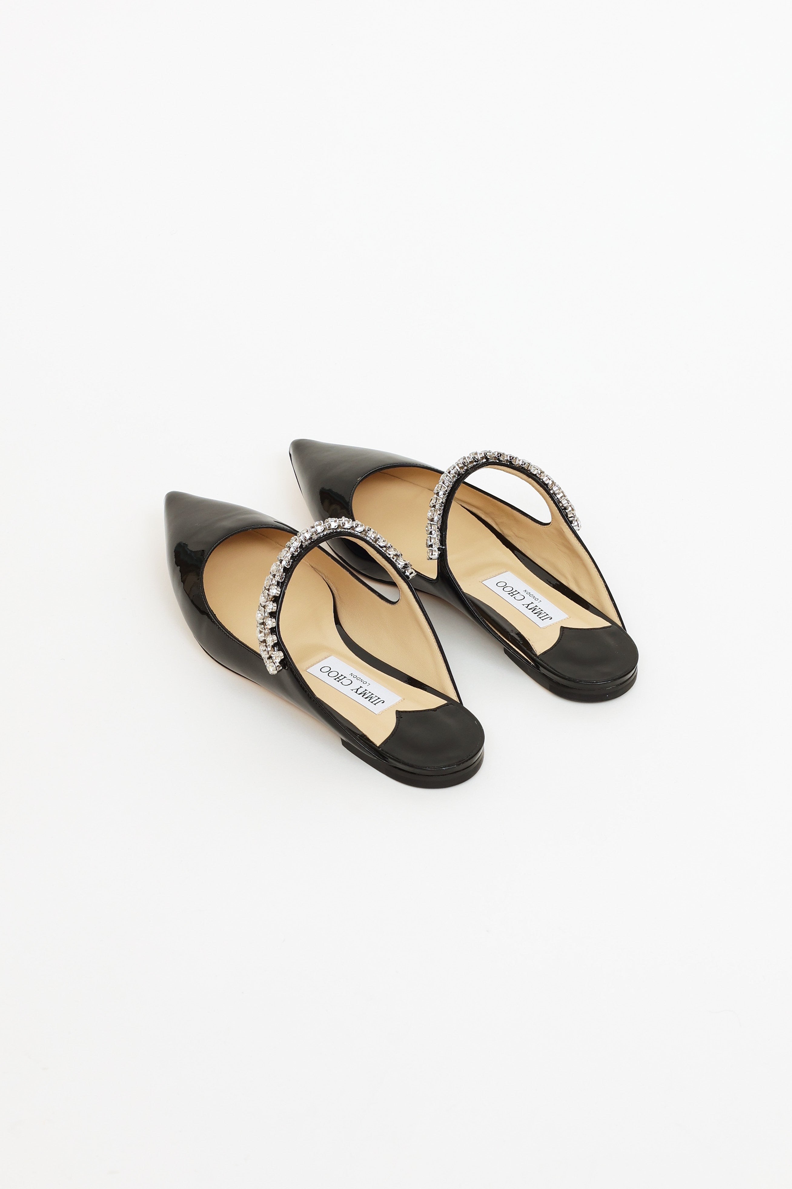 Pre-owned Jimmy Choo black Bing Crystal flat featuring patent leather, crystal embellished strap, pointed toe, leather insole and outsole.