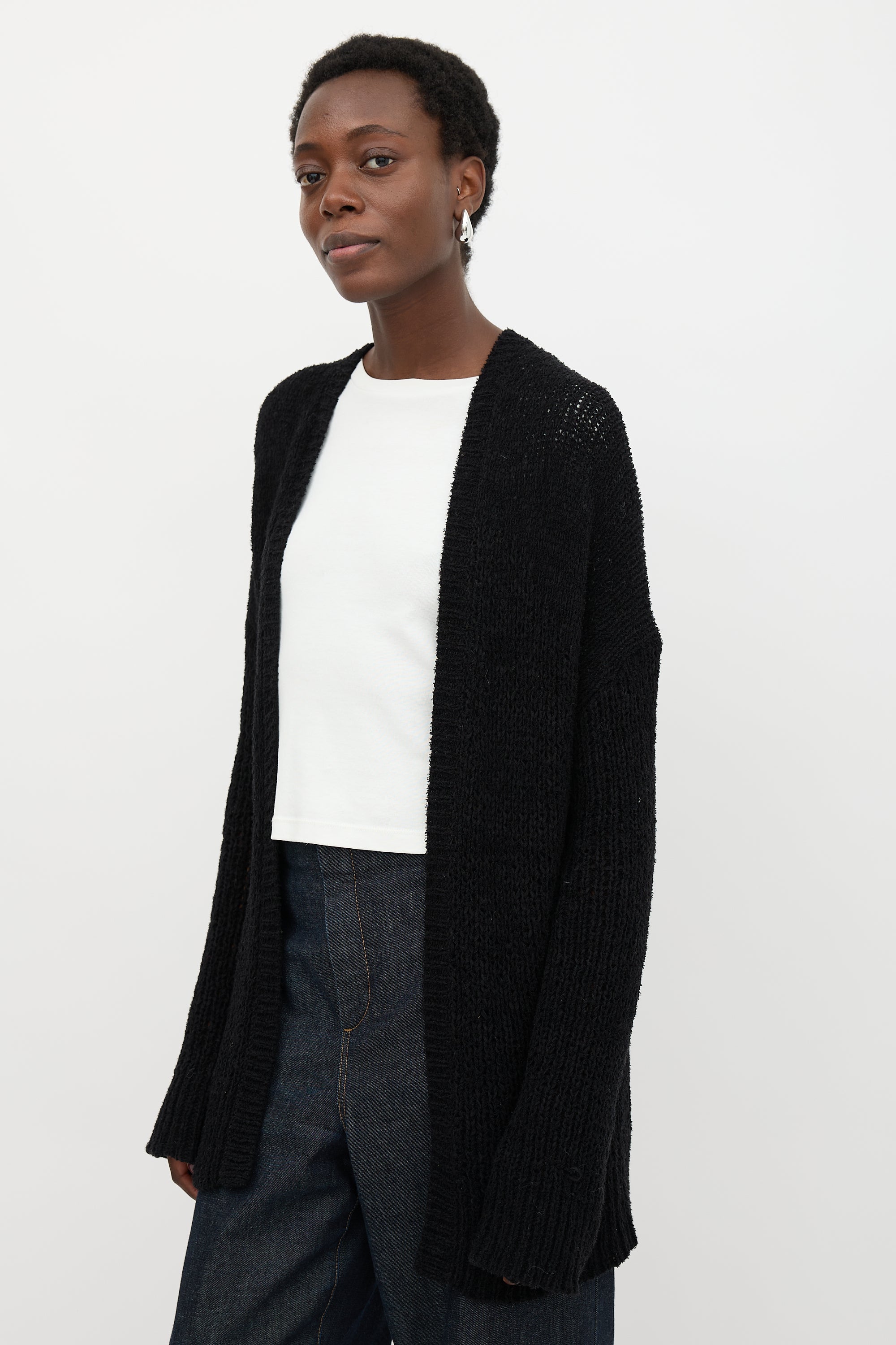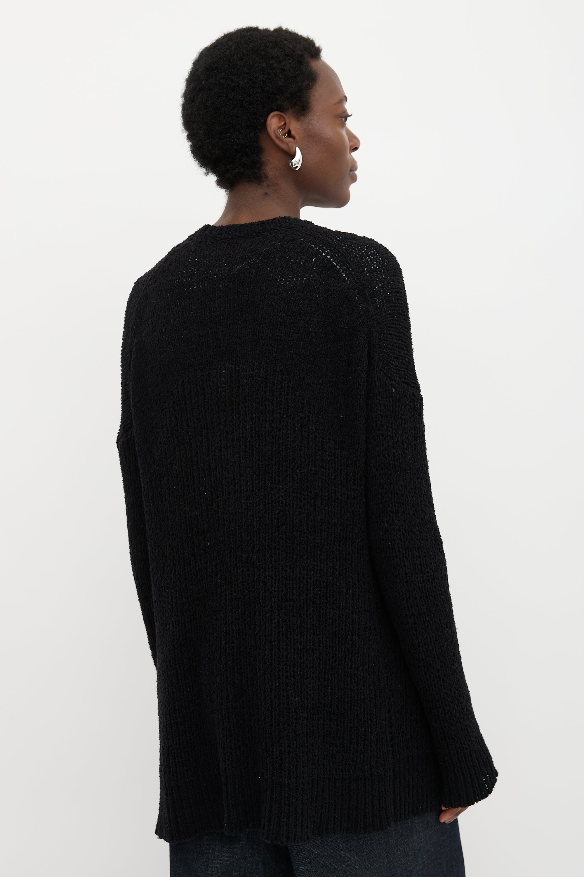 Pre-owned Nili Lotan black loose knit cardigan featuring a V-neckline, dropped shoulder, and open front.