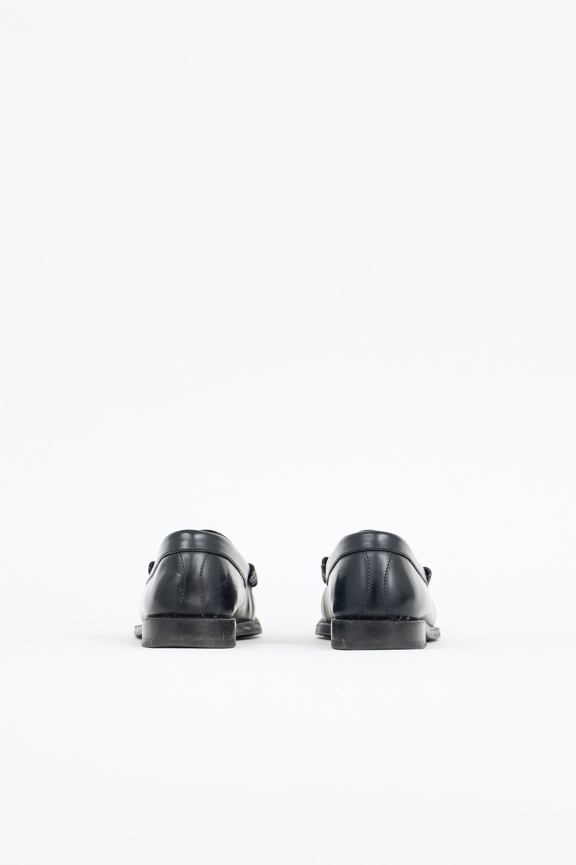 Pre-owned Celine black leather Luco Penny loafers featuring a rounded toe, cutout strap at vamp, notched top line, tonal stitching, and small stacked heel.